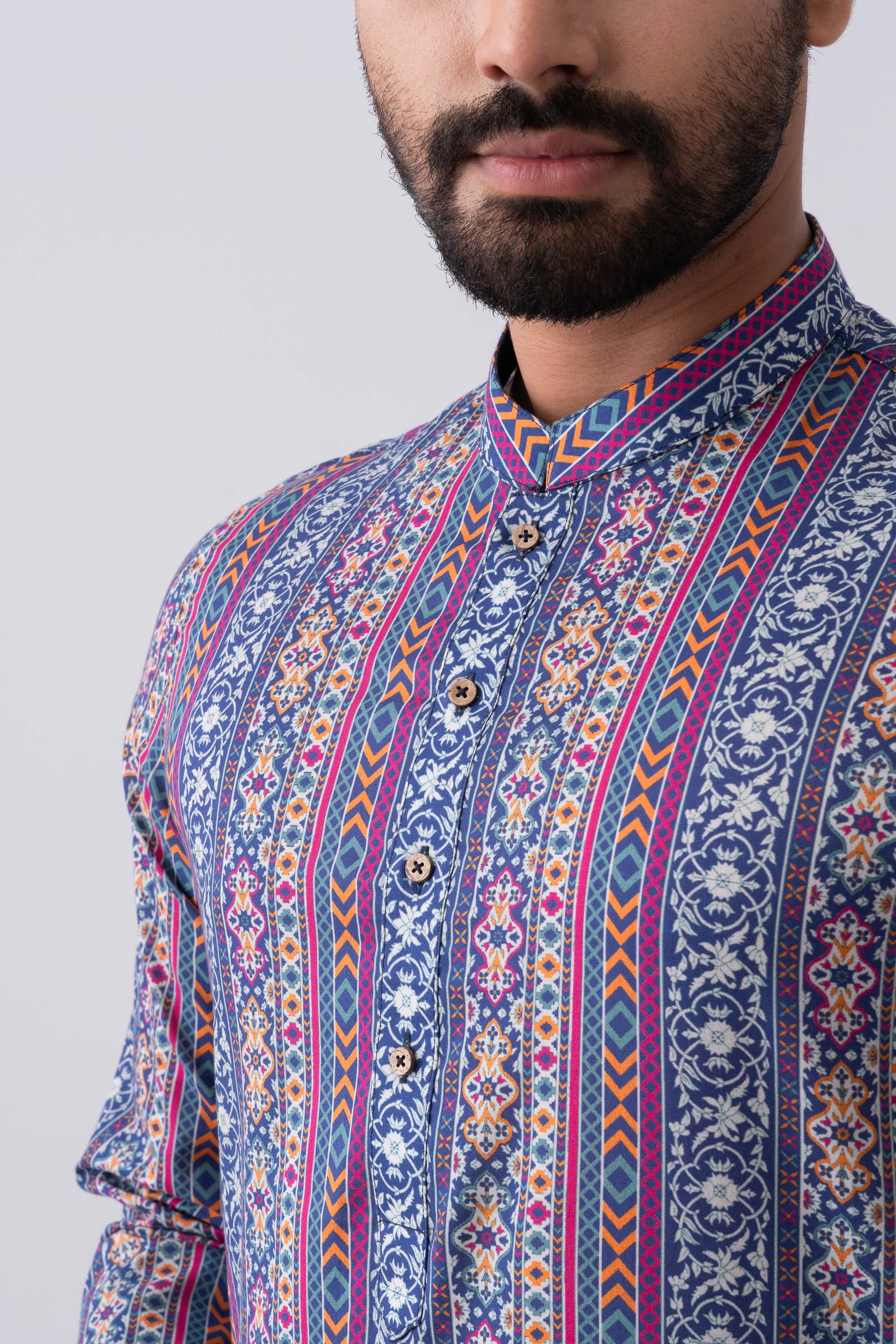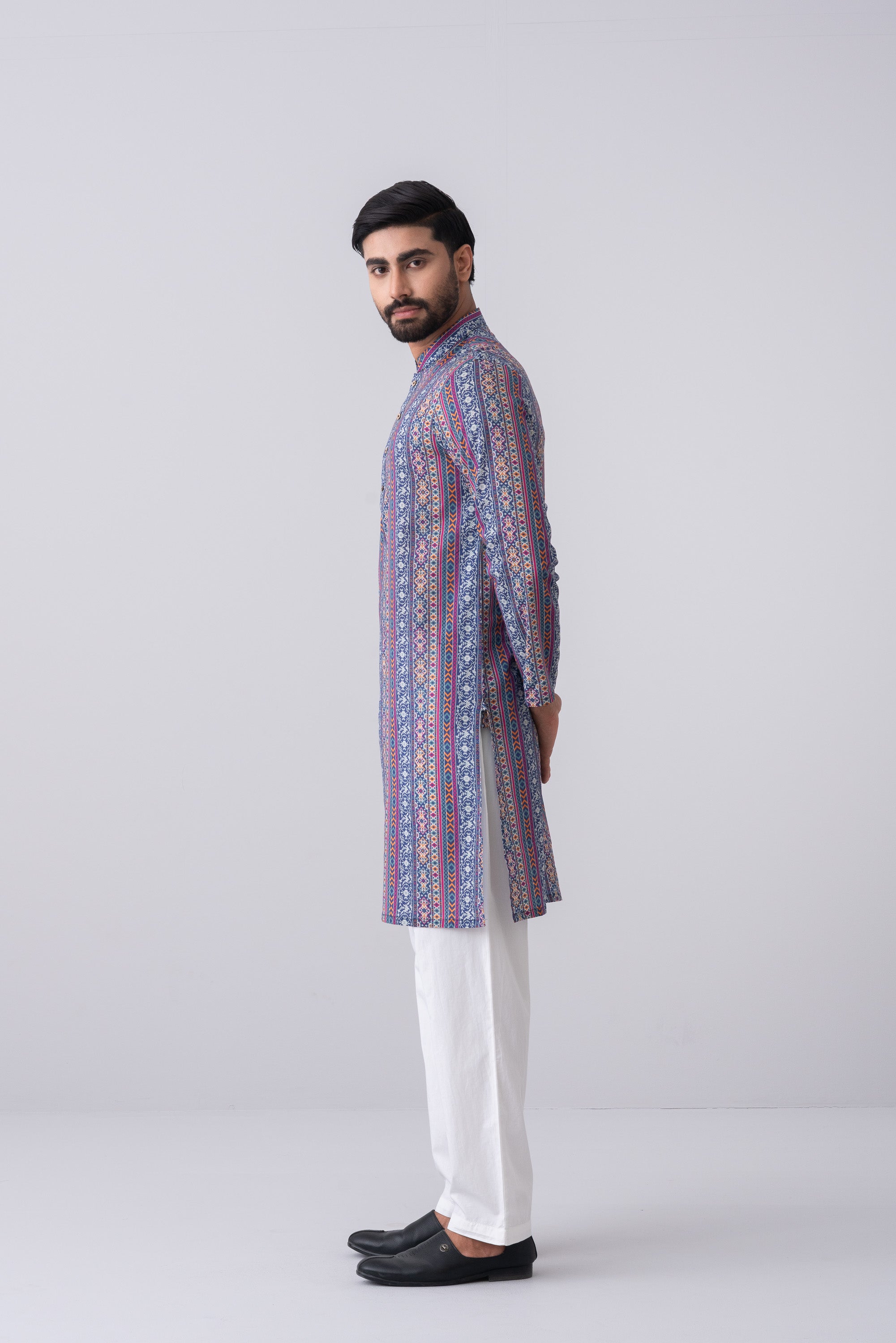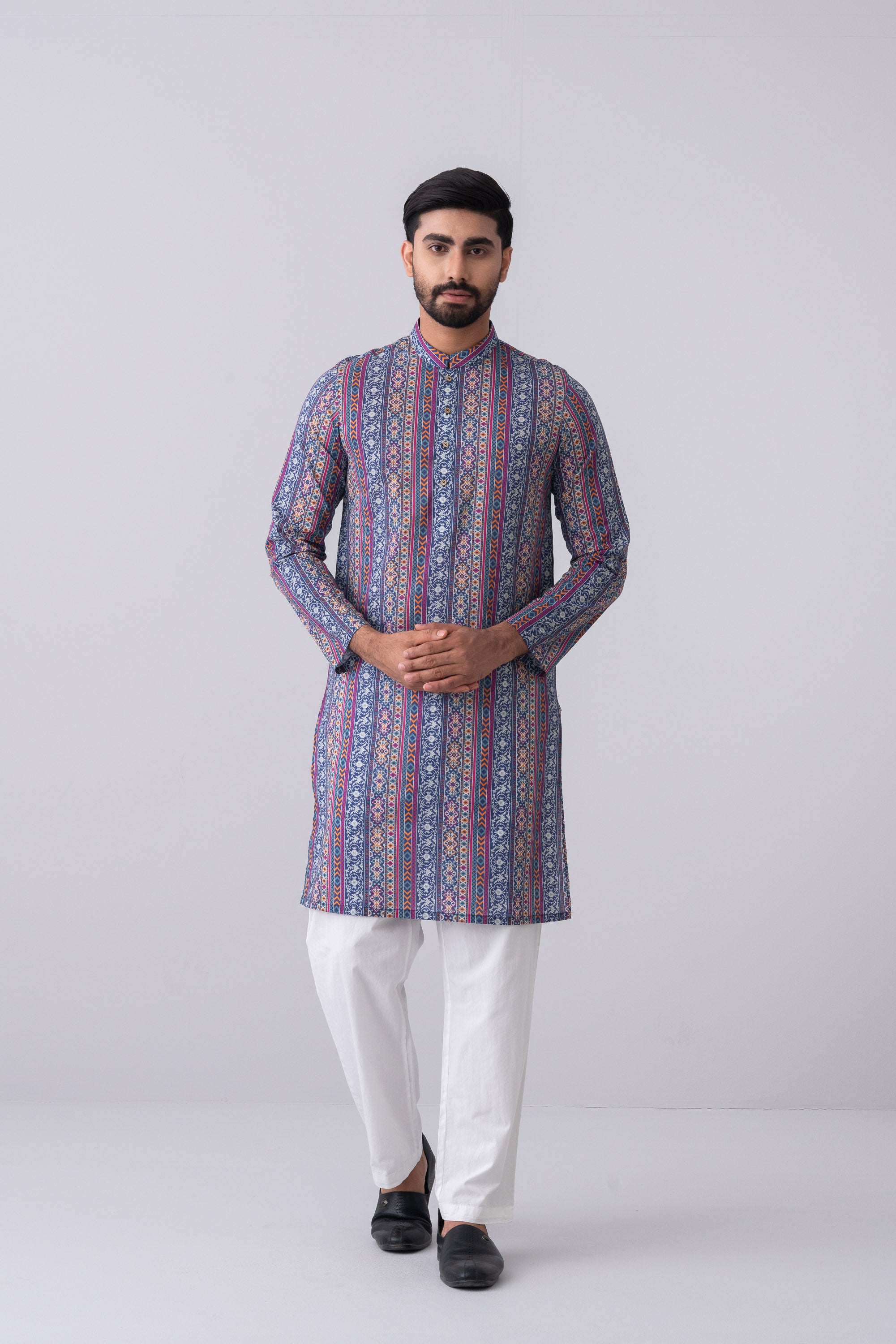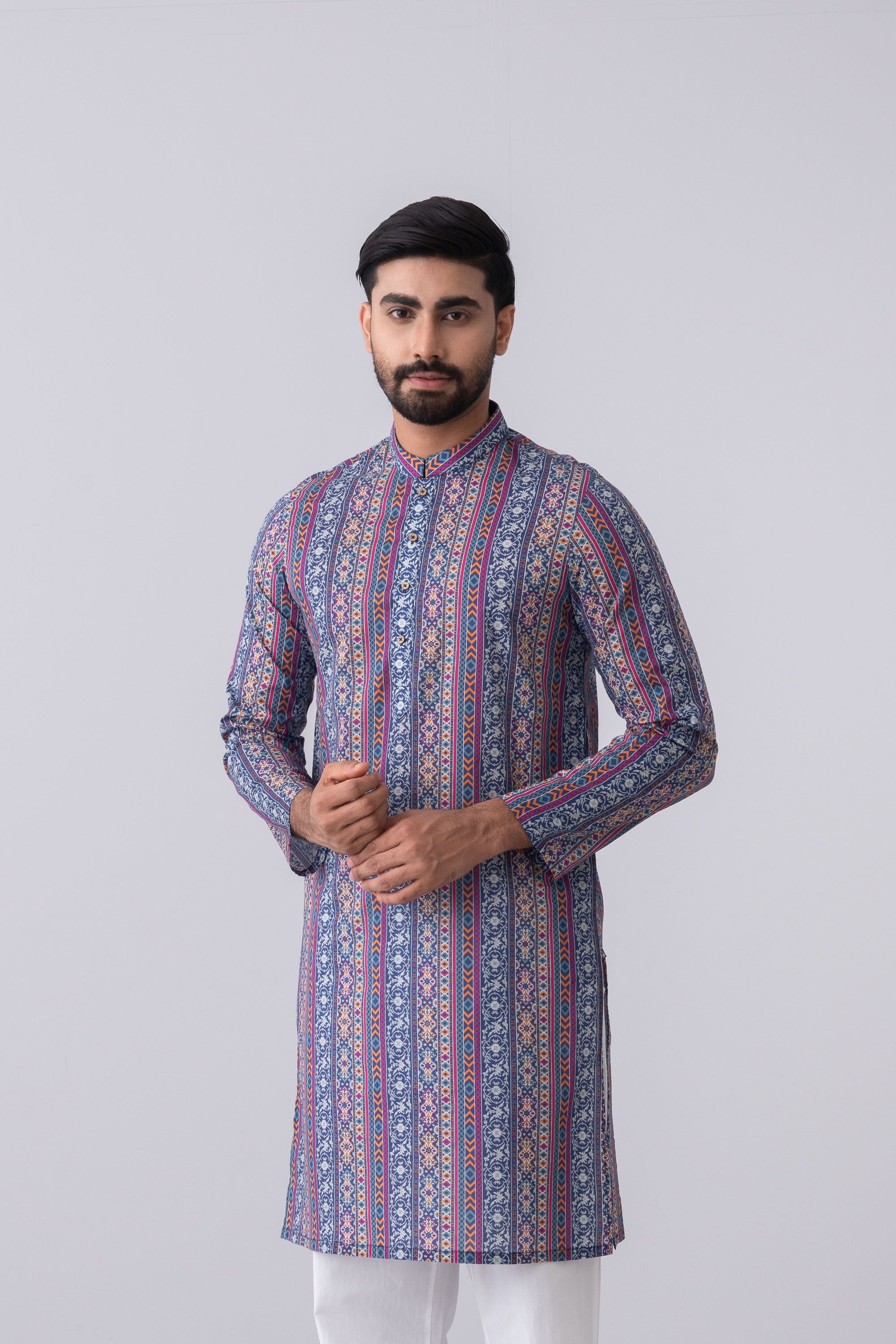 Celebrate Pohela Boishakh in style with this vibrant floral and geometric printed Panjabi. Made from breathable cotton, it ensures all-day summer comfort. Featuring a mandarin collar, coconut buttons, and a bold mix of festive colors, it's the perfect blend of tradition and modern flair for your festive wardrobe.