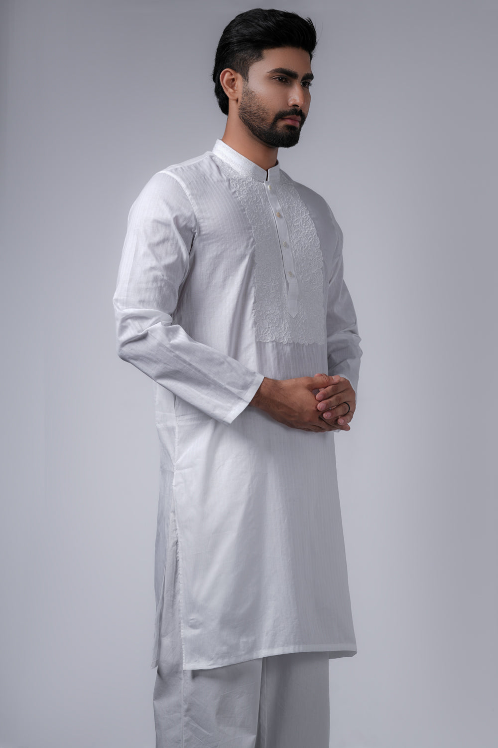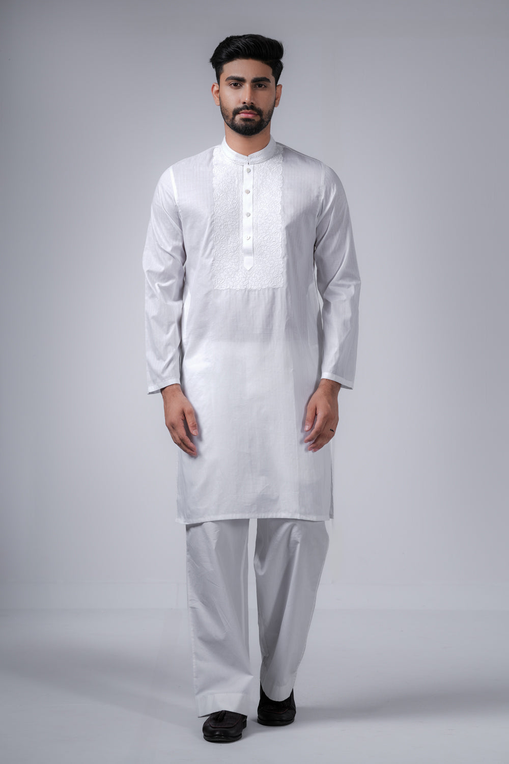 A regular fit Panjabi crafted from 100% cotton breathable fabric, featuring embroidery detailing on band and around placket with MOP buttons, offers a stylish yet comfortable semi formal look. Perfect for effortless elegance and all-day ease.