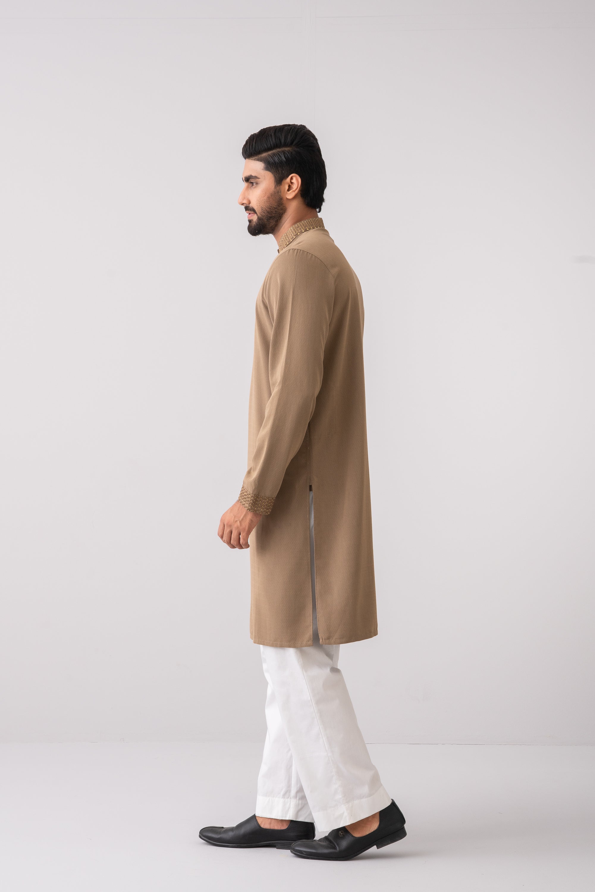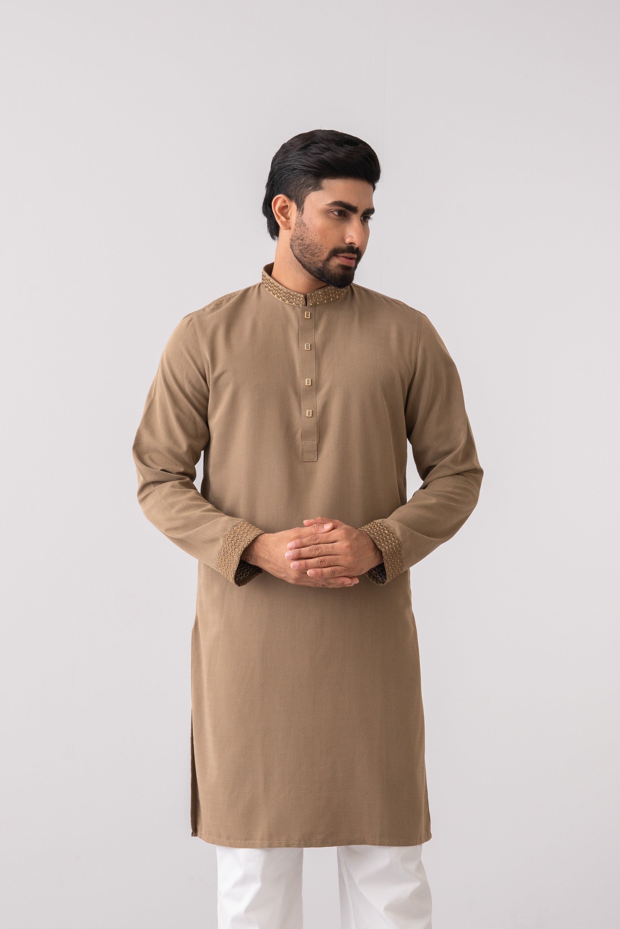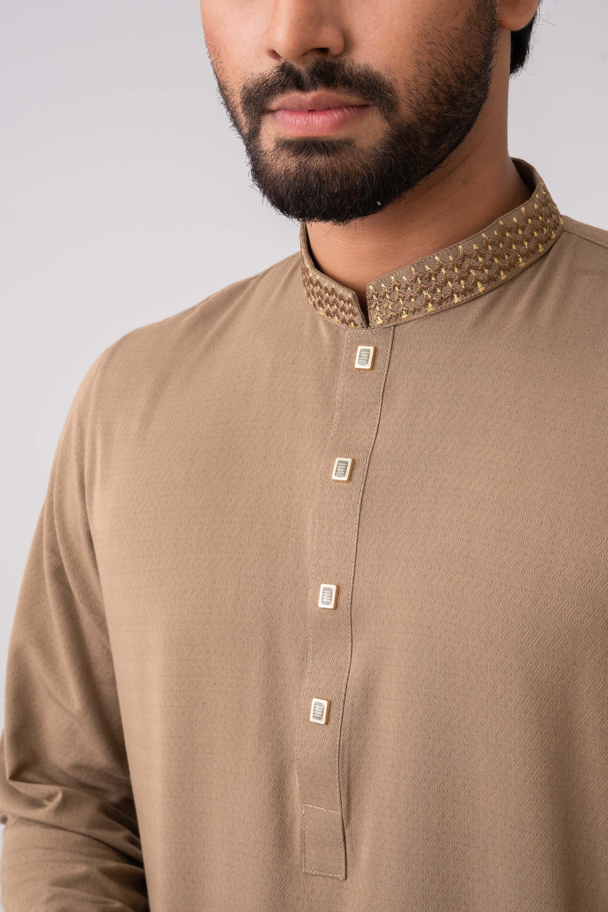 A regular fit Panjabi crafted from 60% viscose and 40% microfiber fabric, featuring embroidery detailing on band and sleeve hem with decorative snap buttons, offers a stylish yet comfortable semi formal look. Perfect for effortless elegance and all-day ease.