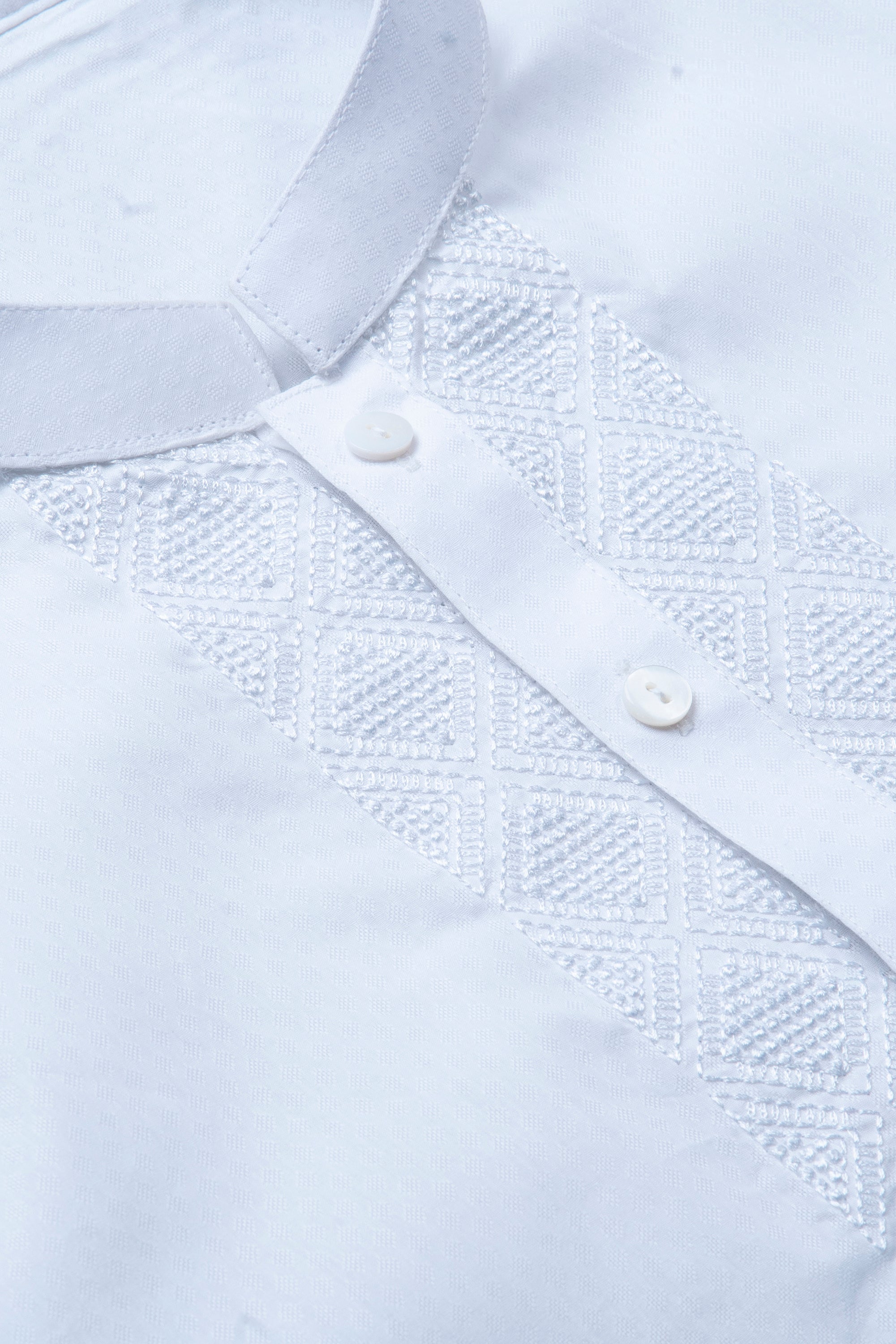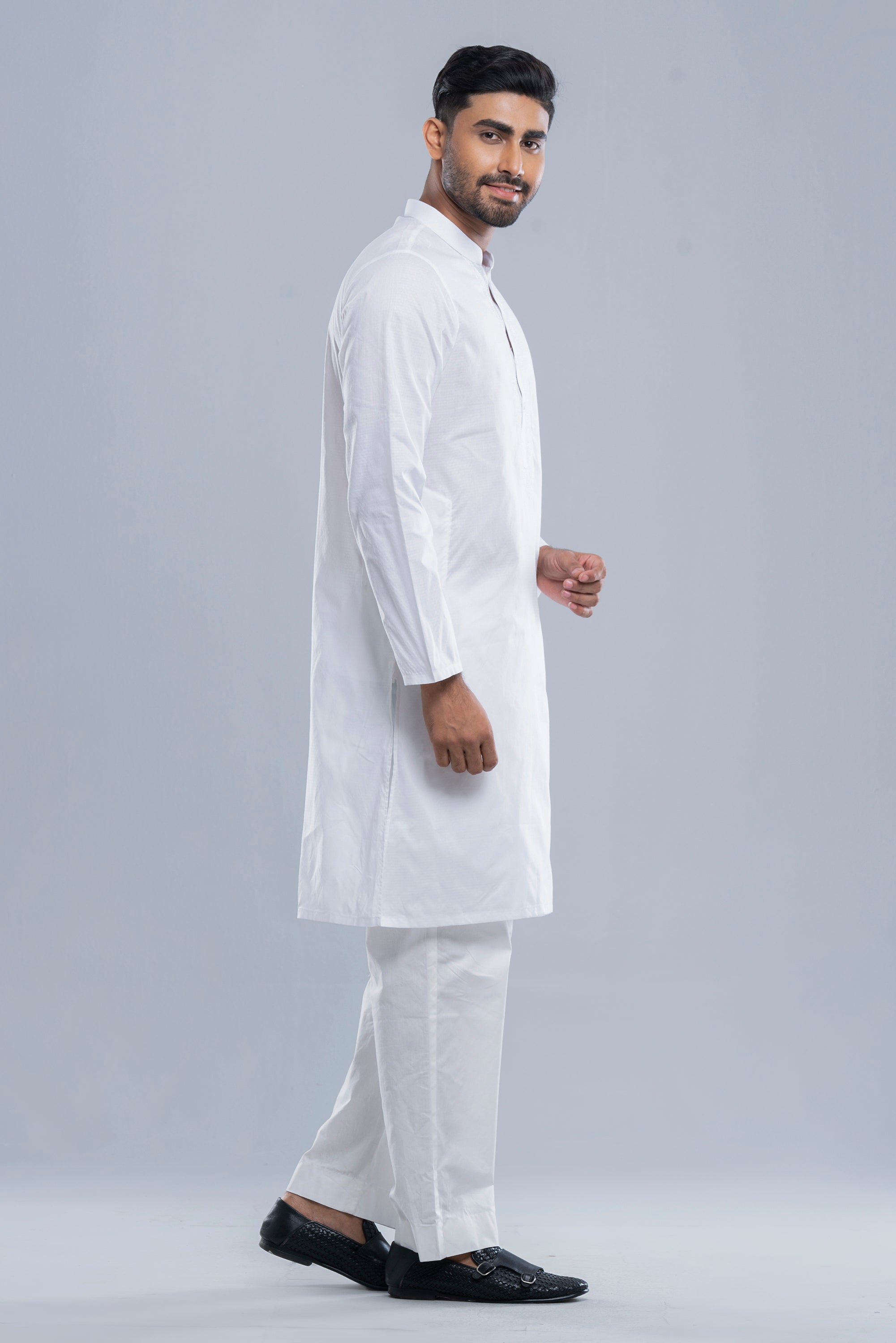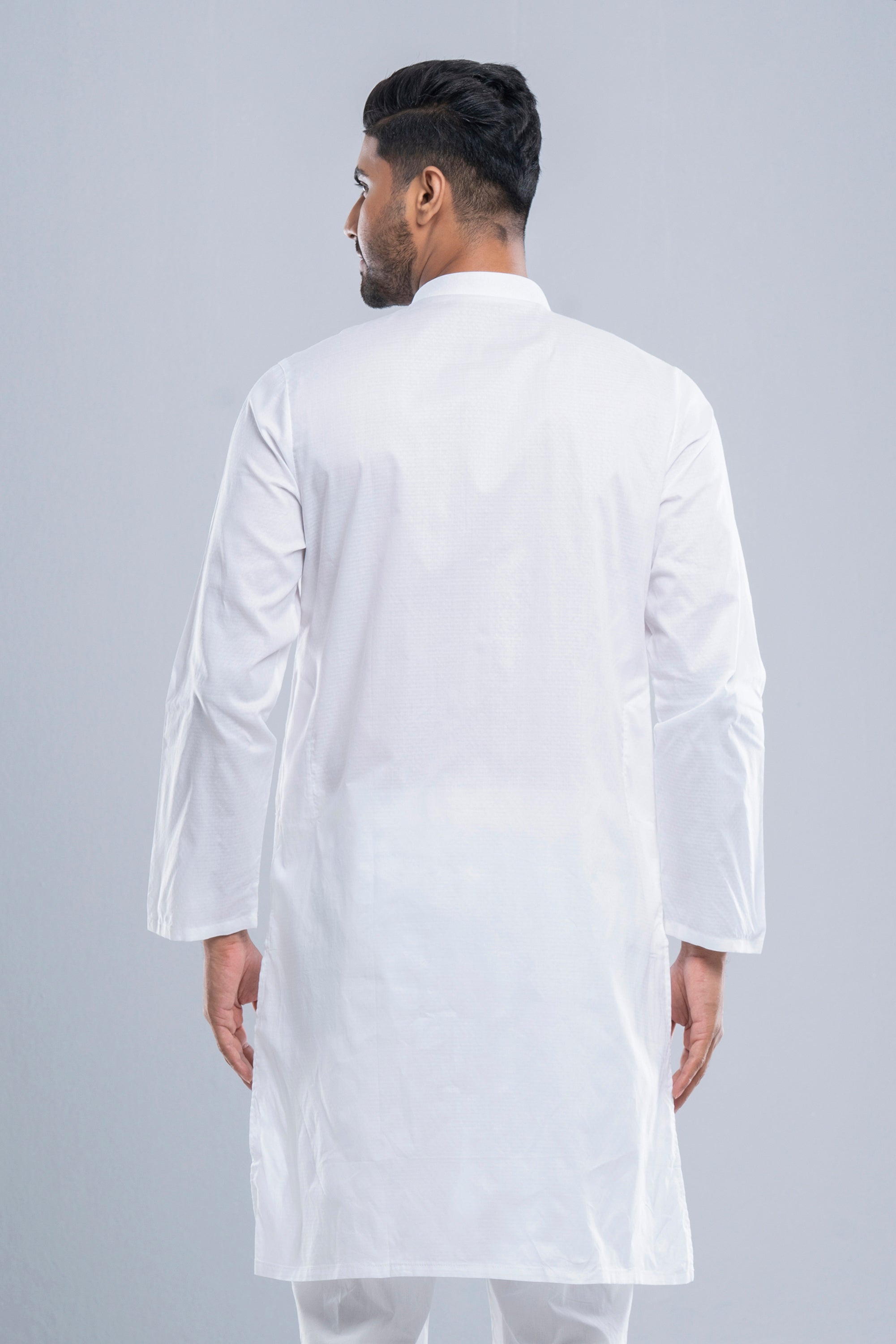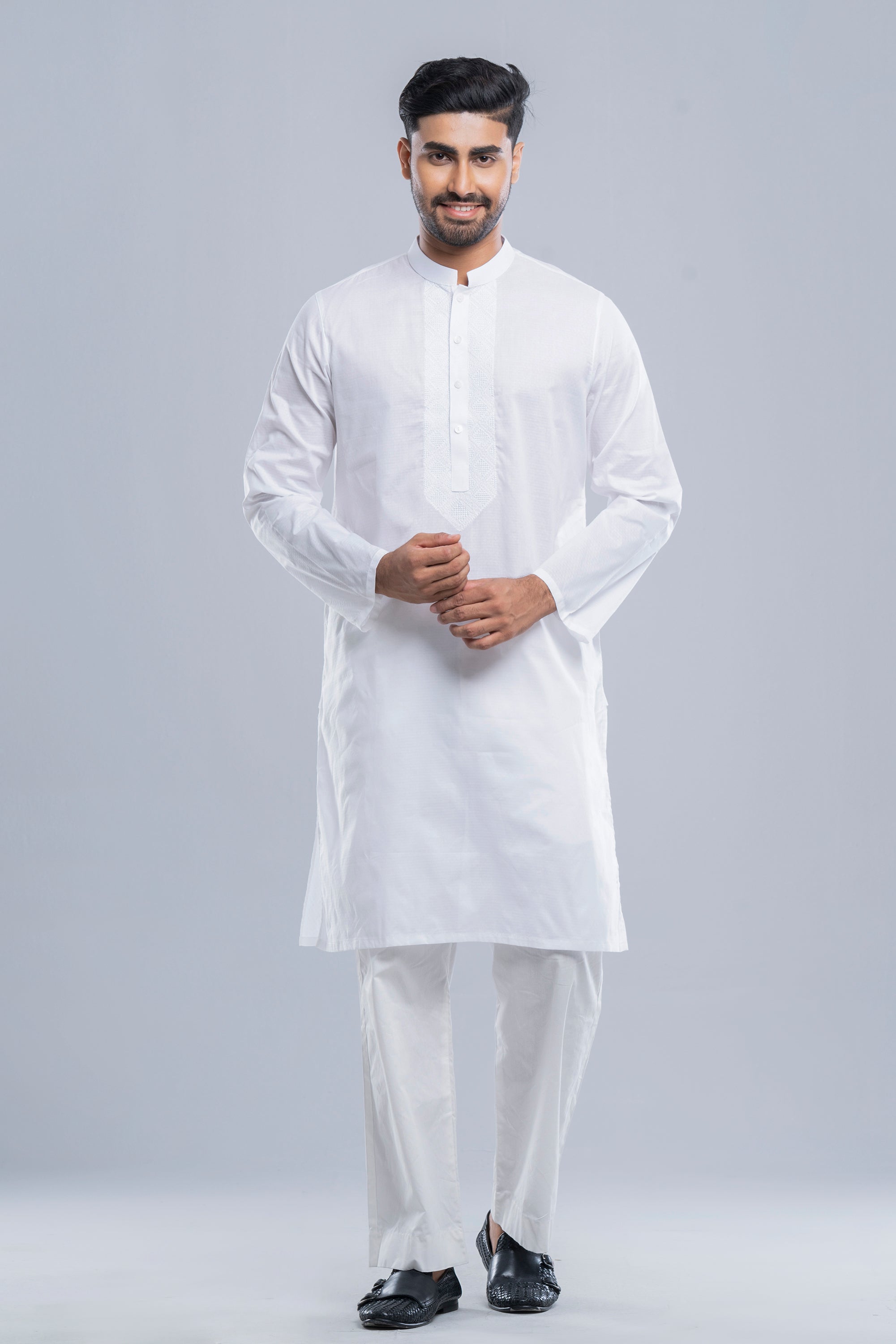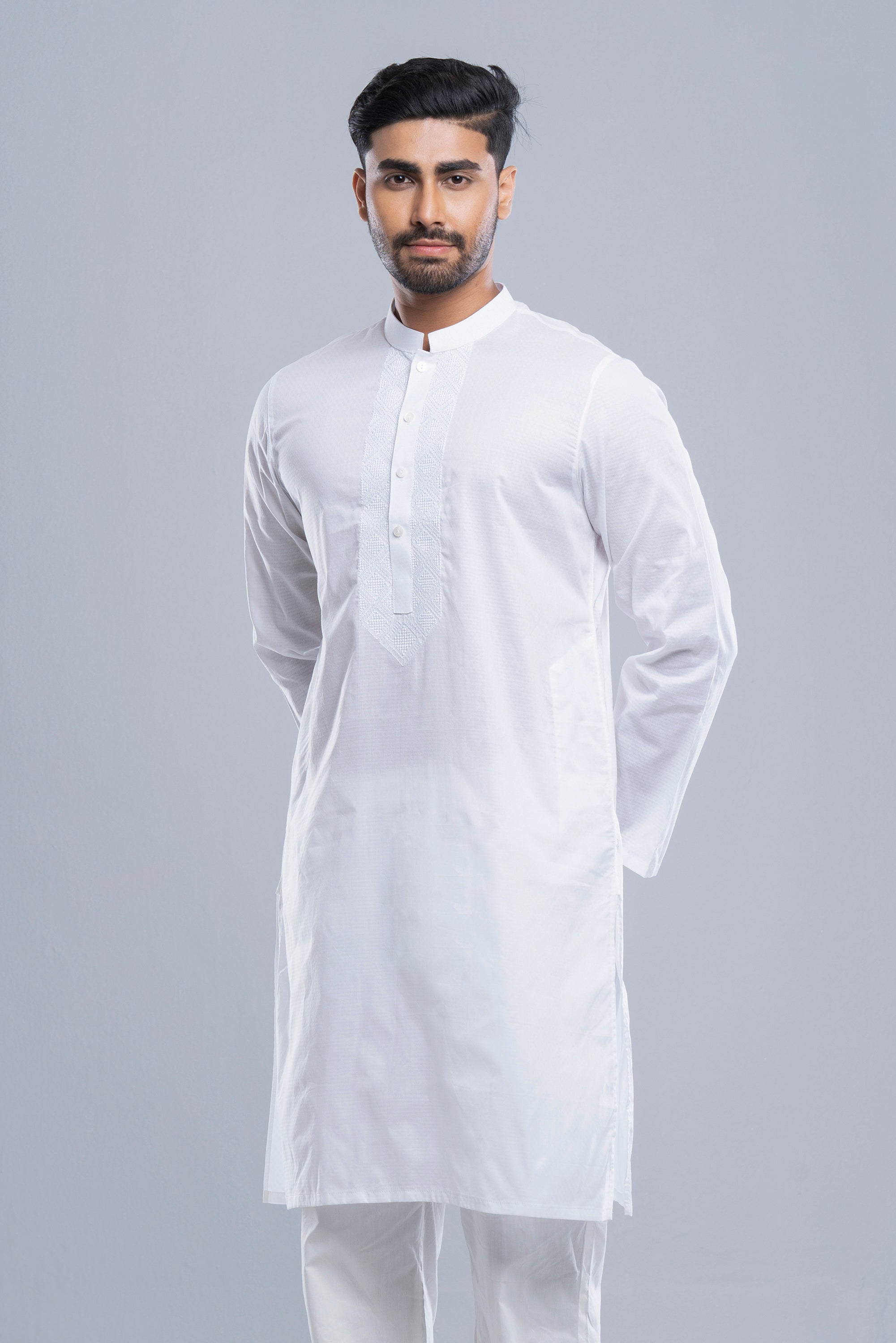 Elevate your traditional wardrobe with this classic Panjabi, crafted from 100% pure cotton for all-day comfort and breathability. Designed in a regular fit, it ensures ease of movement while maintaining a sharp silhouette. This semi formal look is enhanced with elegant embroidery around the placket, adding a refined touch of detail. Finished with MOP buttons, this Panjabi blends timeless style with modern craftsmanship—perfect for festive occasions or casual elegance.