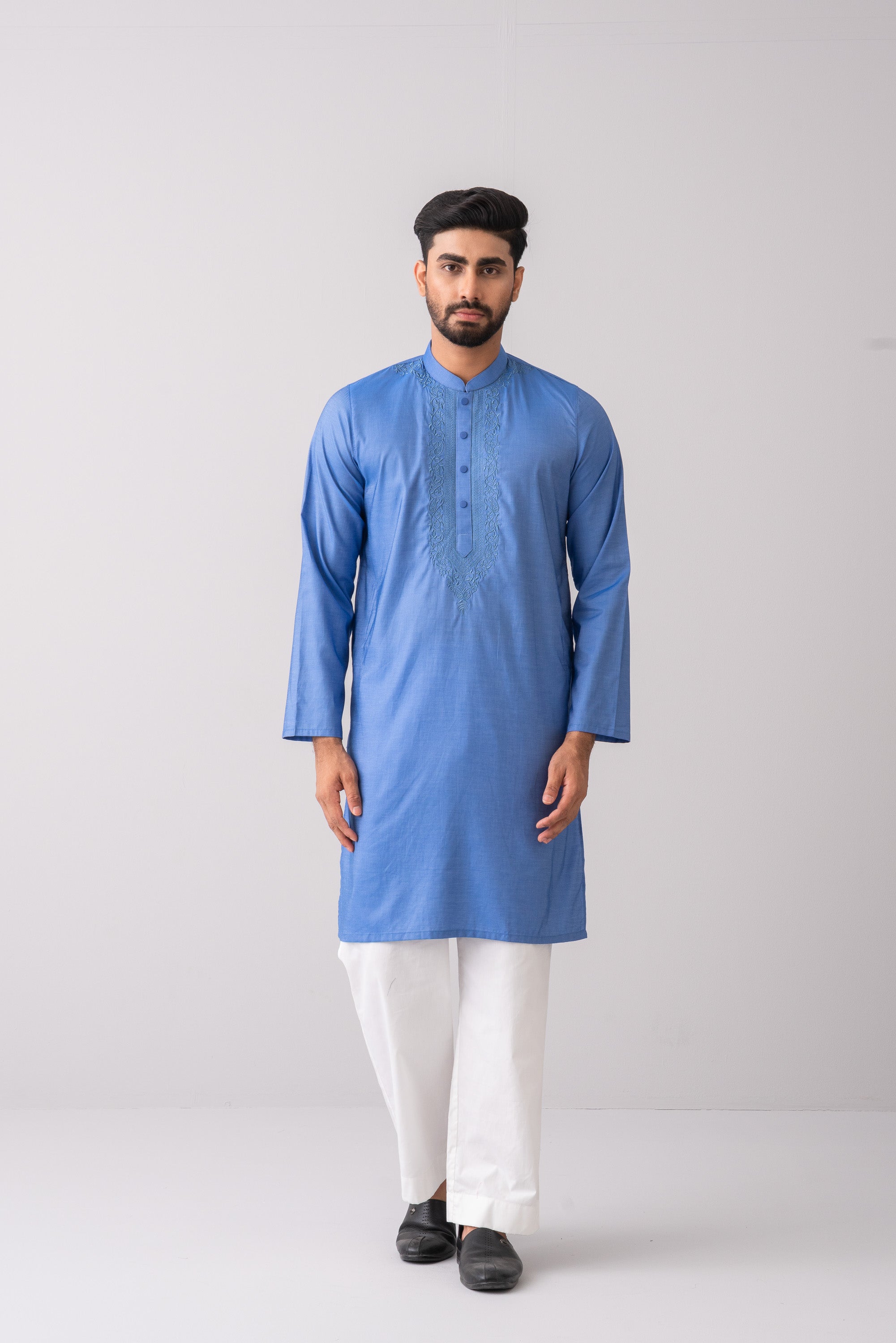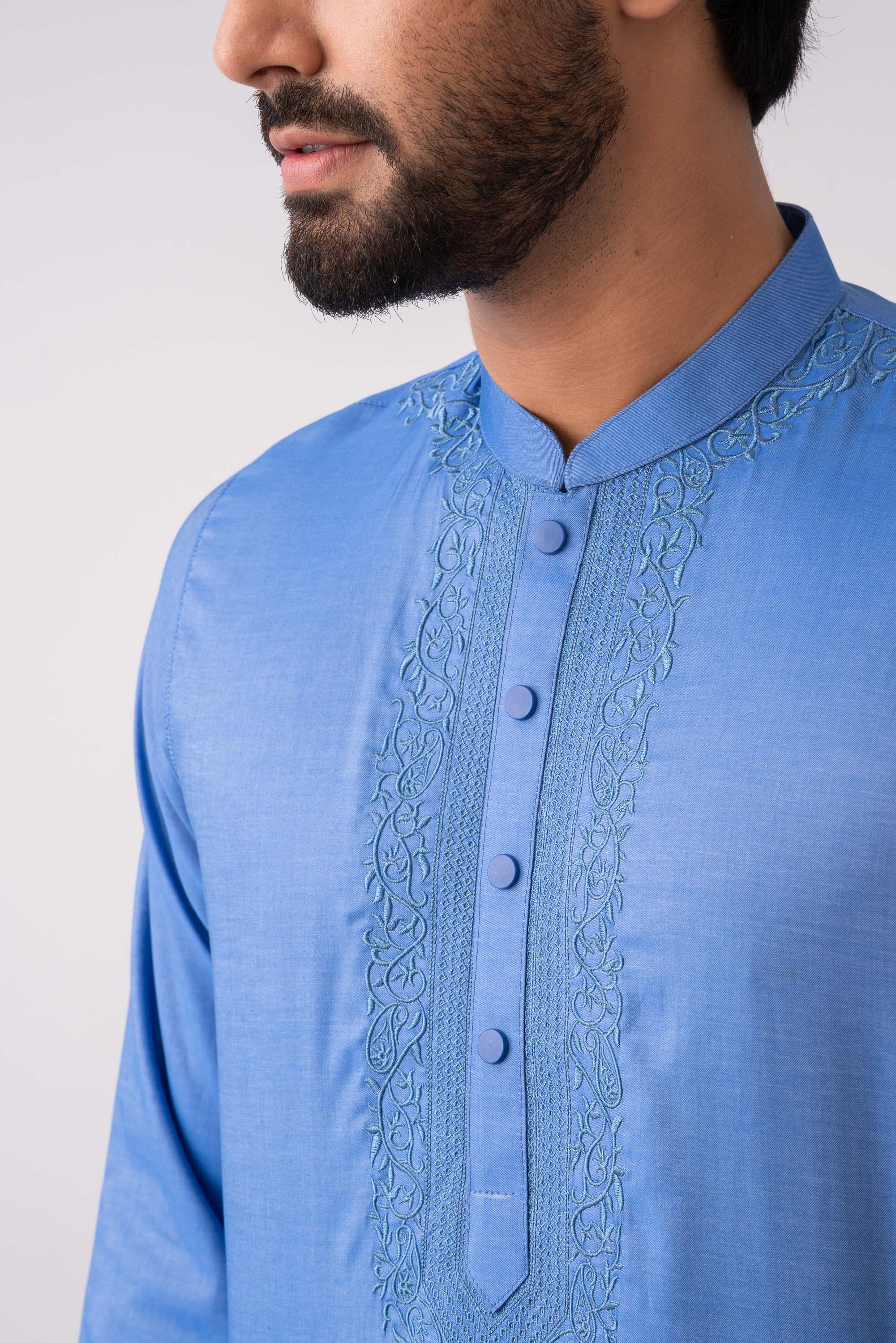 A regular fit Panjabi crafted from 100% cotton breathable fabric, featuring premium embroidery detailing on around placket with DTM snap buttons, offers a stylish yet comfortable semi-formal look. Perfect for effortless elegance and all-day ease.