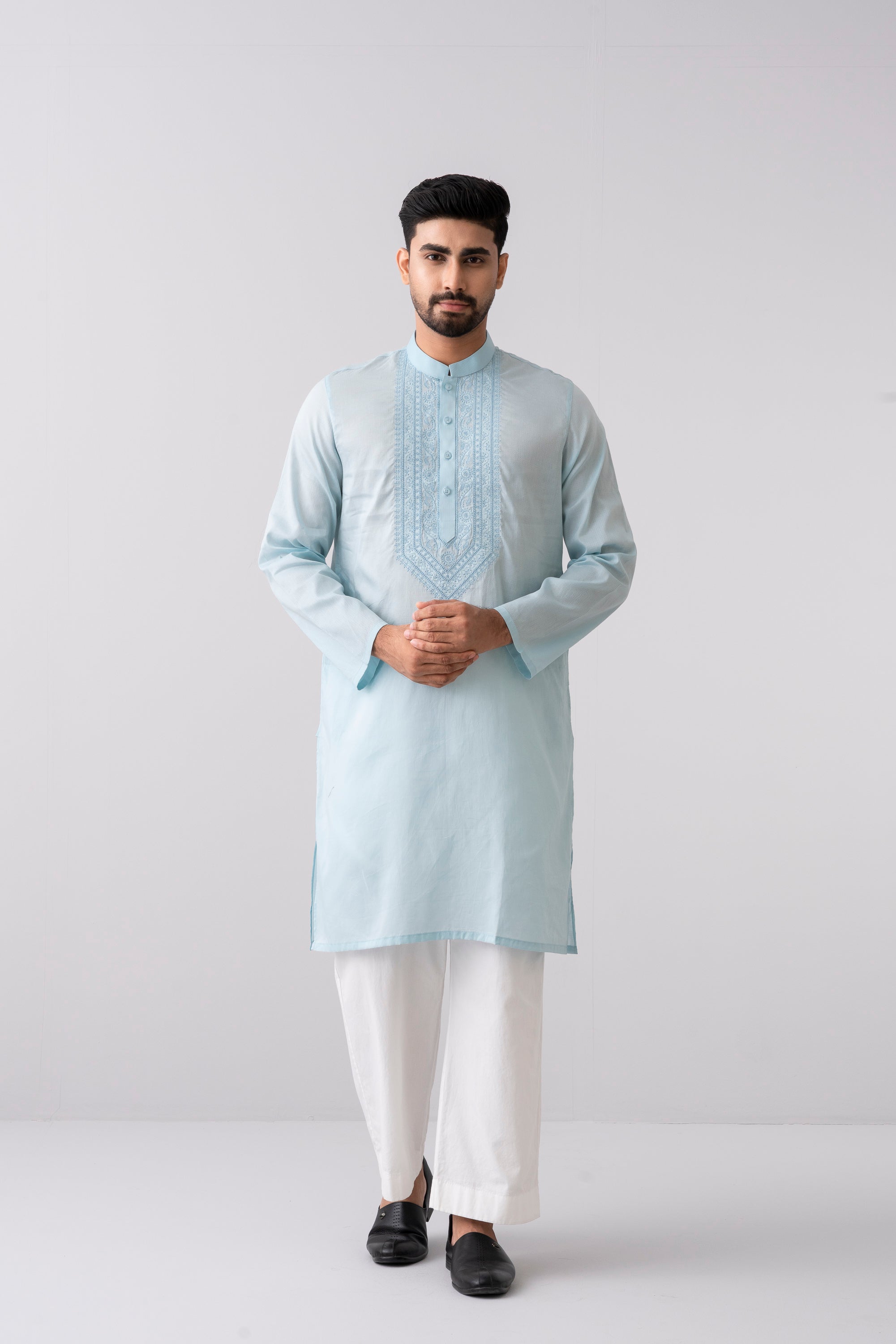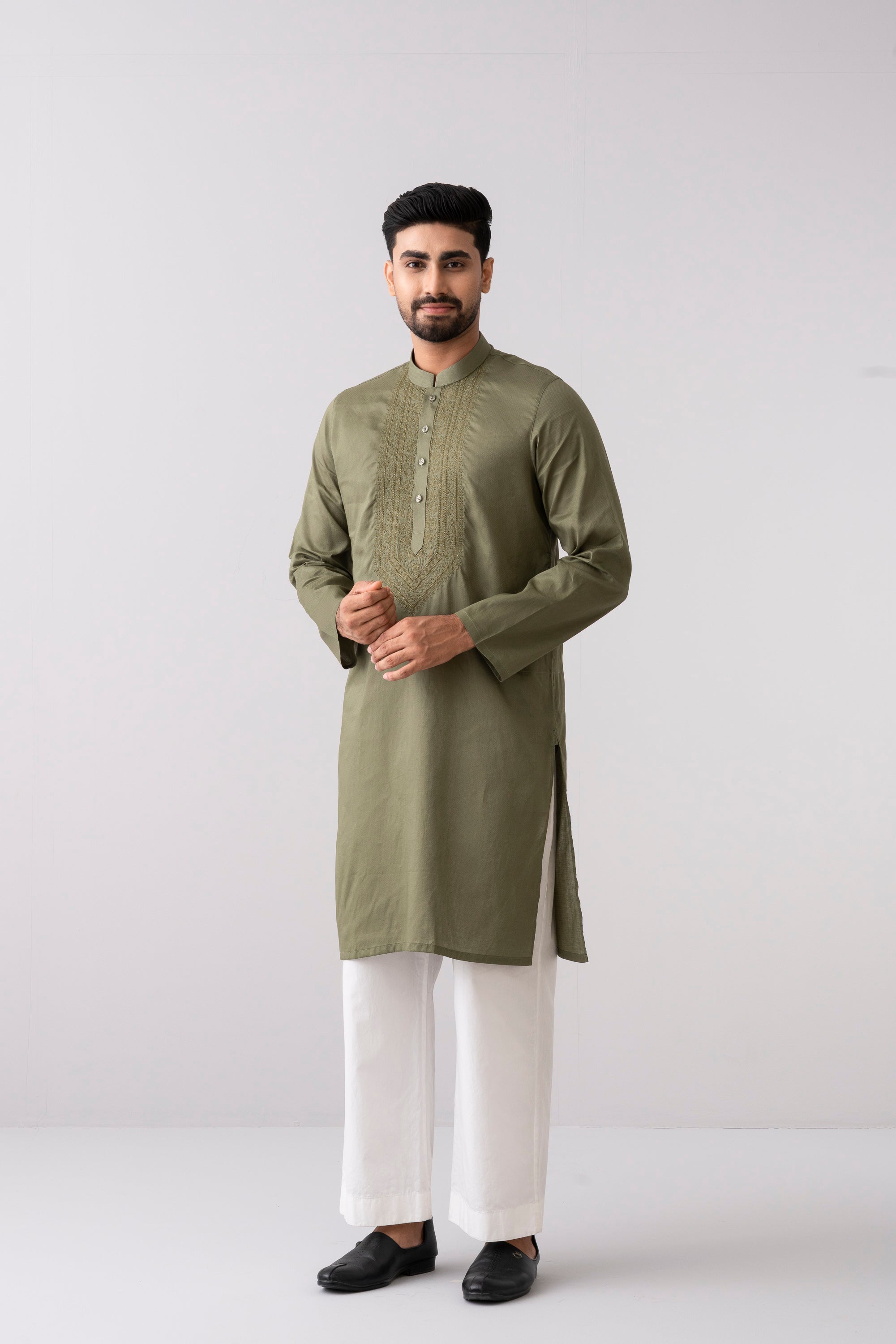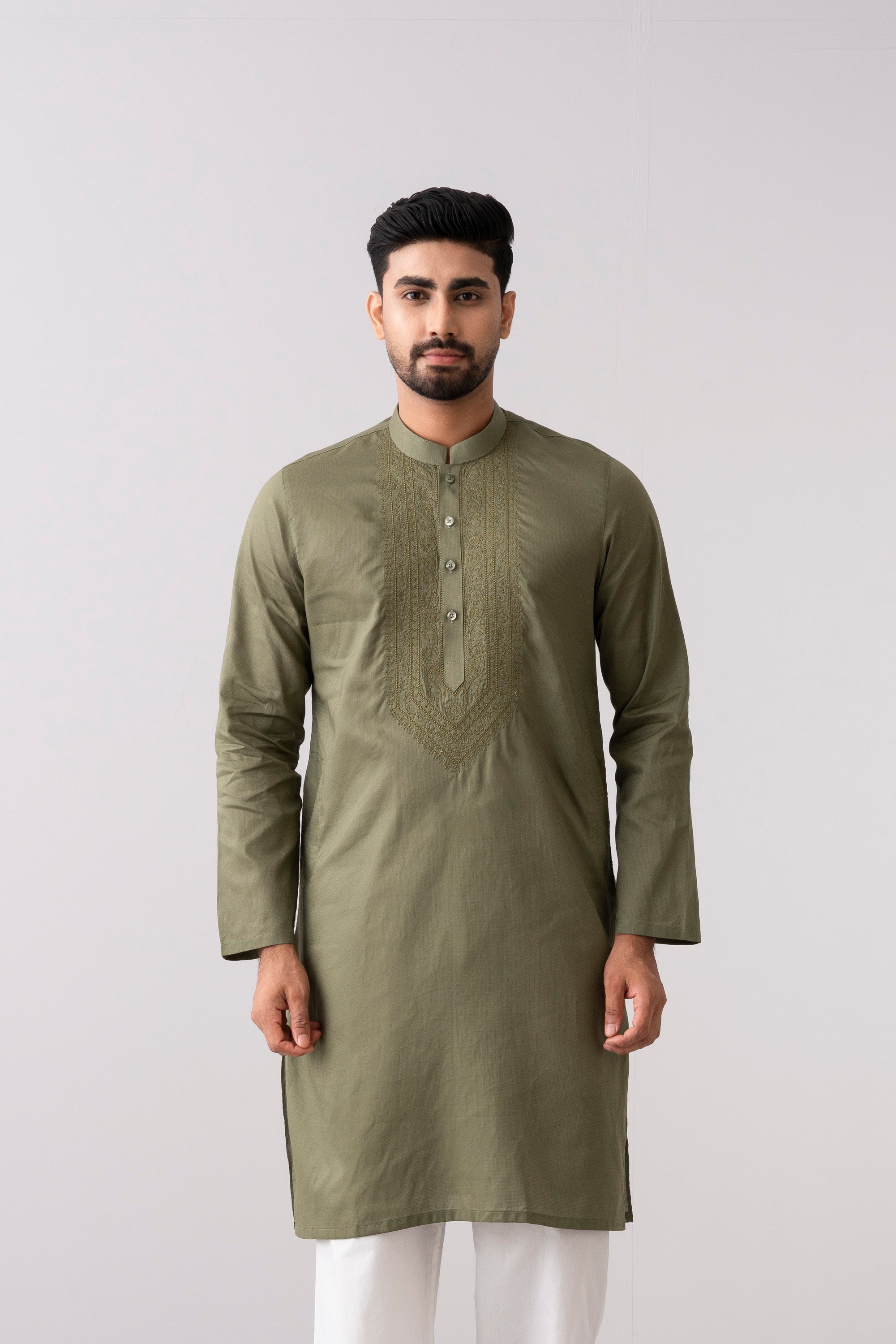 A regular fit Panjabi crafted from 100% cotton breathable fabric, featuring premium embroidery detailing on around placket with DTM buttons, offers a stylish yet comfortable