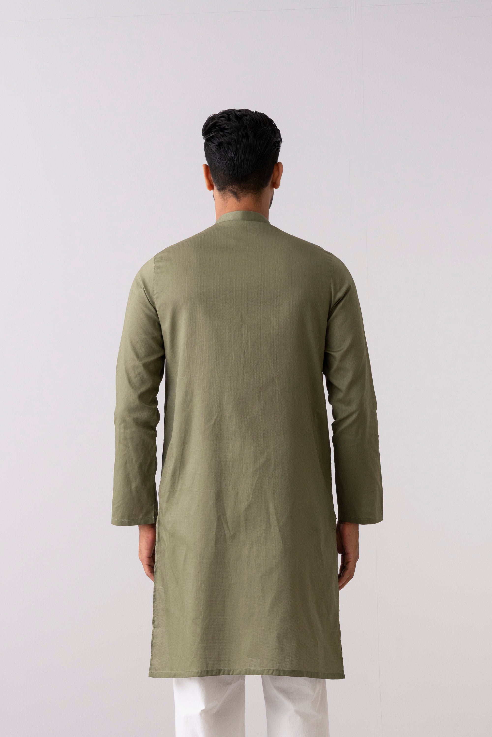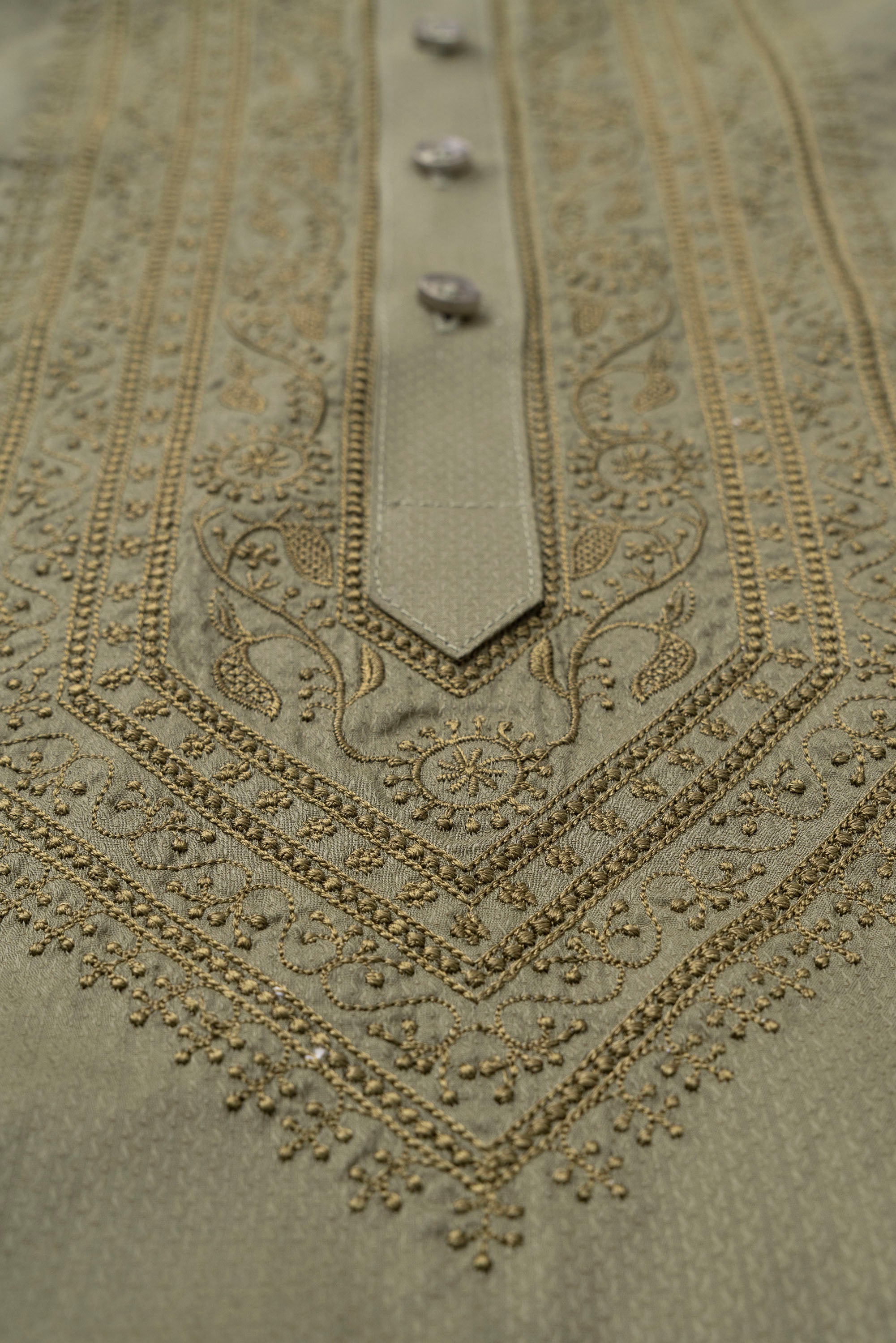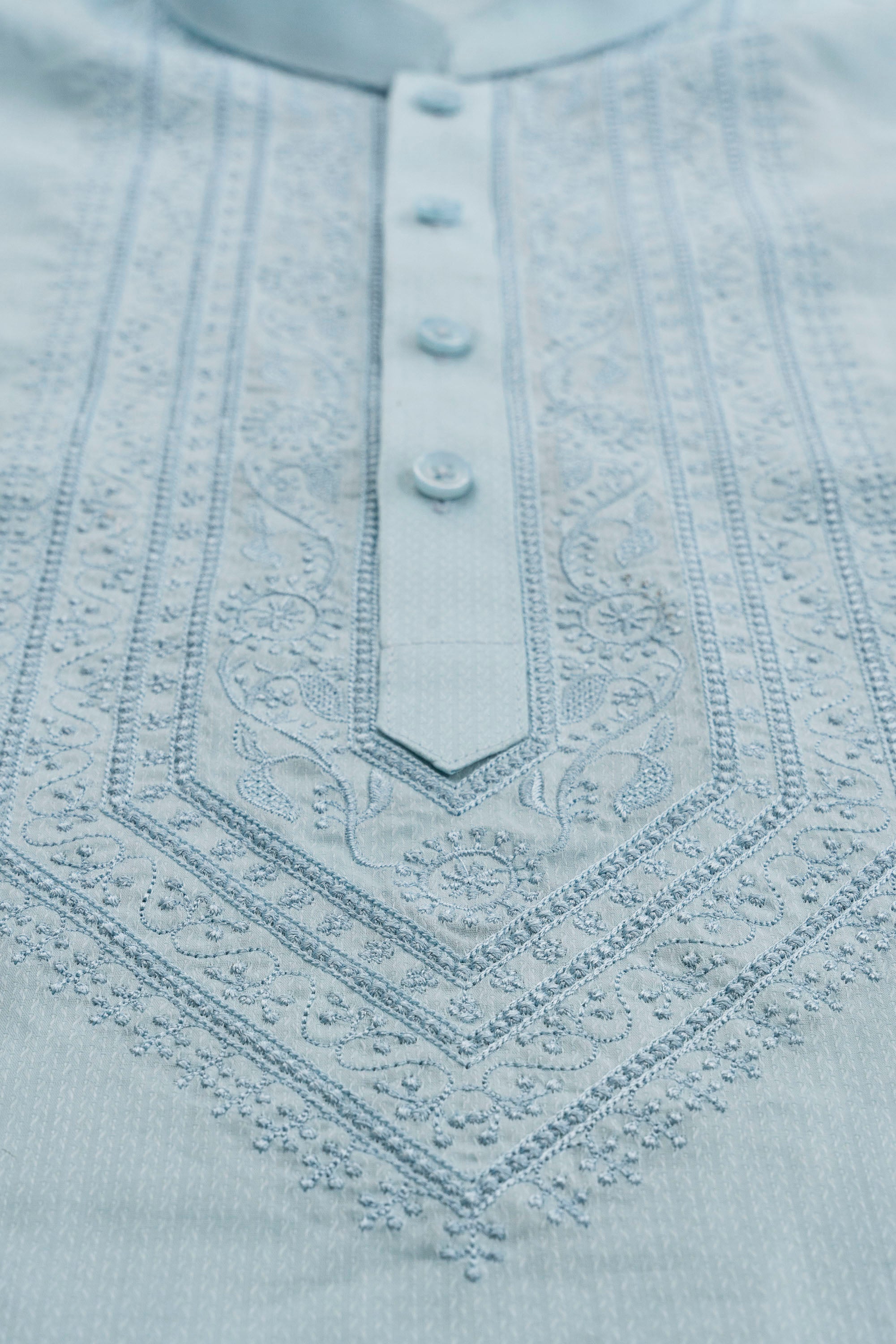 A regular fit Panjabi crafted from 100% cotton breathable fabric, featuring premium embroidery detailing on around placket with DTM buttons, offers a stylish yet comfortable