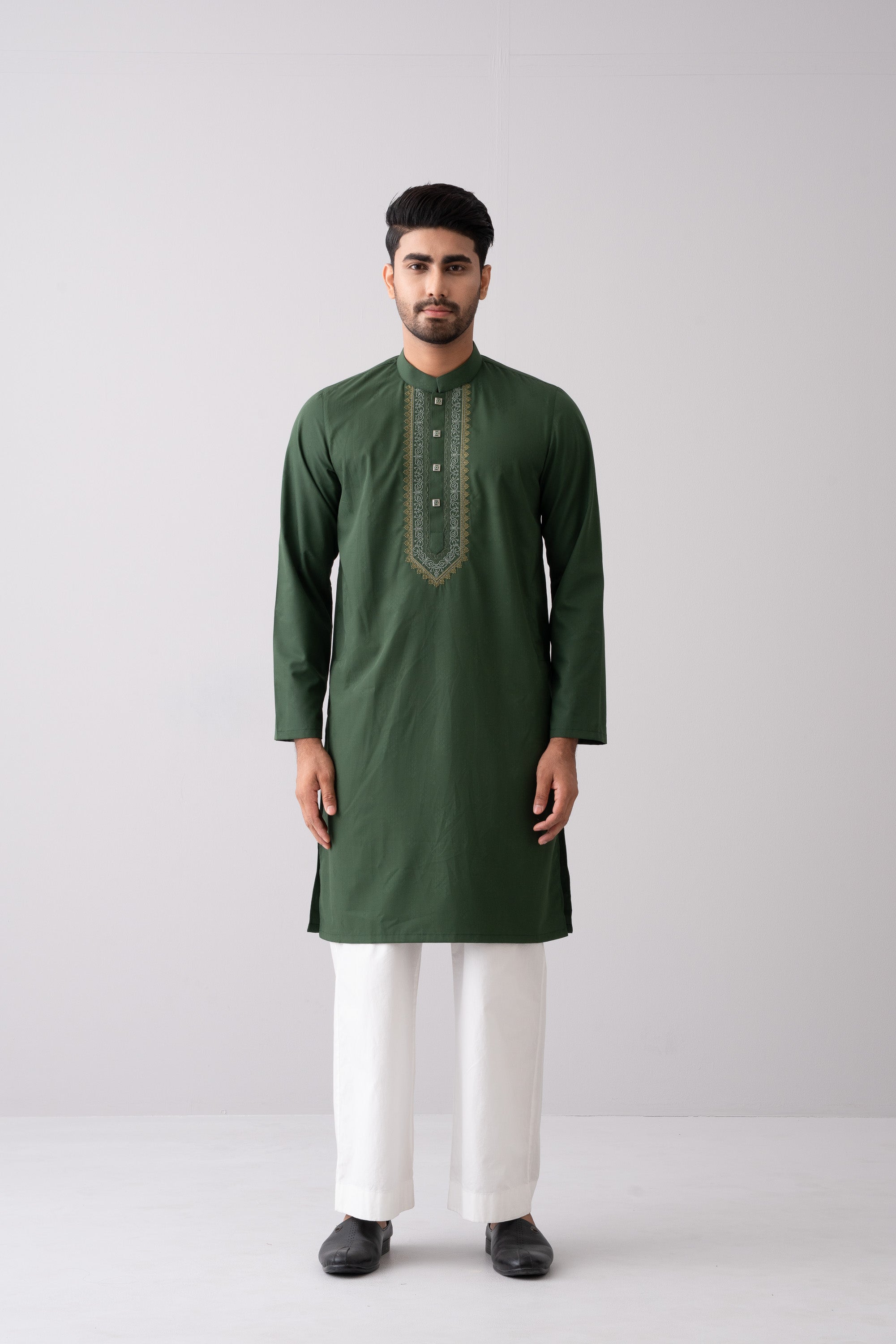 A regular fit Panjabi crafted from 100% breathable blended jacquard fabric, featuring embroidery detailing on around placket with decorative snap buttons, offers a stylish yet comfortable semi formal look. Perfect for effortless elegance and all-day ease.
