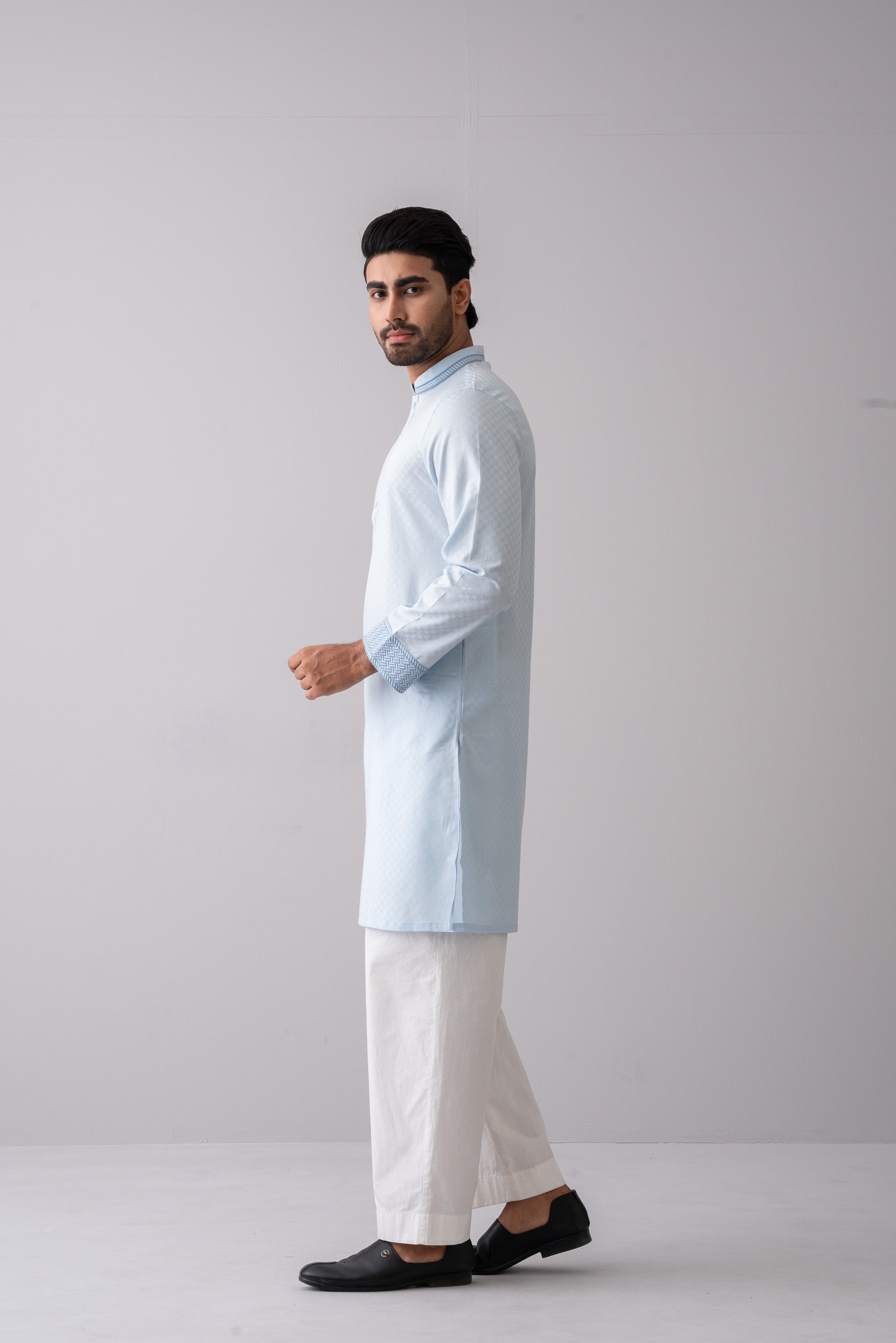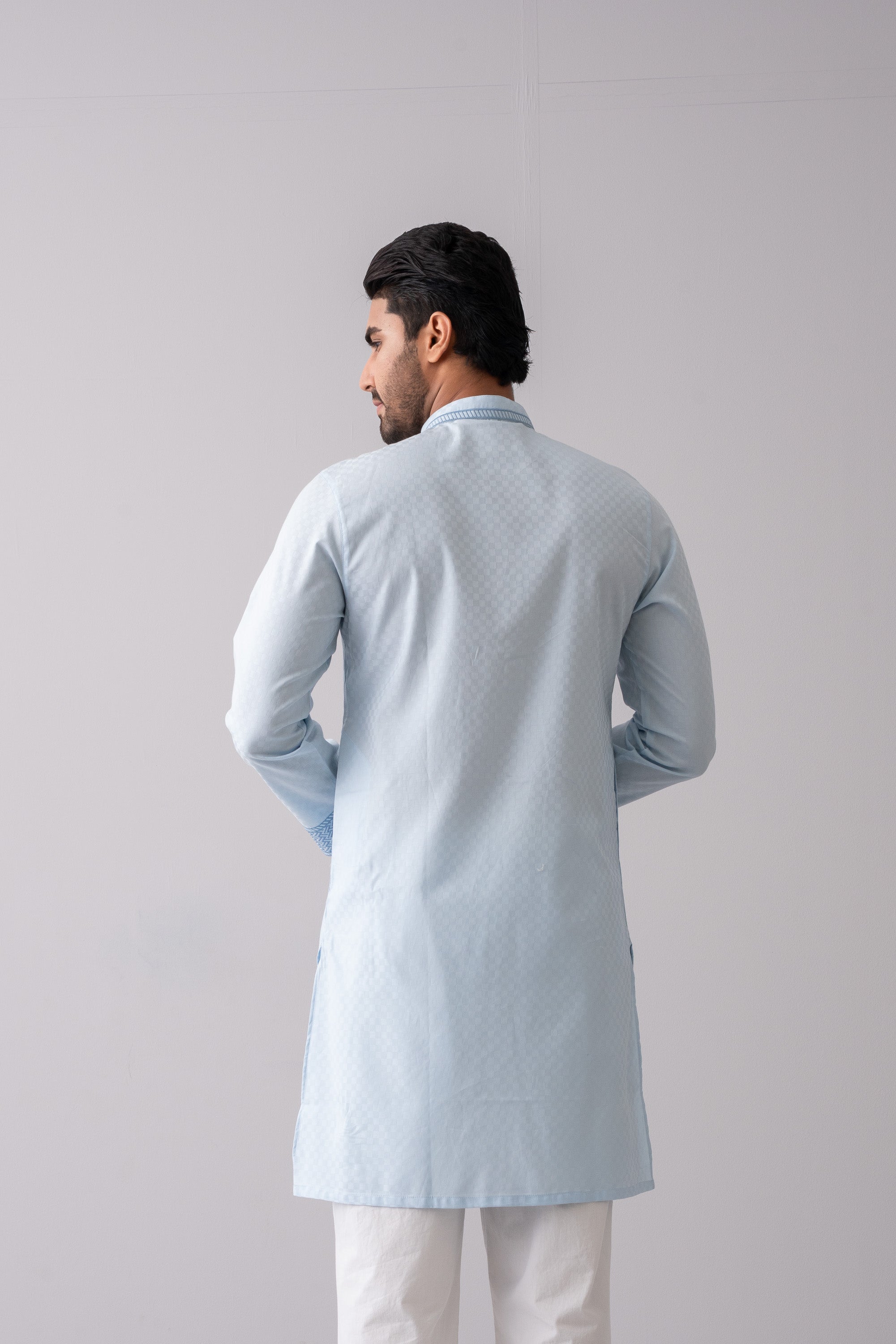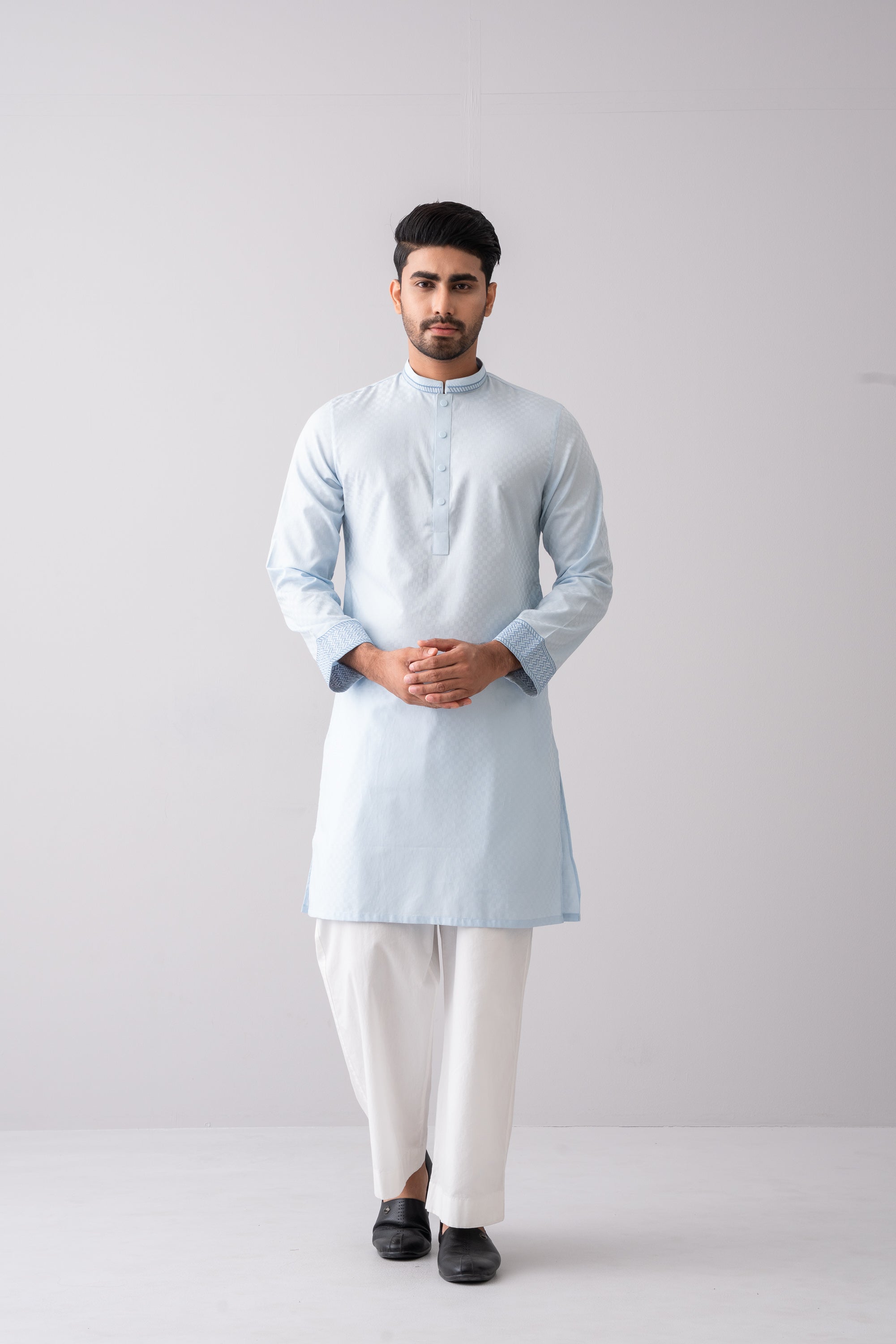 A slim fit Panjabi crafted from 100% cotton dobby fabric, featuring embroidery detailing on band and sleeve hem with DTM snap buttons, offers a stylish yet comfortable semi formal look. Perfect for effortless elegance and all-day ease.