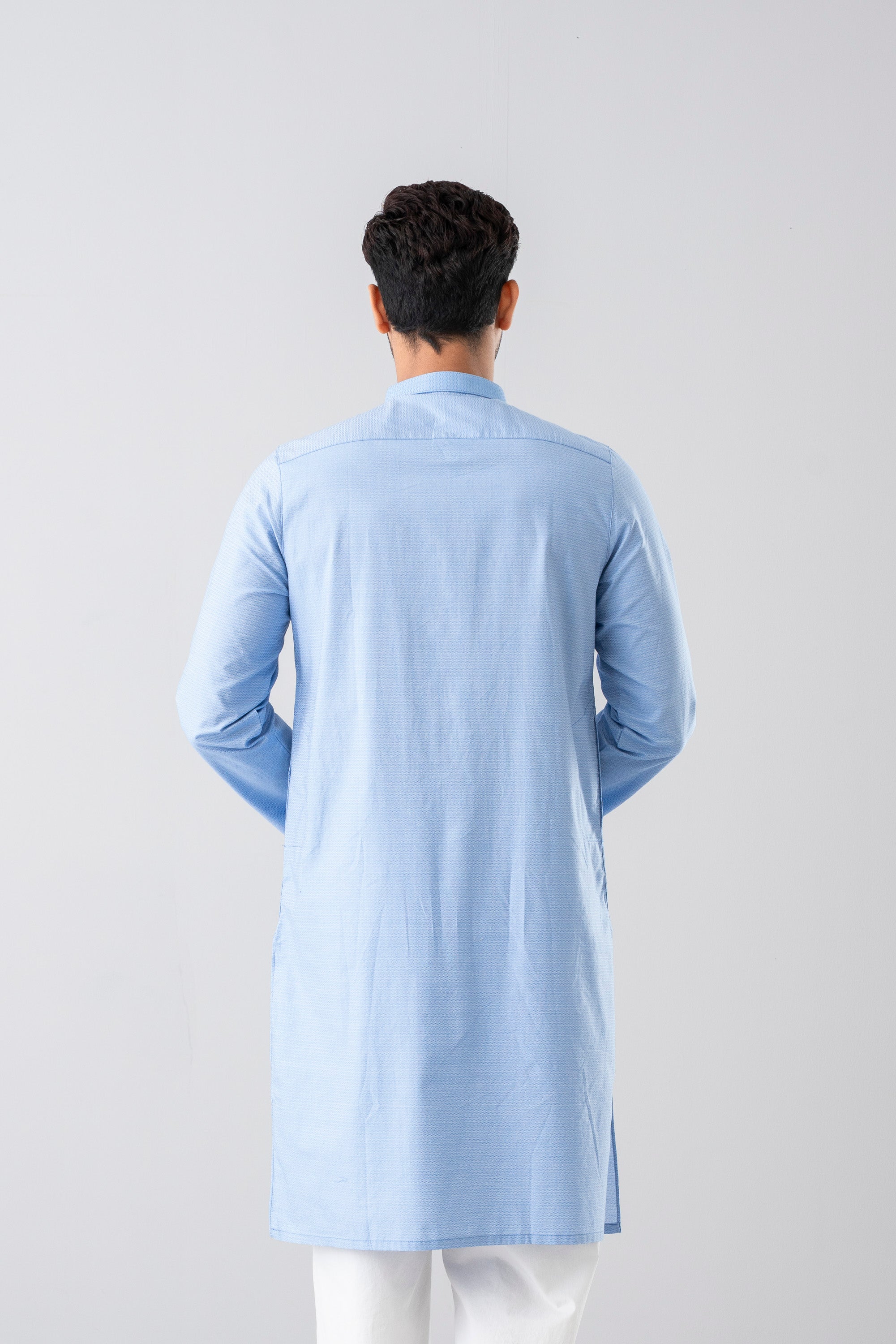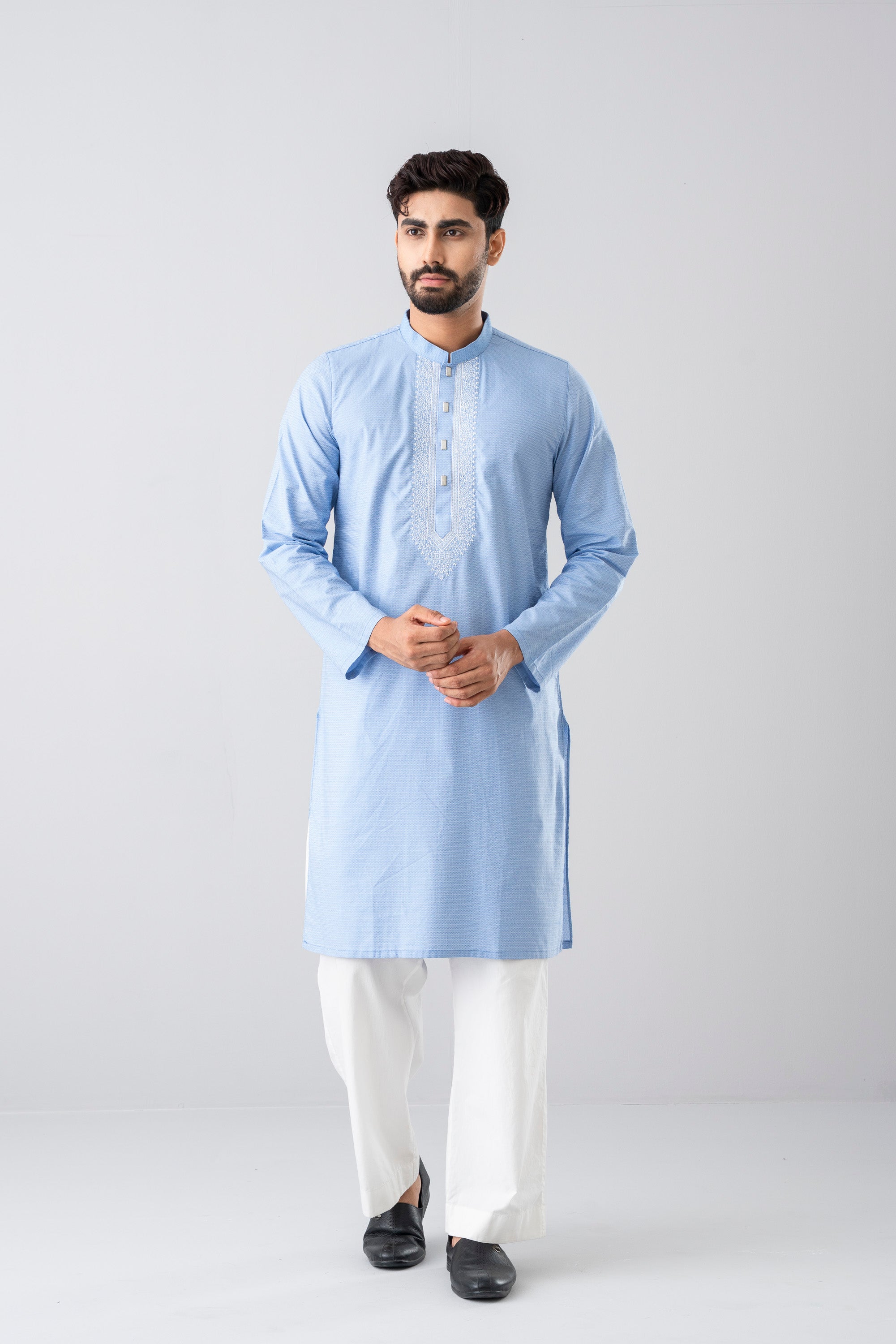 Crafted from dobby fabric, this men’s Panjabi features floral embroidery around the placket with decorative snap buttons, offering a refined semi-formal look perfect for the season.