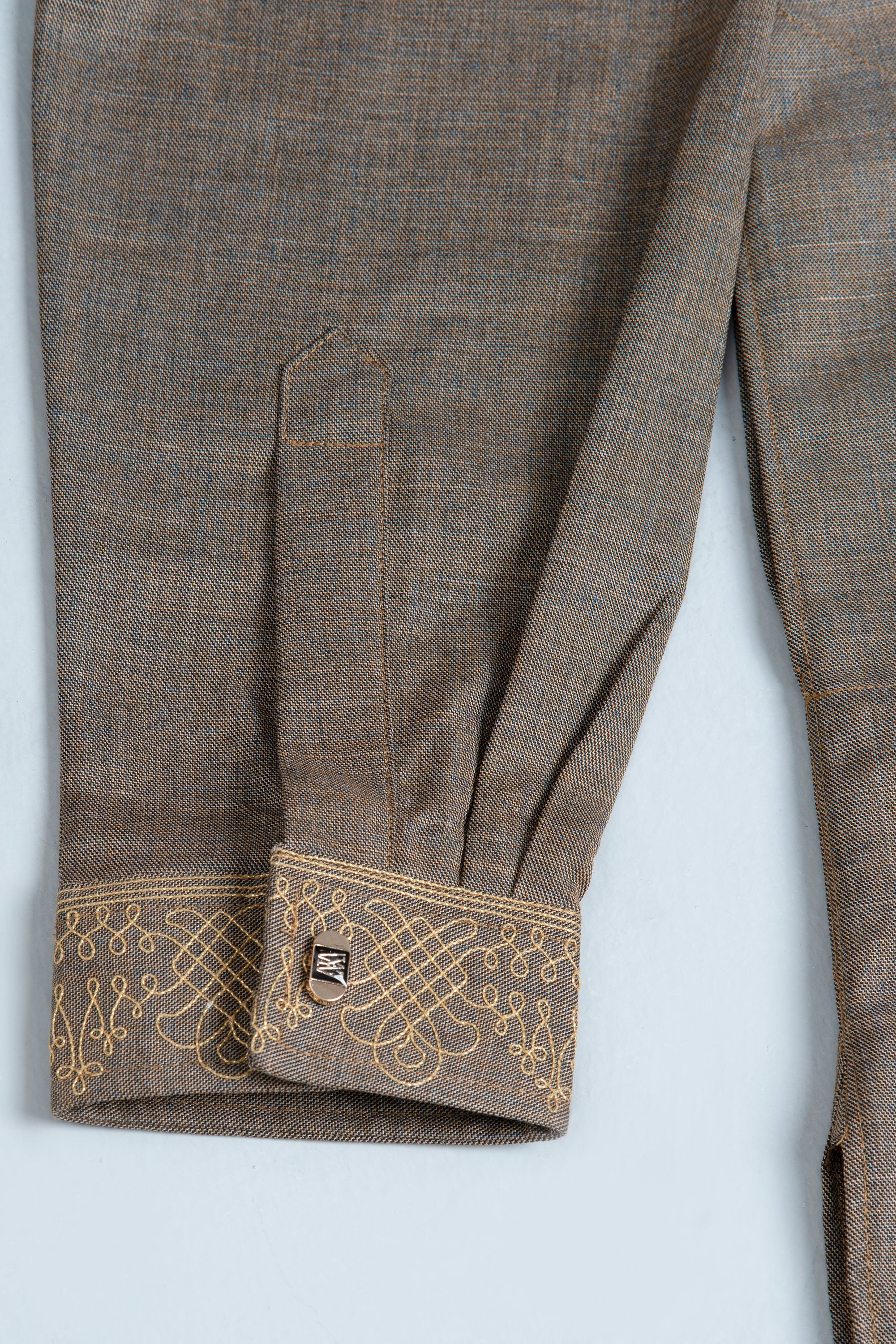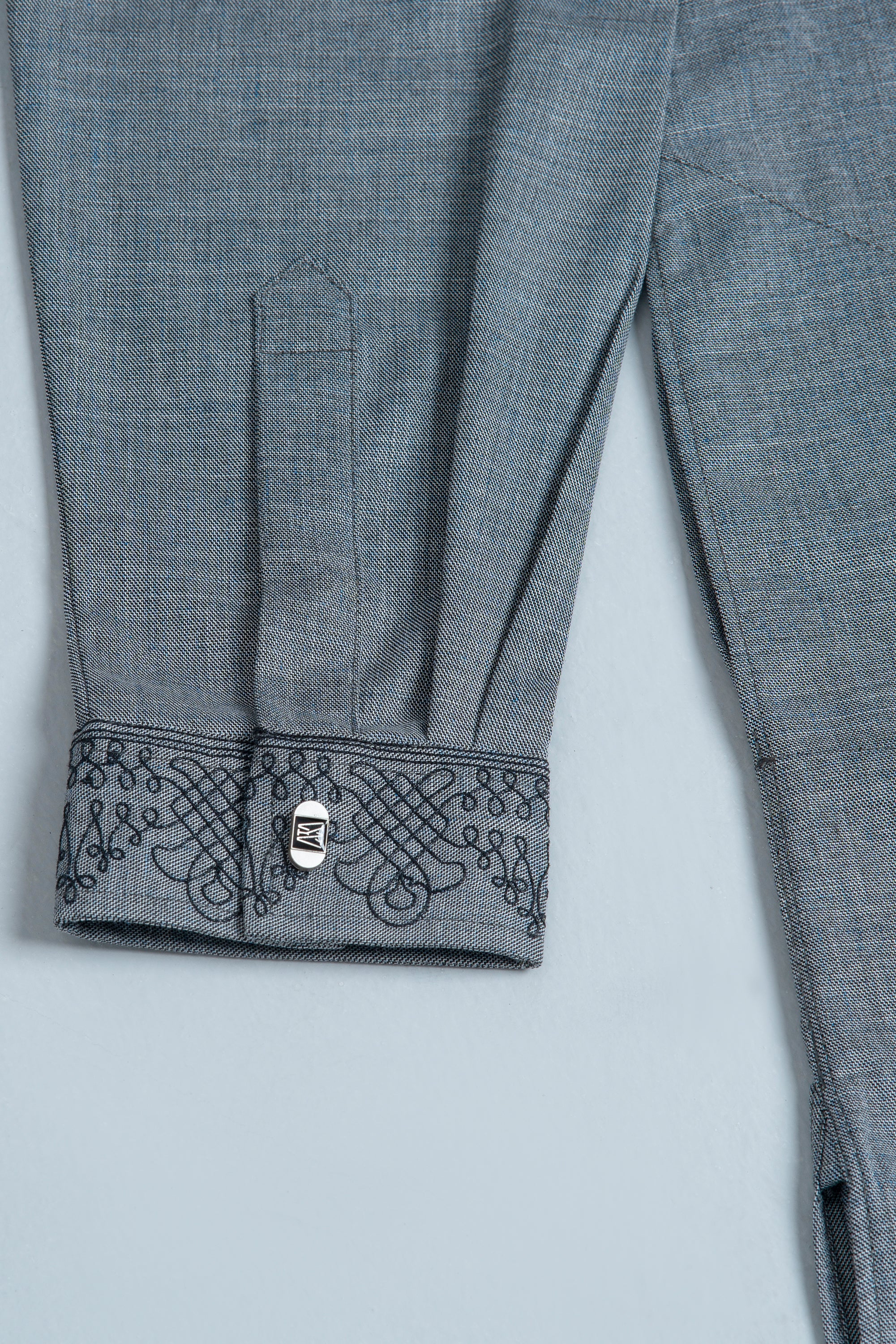 1% spandex breathable fabric, featuring classical around placket and cuff embroidery