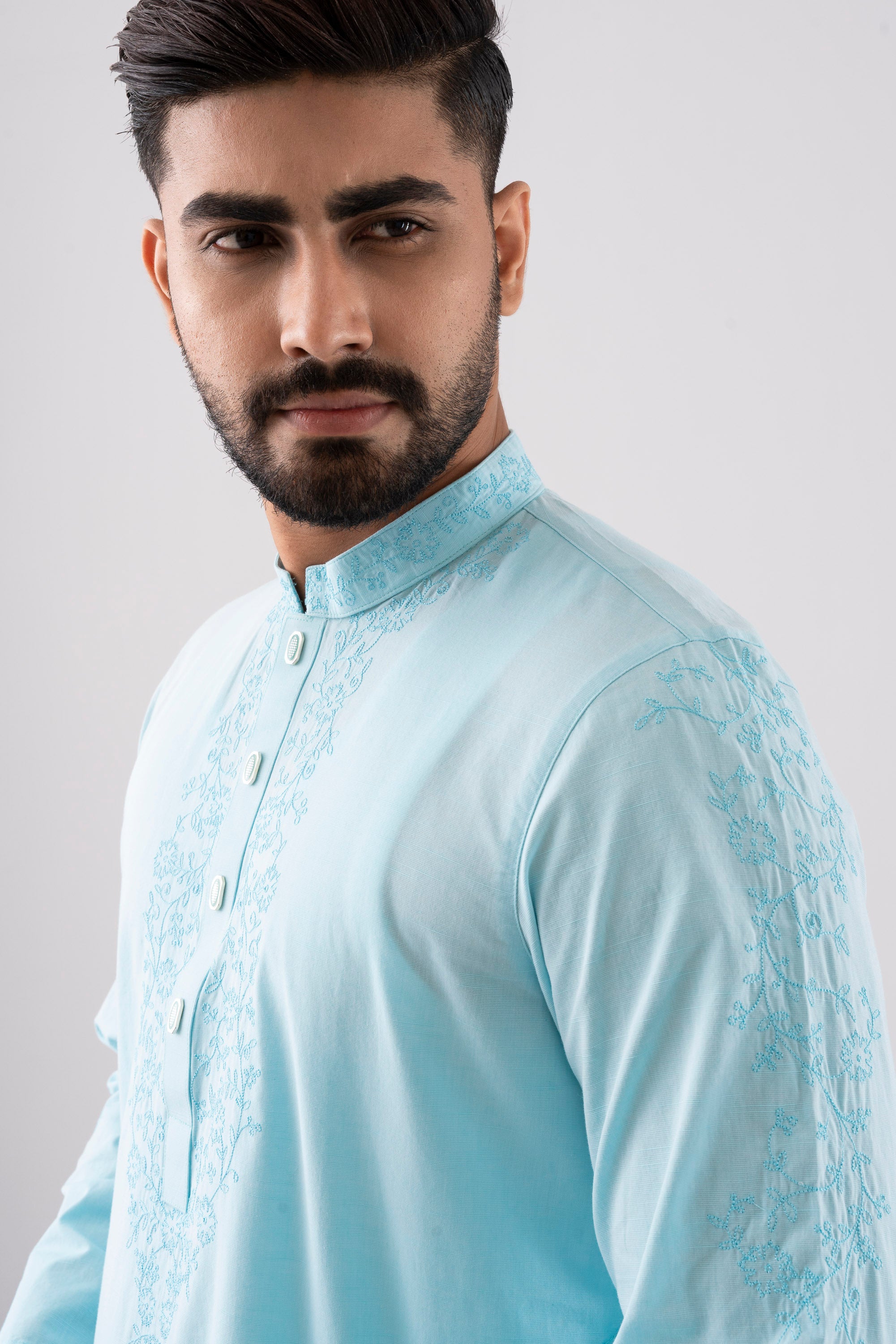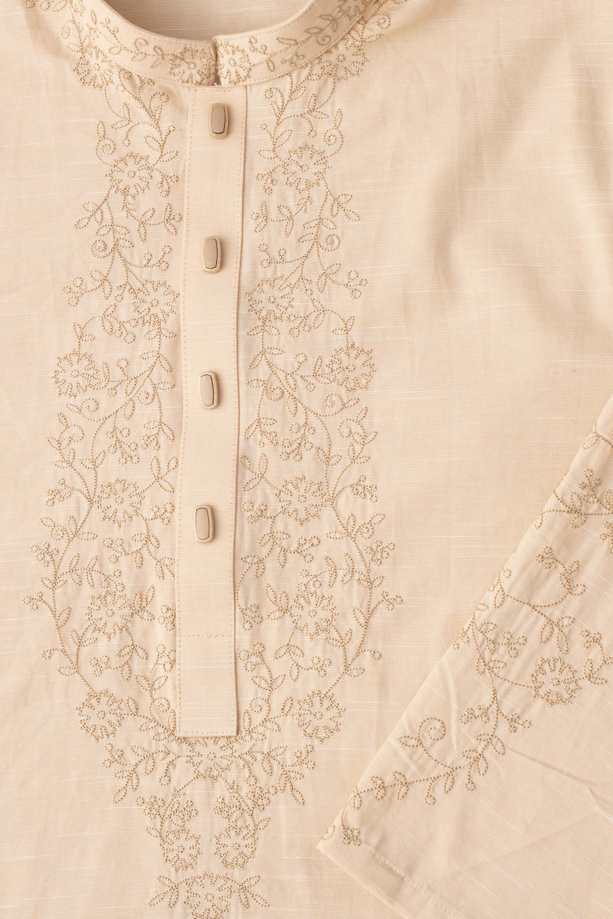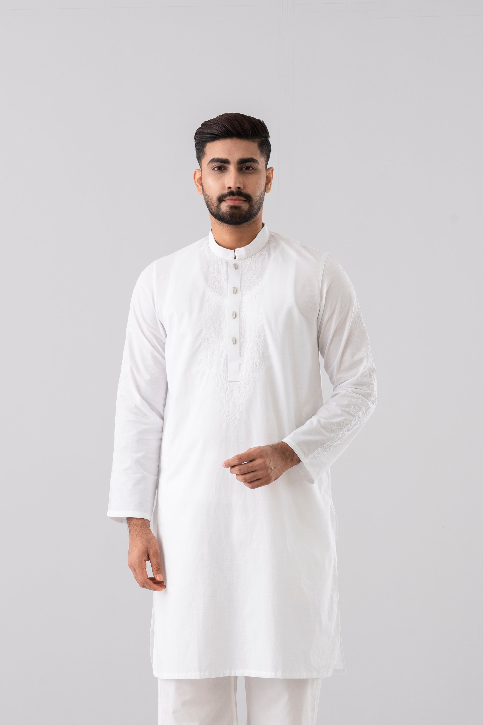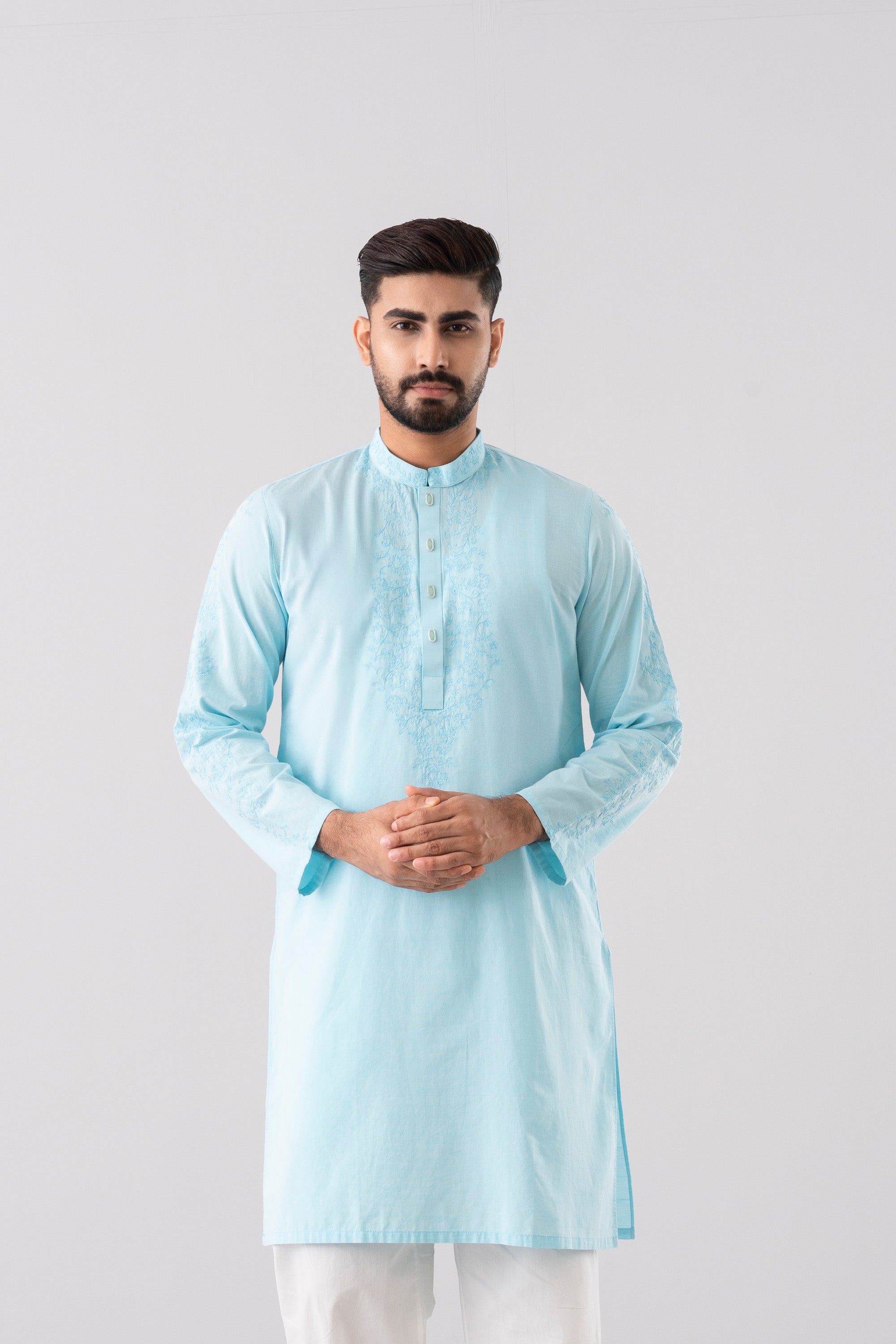 A regular-fit Panjabi crafted from 100% cotton fabric with classical embroidery embellishment on around placket, band and sleeves with decorative snap button offers a stylish yet comfortable semi-formal look. This design combines comfort and subtle elegance, making it ideal for a refined and stylish appearance