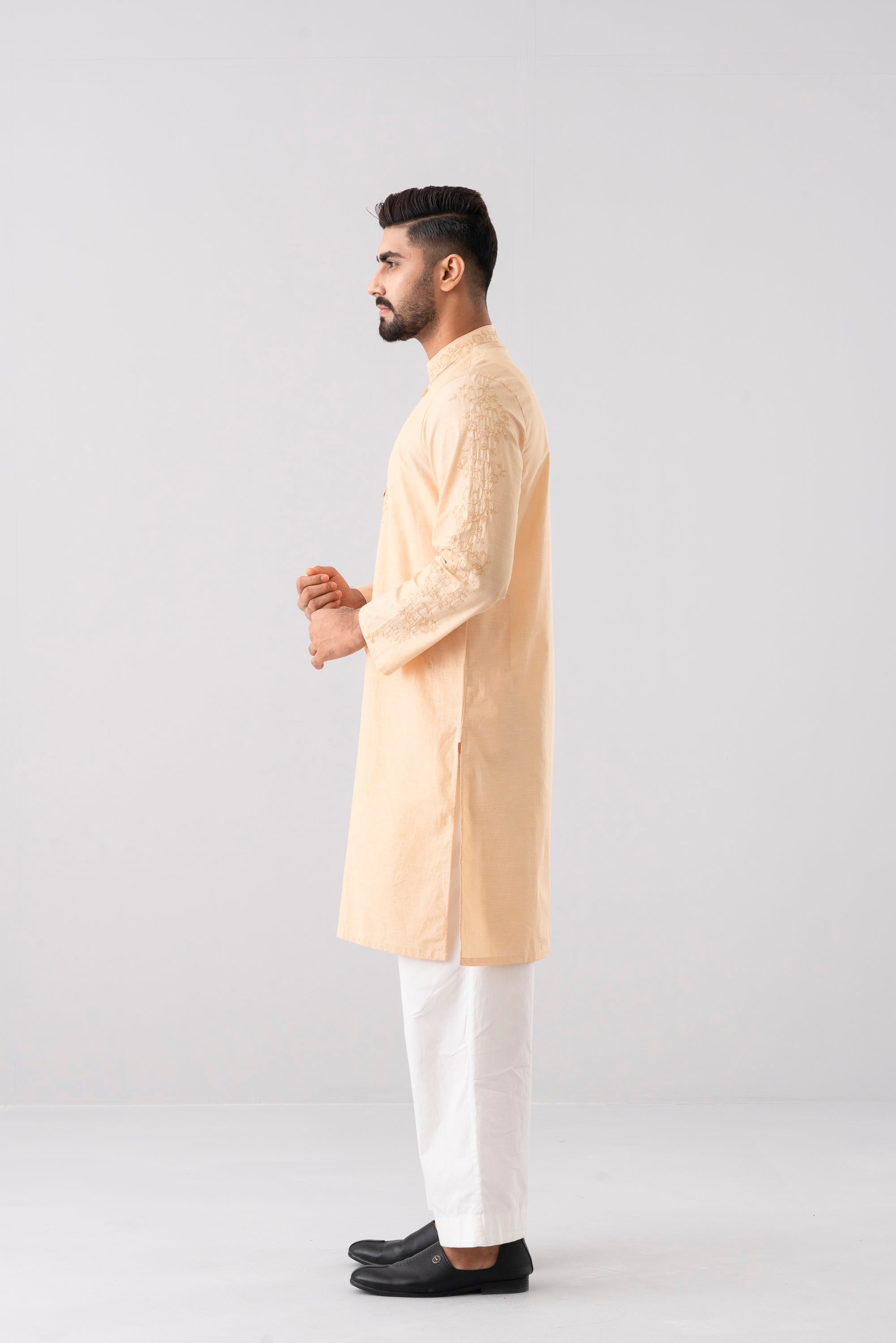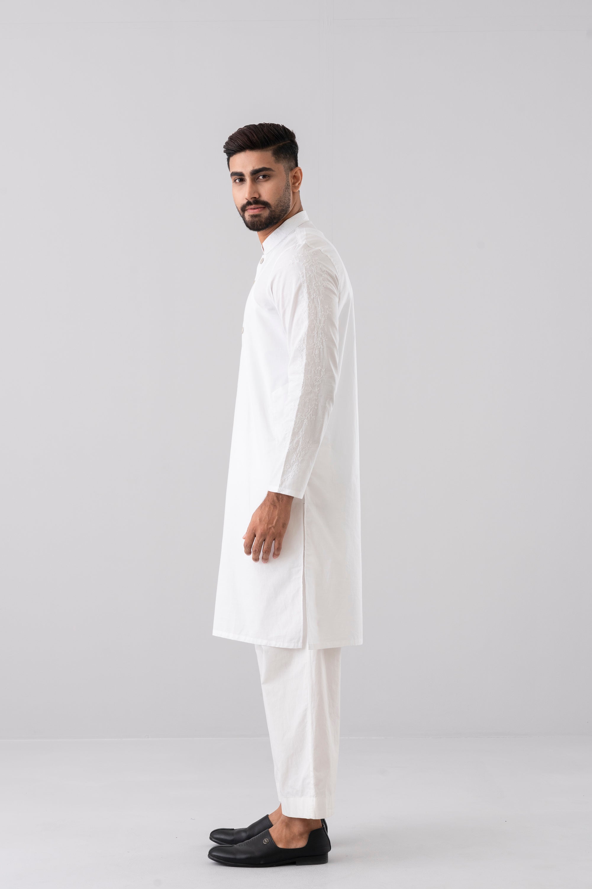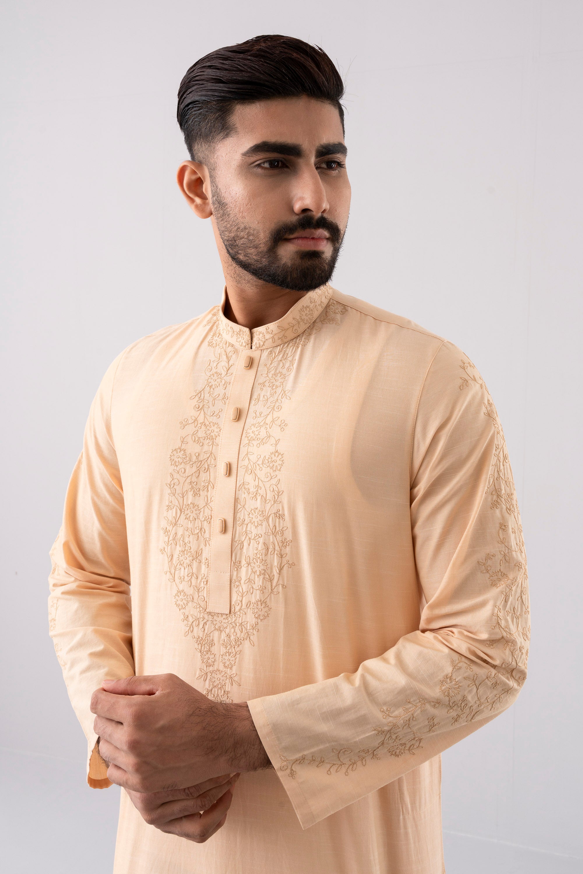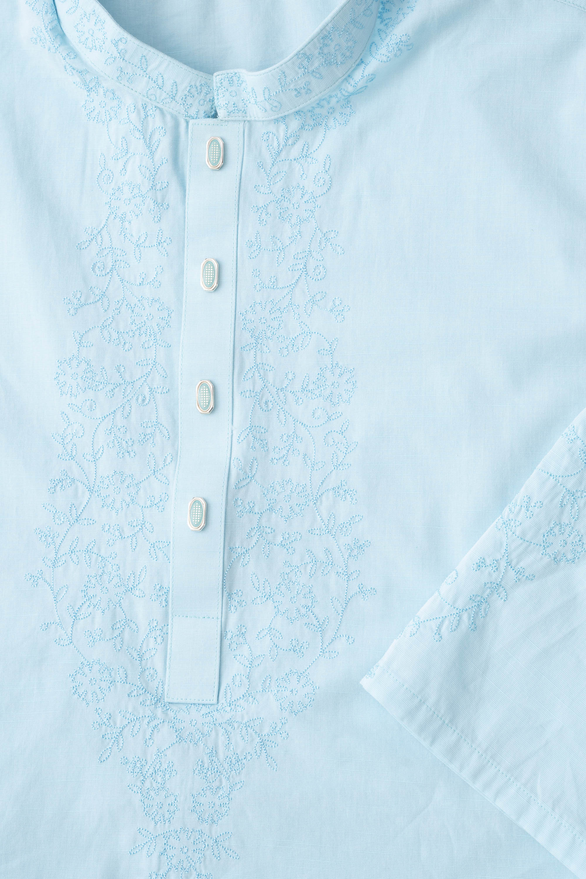 A regular-fit Panjabi crafted from 100% cotton fabric with classical embroidery embellishment on around placket, band and sleeves with decorative snap button offers a stylish yet comfortable semi-formal look. This design combines comfort and subtle elegance, making it ideal for a refined and stylish appearance