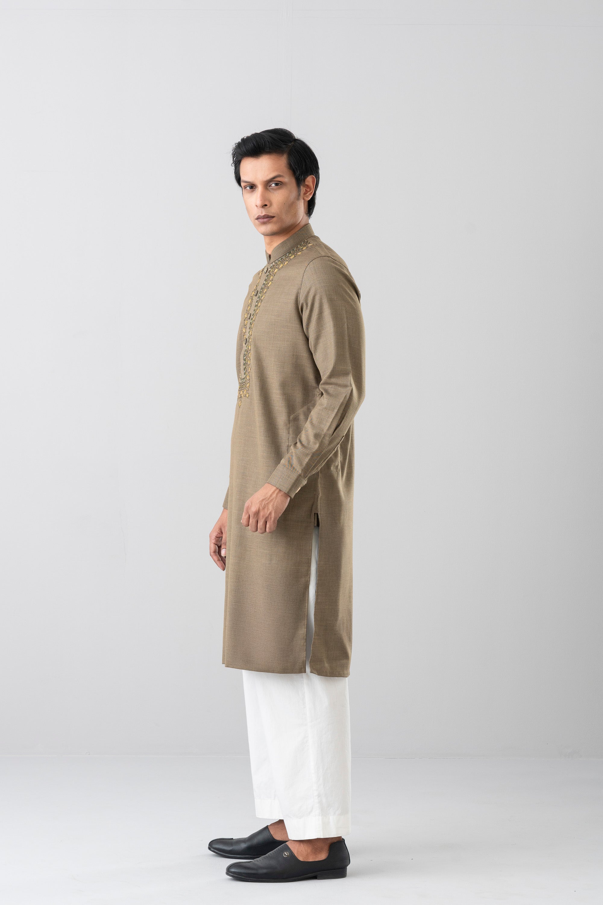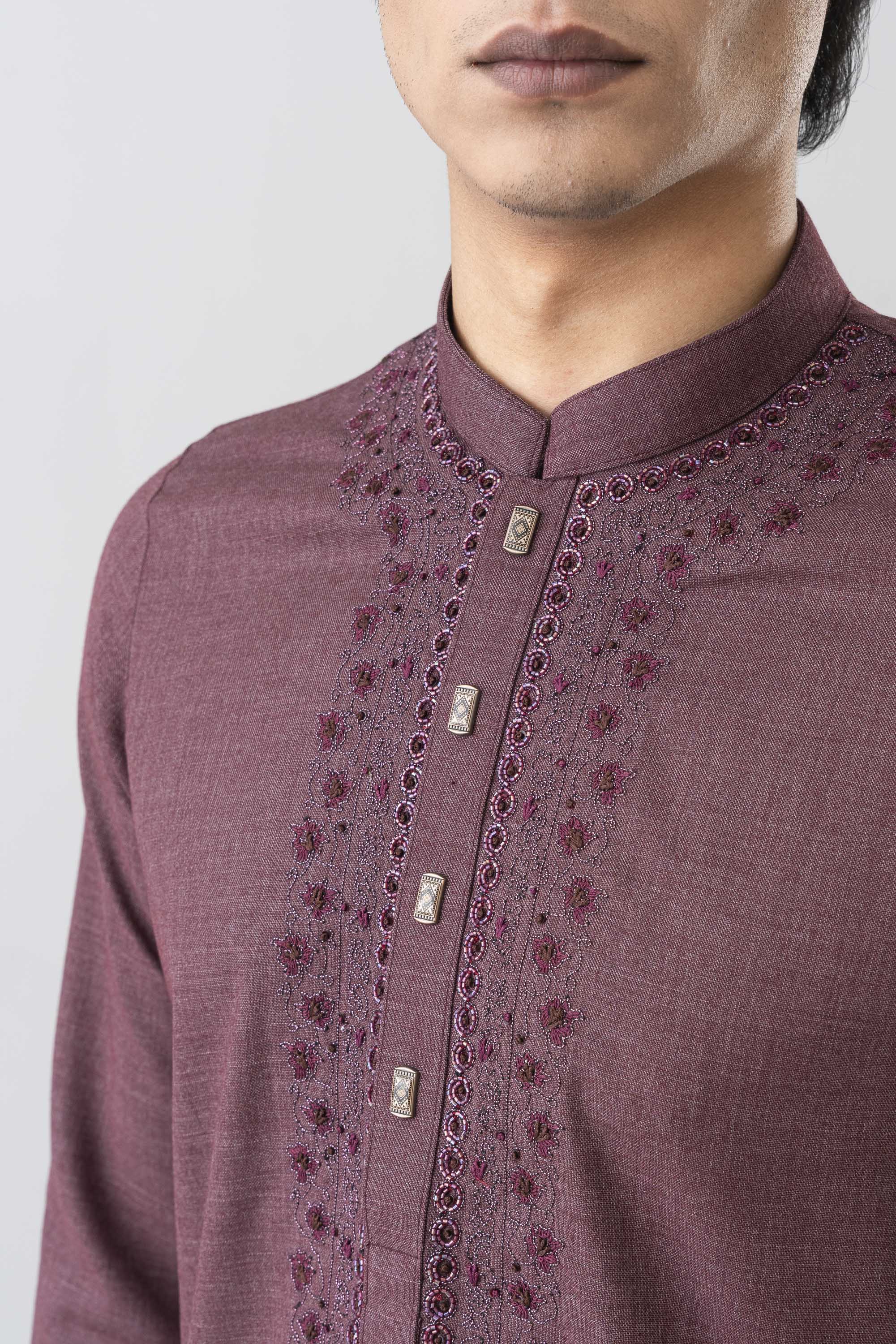 A regular-fit Panjabi crafted from premium breathable fabric with tencel rayon blend, featuring classical around placket embroidery with decorative snap buttons, offers a stylish yet comfortable formal look. Perfect for effortless elegance in every occasion.