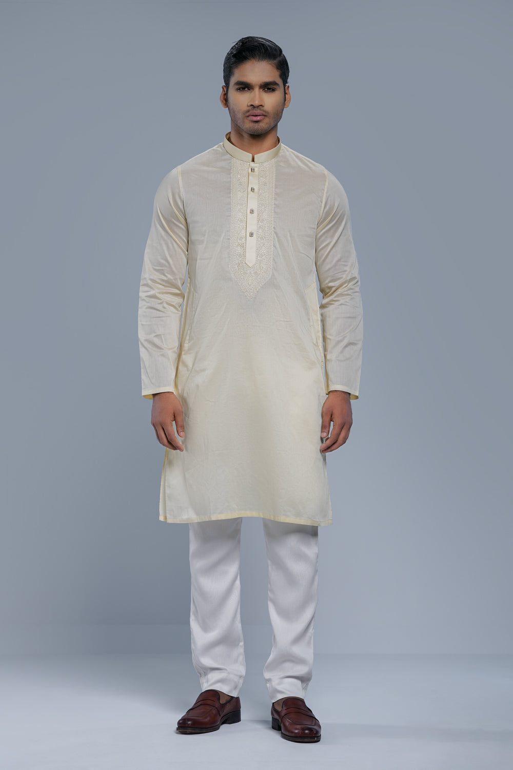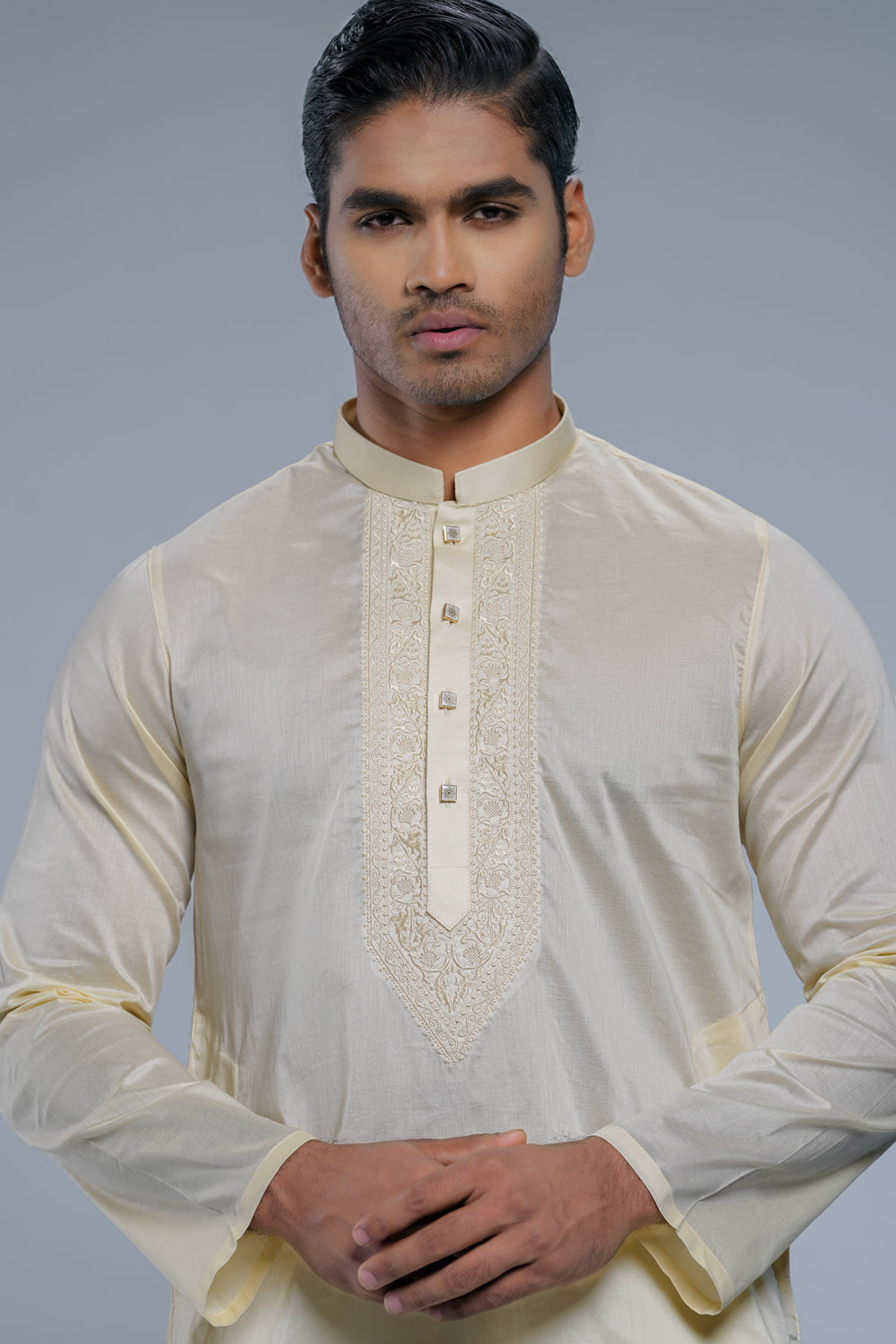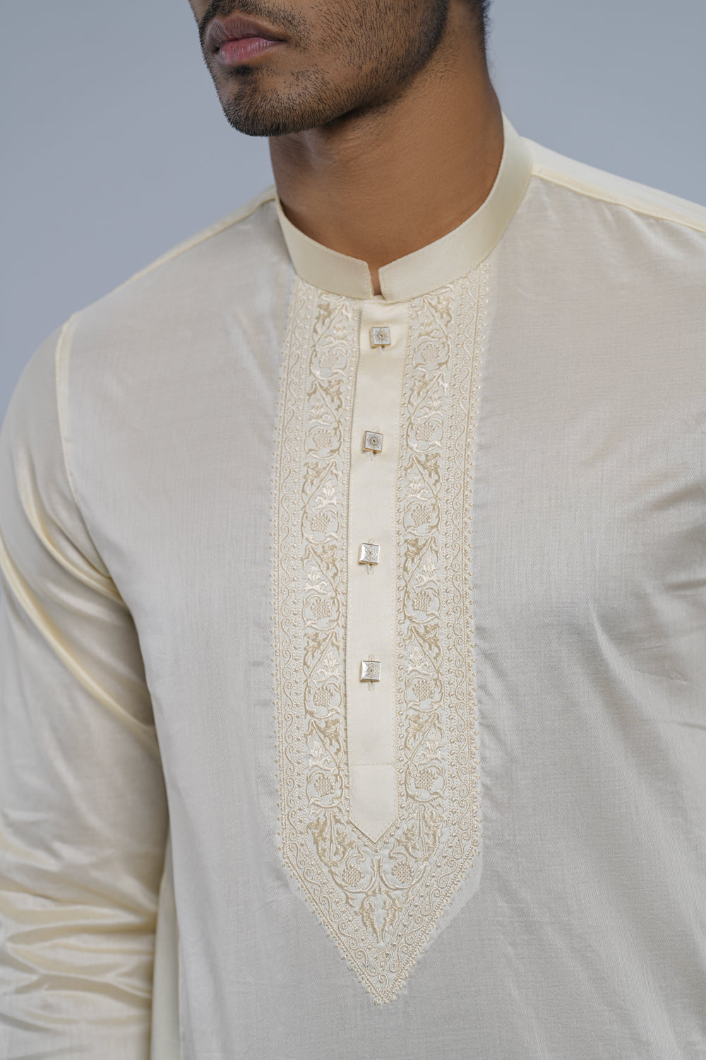 Elevate your semi-formal style effortlessly with our premium dobby fabric men's Panjabi, featuring around placket embroidery with elegant buttons for a refined touch.