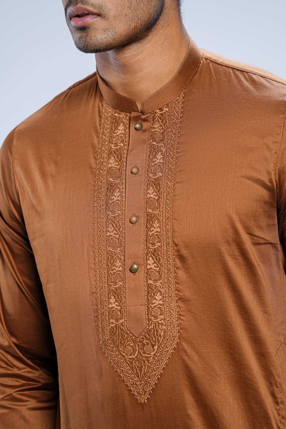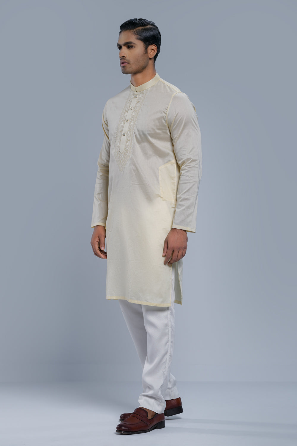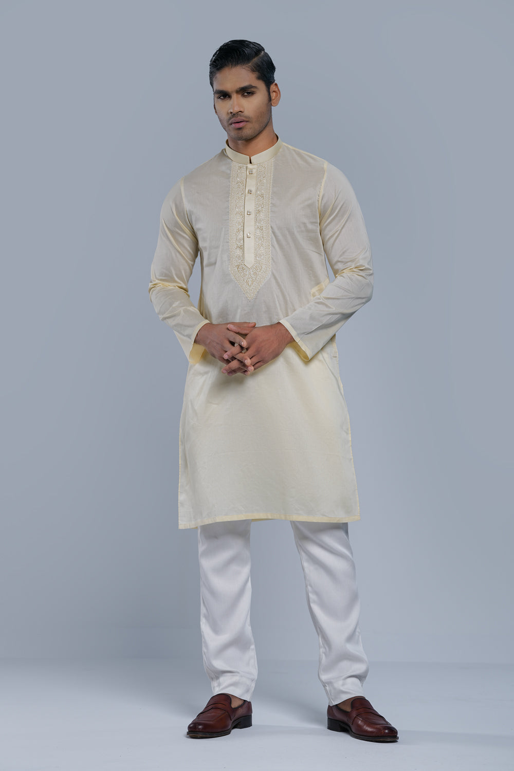 Elevate your semi-formal style effortlessly with our premium dobby fabric men's Panjabi, featuring around placket embroidery with elegant buttons for a refined touch.