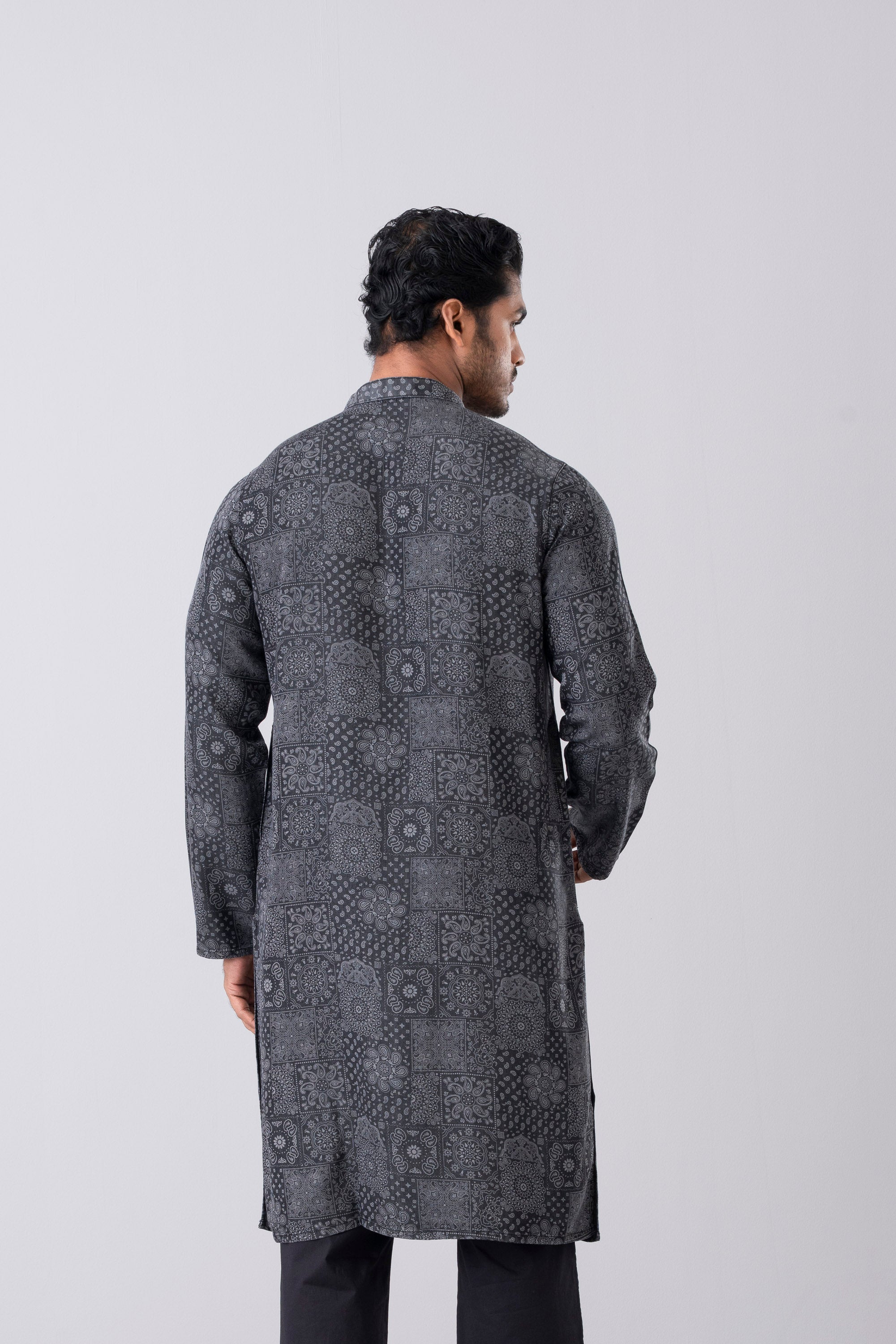 A regular-fit Panjabi crafted from 100% Tencel fabric, featuring classical allover discharge print with decorative buttons, offers a stylish yet comfortable daily-wear look. Perfect for