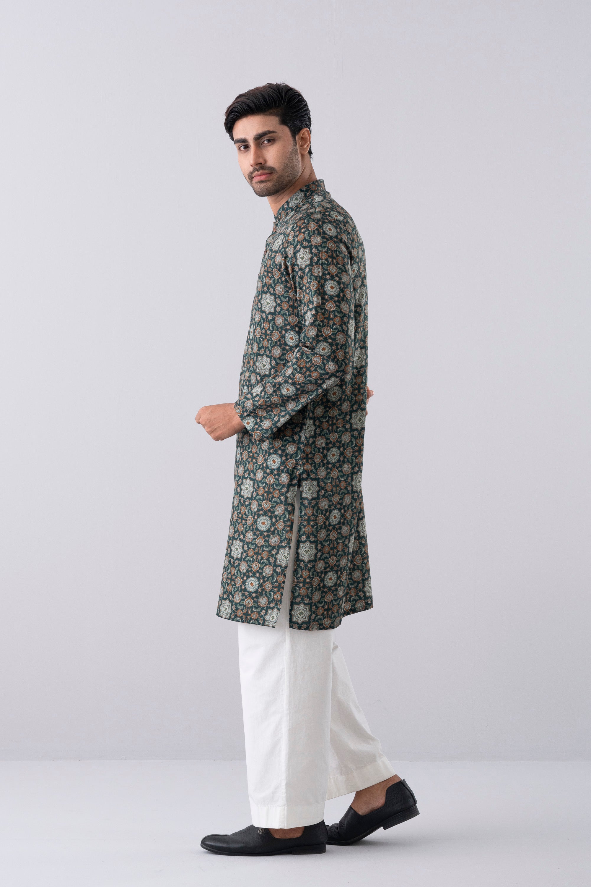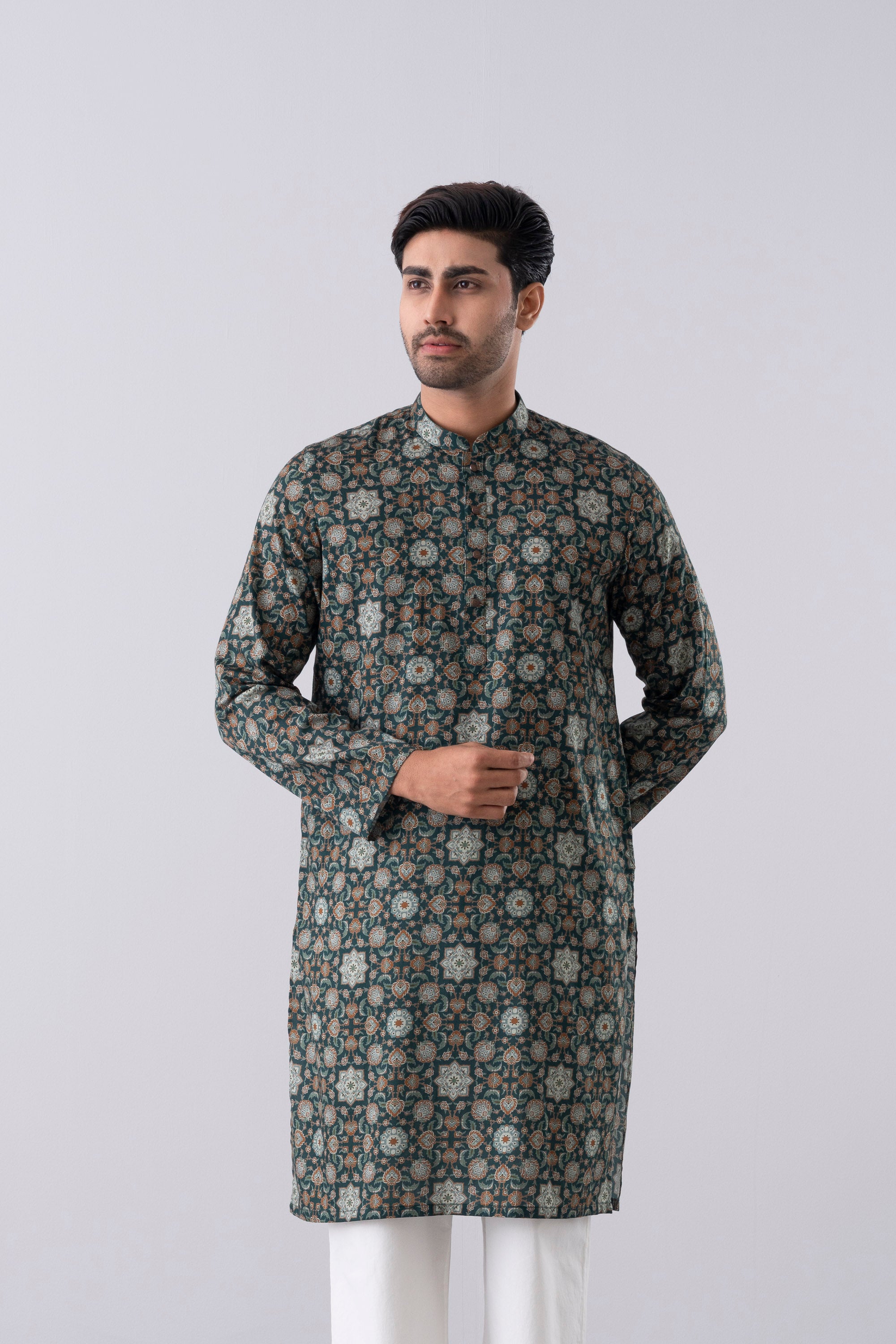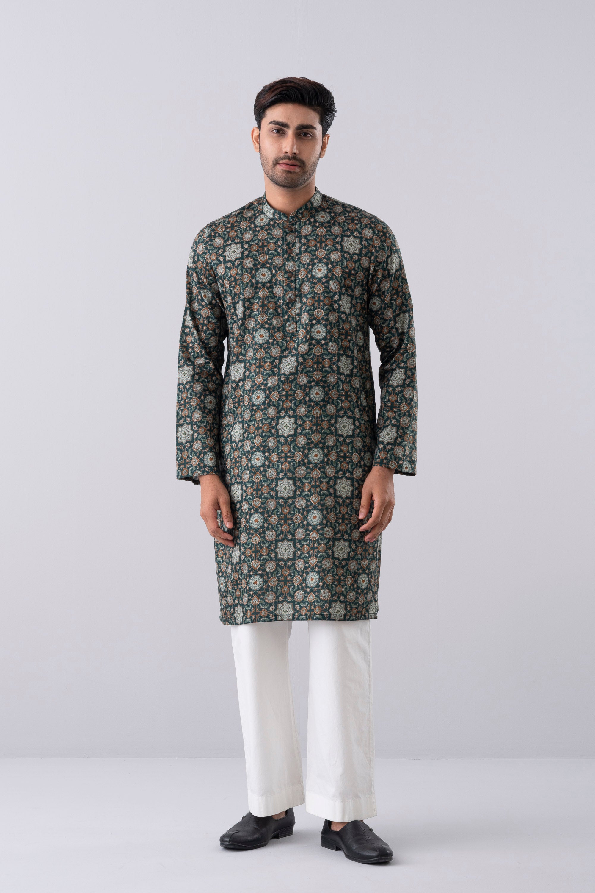A regular-fit Panjabi crafted from 100% cotton fabric, featuring an elegant allover print with contrast inside band, placket and moon patch, offers a stylish and comfortable daily wear look. Perfect for a blend of tradition and modern elegance.