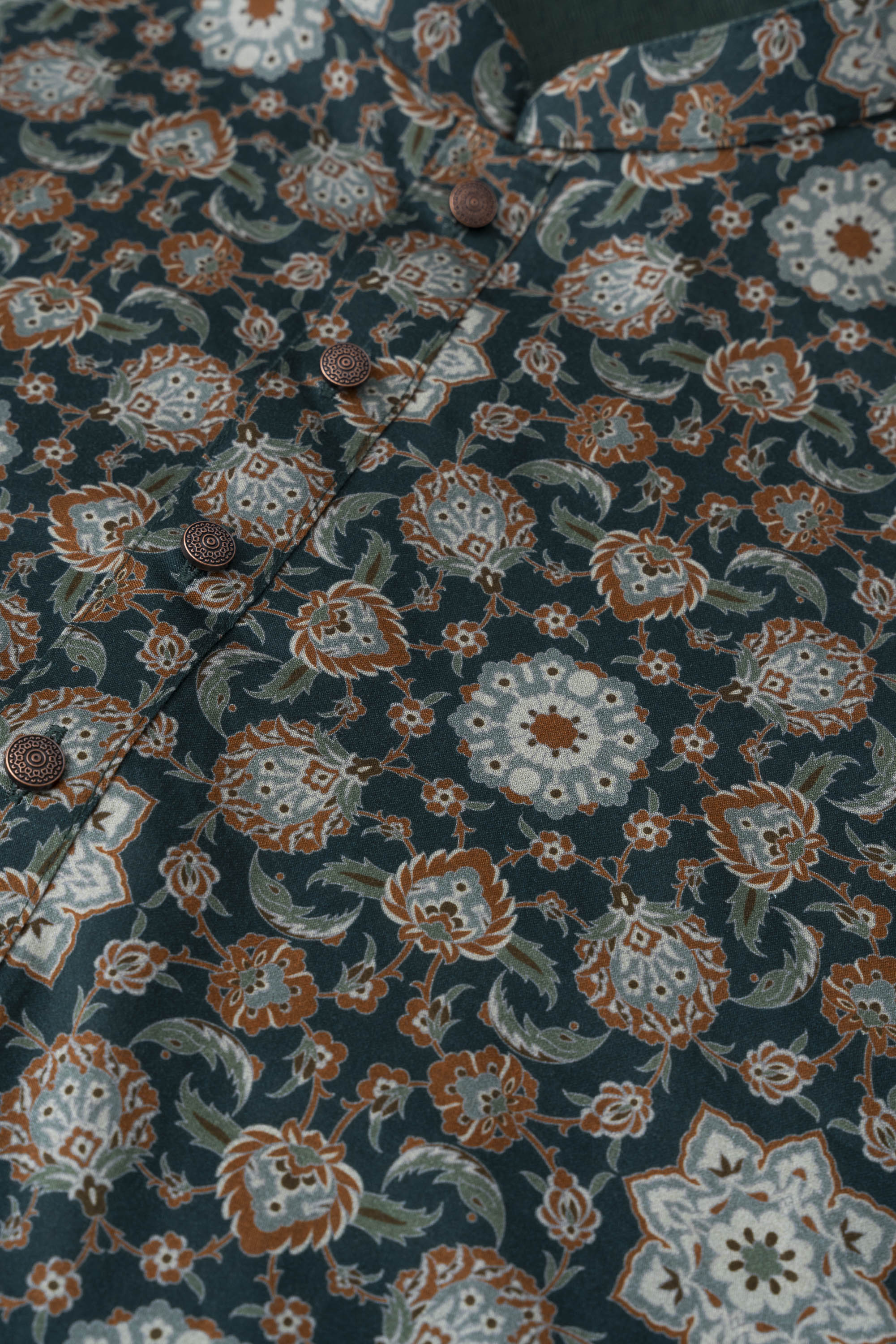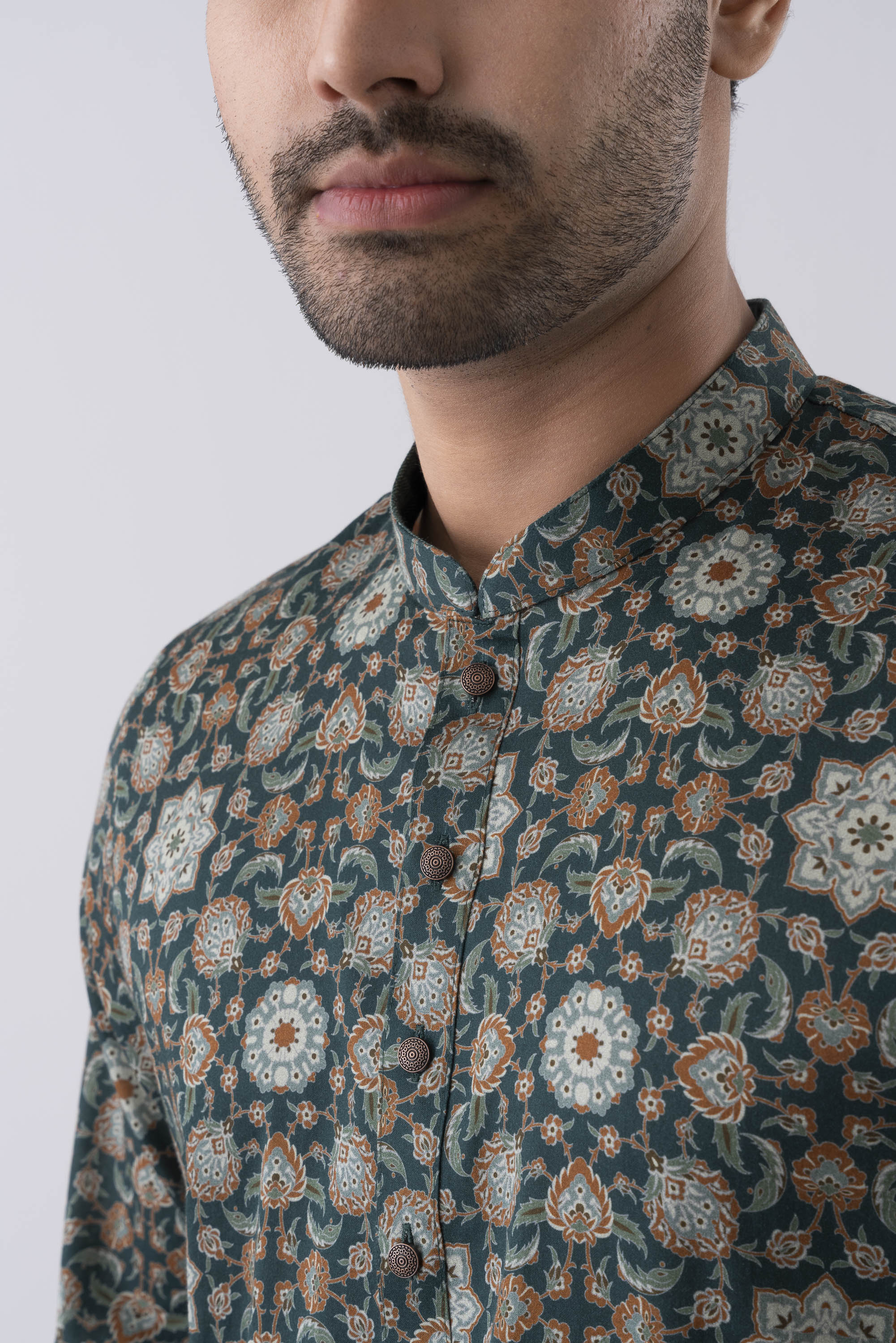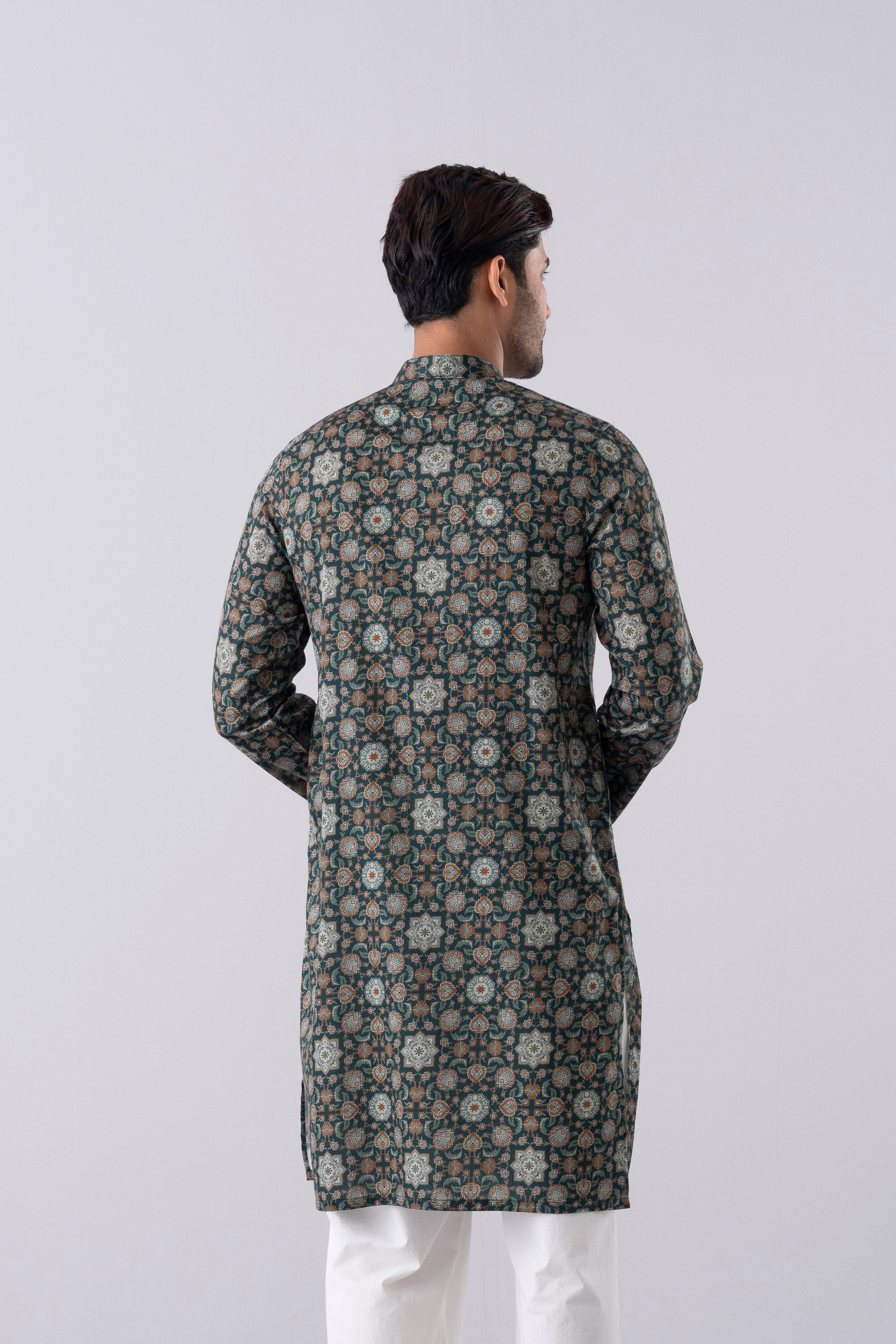 A regular-fit Panjabi crafted from 100% cotton fabric, featuring an elegant allover print with contrast inside band, placket and moon patch, offers a stylish and comfortable daily wear look. Perfect for a blend of tradition and modern elegance.