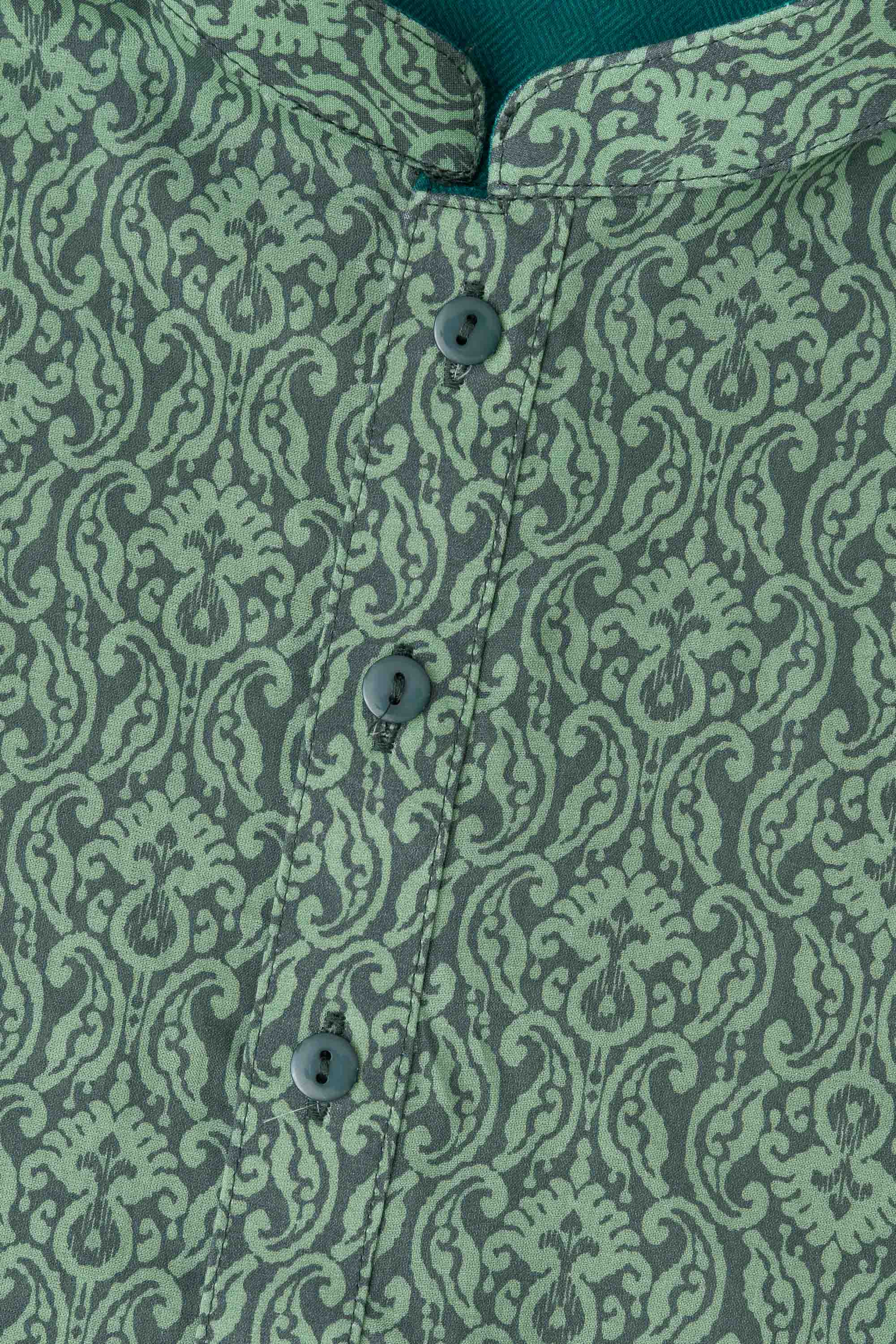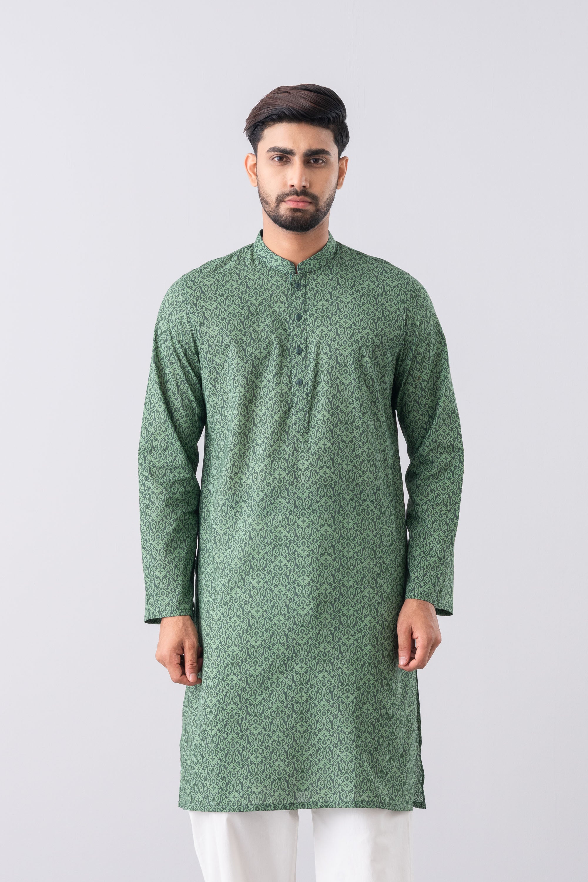 A regular-fit Panjabi crafted from 100% cotton fabric, featuring an elegant allover print with contrast inside band, placket and moon patch, offers a stylish and comfortable daily wear look. Perfect for a blend of tradition and modern elegance.