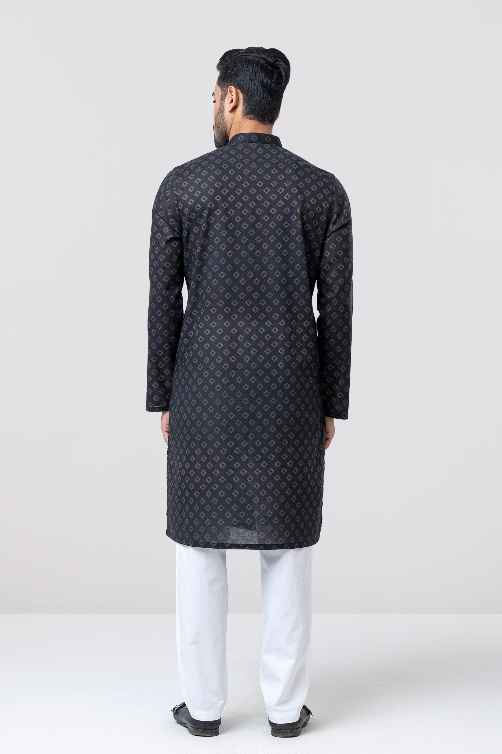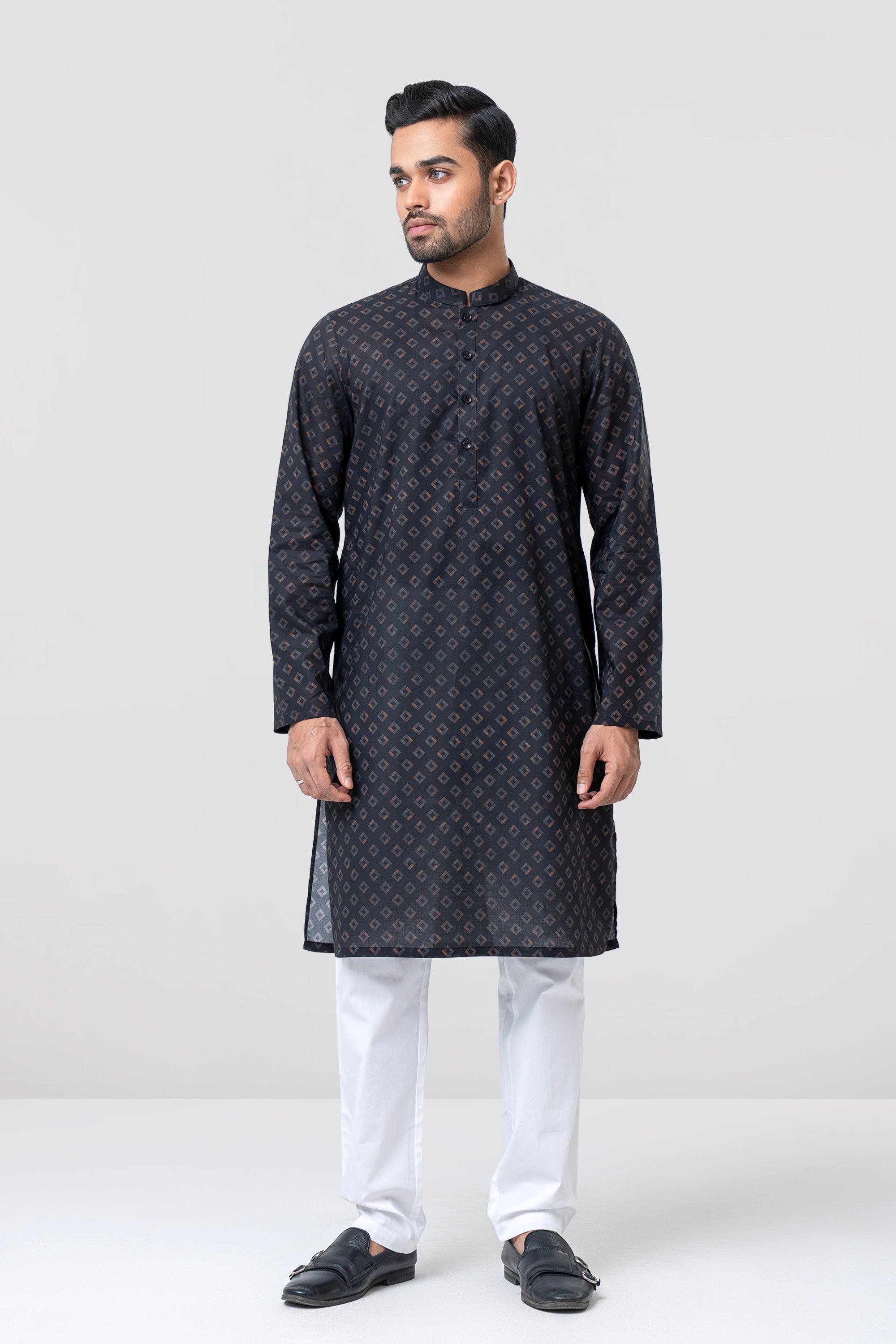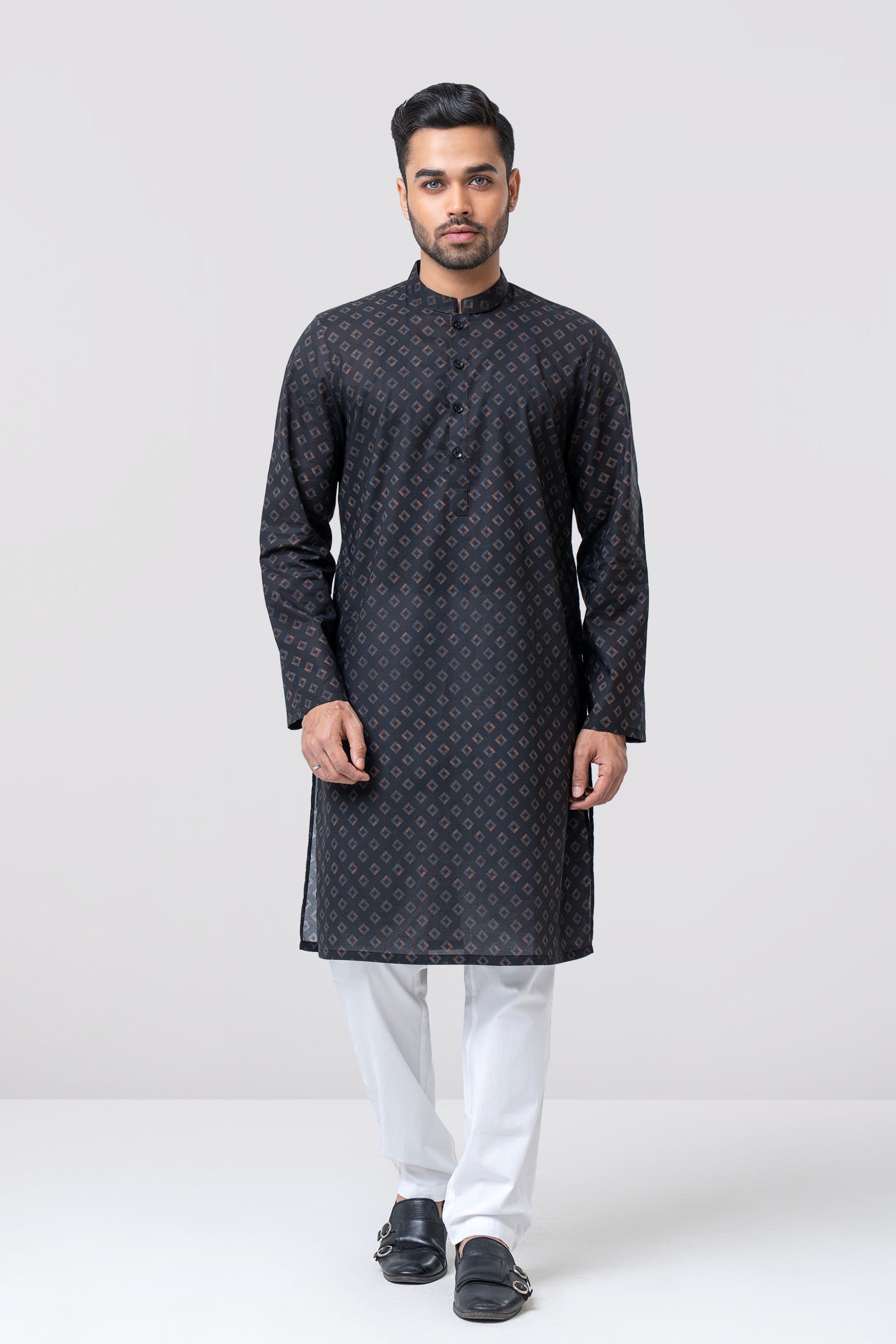 A regular-fit Panjabi crafted from 100% cotton fabric, featuring an elegant allover print with contrast inside band, placket and moon patch, offers a stylish and comfortable daily wear look. Perfect for a blend of tradition and modern elegance.