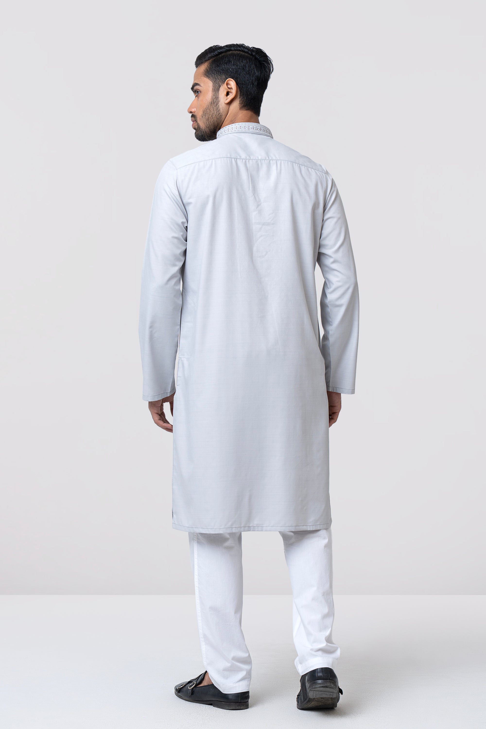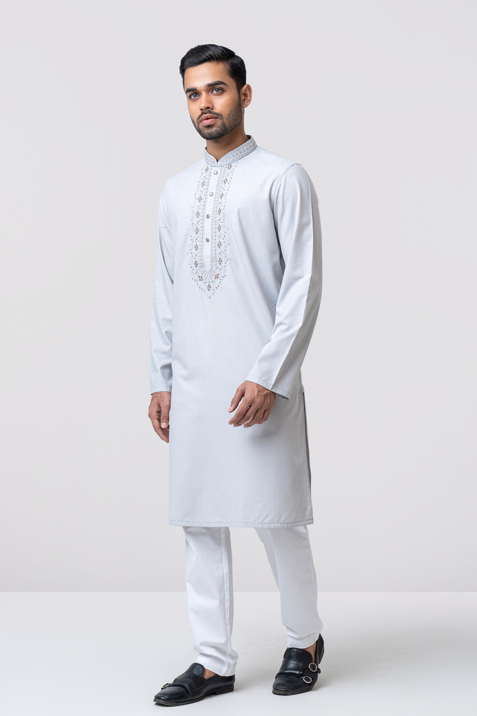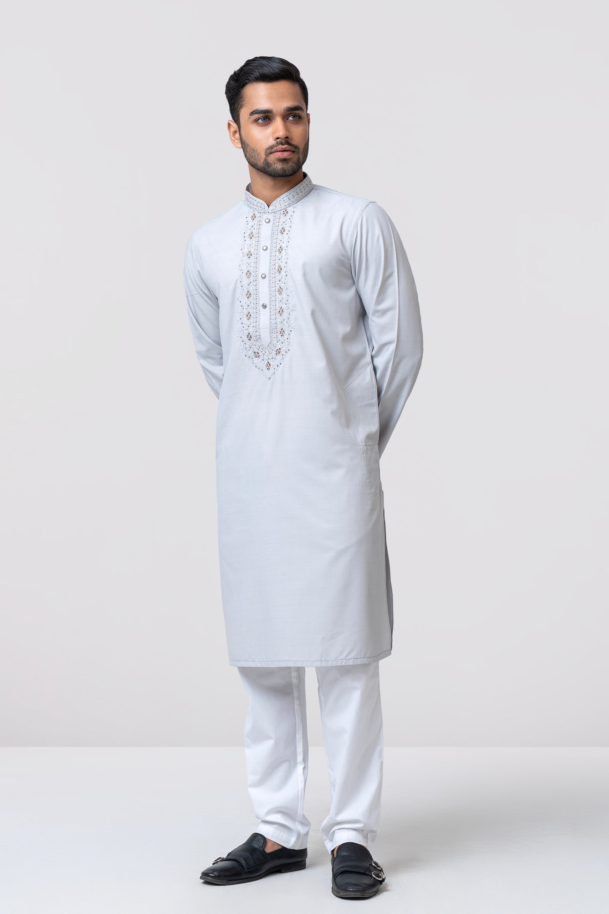 A regular-fit Panjabi crafted from premium breathable fabric with 80% poly 20% viscose, featuring classical around placket and band embroidery with decorative snap buttons, offers a stylish yet comfortable formal look. Perfect for effortless elegance in every occasion.
