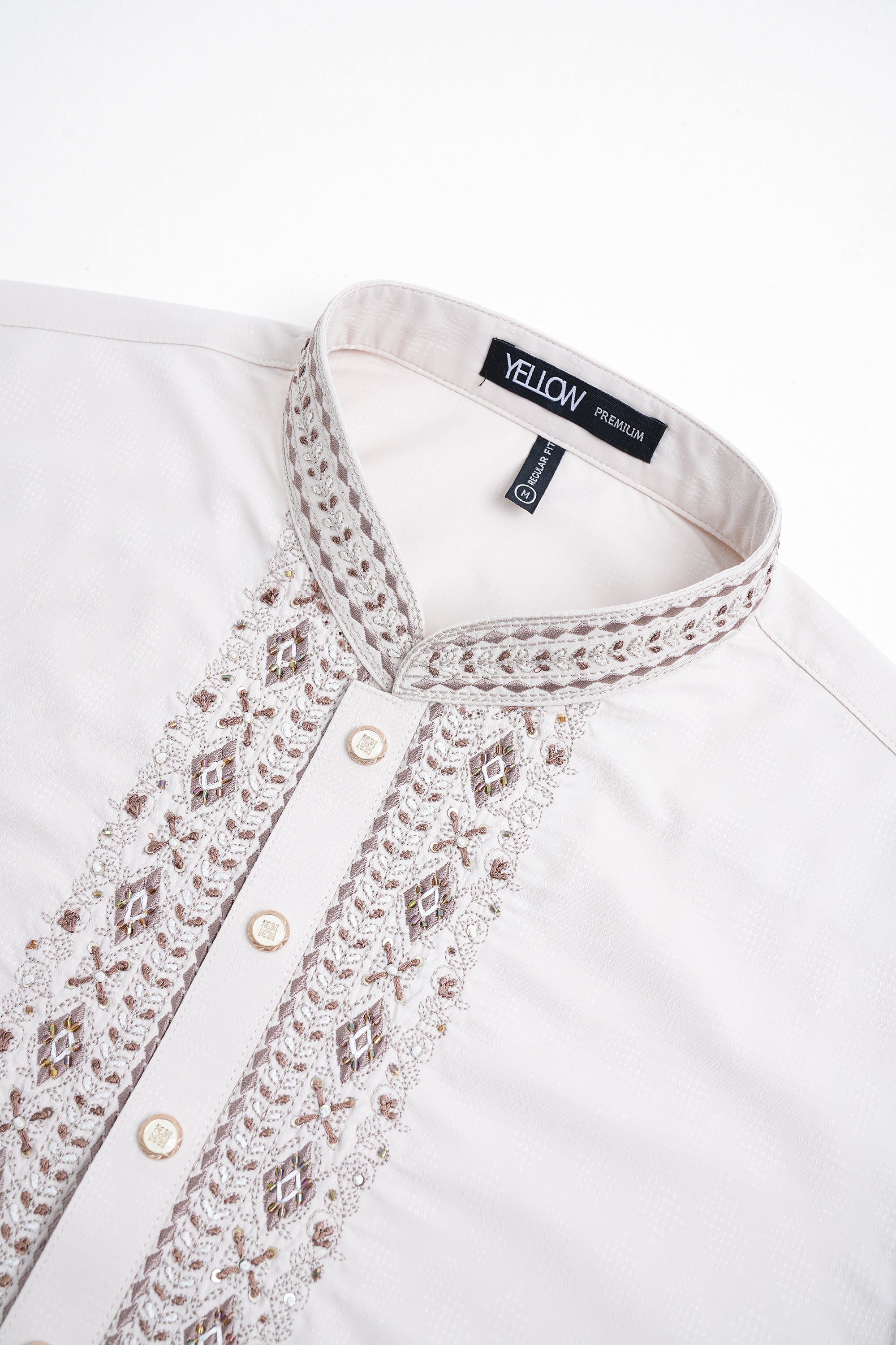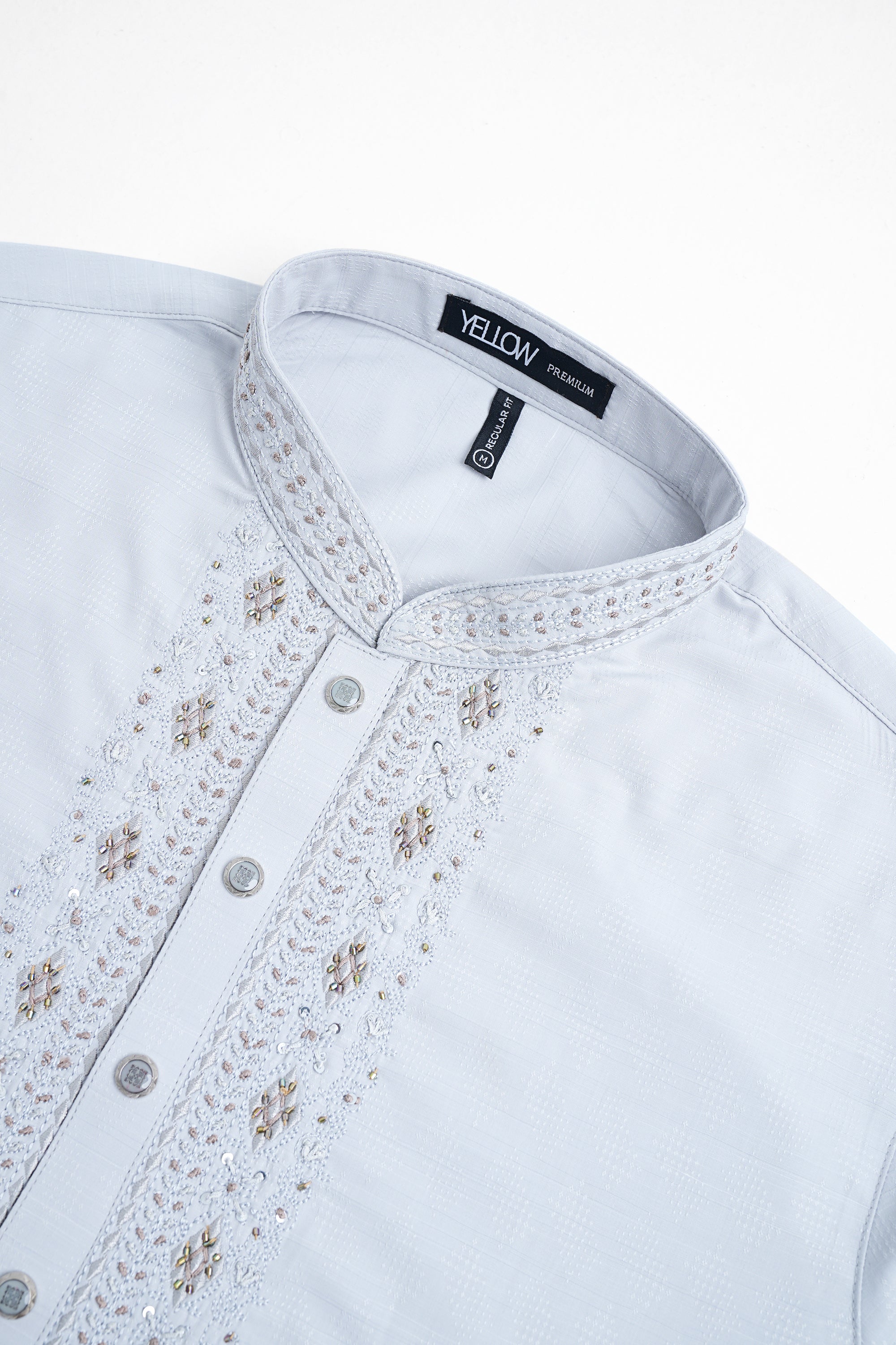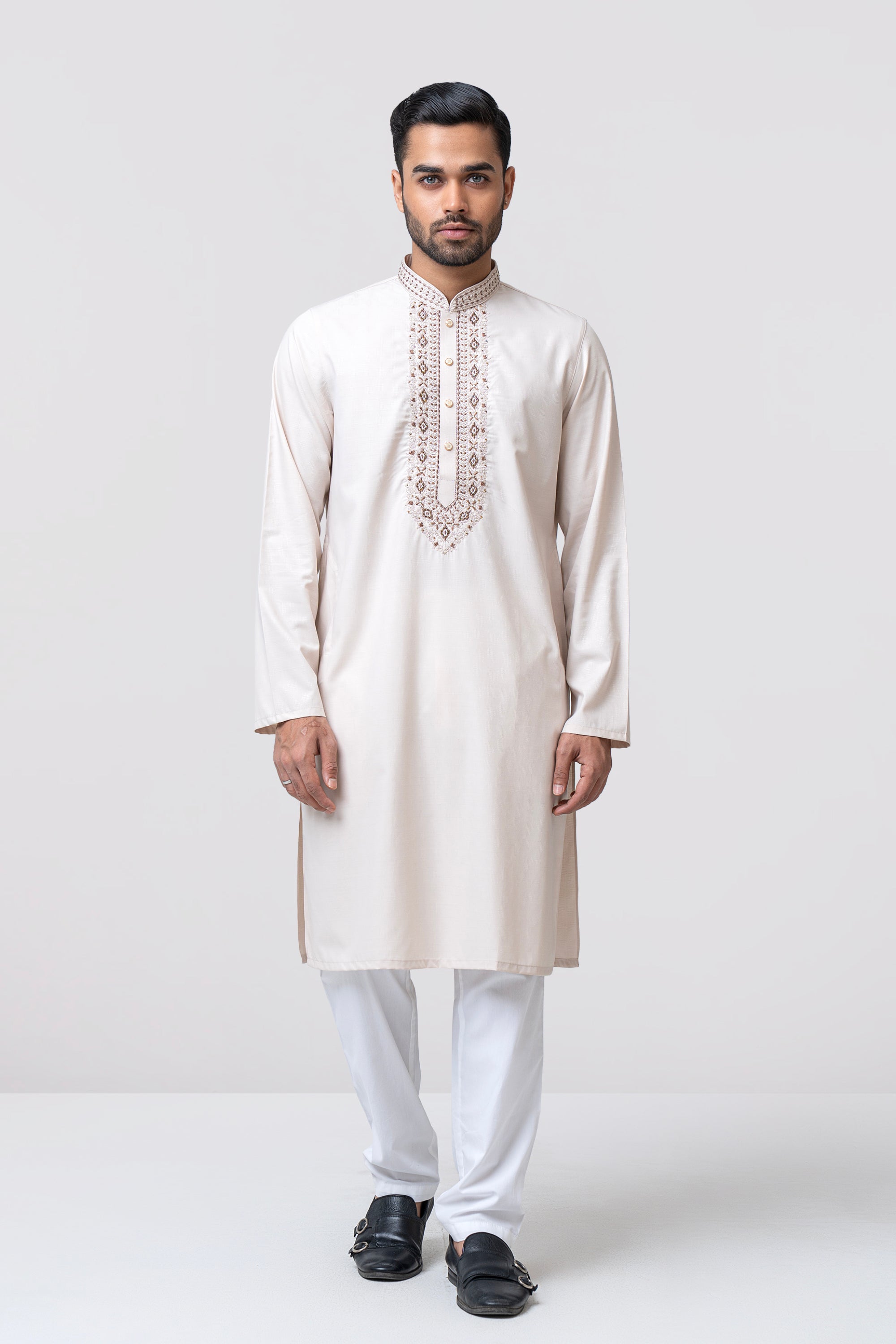 A regular-fit Panjabi crafted from premium breathable fabric with 80% poly 20% viscose, featuring classical around placket and band embroidery with decorative snap buttons, offers a stylish yet comfortable formal look. Perfect for effortless elegance in every occasion.