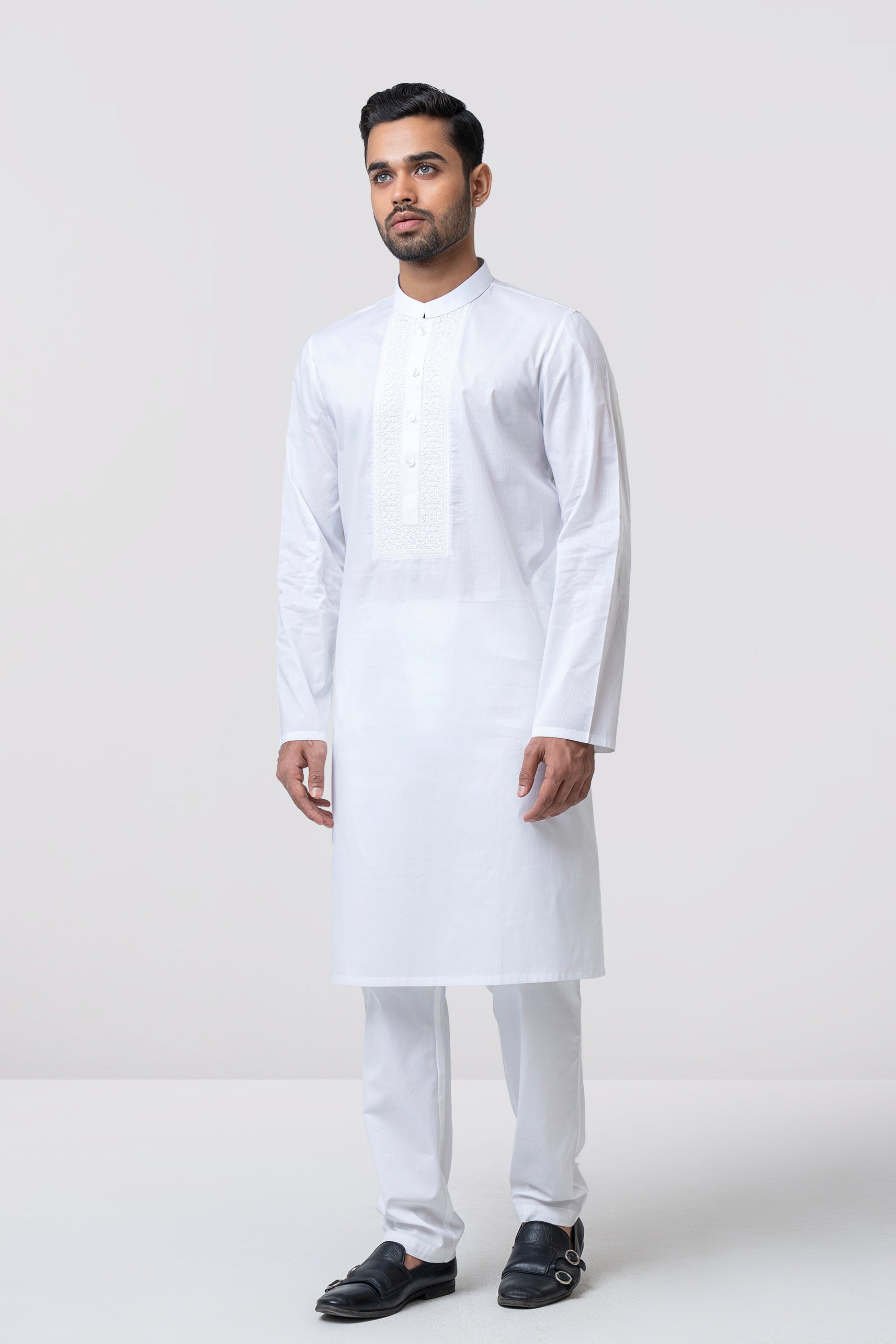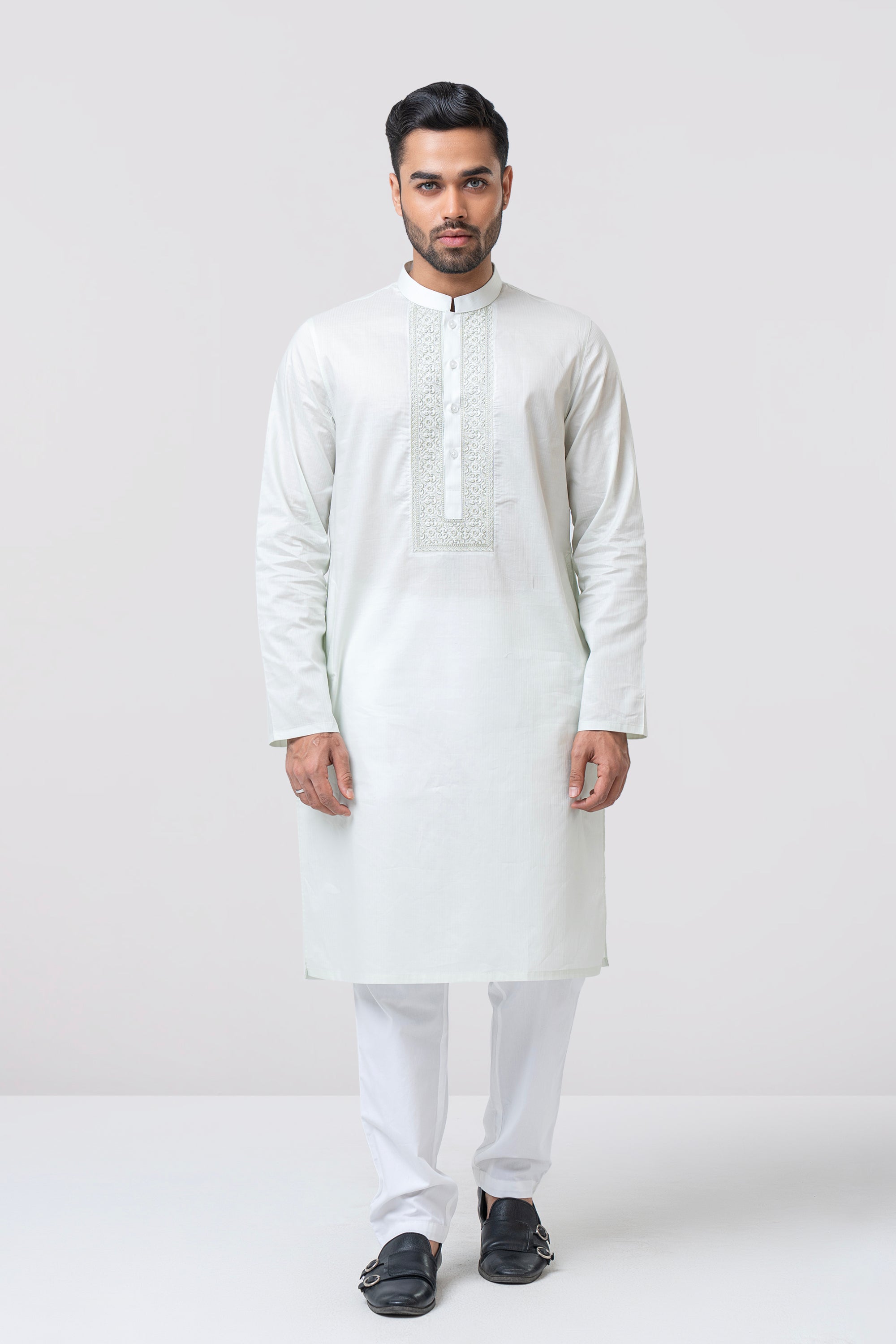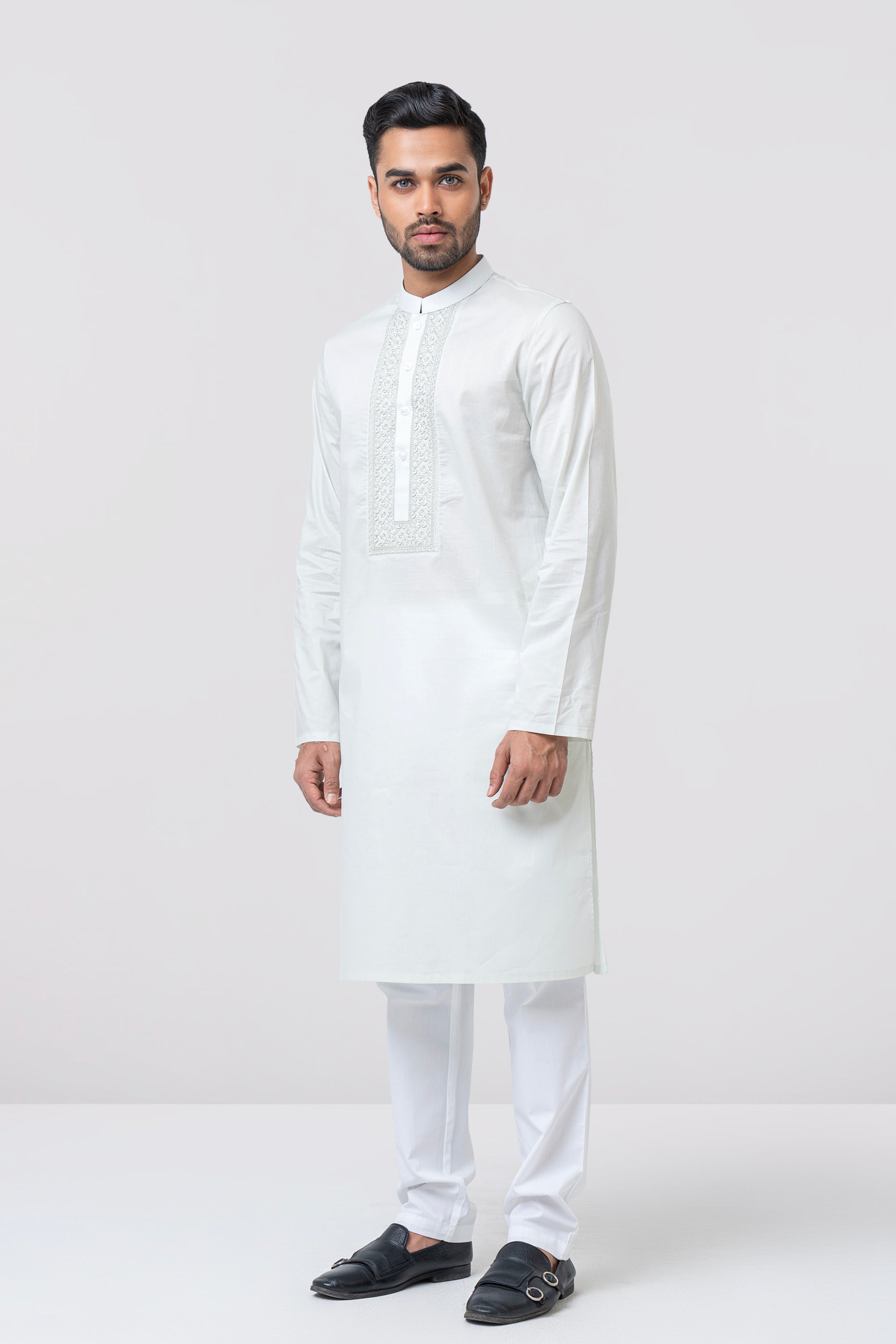 A regular-fit Panjabi crafted from 100% cotton fabric with classical embroidery embellishment on around placket with DTM button detailing offers a stylish yet comfortable semi-formal look. This design combines comfort and subtle elegance, making it ideal for a refined and stylish appearance.