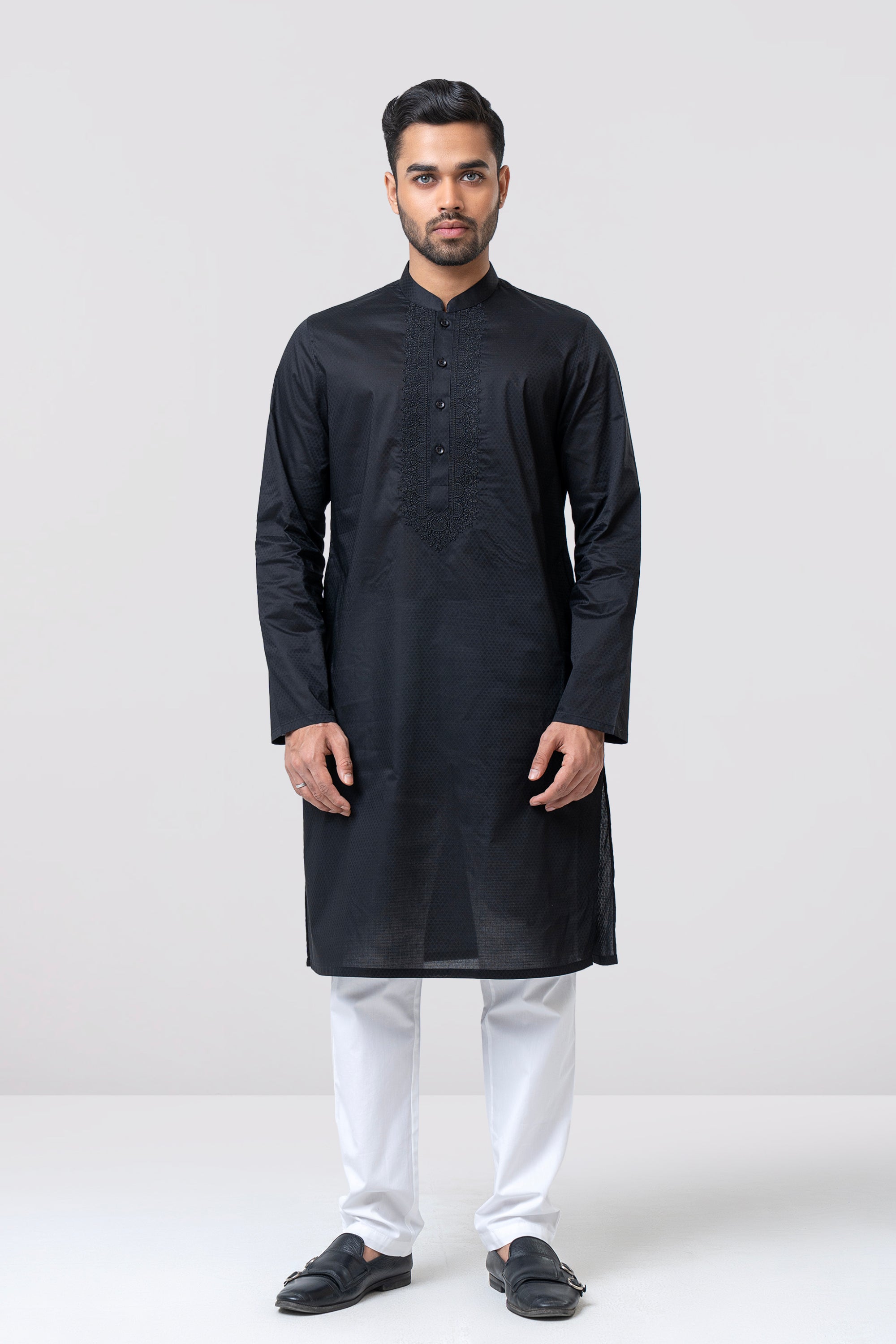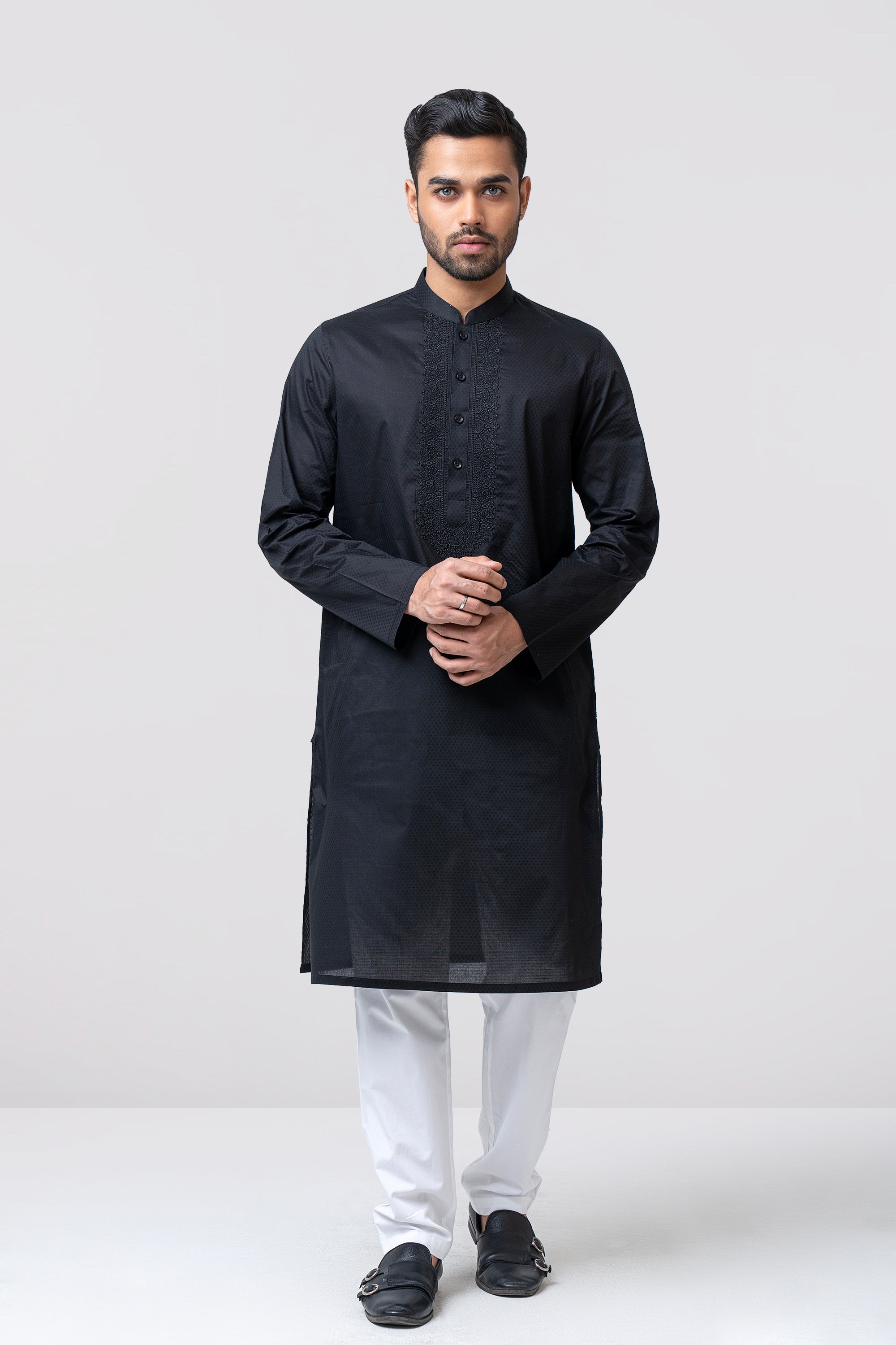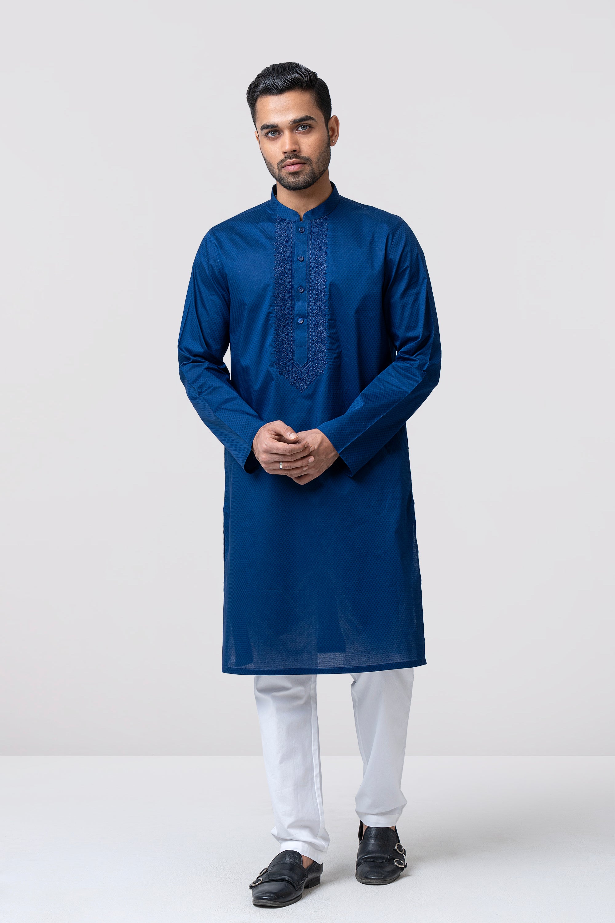 A regular-fit Panjabi crafted from 100% cotton fabric with classical embroidery embellishment on around placket with DTM button detailing offers a stylish yet comfortable semi-formal look. This design combines comfort and subtle elegance, making it ideal for a refined and stylish appearance