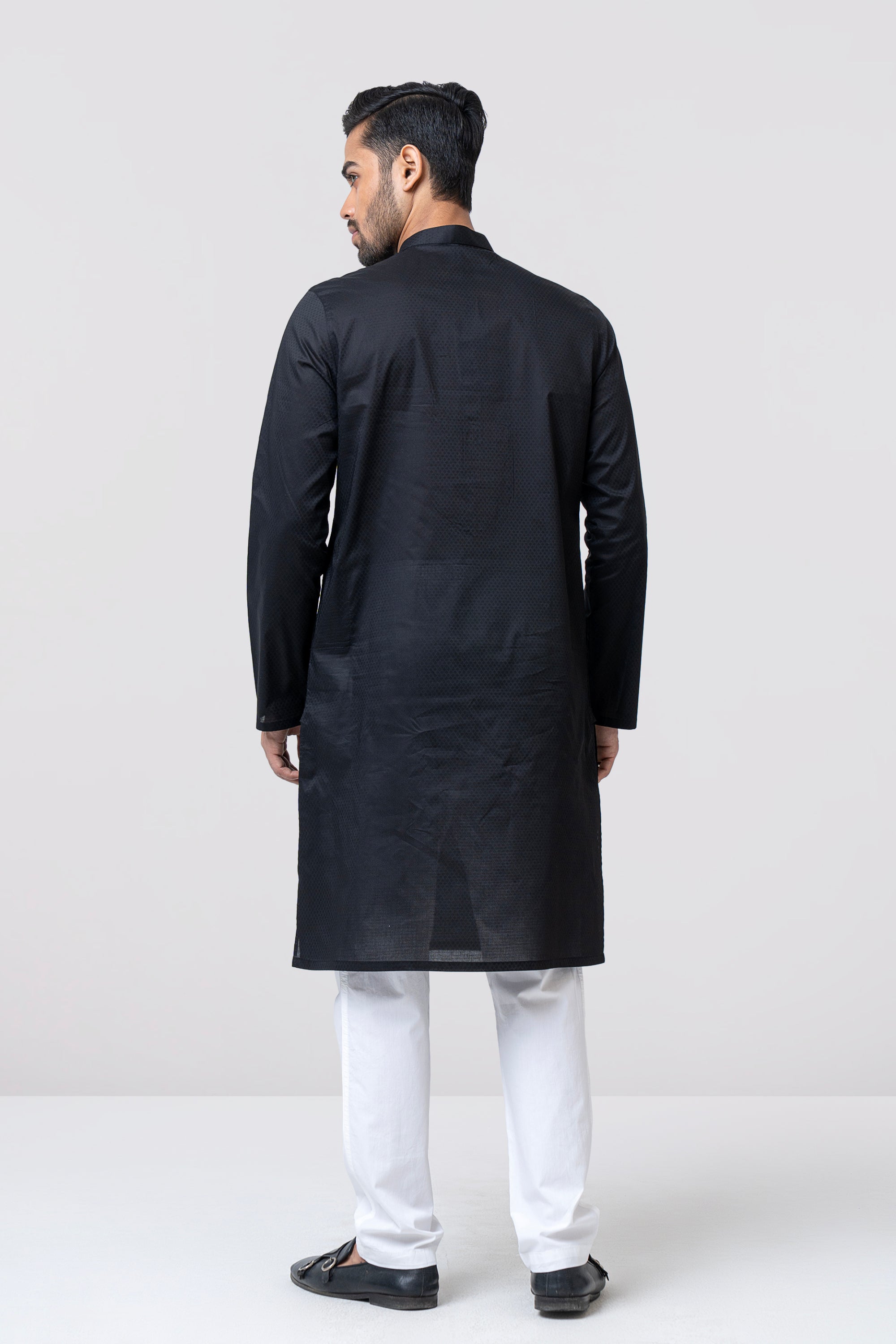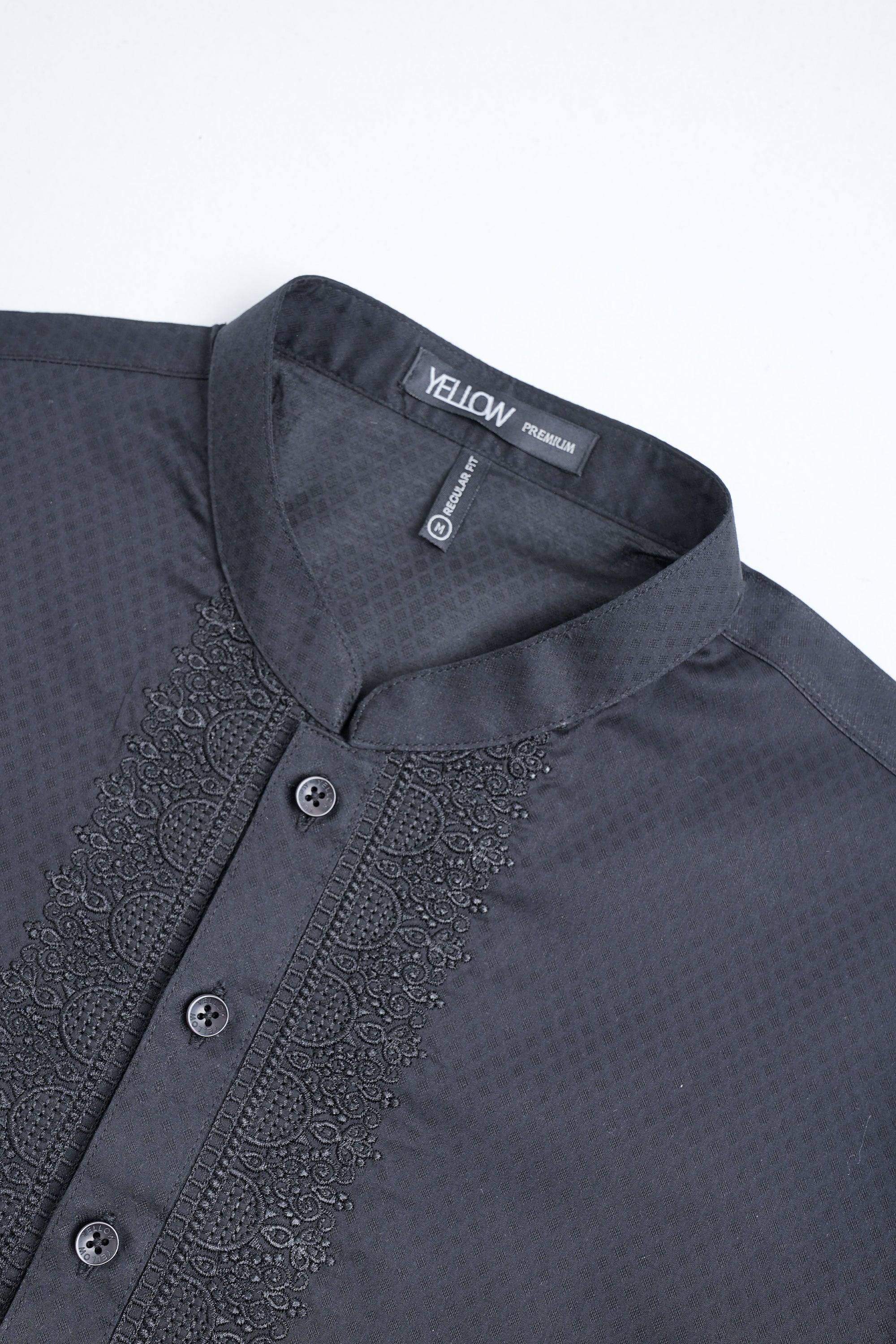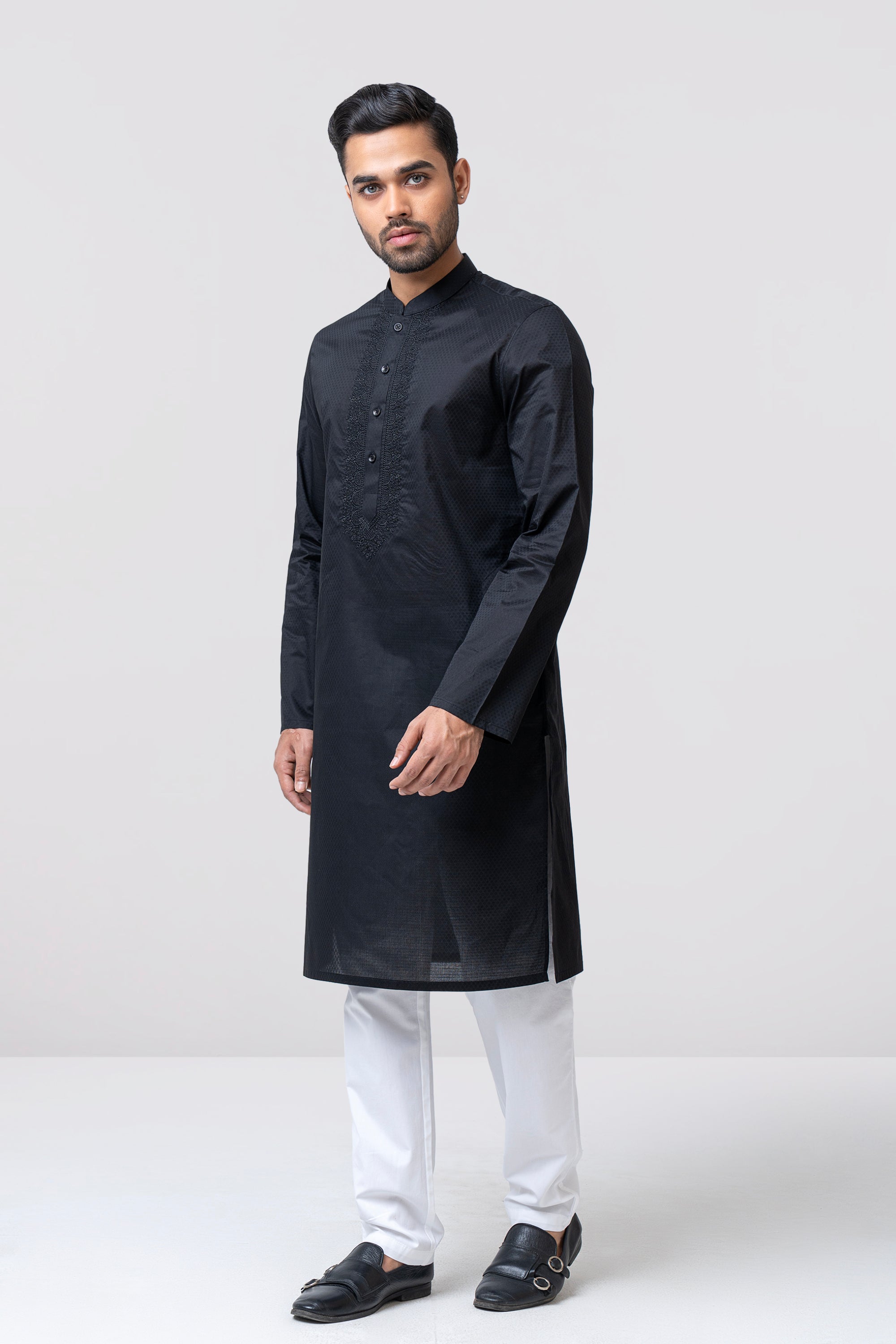 A regular-fit Panjabi crafted from 100% cotton fabric with classical embroidery embellishment on around placket with DTM button detailing offers a stylish yet comfortable semi-formal look. This design combines comfort and subtle elegance, making it ideal for a refined and stylish appearance