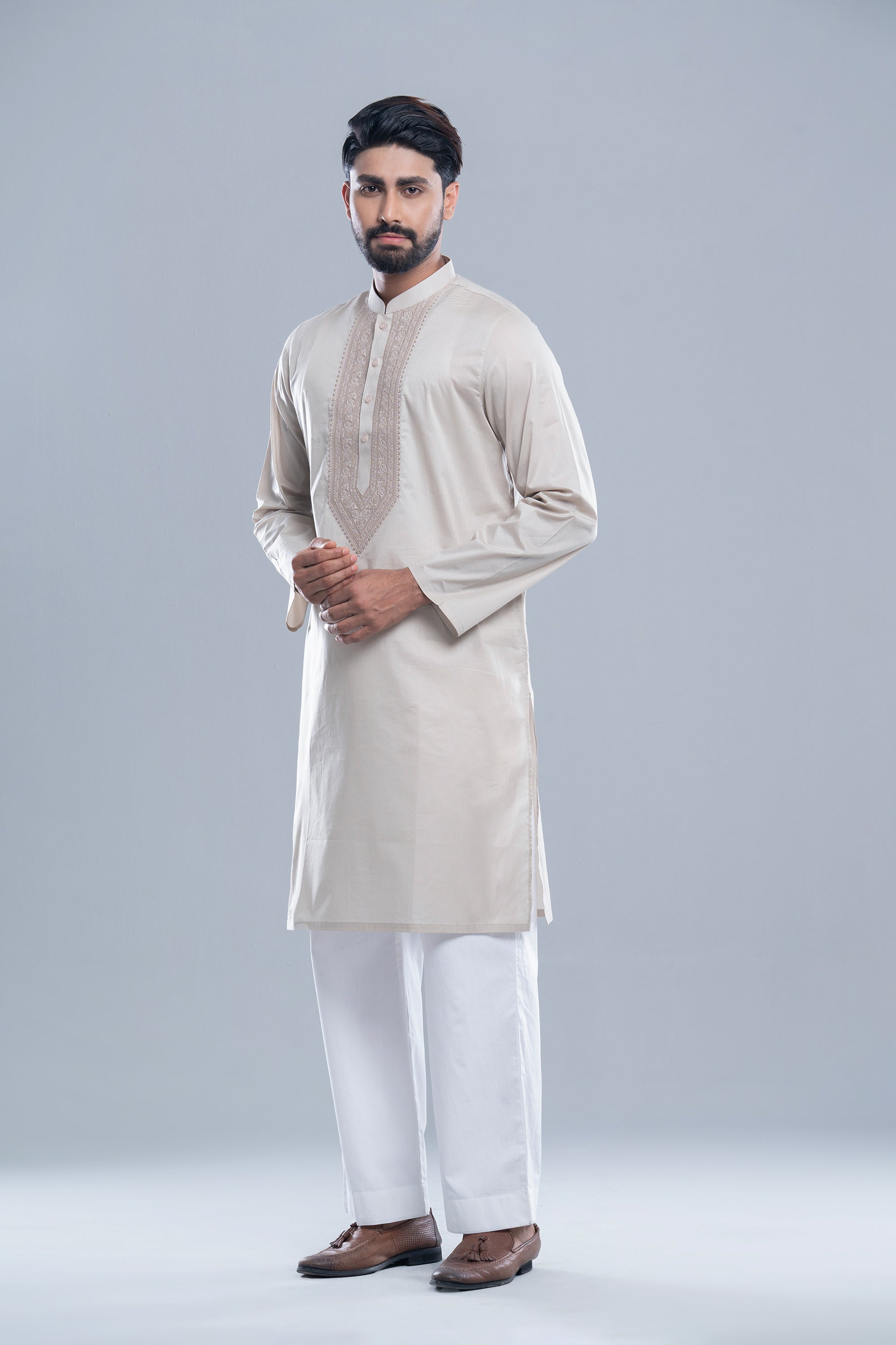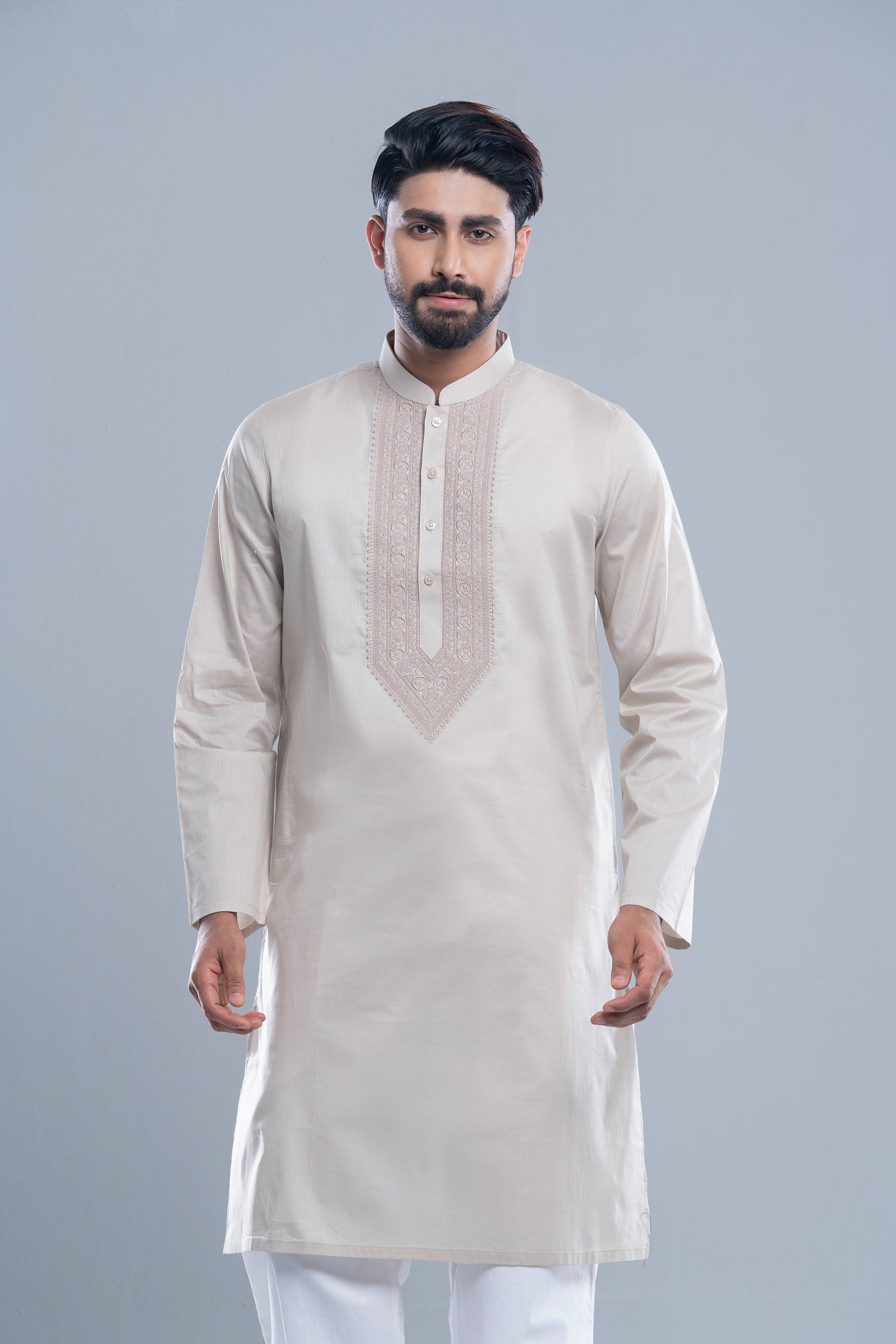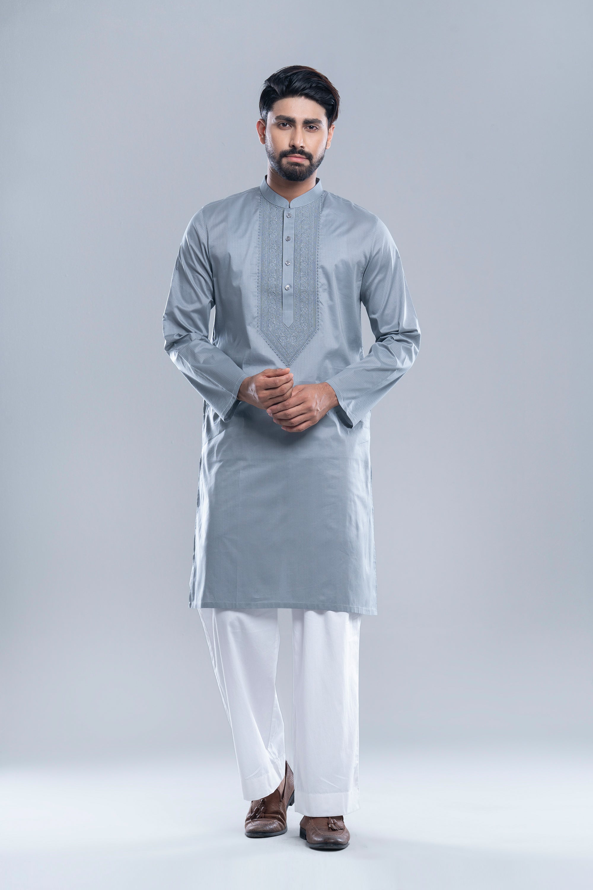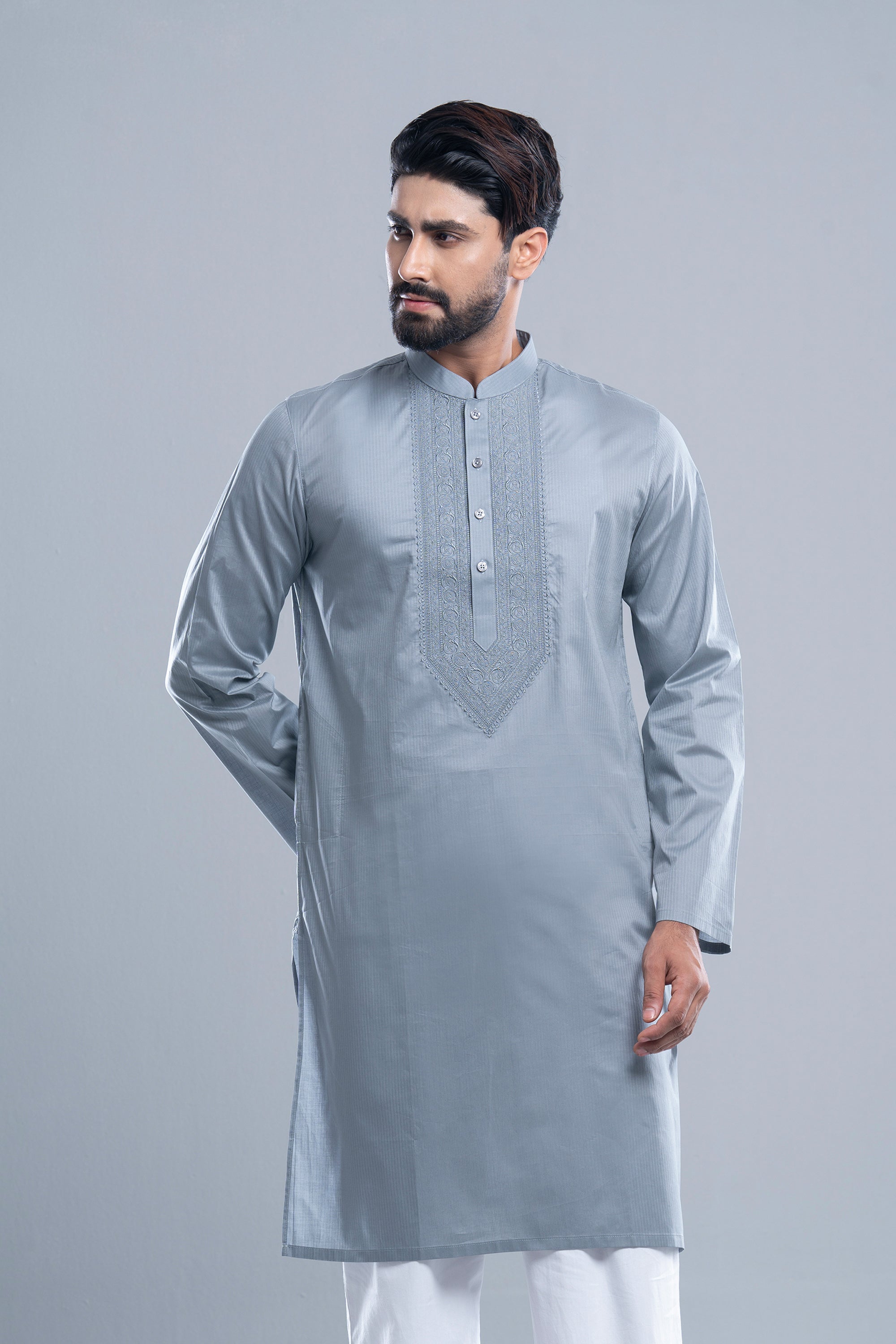 A regular-fit Panjabi crafted from 100% cotton fabric with classical embroidery embellishment on around placket with DTM button detailing offers a stylish yet comfortable semi-formal look. This design combines comfort and subtle elegance, making it ideal for a refined and stylish appearance