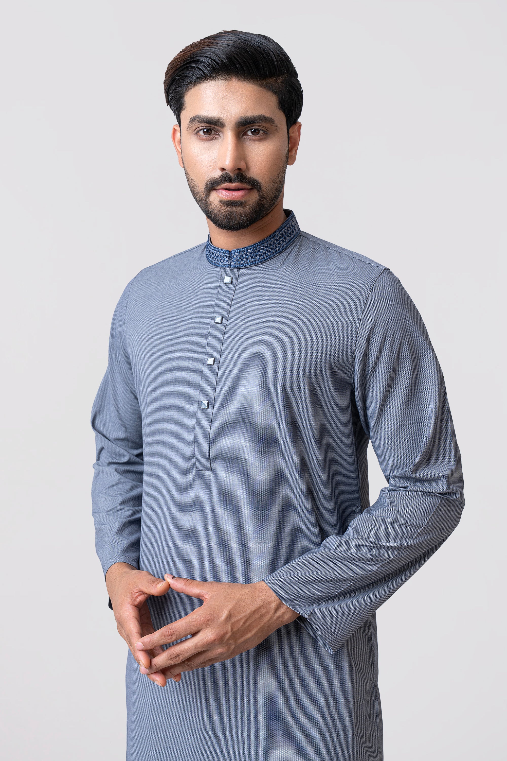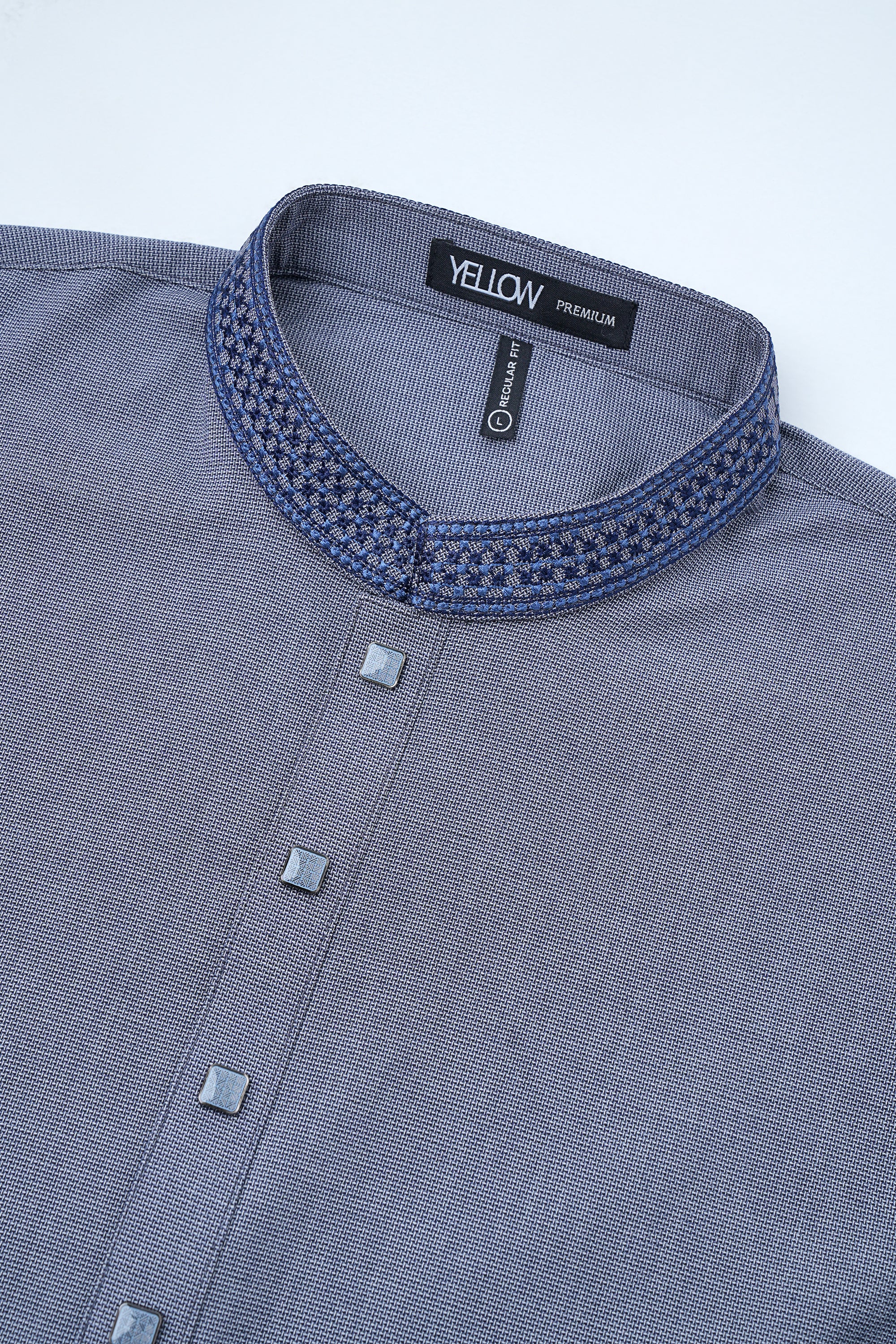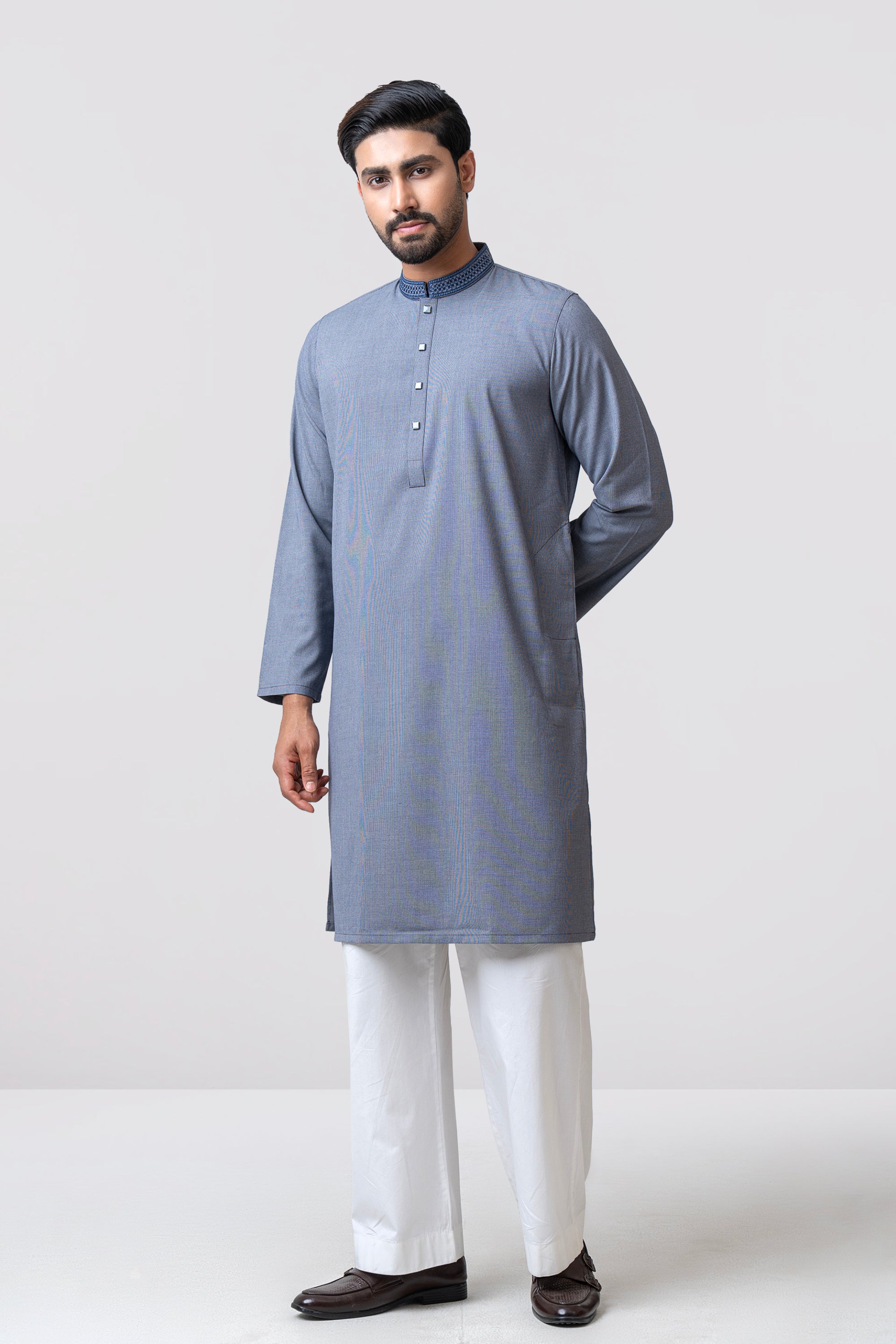 A regular-fit Panjabi crafted from premium breathable fabric with tencel rayon blend, featuring classical embroidery on band and decorative snap buttons, offers a stylish yet comfortable formal look. Perfect for effortless elegance in every occasion.