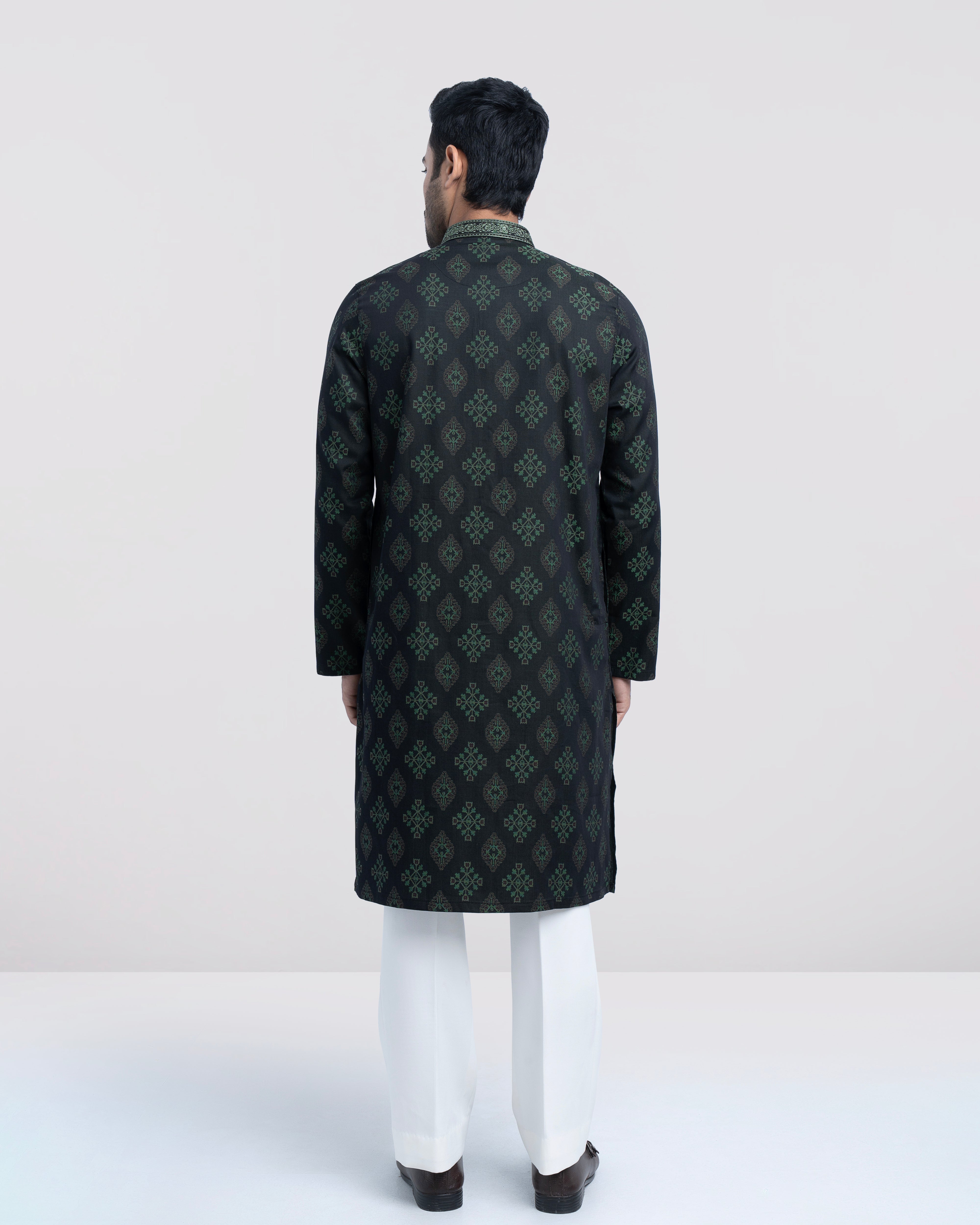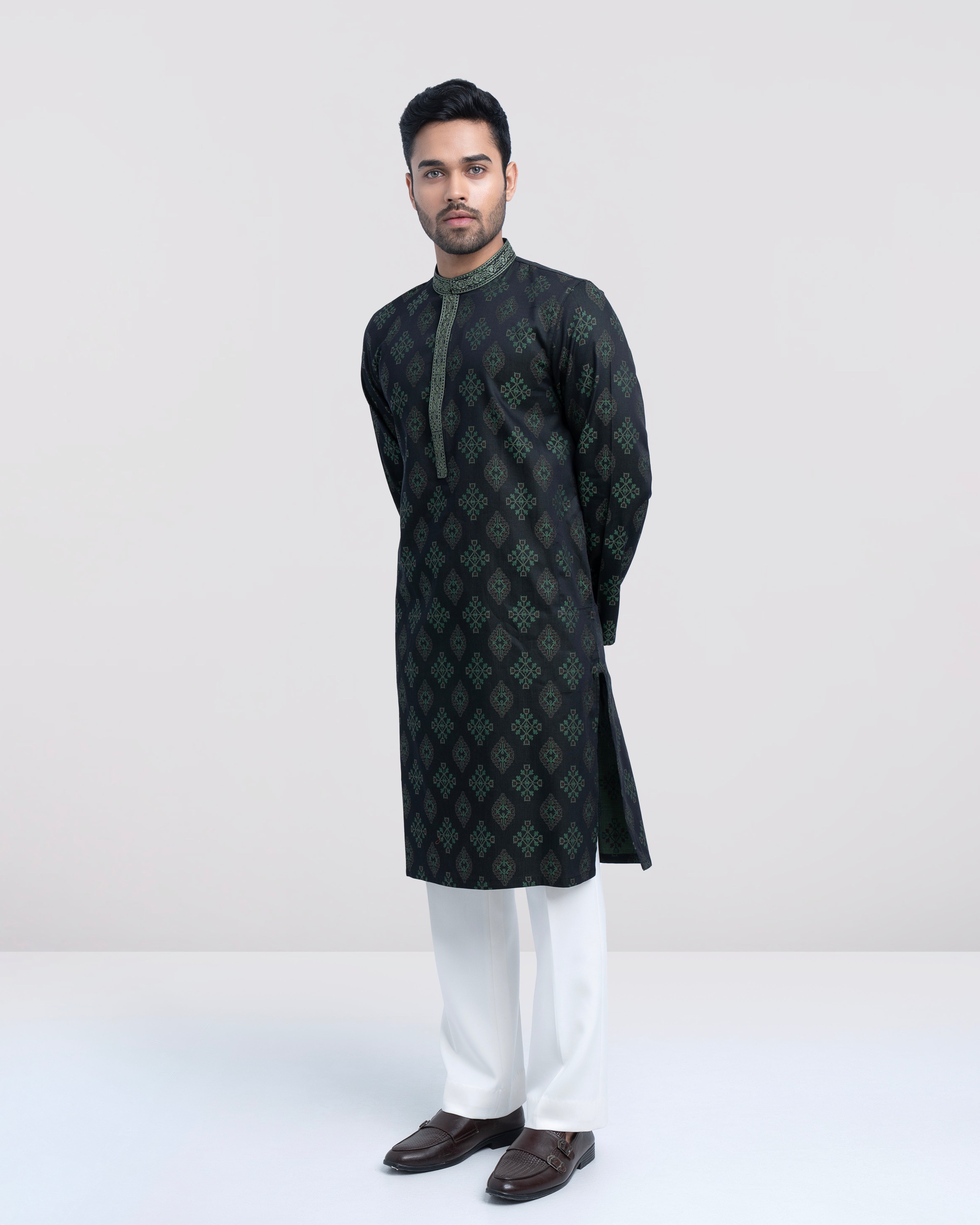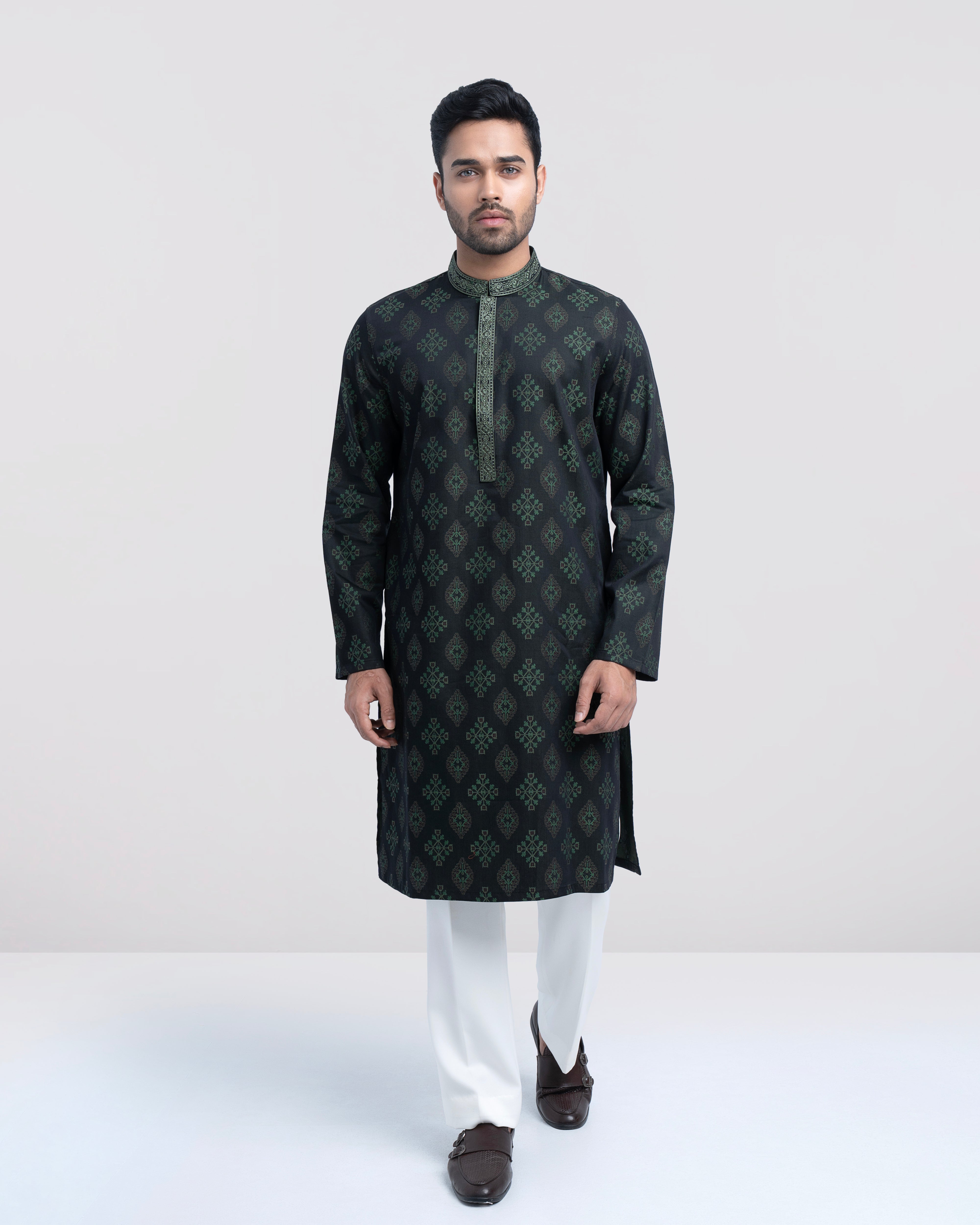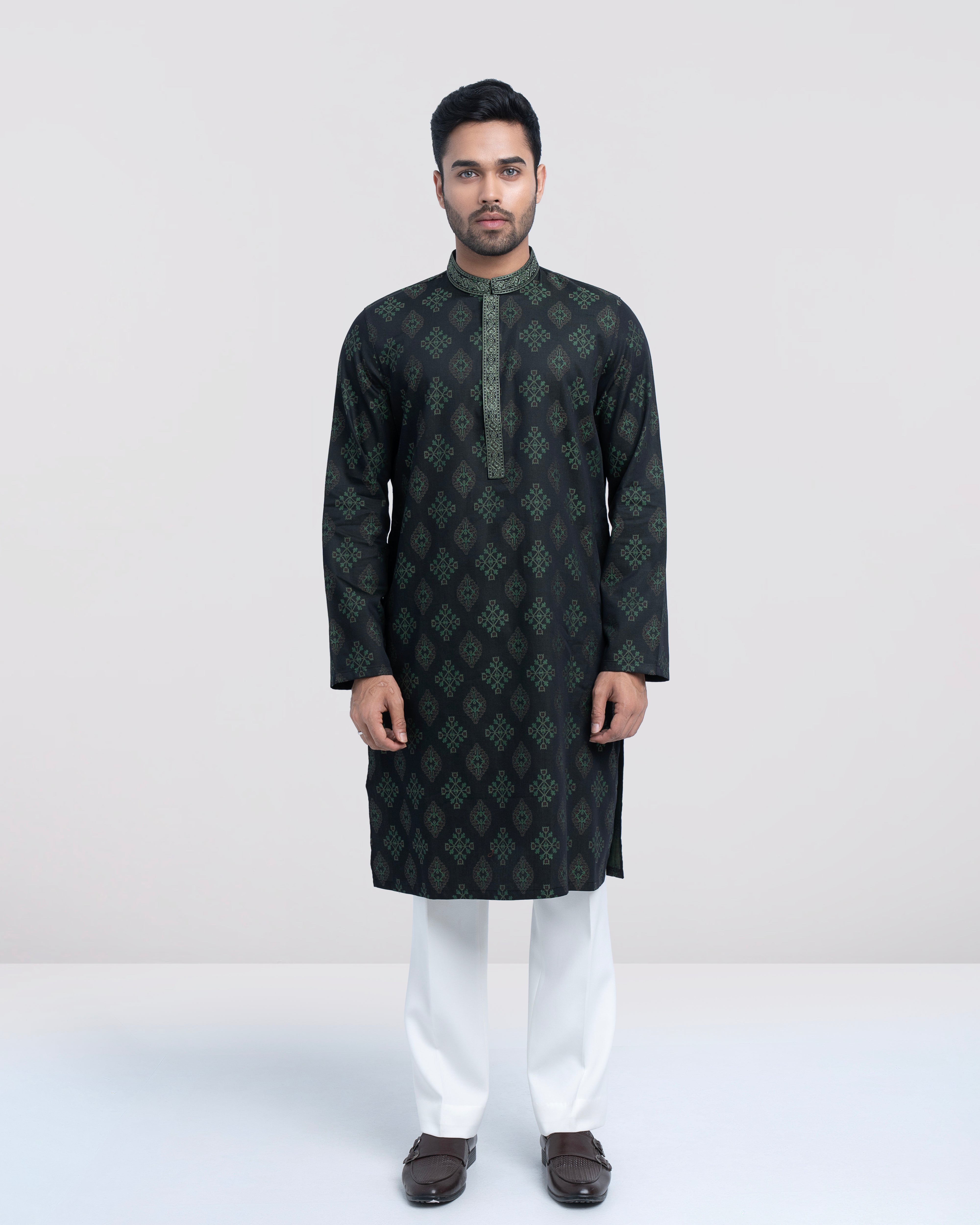A regular fit Panjabi crafted from 100% cotton jacquard breathable fabric, featuring classical embroidery on band and placket, offers a stylish yet comfortable semi-formal look. Perfect for effortless elegance and all-day ease.