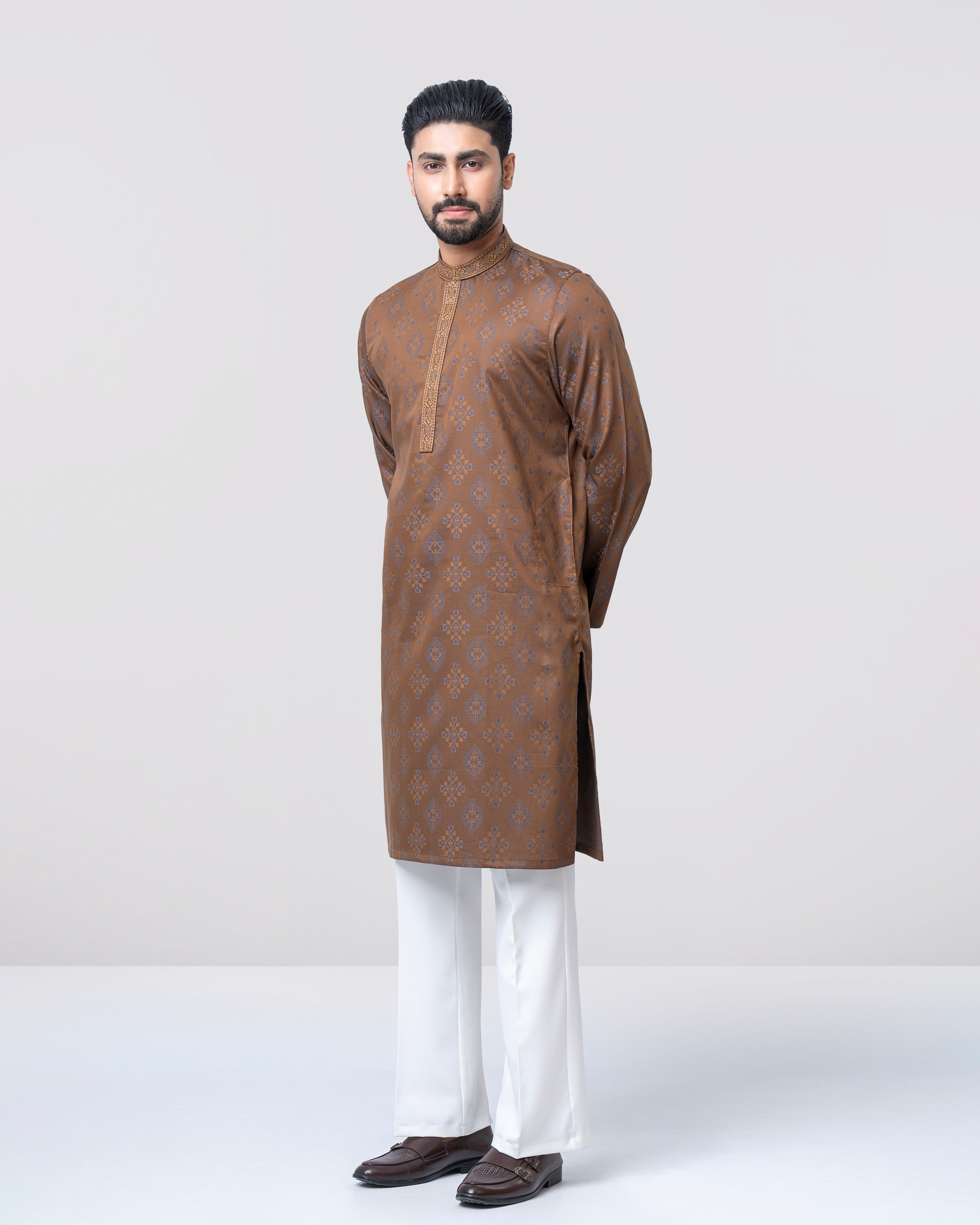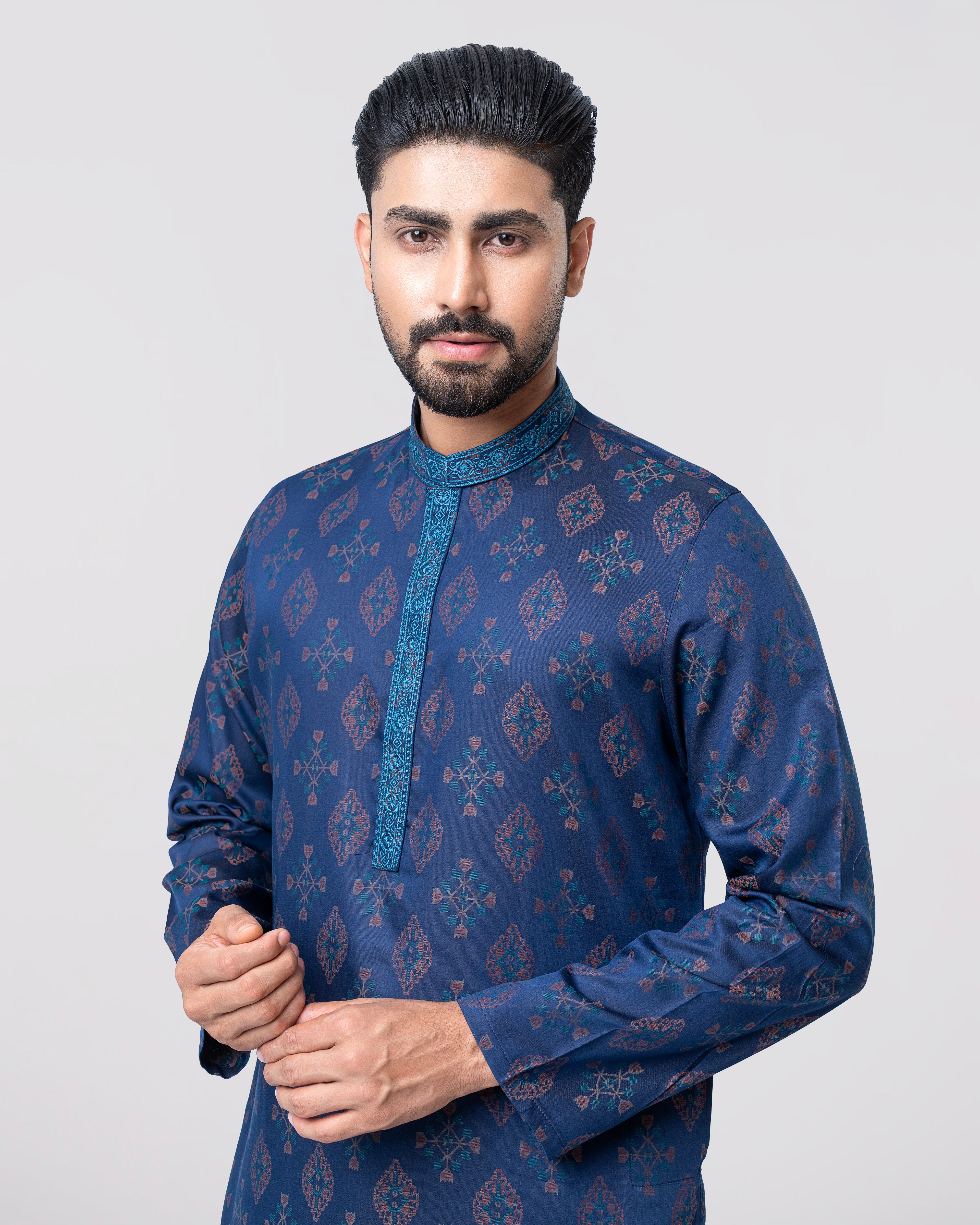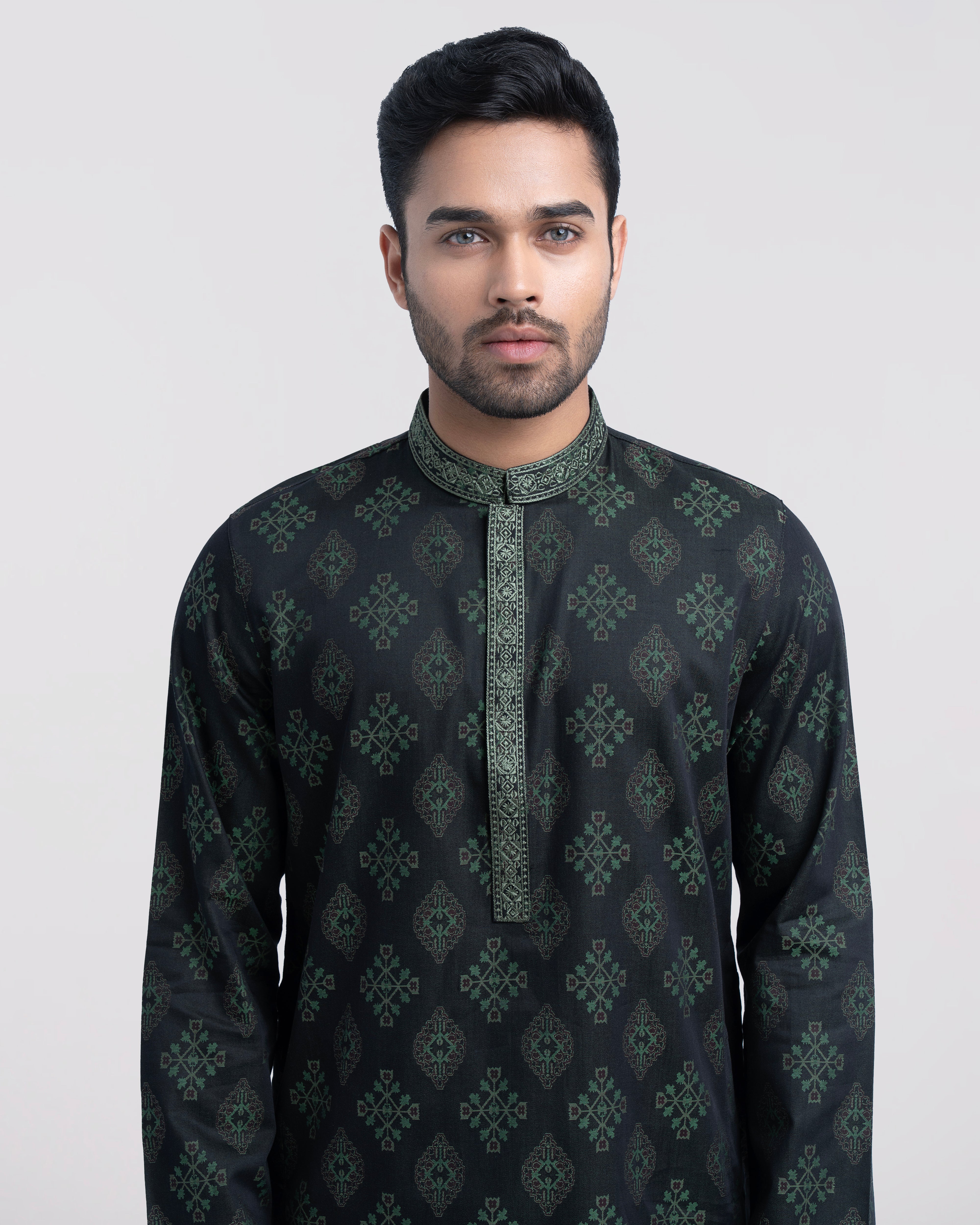 A regular fit Panjabi crafted from 100% cotton jacquard breathable fabric, featuring classical embroidery on band and placket, offers a stylish yet comfortable semi-formal look. Perfect for effortless elegance and all-day ease.