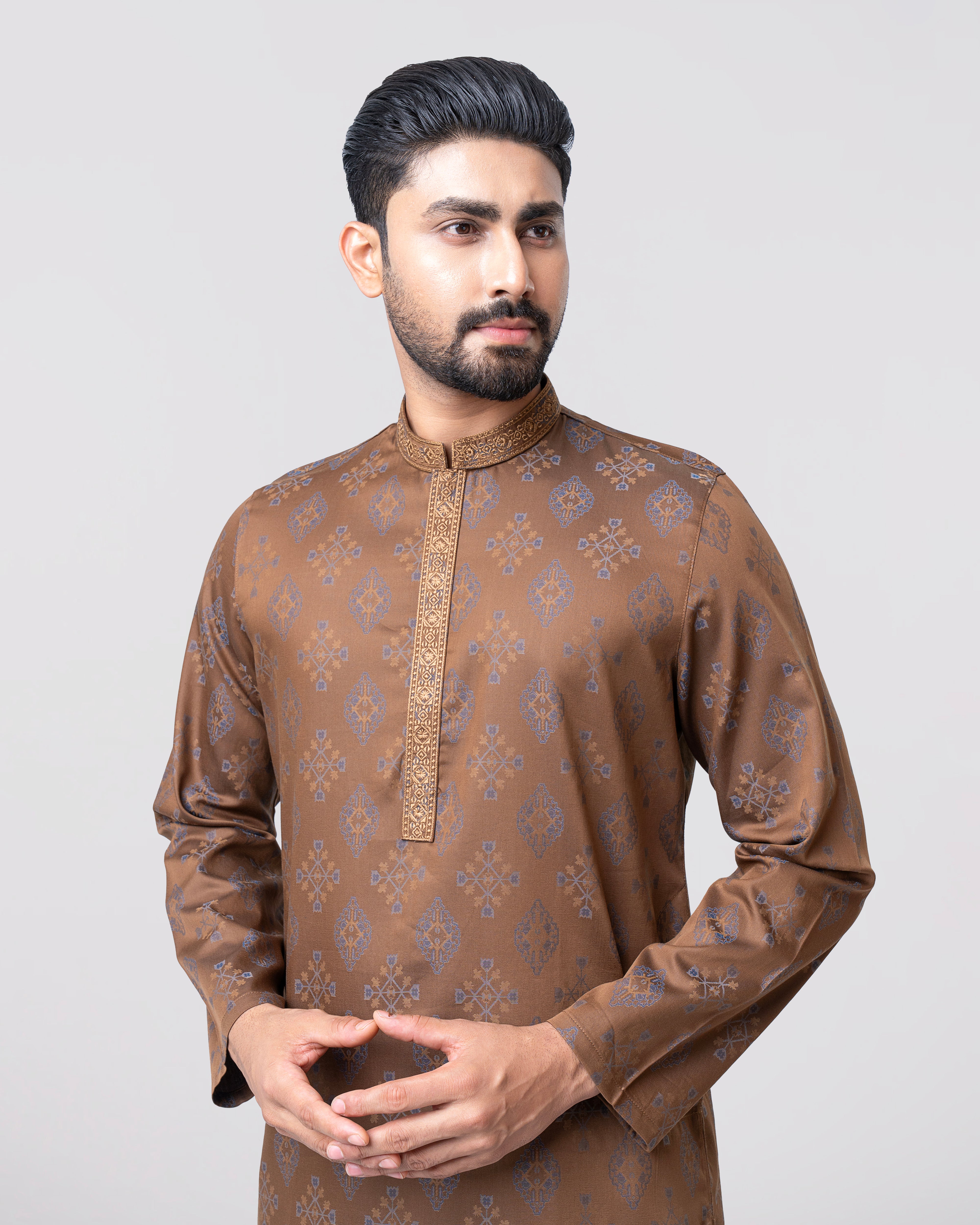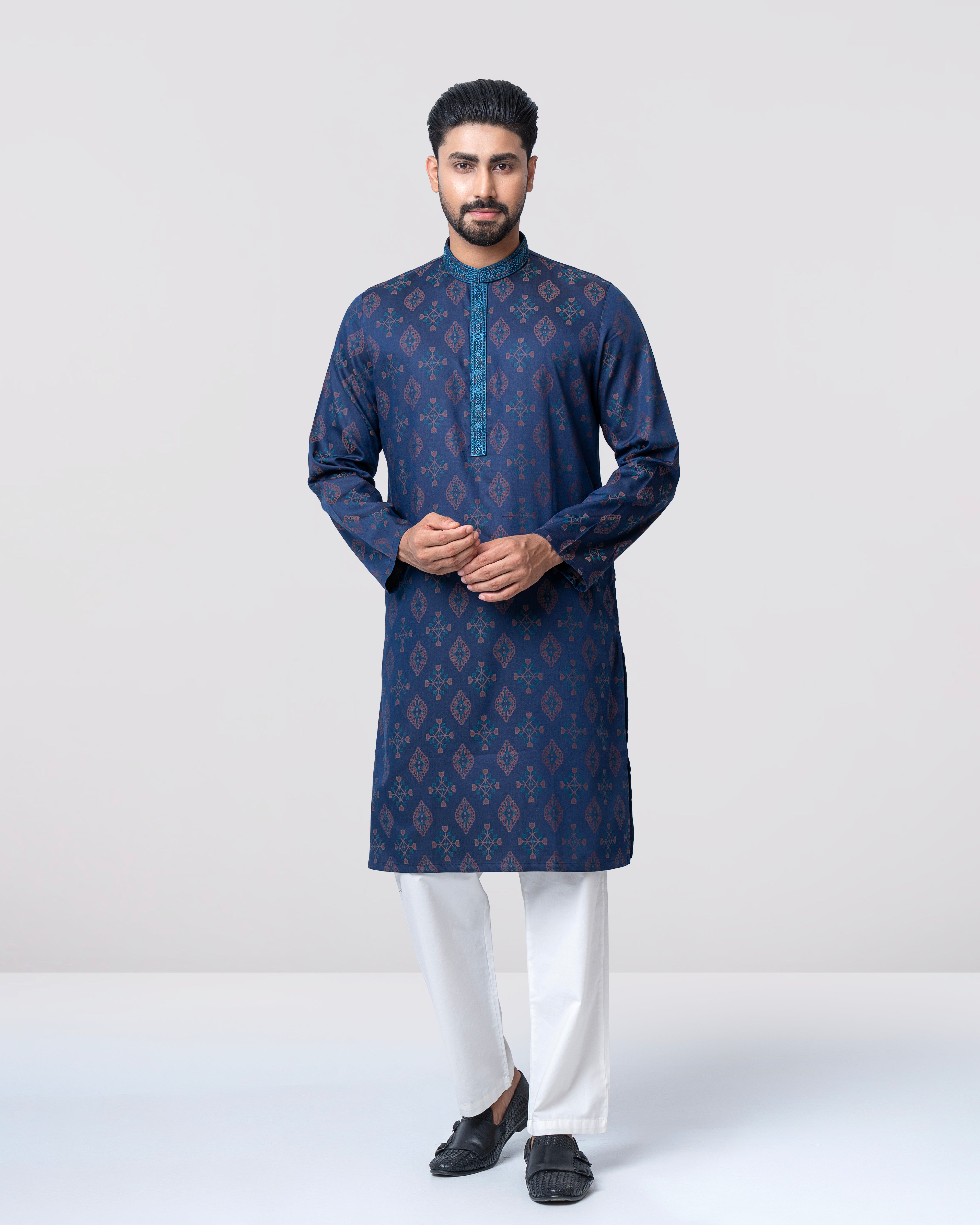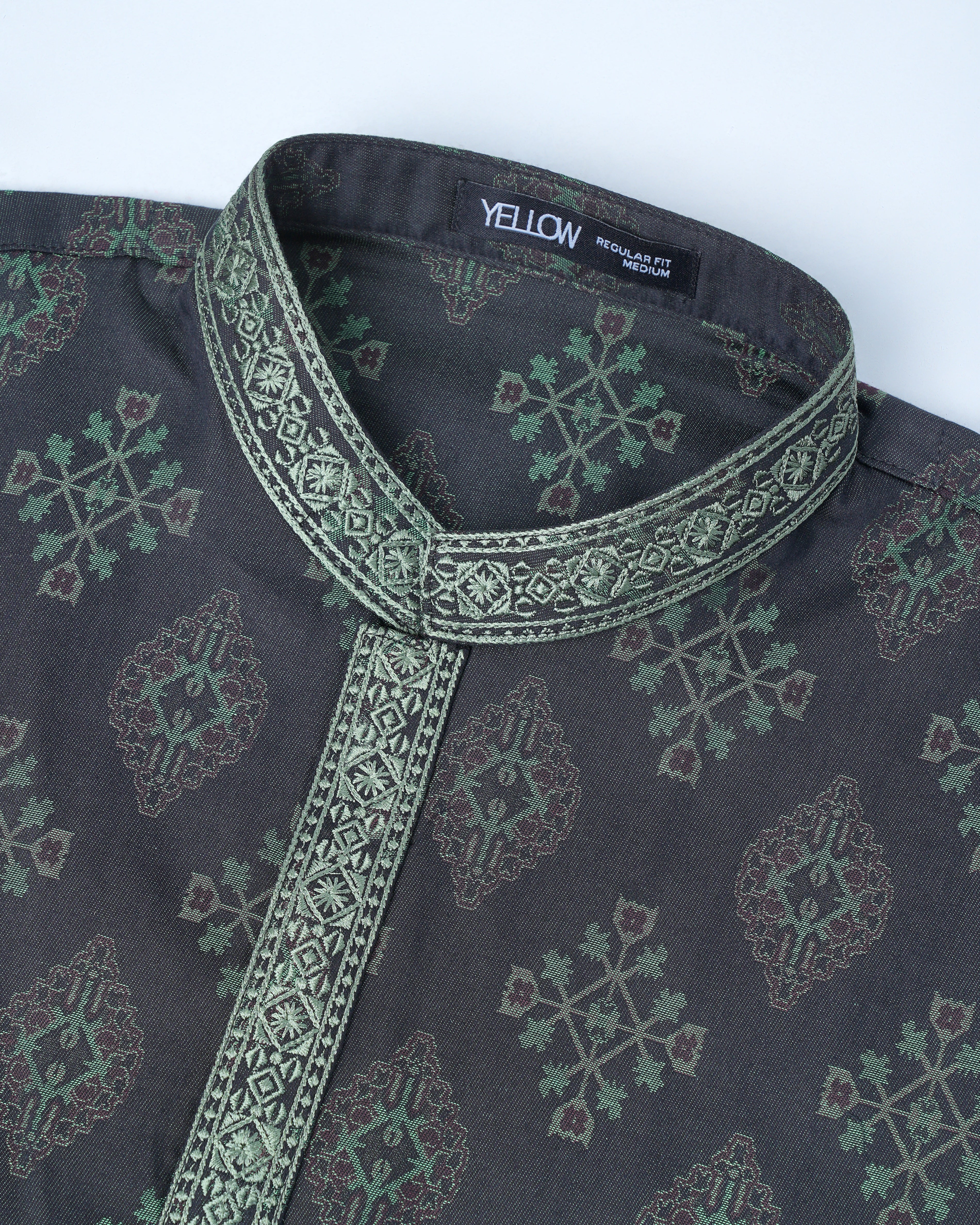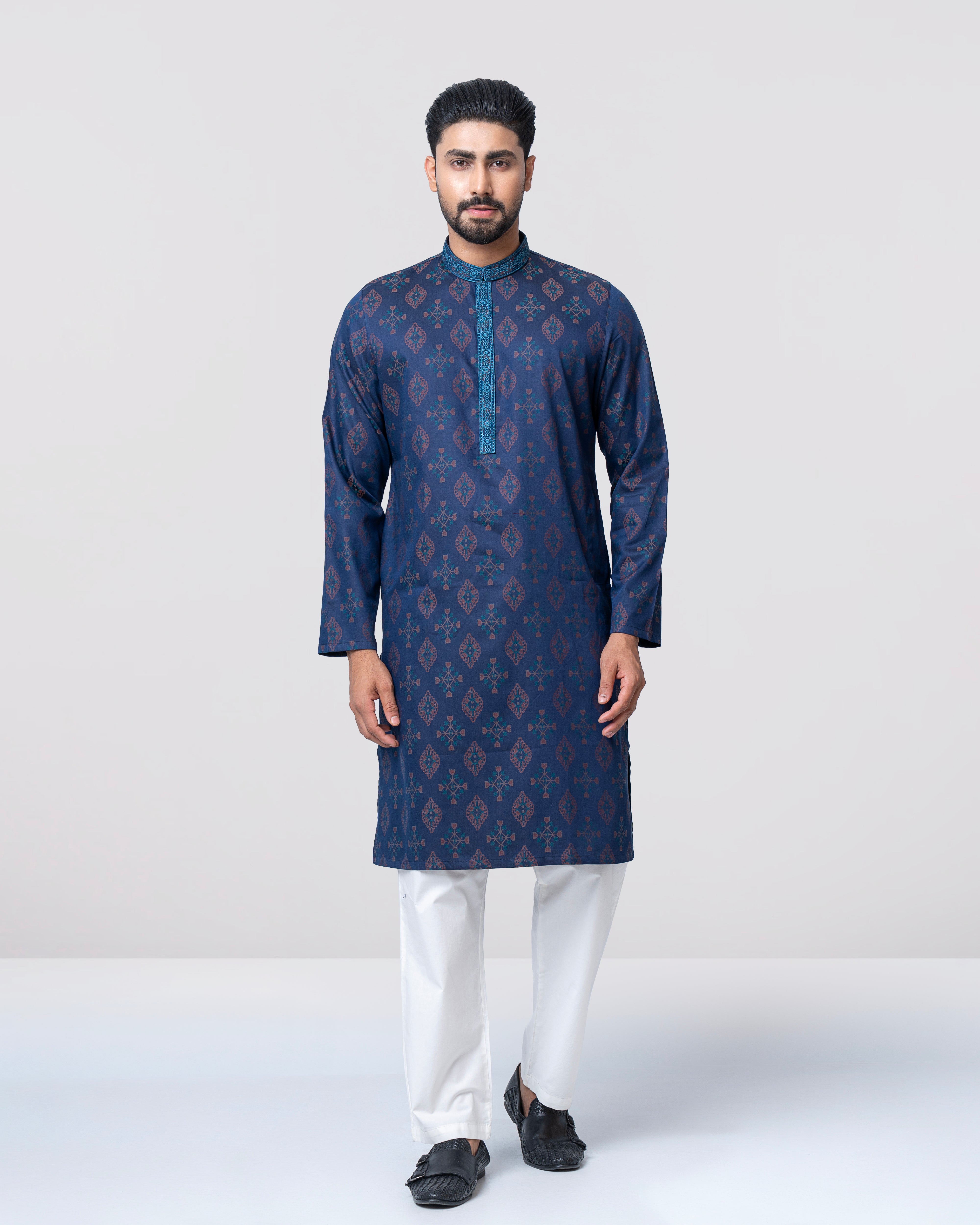 A regular fit Panjabi crafted from 100% cotton jacquard breathable fabric, featuring classical embroidery on band and placket, offers a stylish yet comfortable semi-formal look. Perfect for effortless elegance and all-day ease.