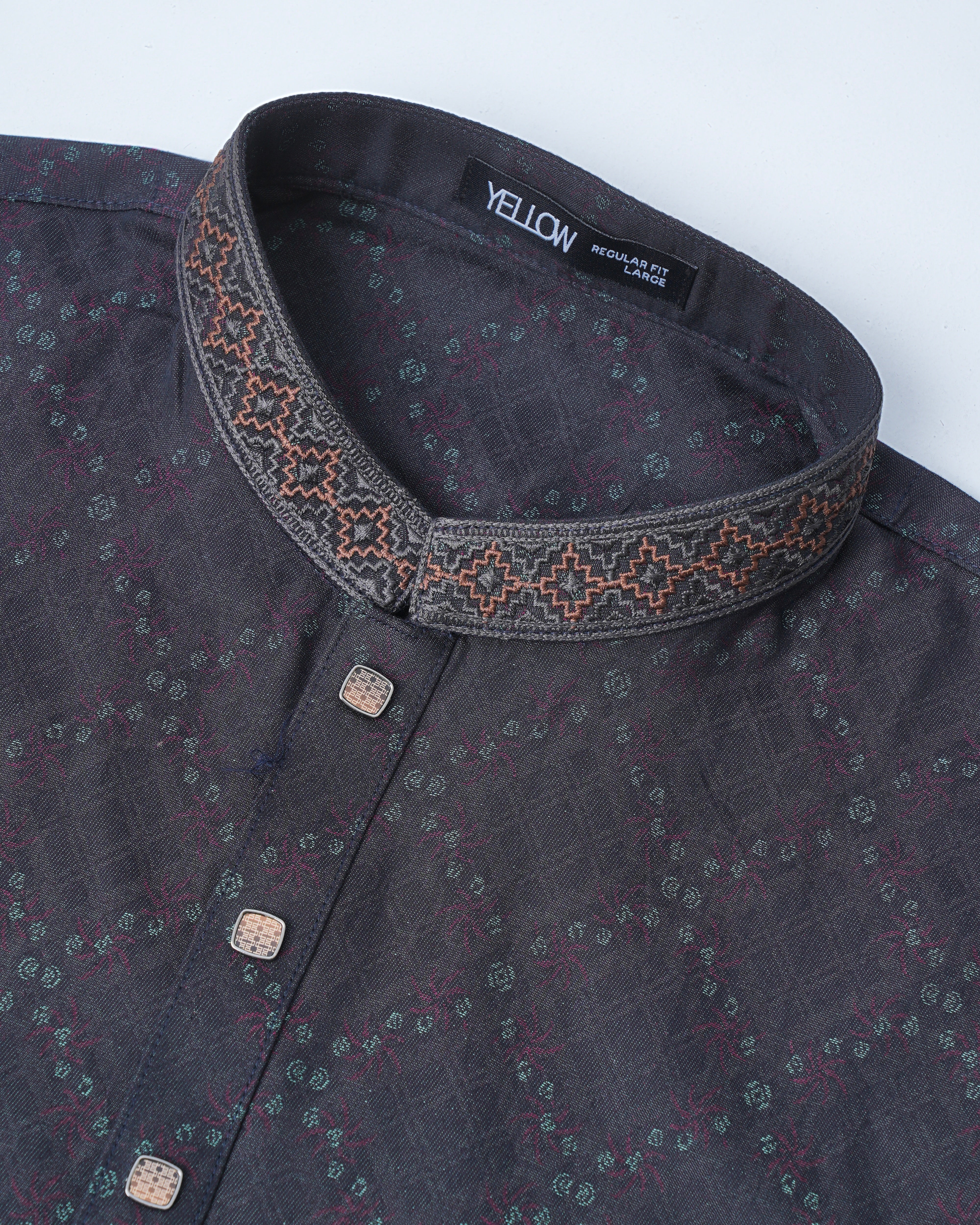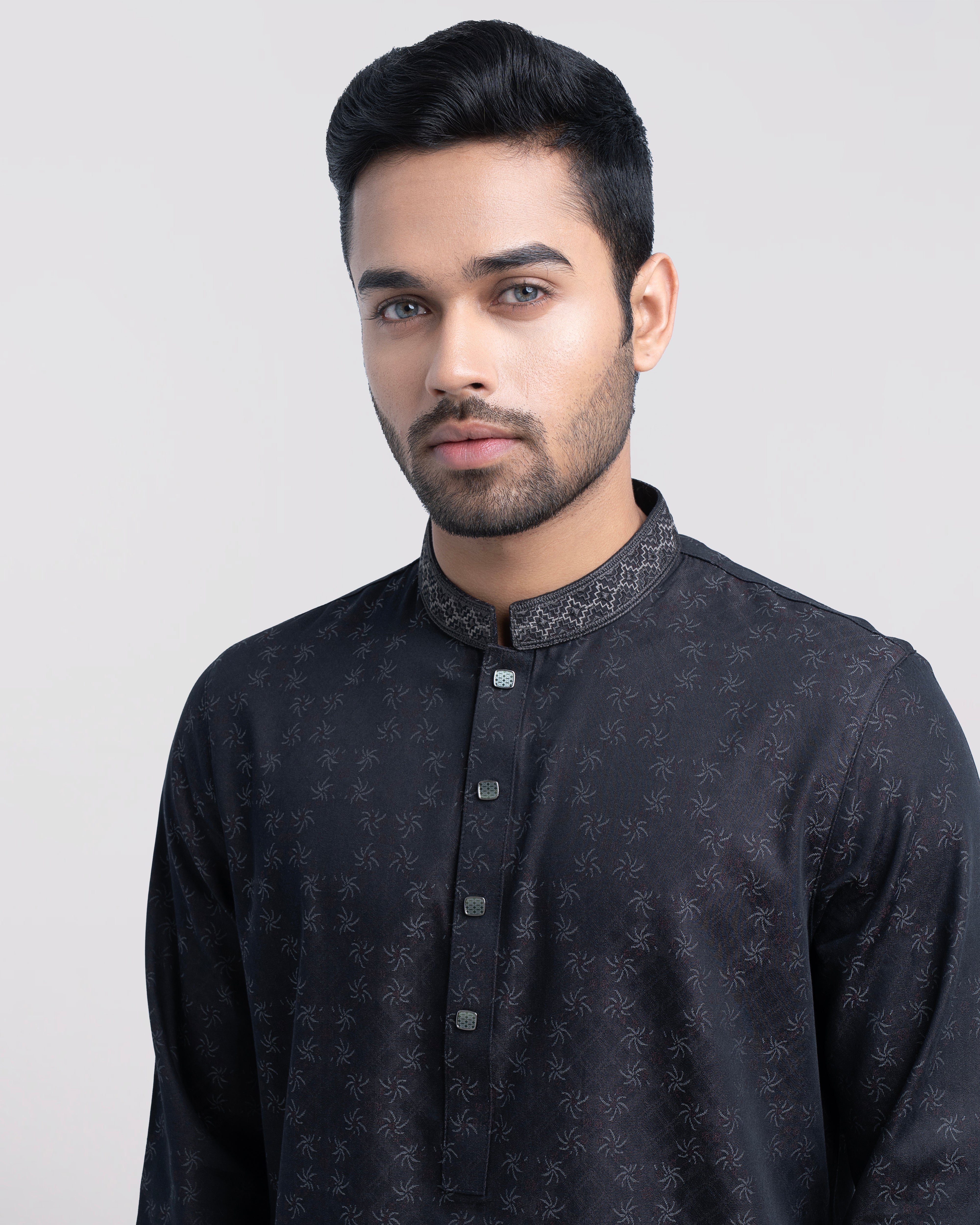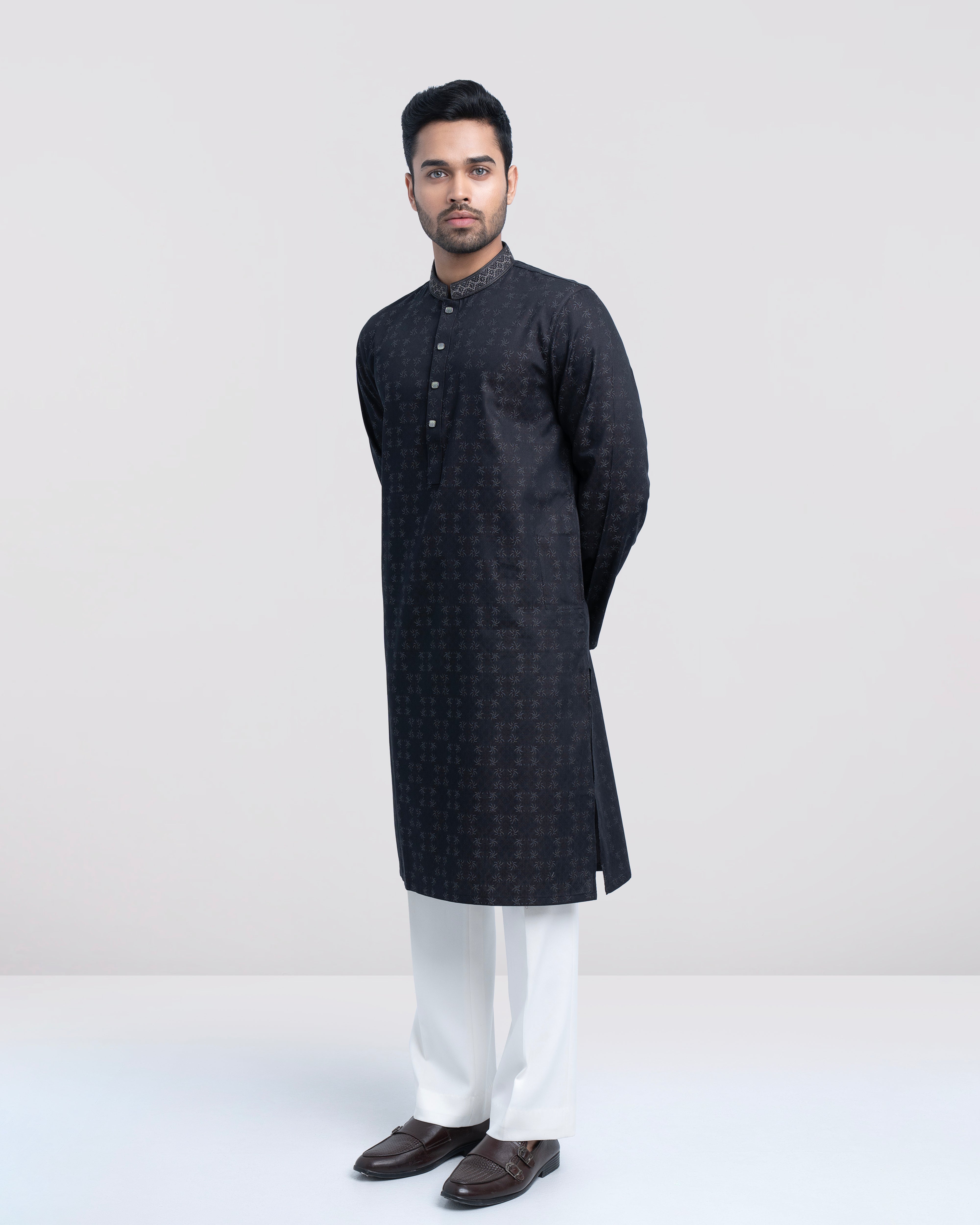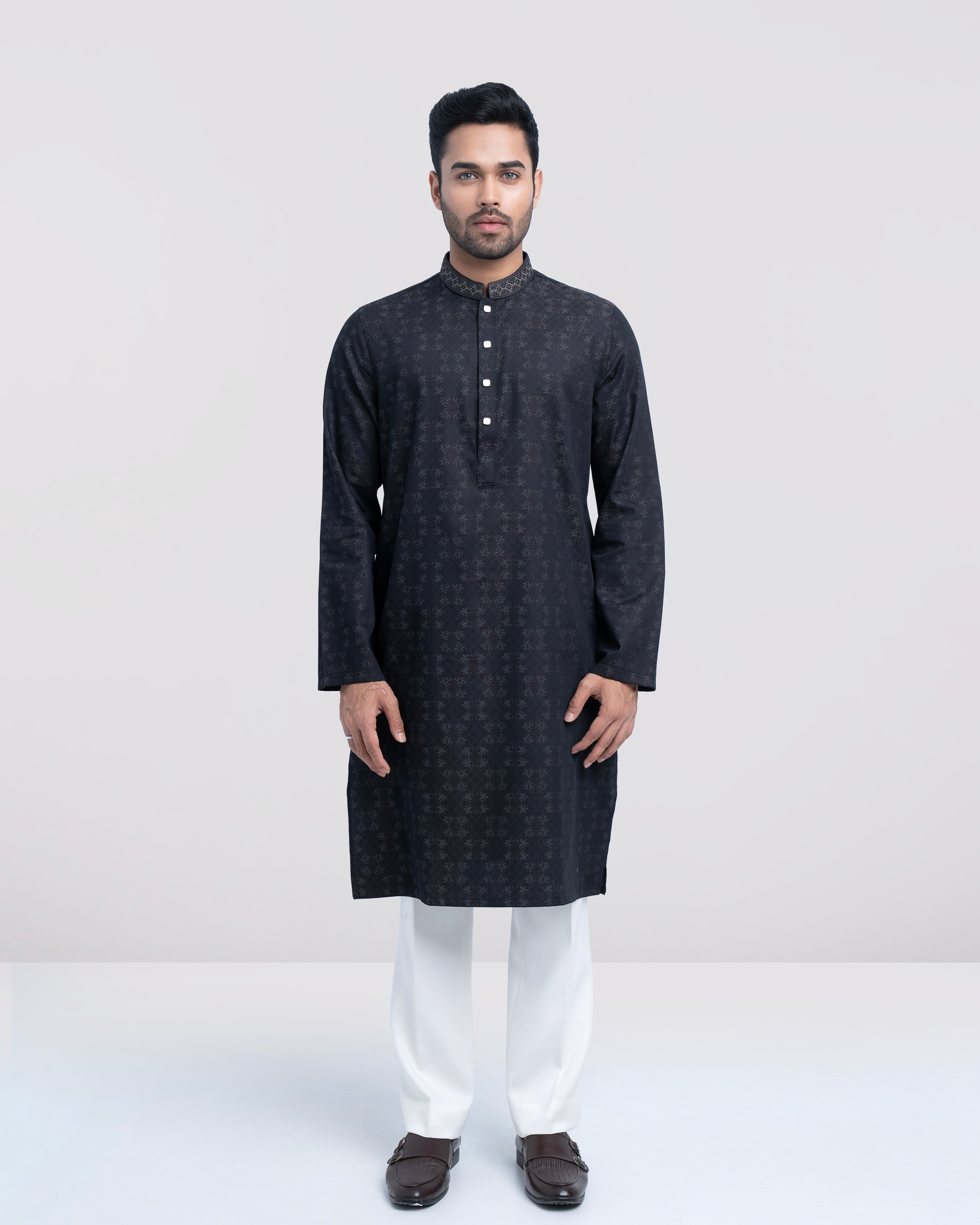 A regular fit Panjabi crafted from 100% cotton jacquard breathable fabric, featuring classical embroidery on band and decorative snap buttons, offers a stylish yet comfortable semi-formal look. Perfect for effortless elegance and all-day ease.