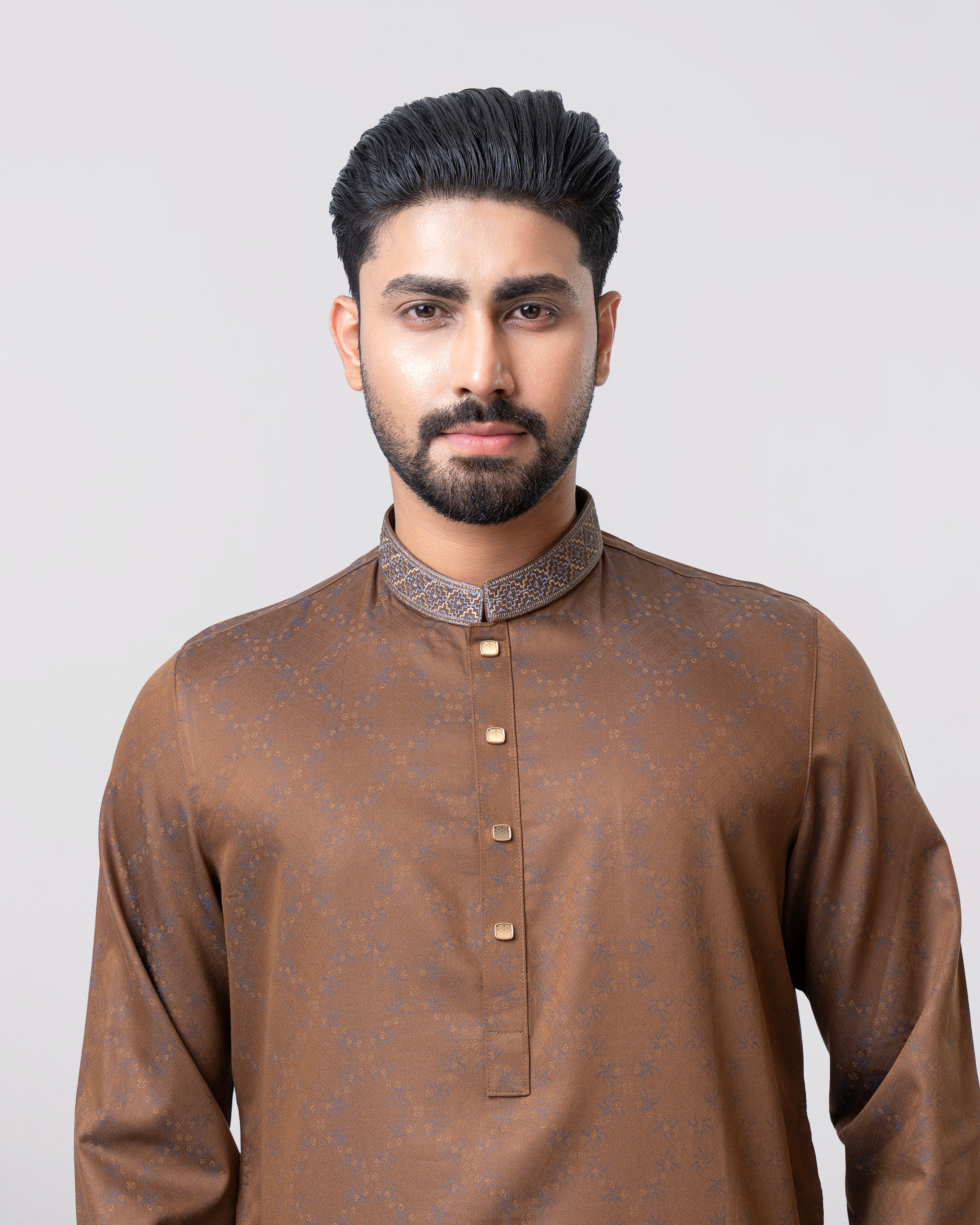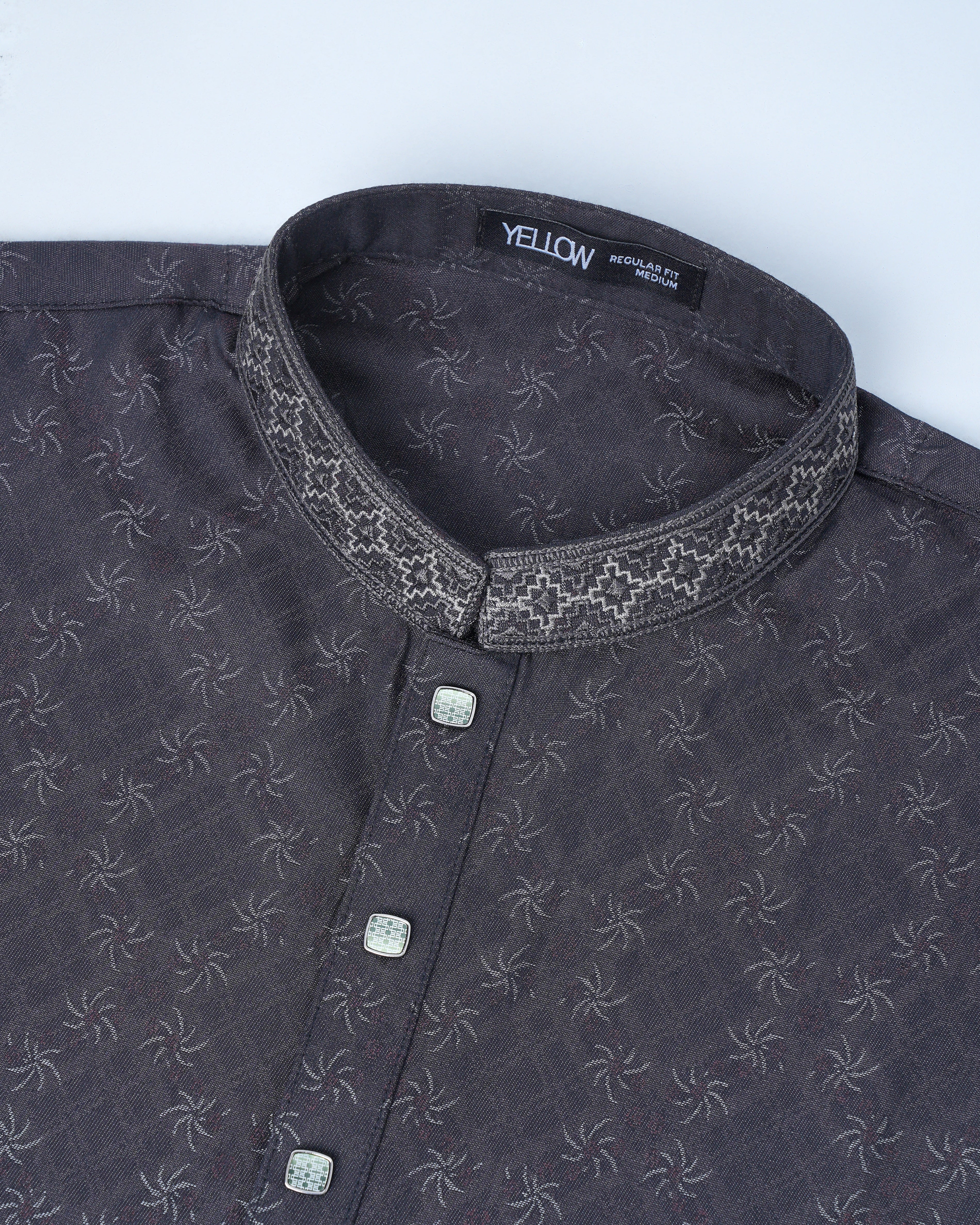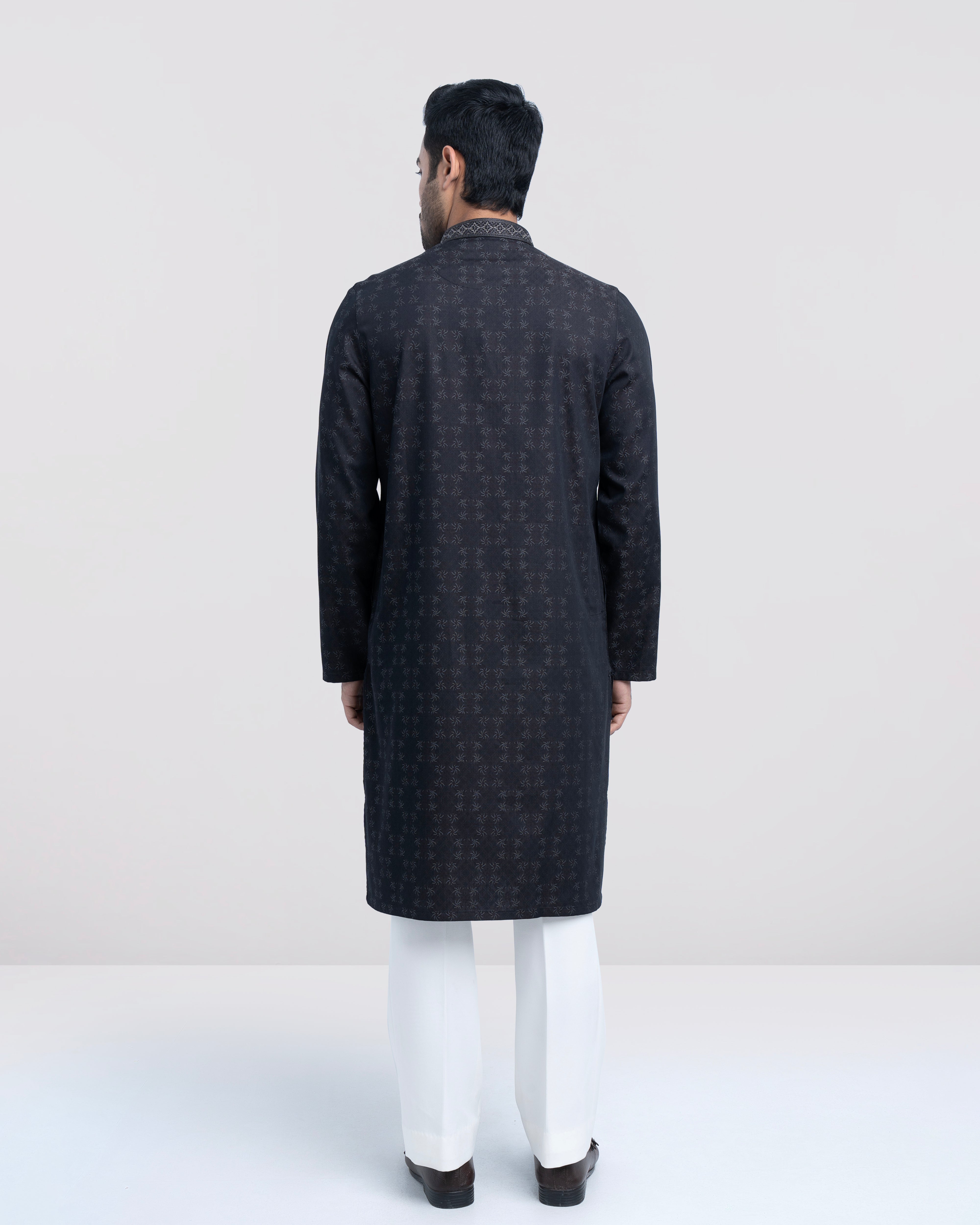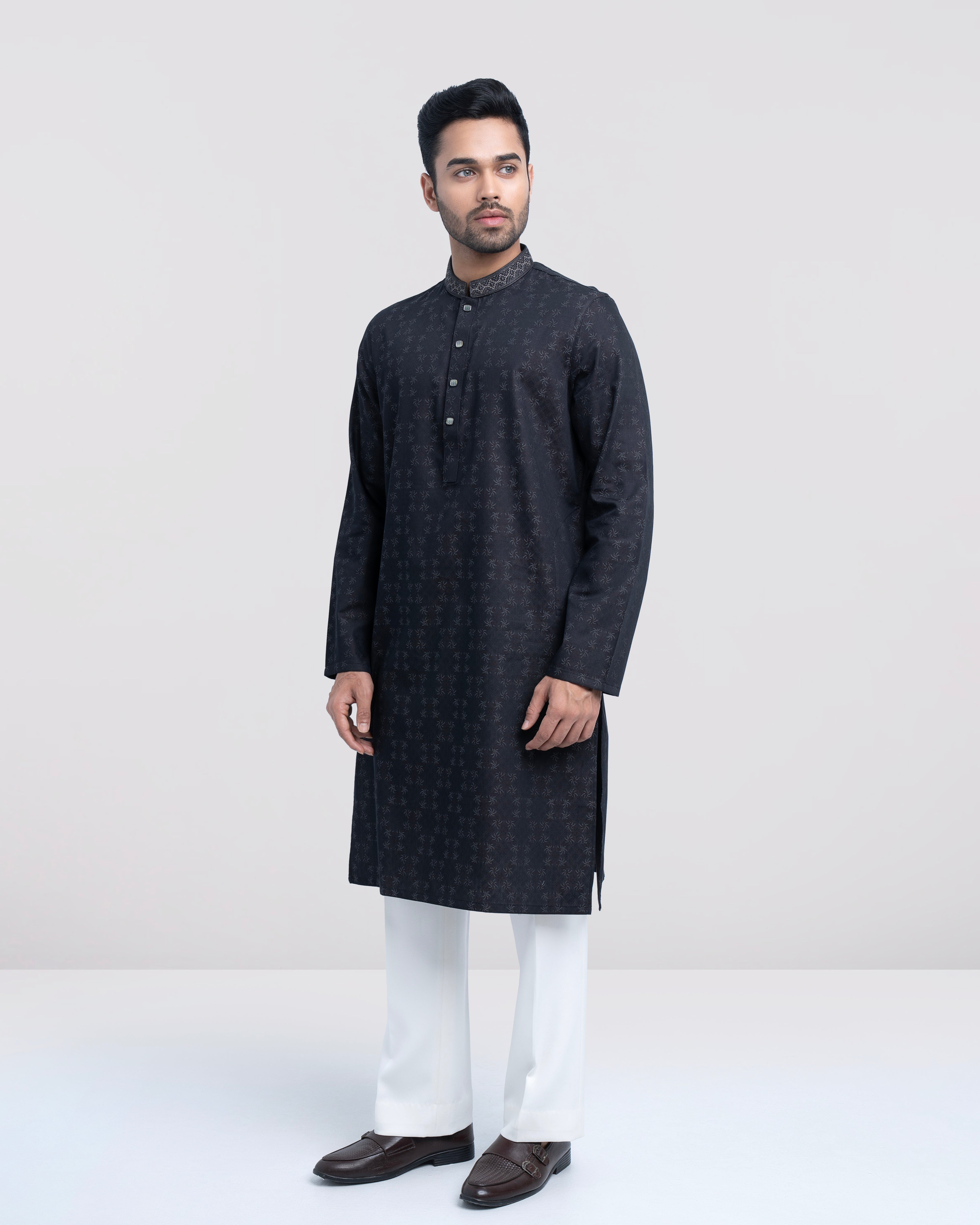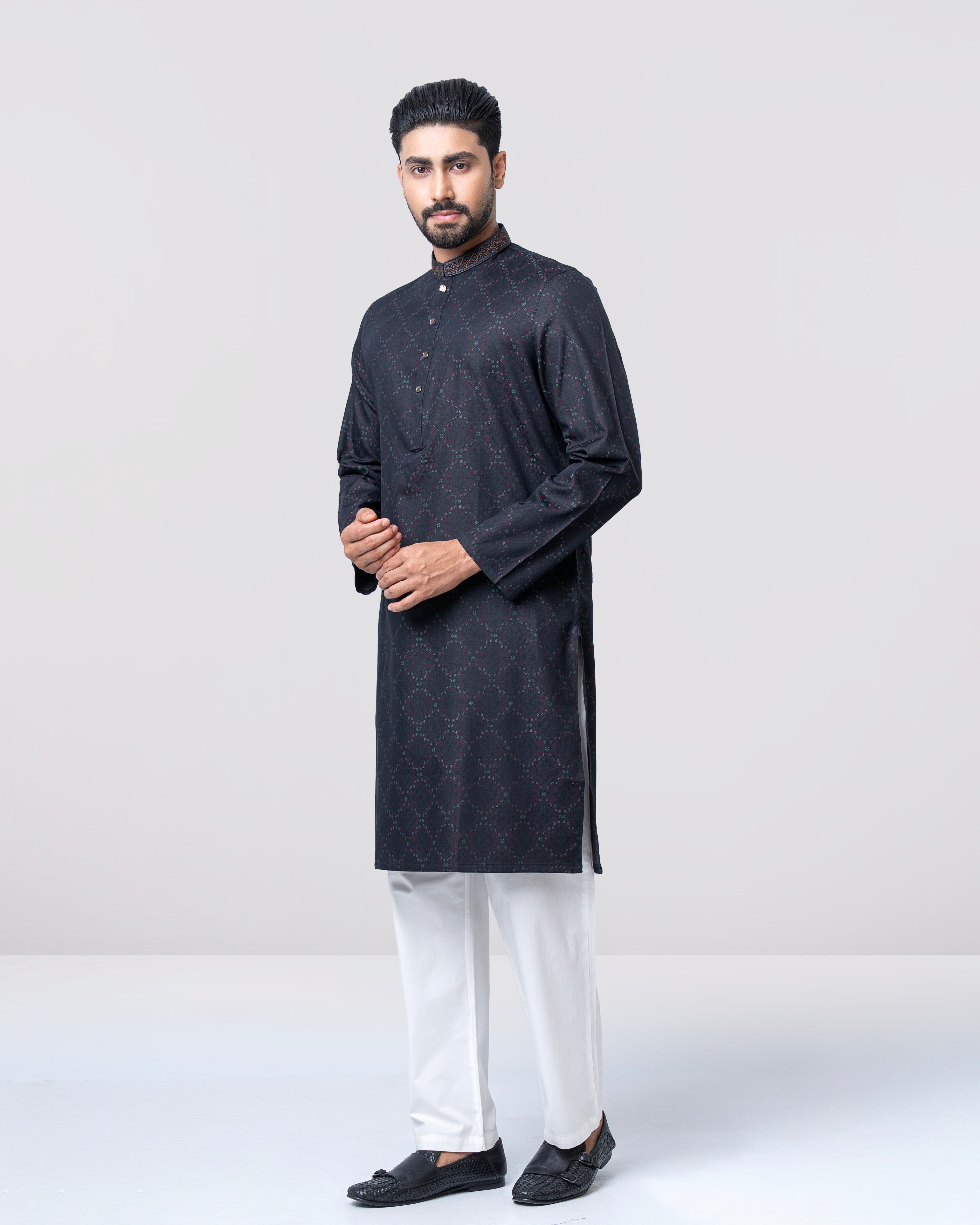 A regular fit Panjabi crafted from 100% cotton jacquard breathable fabric, featuring classical embroidery on band and decorative snap buttons, offers a stylish yet comfortable semi-formal look. Perfect for effortless elegance and all-day ease.