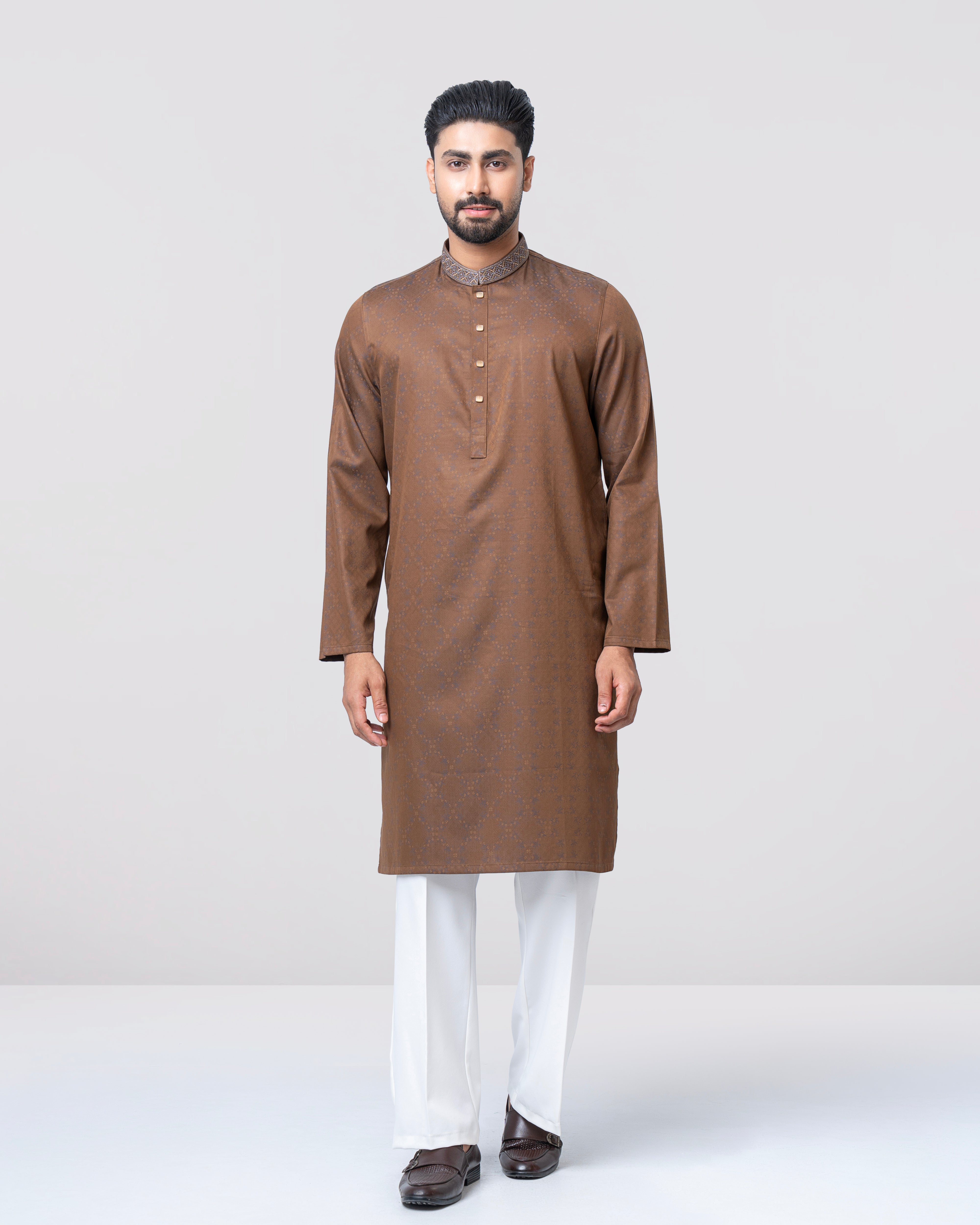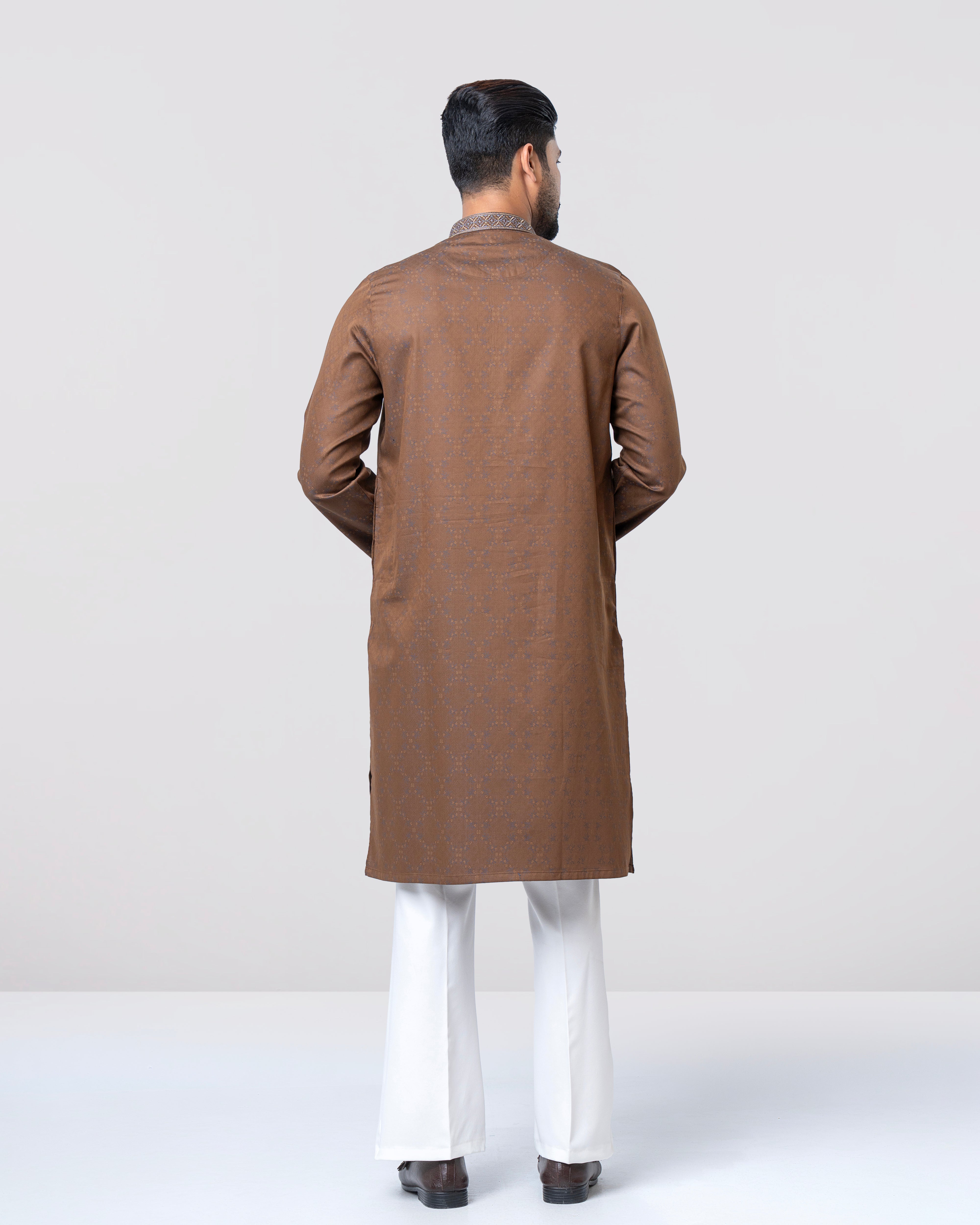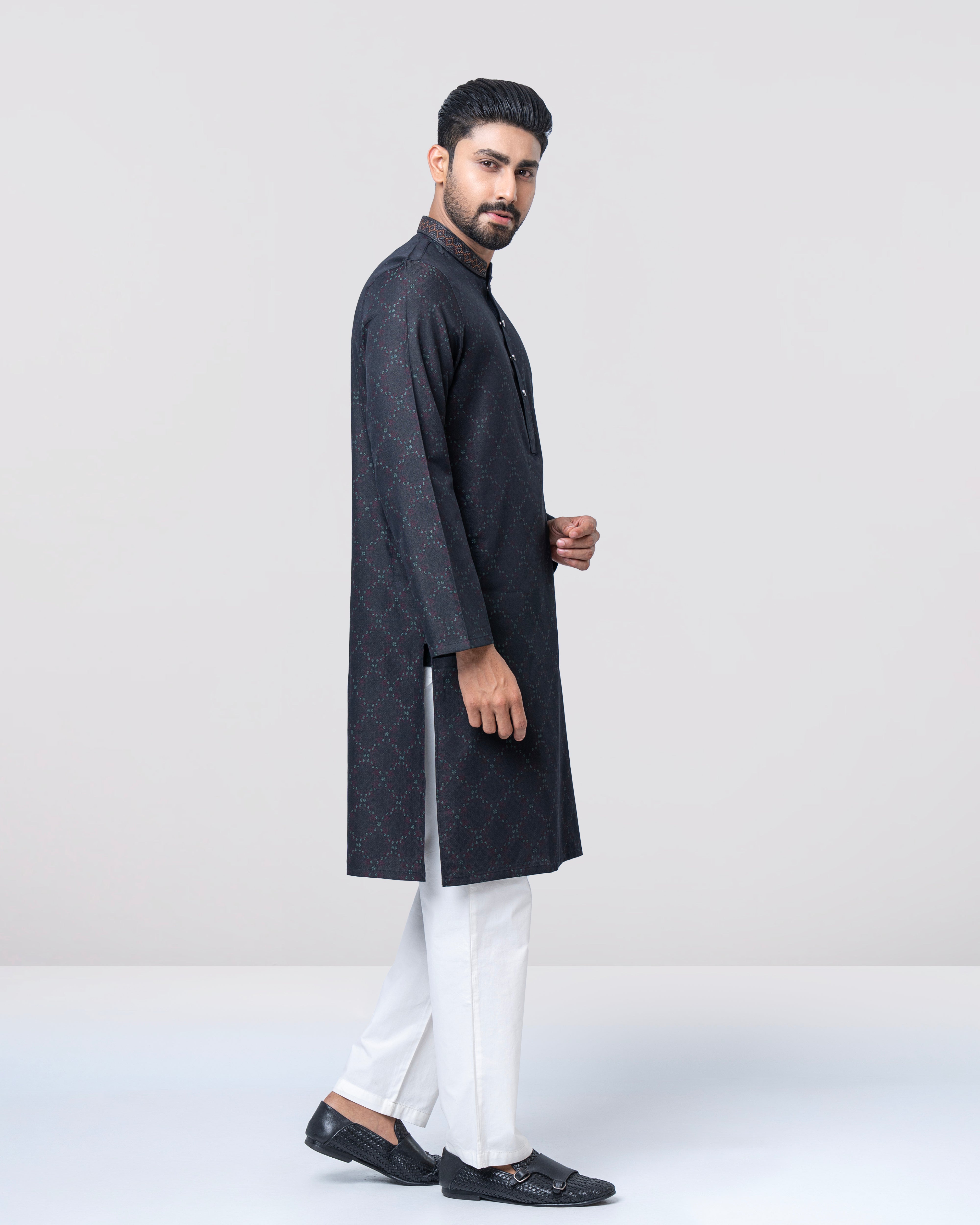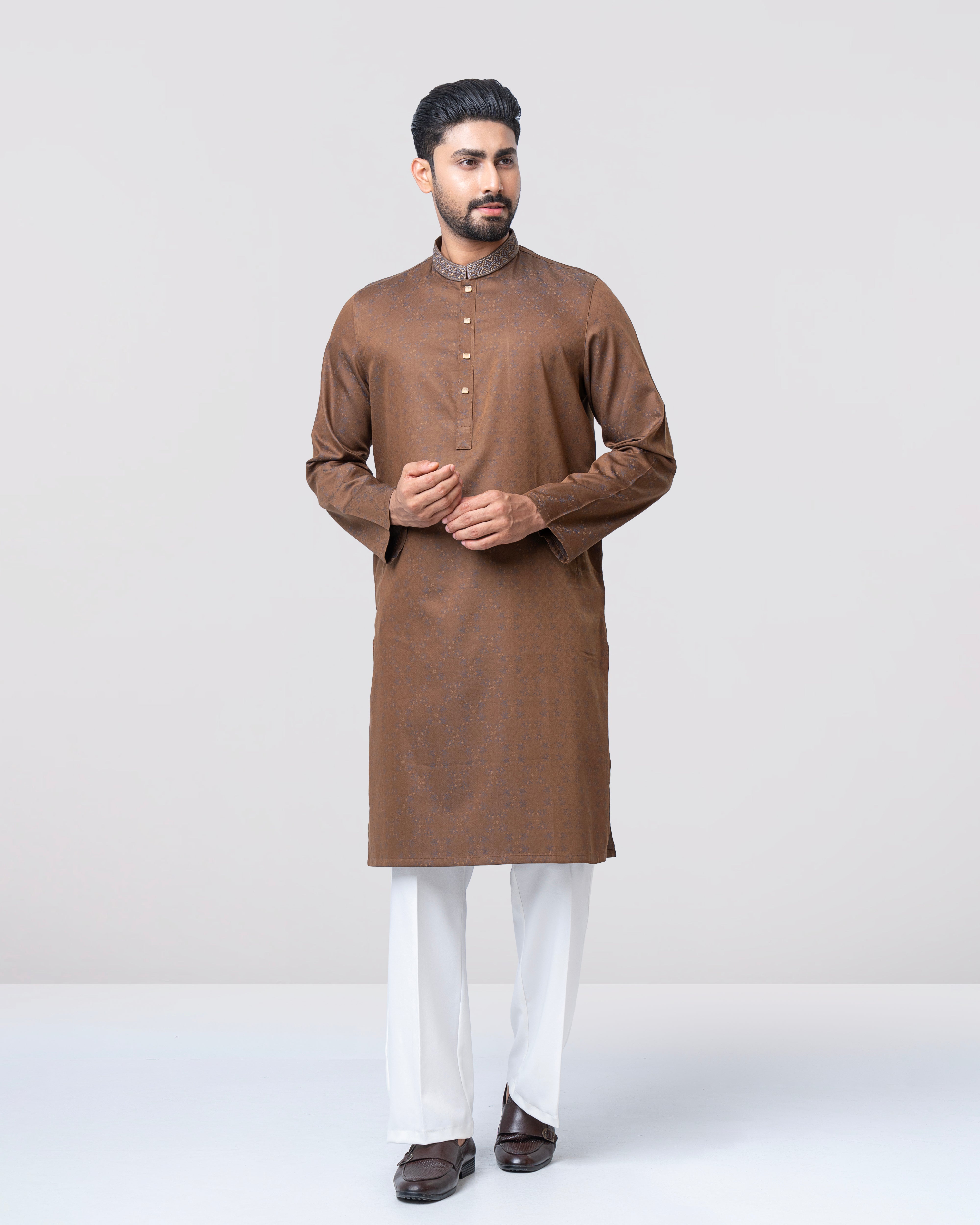 A regular fit Panjabi crafted from 100% cotton jacquard breathable fabric, featuring classical embroidery on band and decorative snap buttons, offers a stylish yet comfortable semi-formal look. Perfect for effortless elegance and all-day ease.