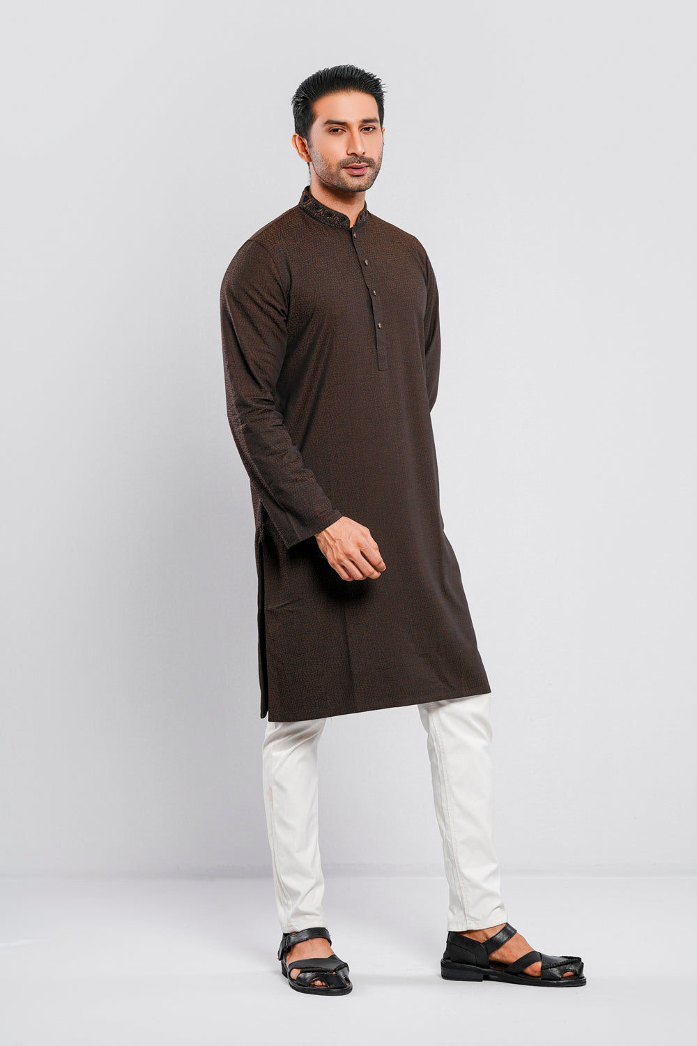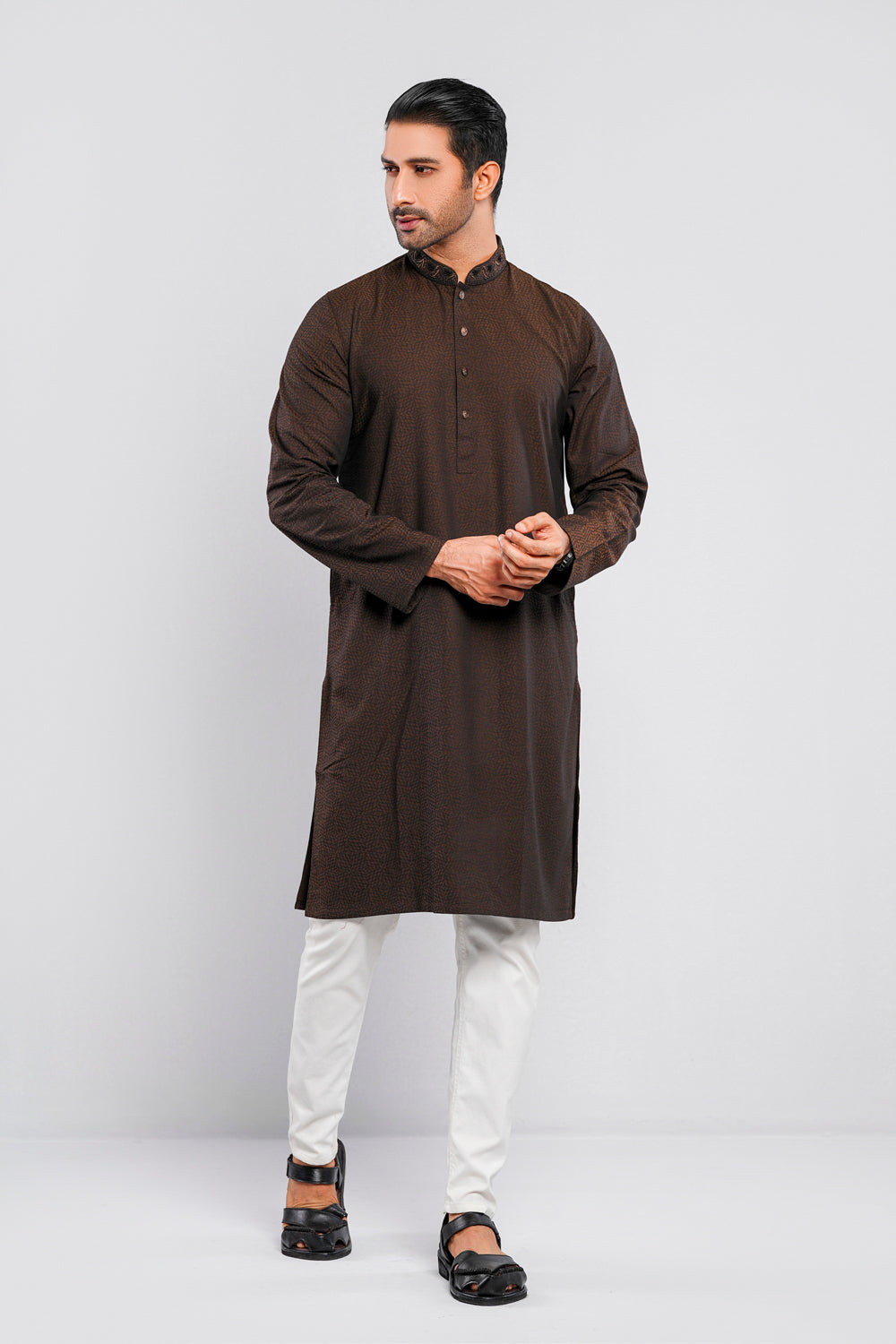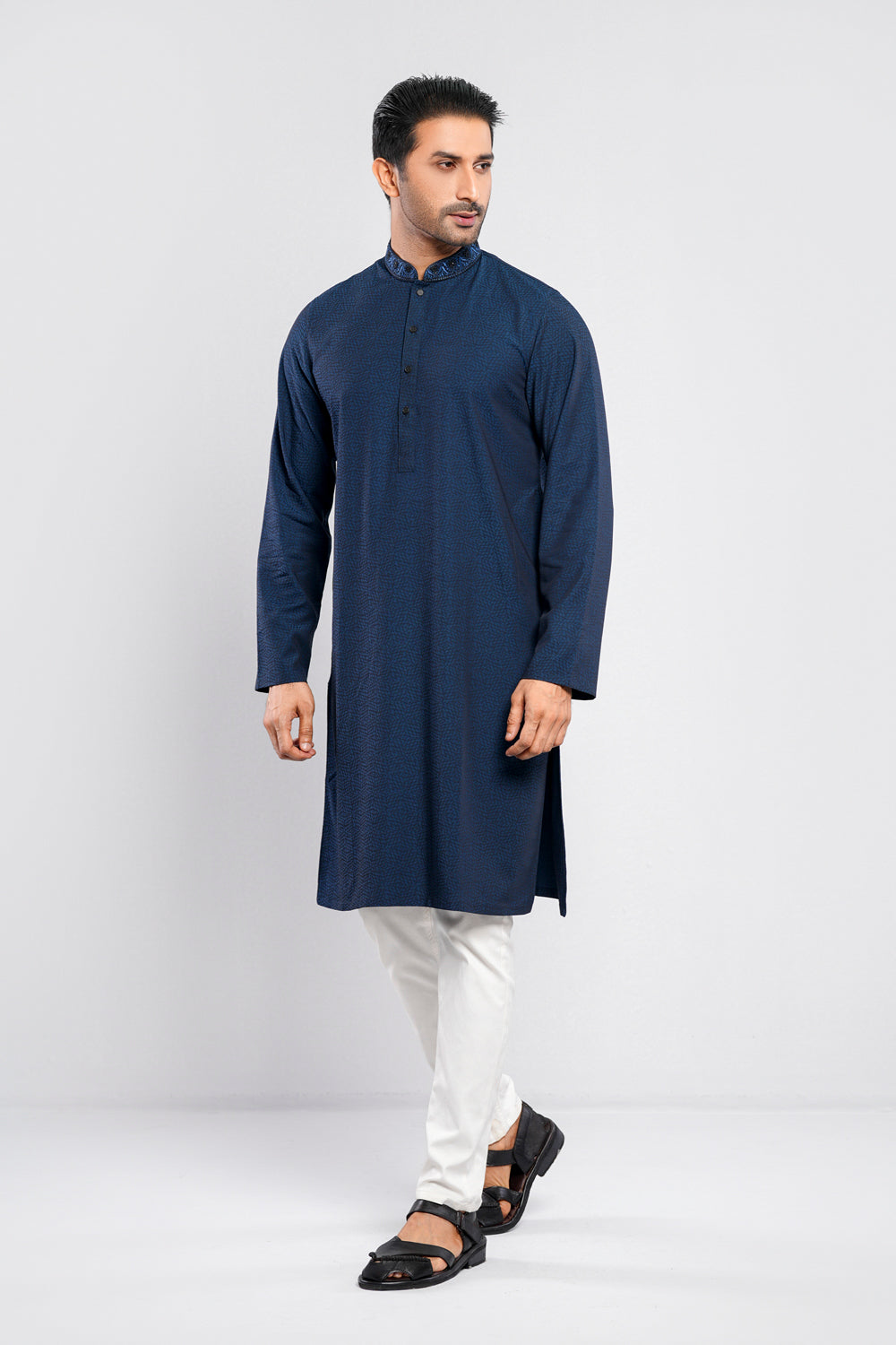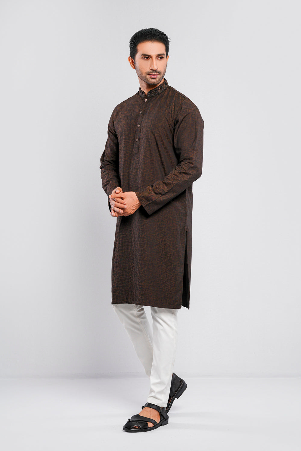 A regular fit Panjabi crafted from jacquard blended breathable fabric, featuring intricate embroidery on band and decorative snap buttons, offers a stylish yet comfortable semi-formal look. Perfect for effortless elegance and all-day ease.