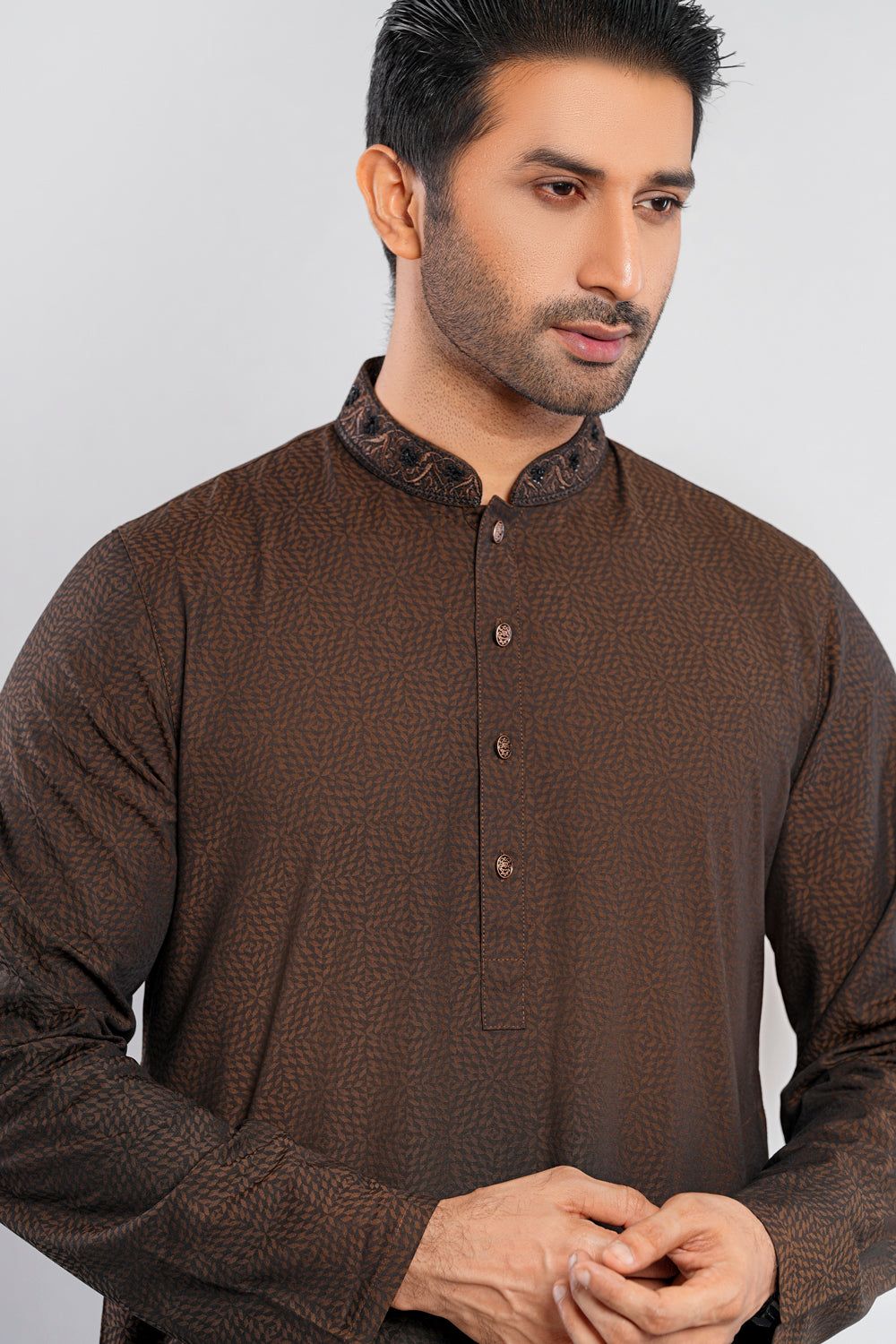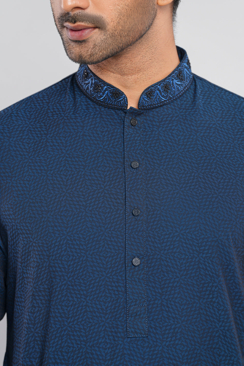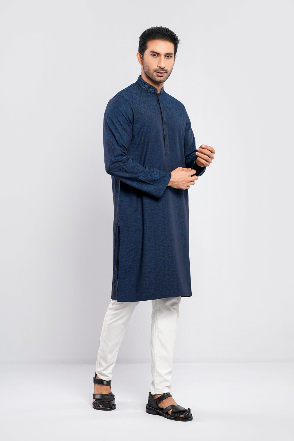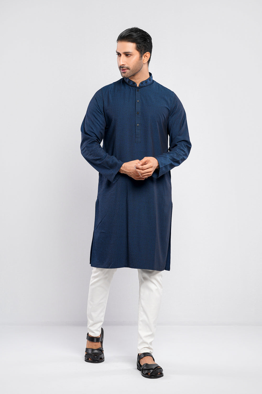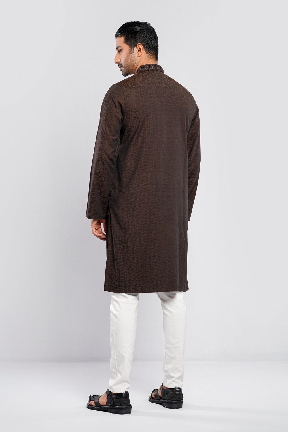 A regular fit Panjabi crafted from jacquard blended breathable fabric, featuring intricate embroidery on band and decorative snap buttons, offers a stylish yet comfortable semi-formal look. Perfect for effortless elegance and all-day ease.