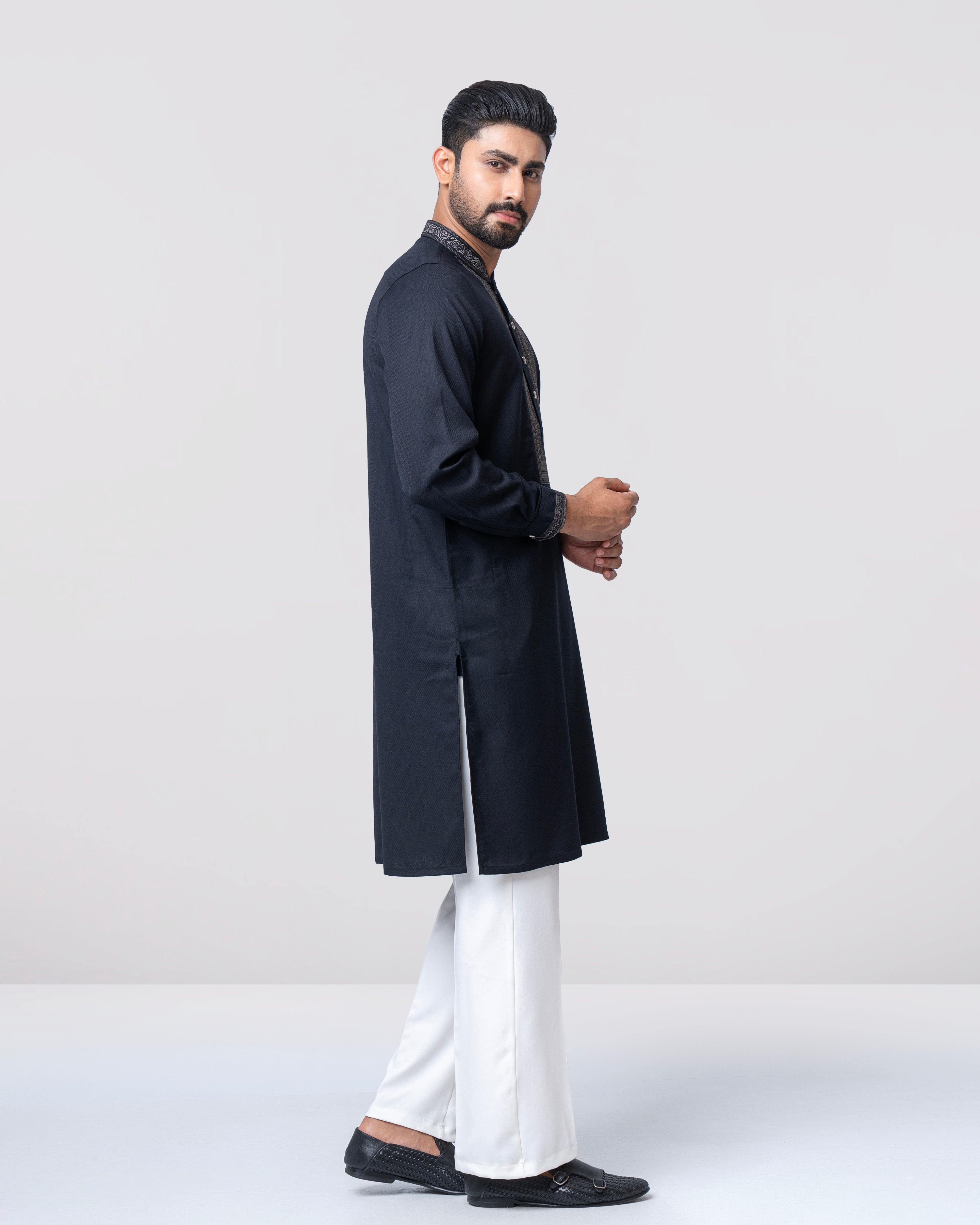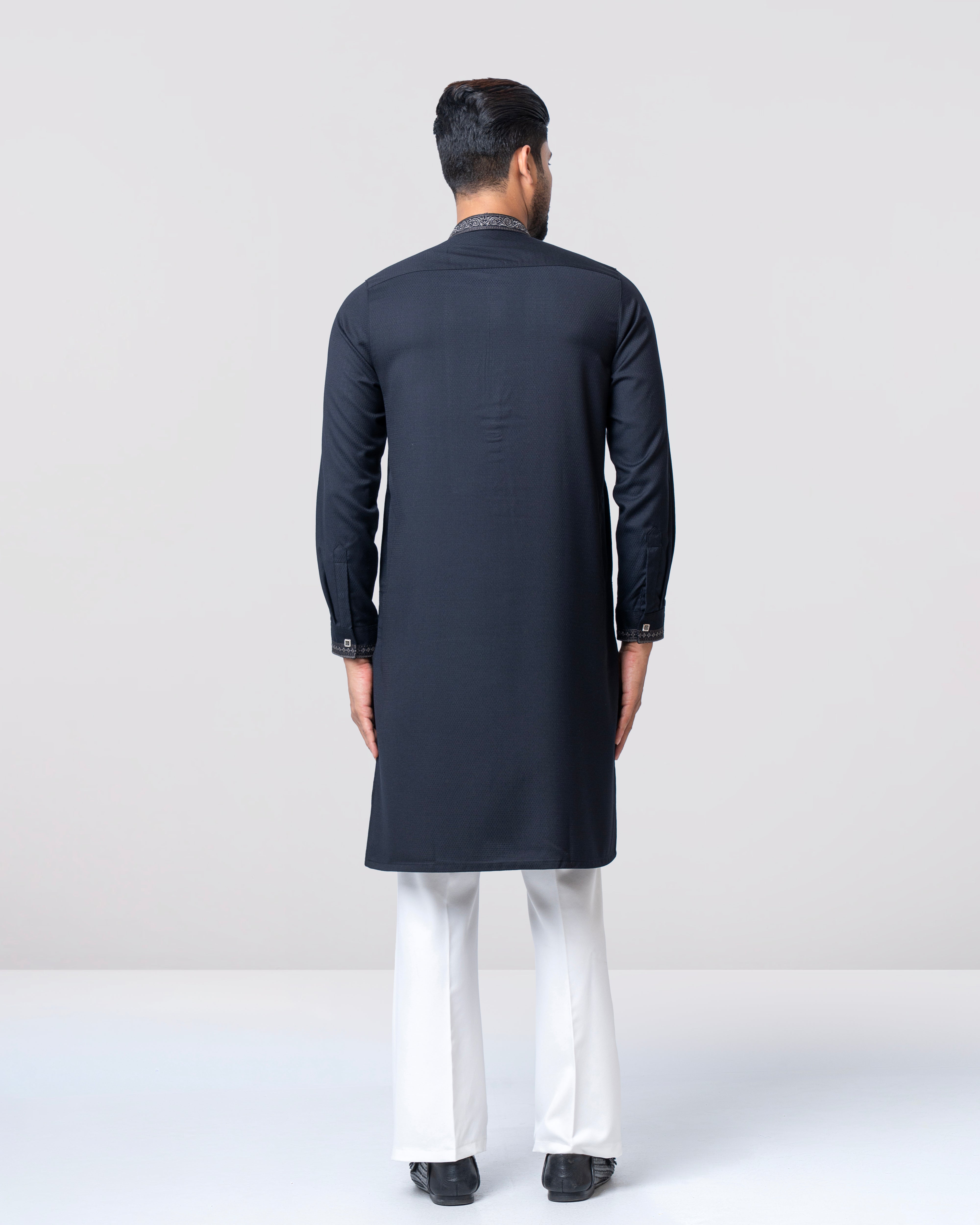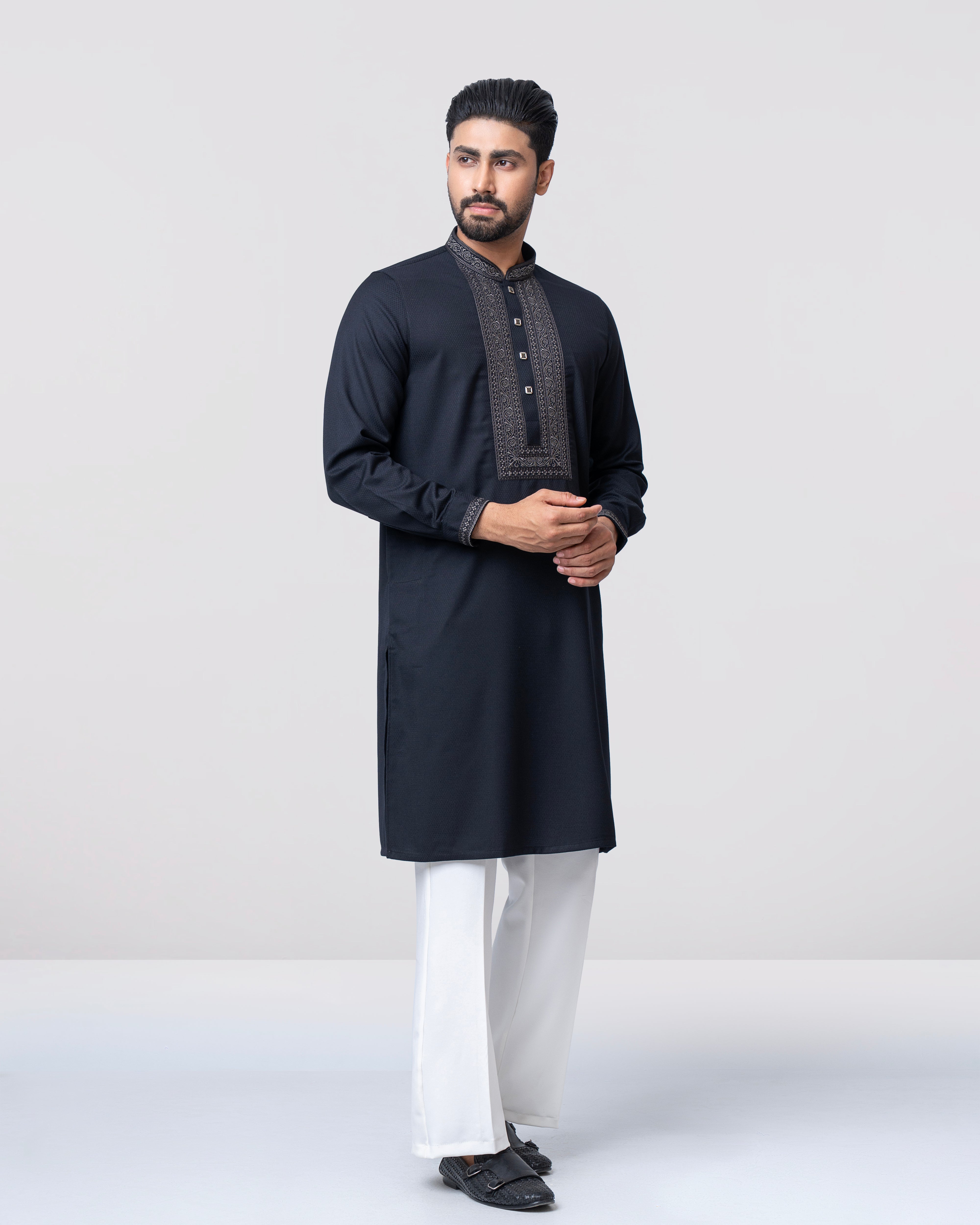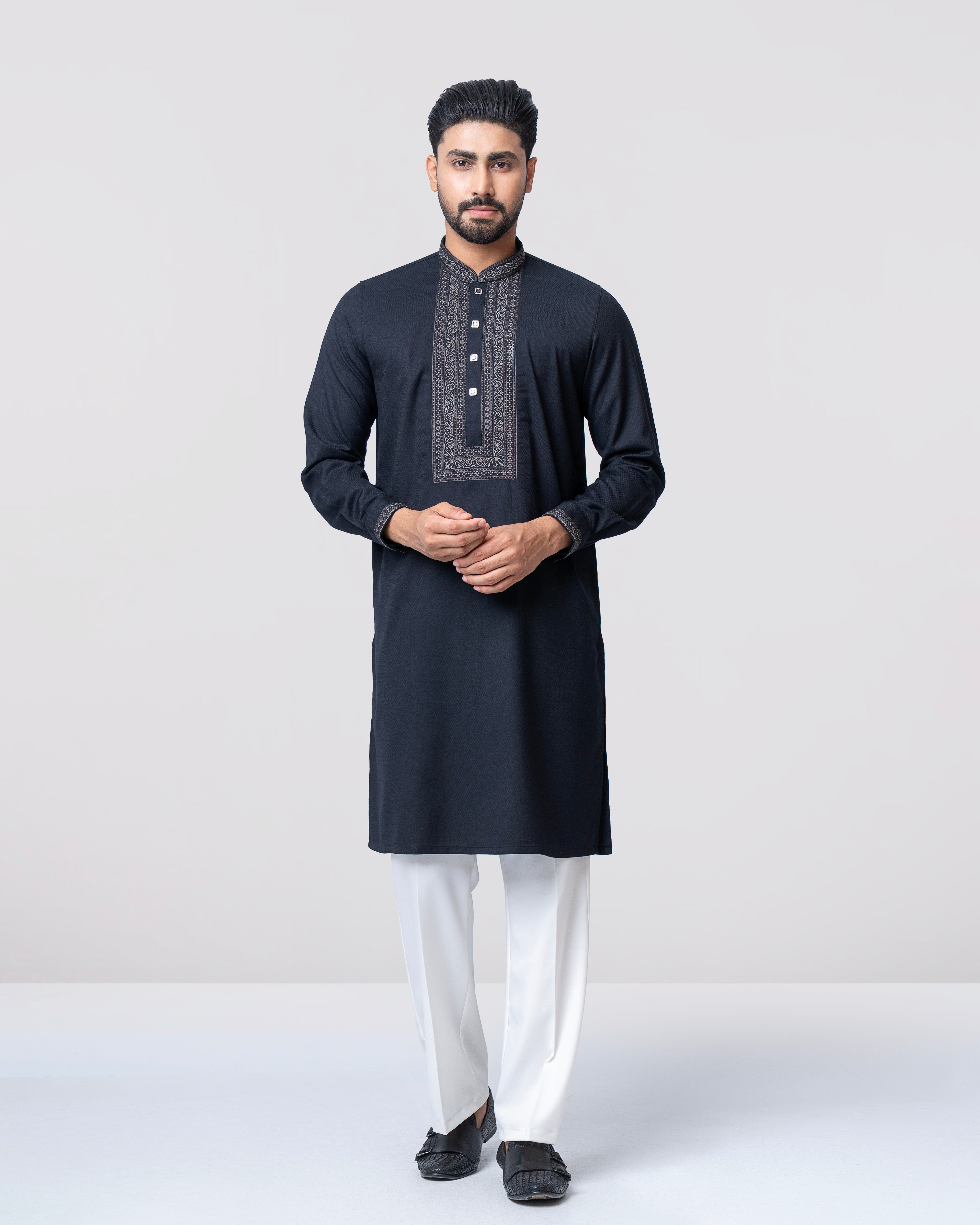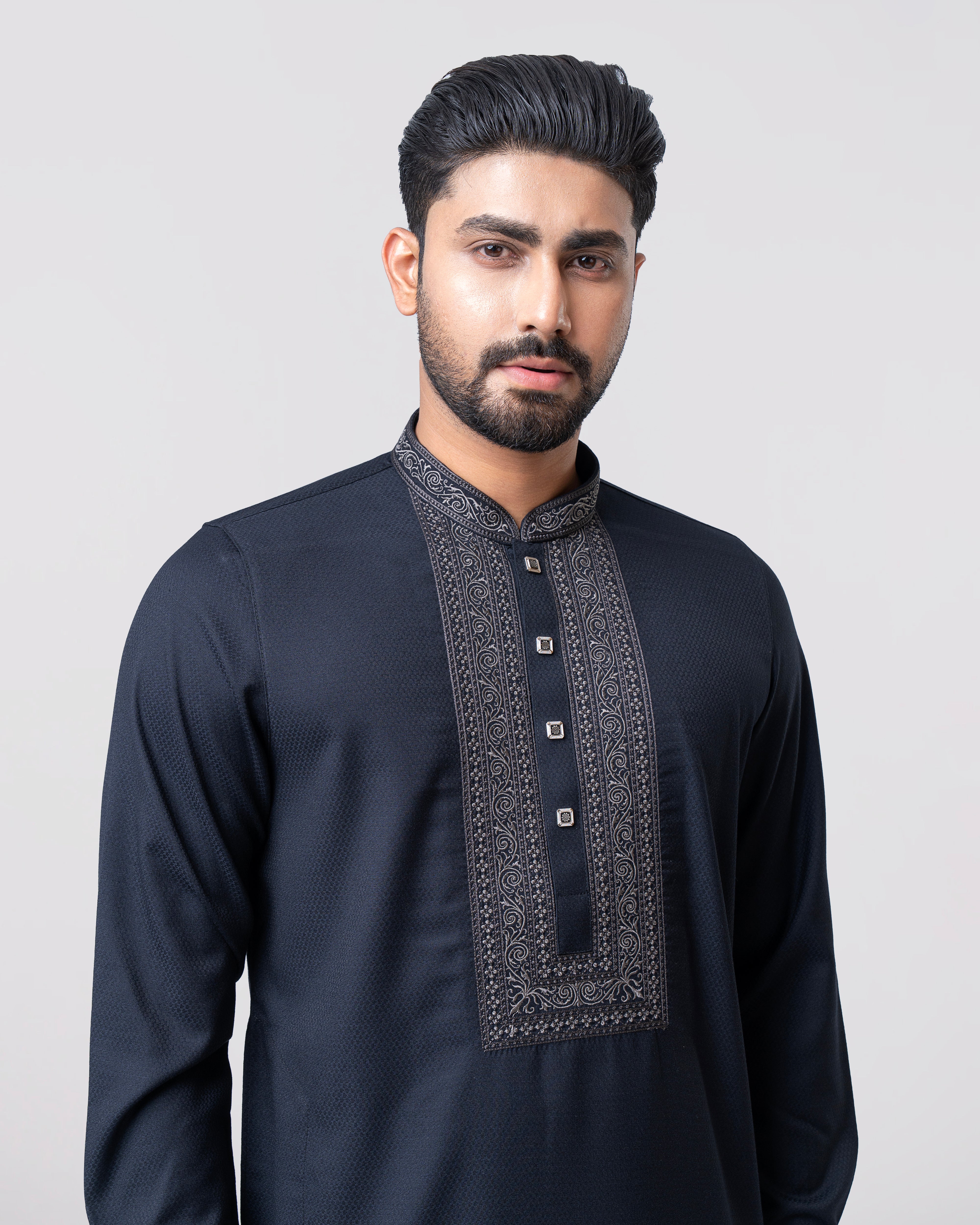 A regular-fit Panjabi crafted from premium breathable fabric with tencel rayon blend, featuring classical embroidery on band, around placket and cuff with decorative snap buttons, offers a stylish yet comfortable formal look. Perfect for effortless elegance in every occasion.