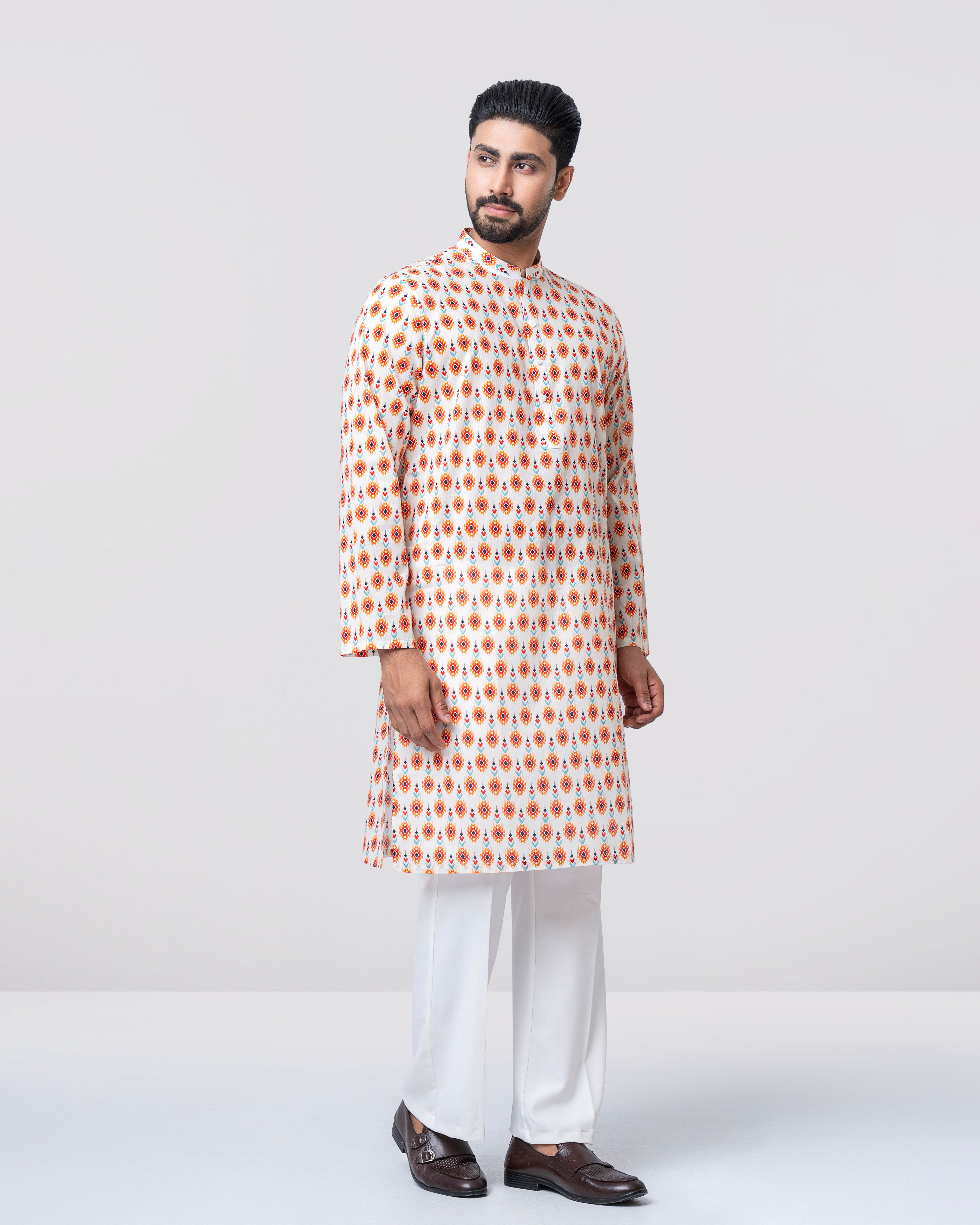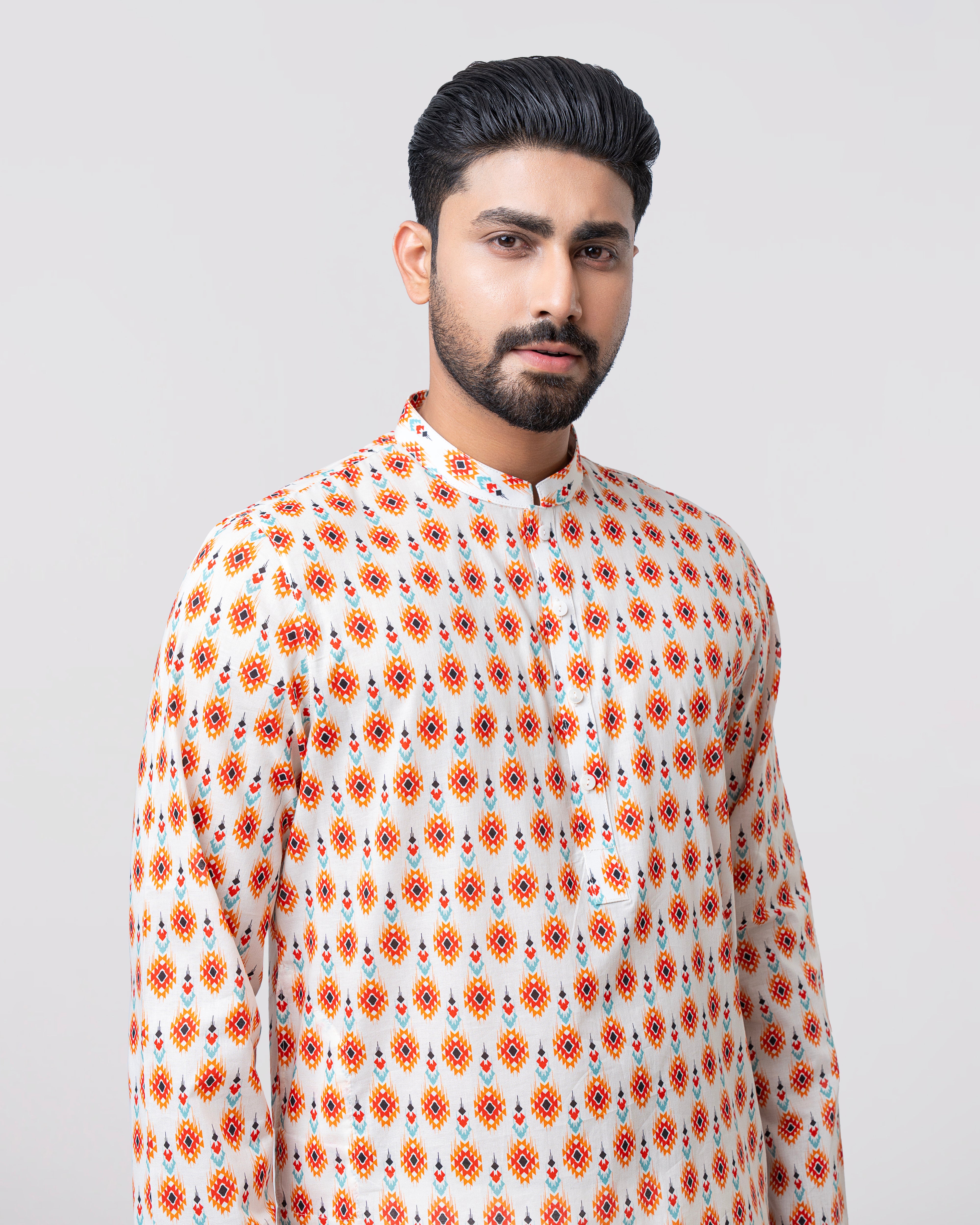 A regular fit Panjabi crafted from 100% cotton breathable fabric, featuring contrast on inside band, moon and placket, offers a stylish yet comfortable daily wear look. Perfect for effortless elegance and all-day ease.