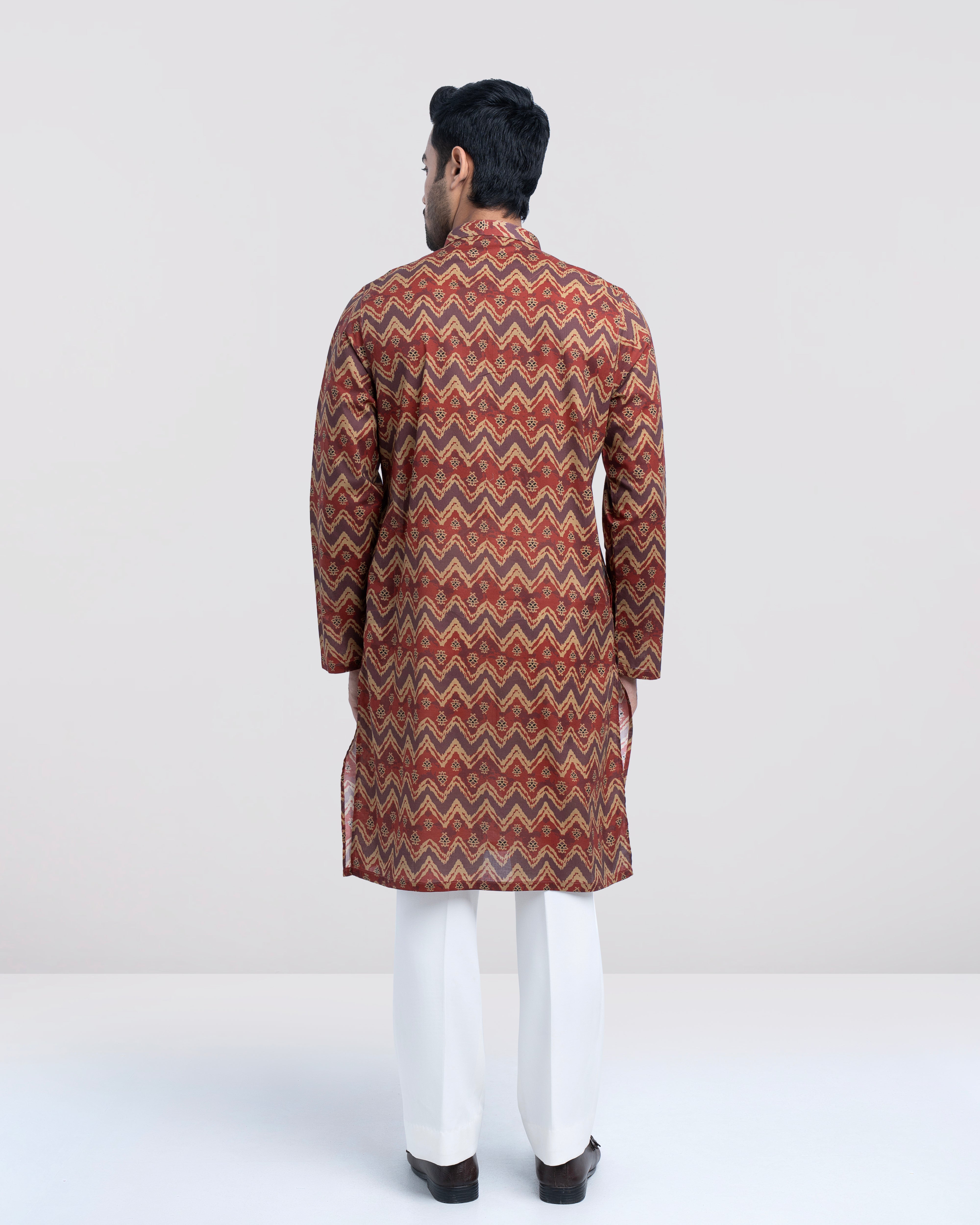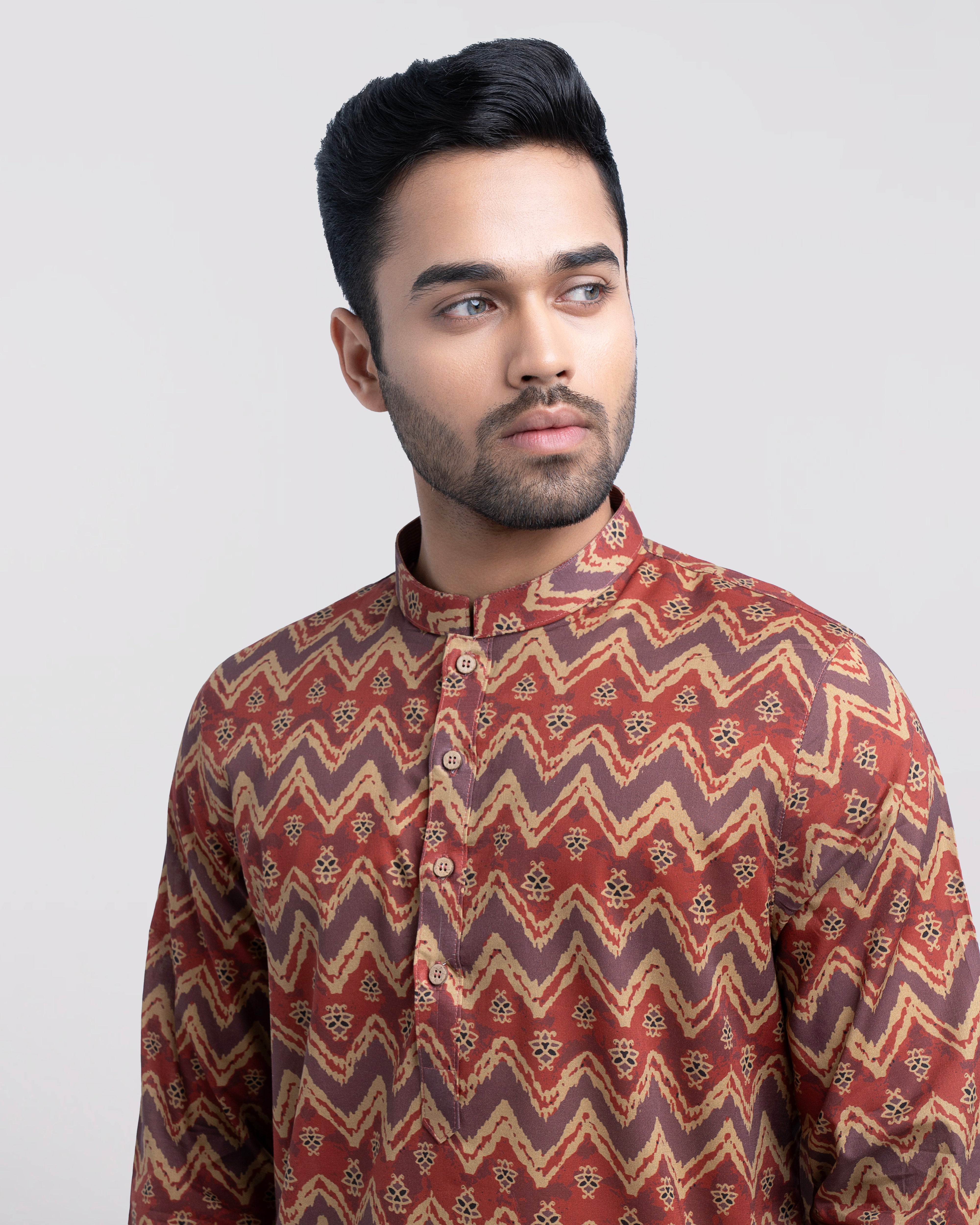 A regular-fit Panjabi crafted from 100% cotton fabric, featuring an elegant allover print with contrast inside band, placket and moon patch, offers a stylish and comfortable daily wear look. Perfect for a blend of tradition and modern elegance.