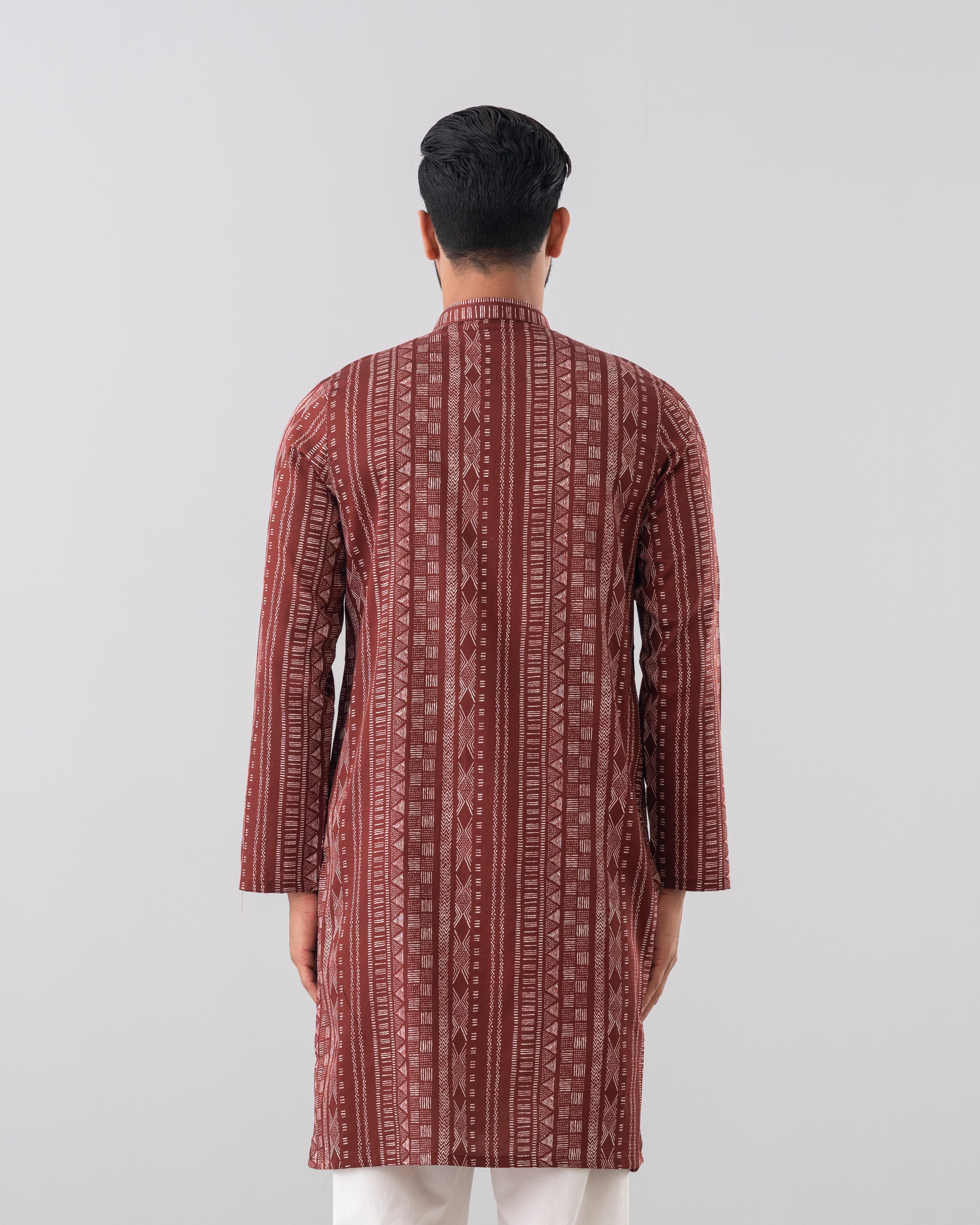 A regular-fit Panjabi crafted from 100% cotton fabric, featuring an elegant allover print, offers a stylish and comfortable daily wear look. Perfect for a blend of tradition and modern elegance.