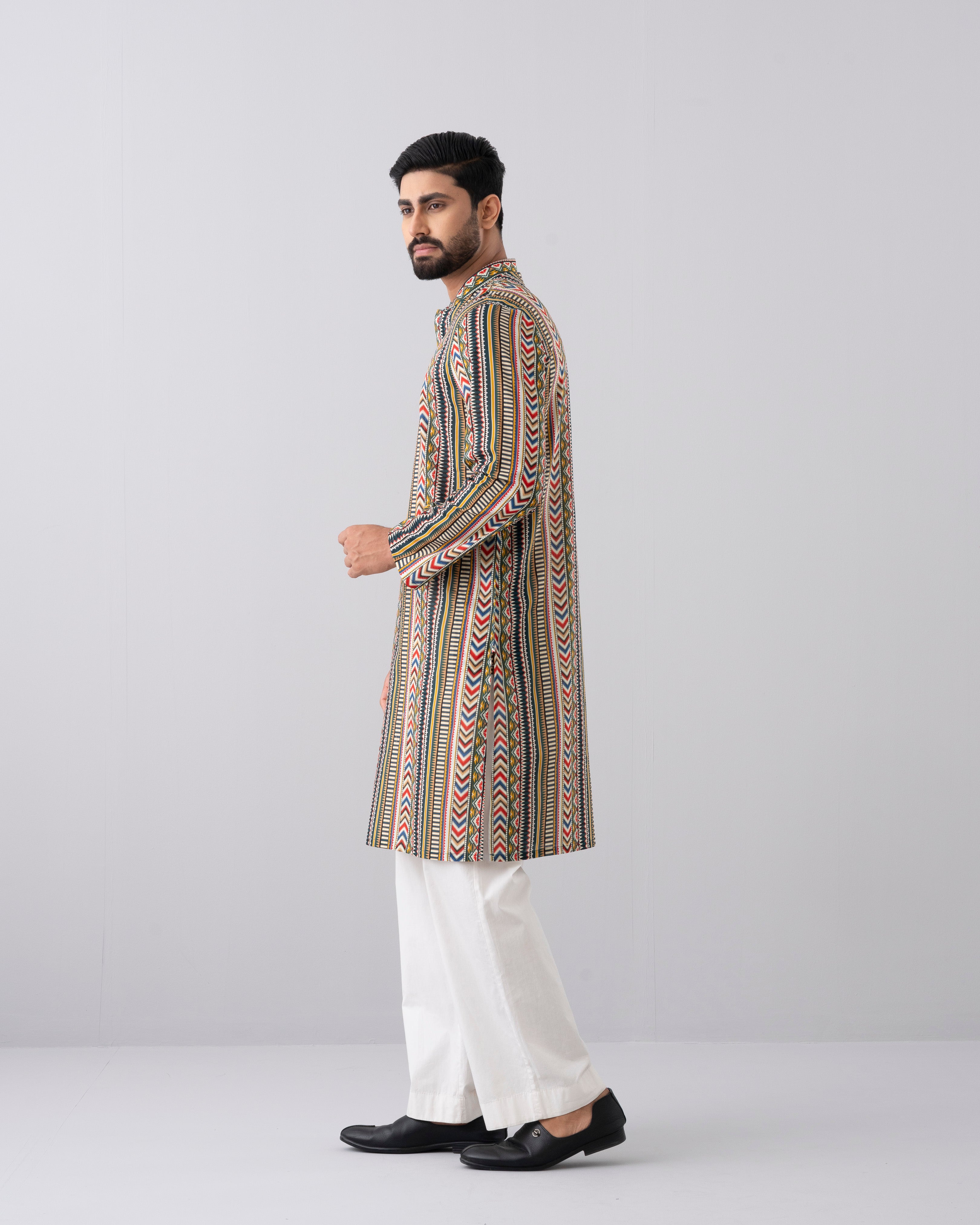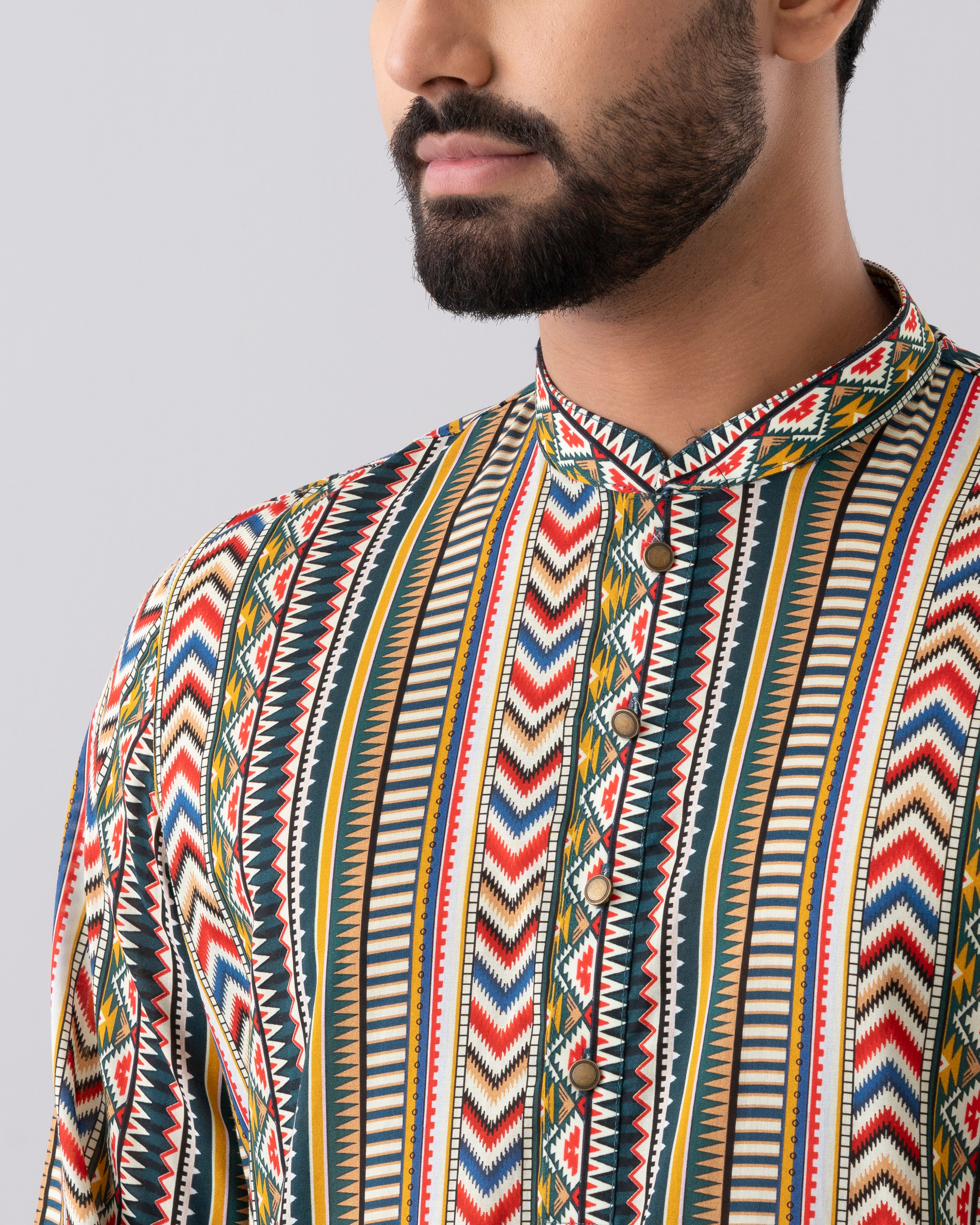 A regular-fit Panjabi crafted from 100% cotton fabric, featuring an elegant allover print, offers a stylish and comfortable daily wear look. Perfect for a blend of tradition and modern elegance.