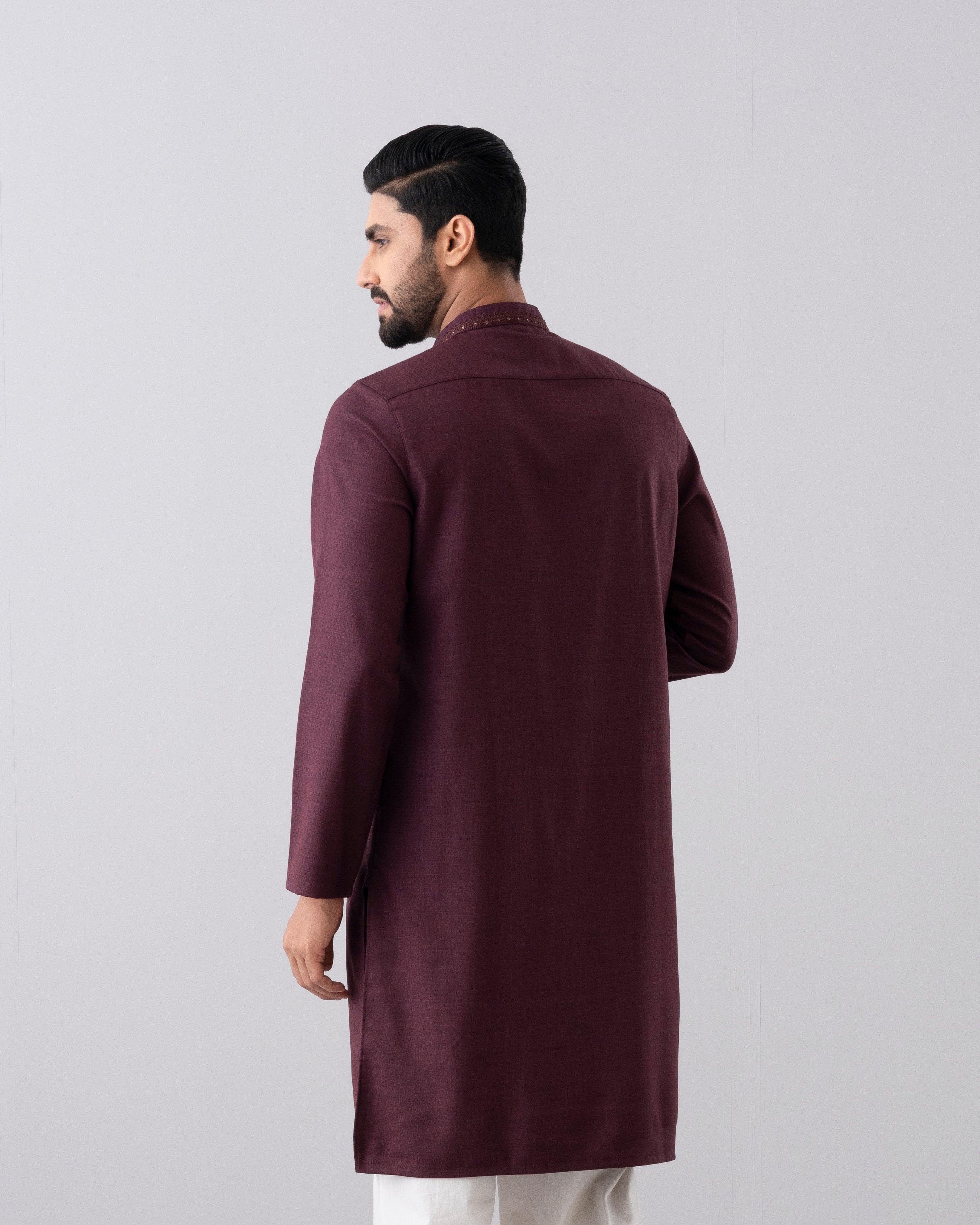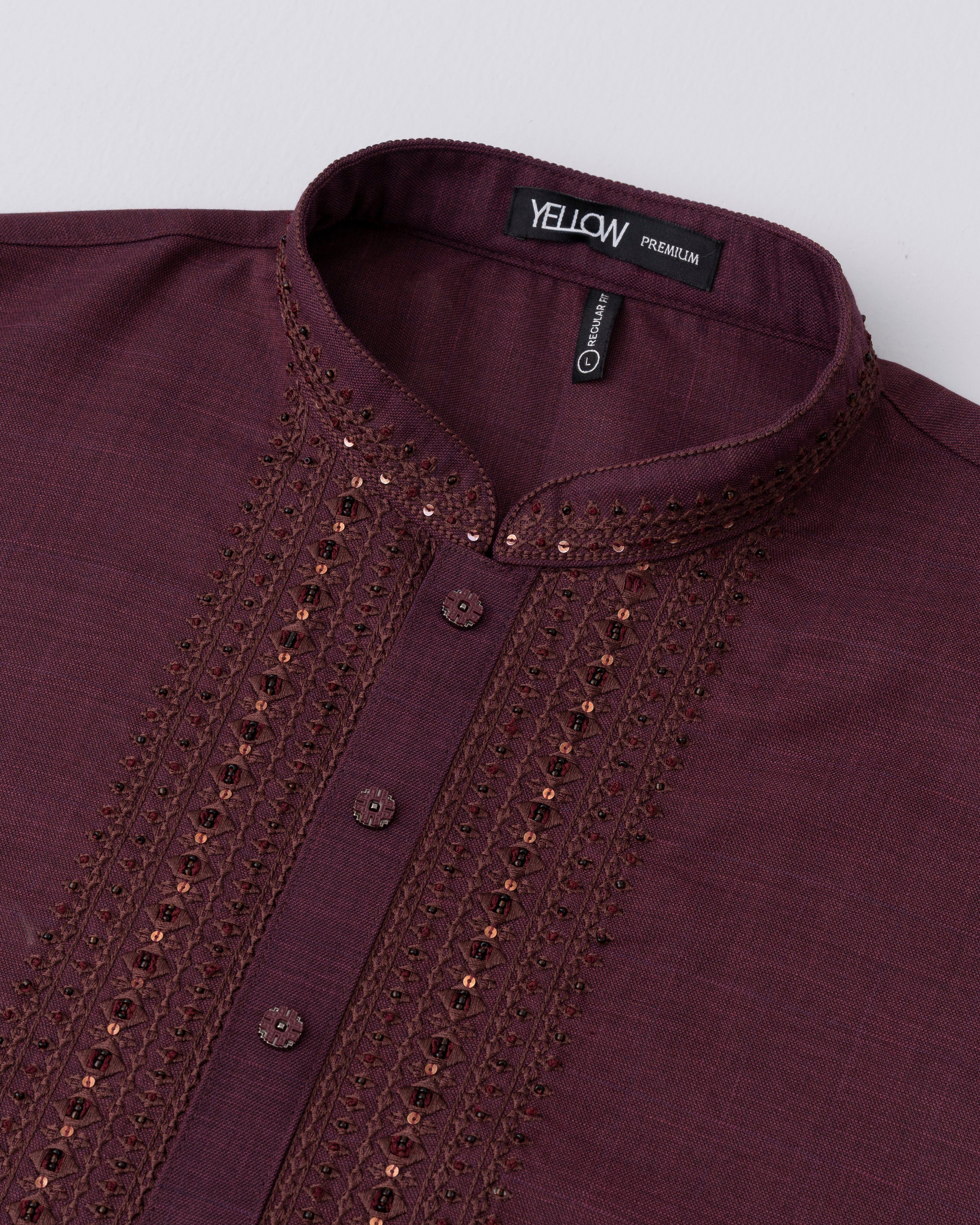 A regular-fit Panjabi crafted from premium breathable fabric with tencel rayon blend, featuring classical embroidery with karchupi embellishment on band and around placket with decorative snap buttons, offers a stylish yet comfortable formal look. Perfect for effortless elegance in every occasion.