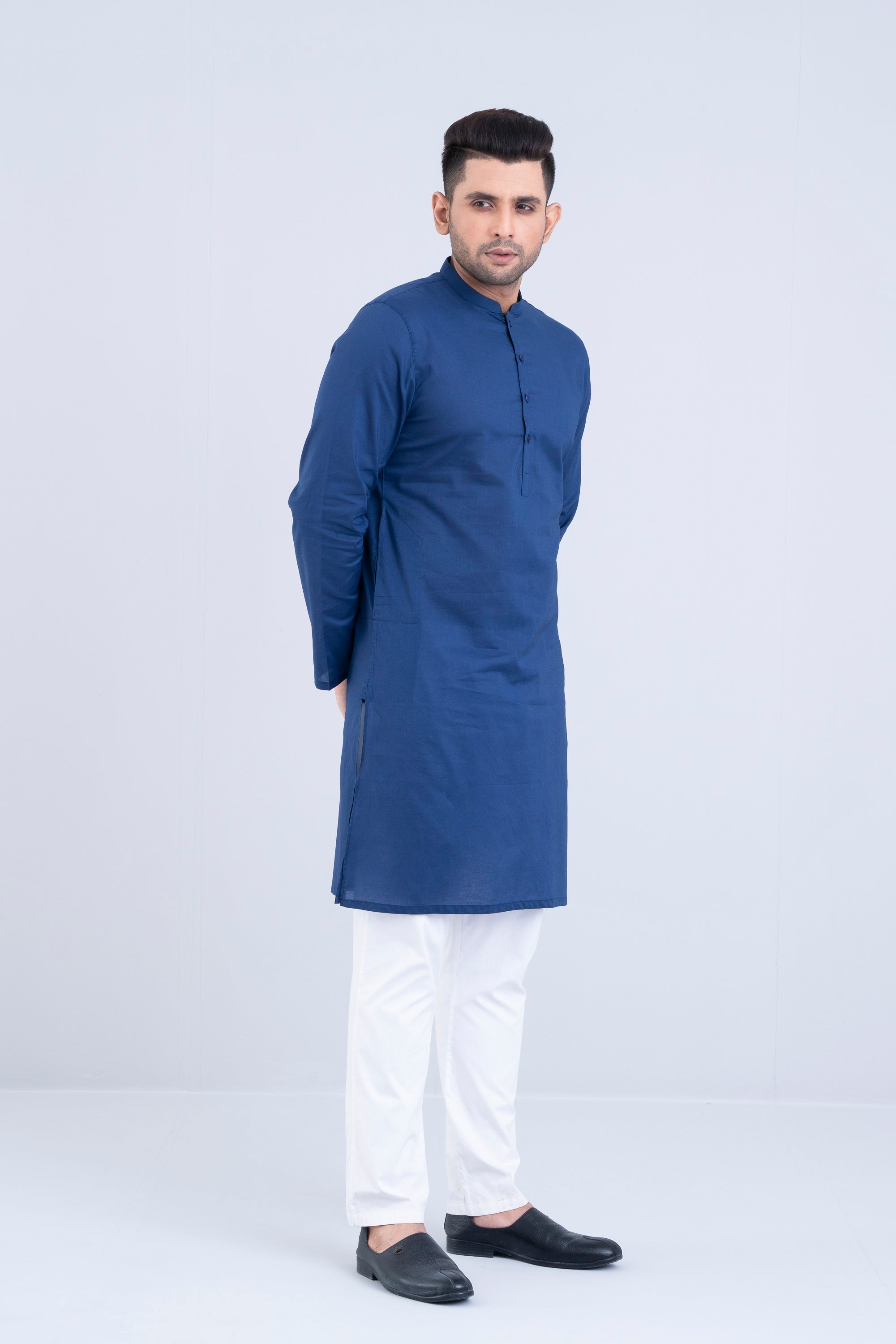 A slim fit Panjabi crafted from solid dyed 100% cotton breathable fabric, featuring contrast details and DTM plastic buttons, offers a stylish yet comfortable daily wear look. Perfect for effortless elegance and all-day ease.