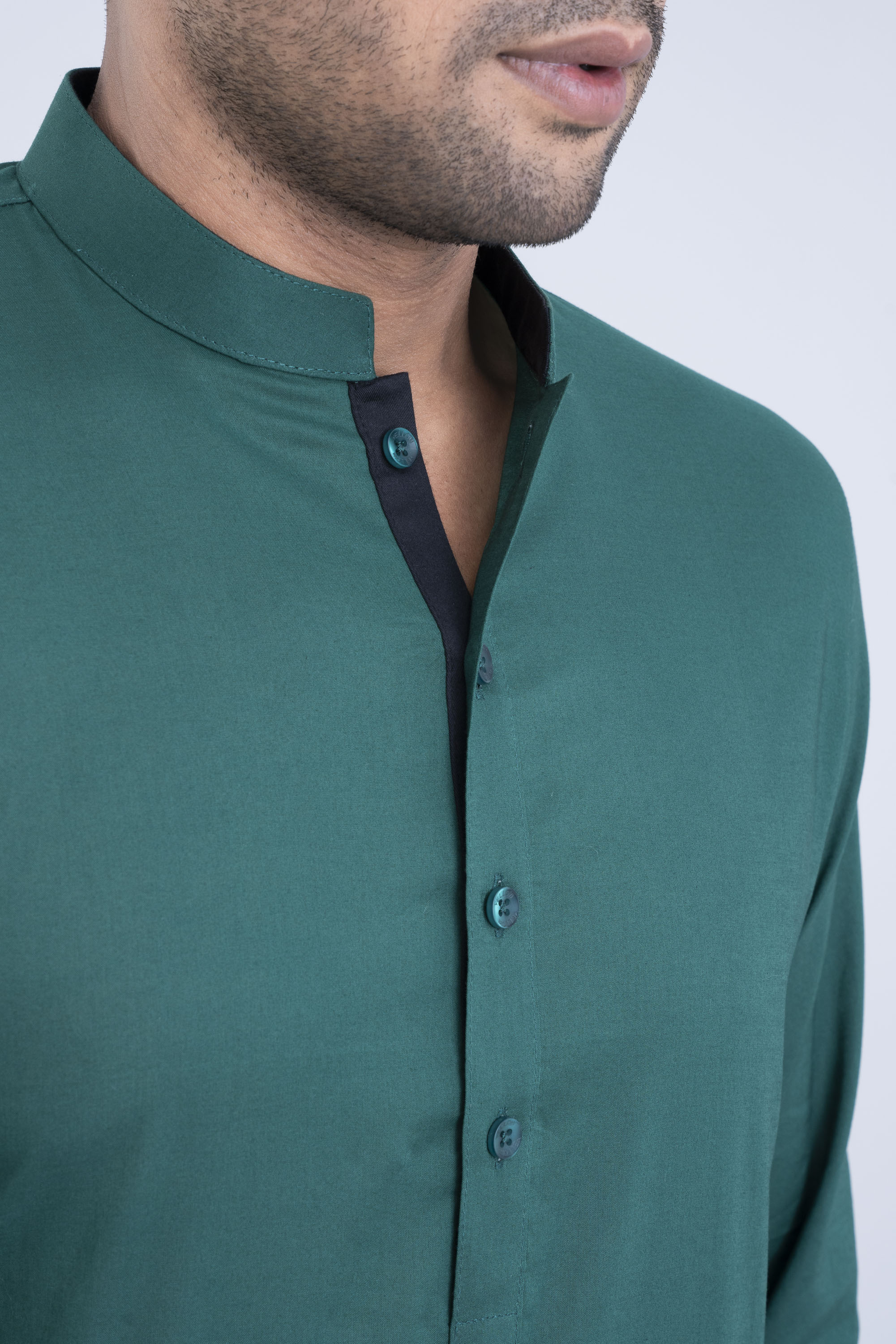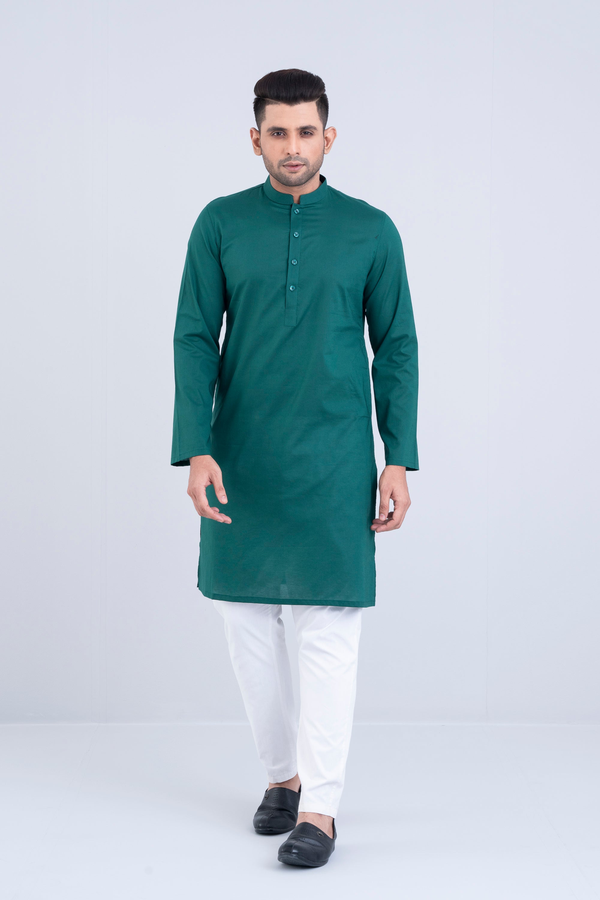 A slim fit Panjabi crafted from solid dyed 100% cotton breathable fabric, featuring contrast details and DTM plastic buttons, offers a stylish yet comfortable daily wear look. Perfect for effortless elegance and all-day ease.