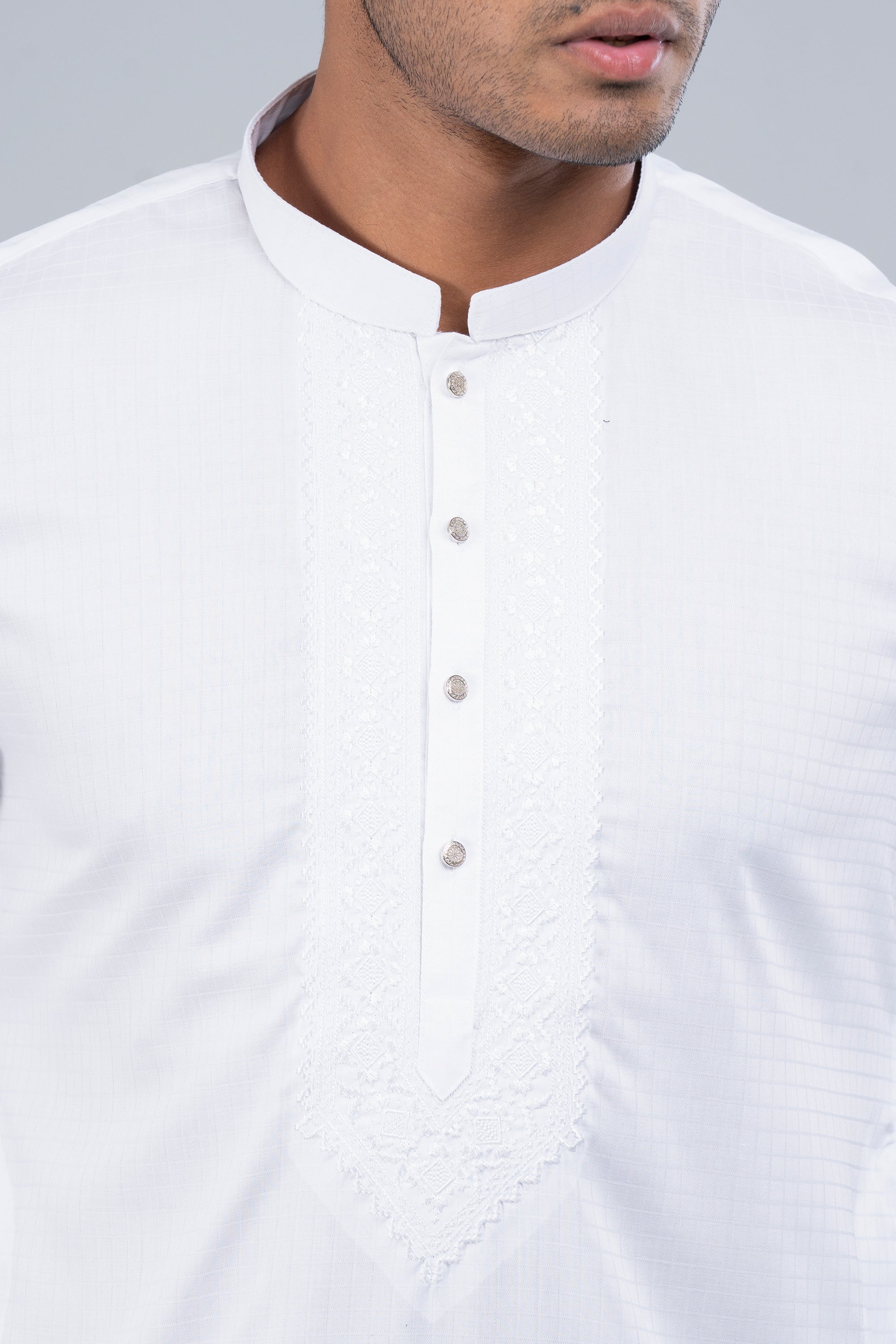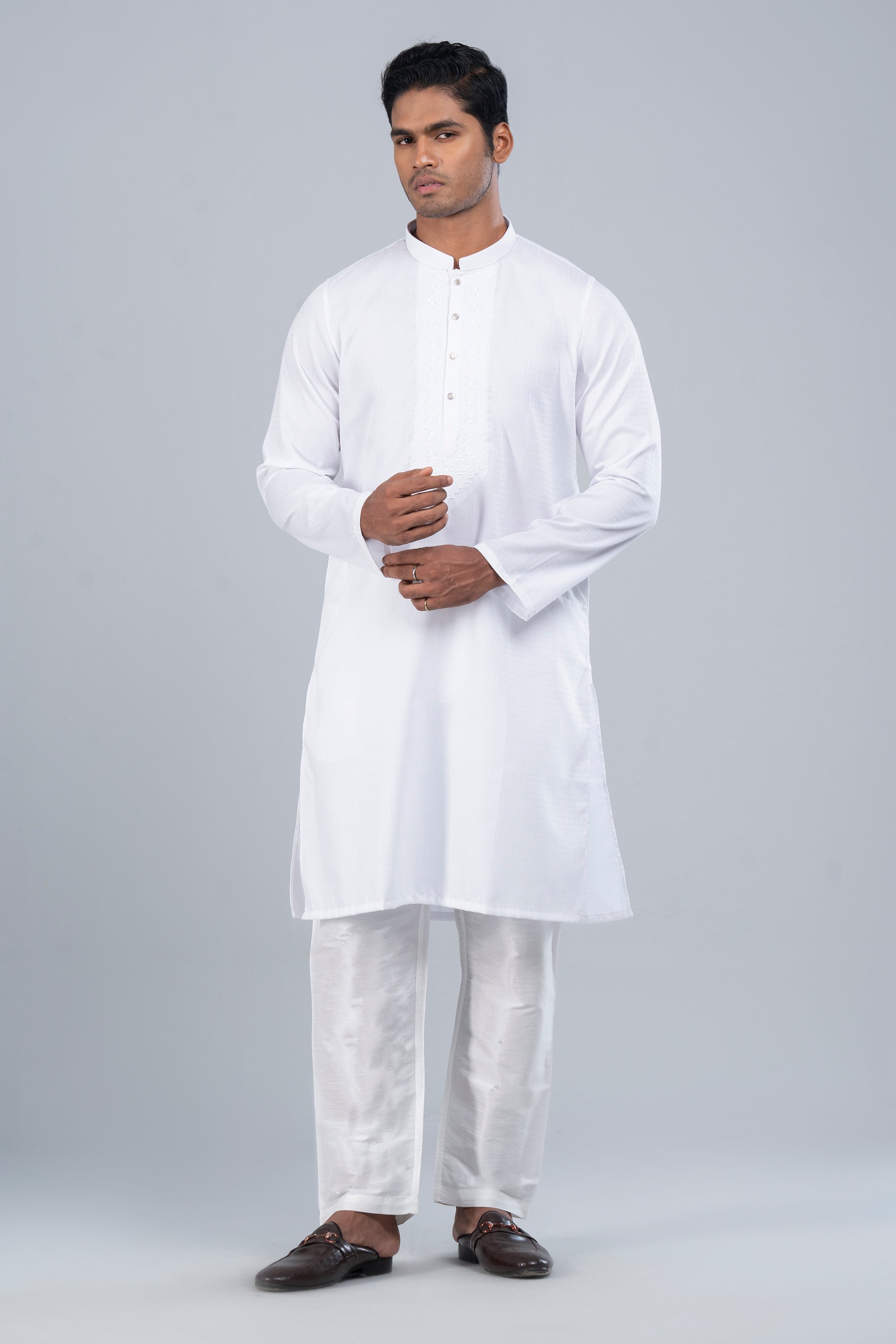 Elevate your semi-formal style effortlessly with our premium dobby fabric men's Panjabi, featuring around placket embroidery with elegant buttons for a refined touch.
