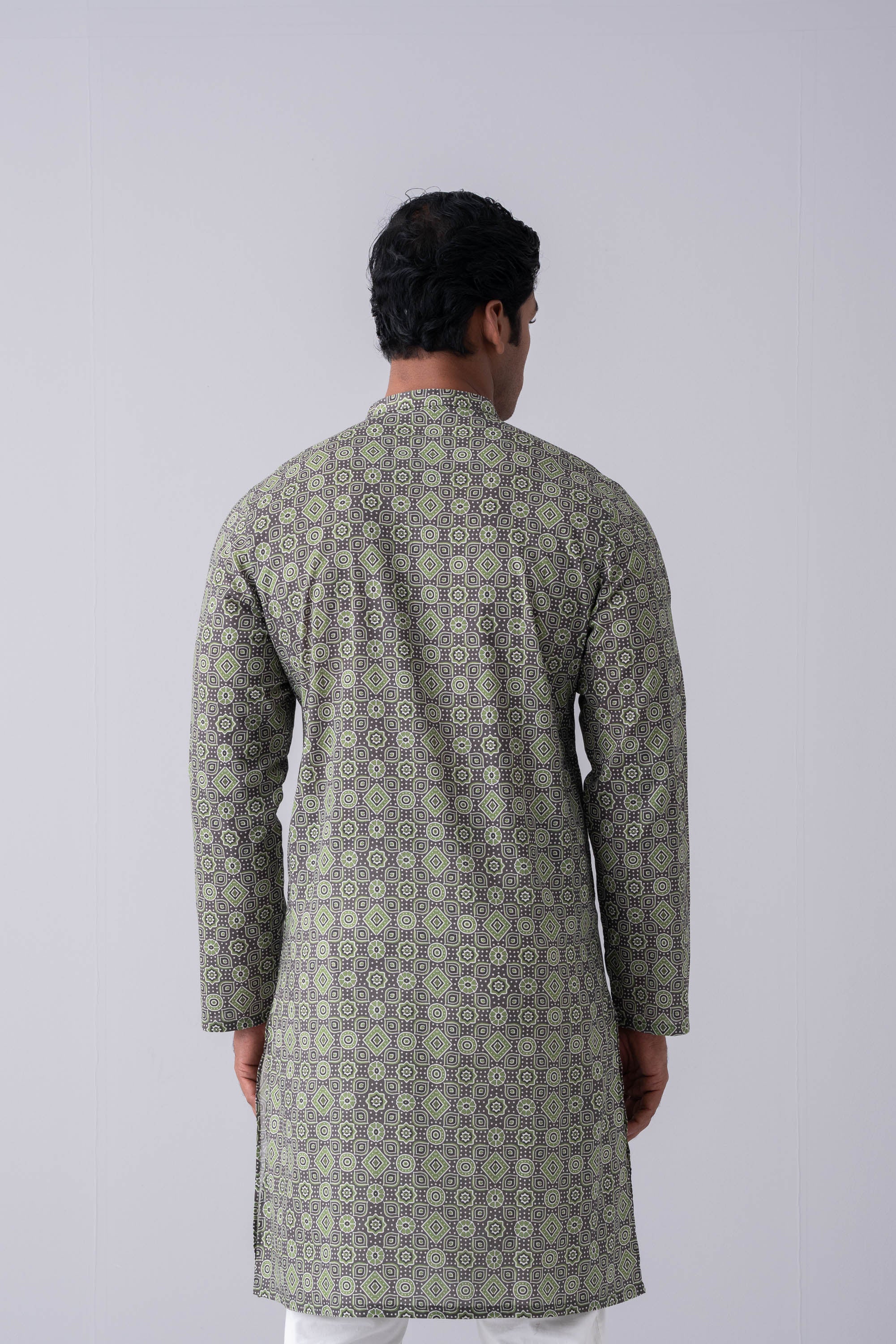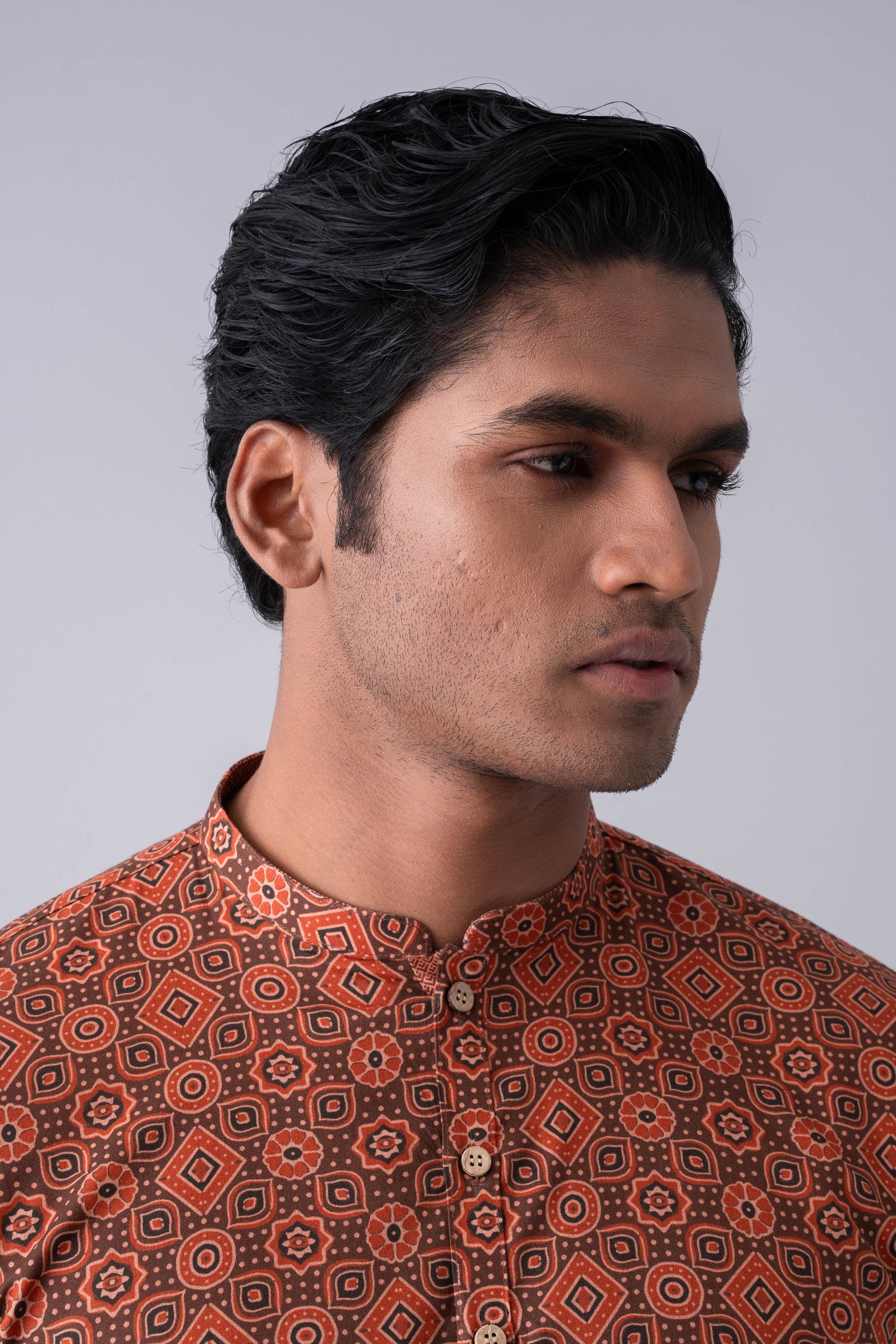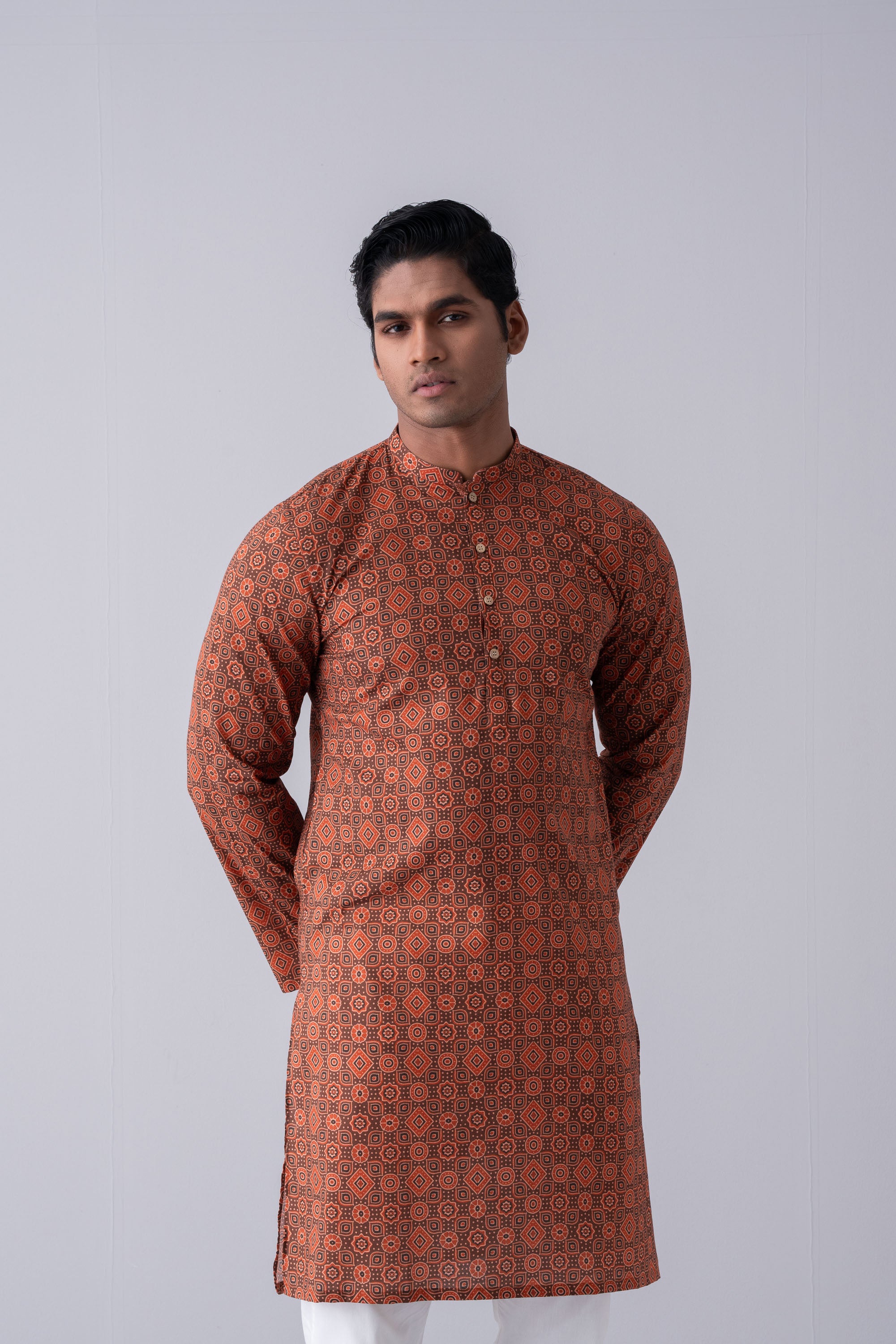 A slim-fit Panjabi crafted from 100% cotton fabric, featuring Ajrakh print details on the band, placket, and back moon with inside contrast, offers a stylish and comfortable daily wear look. Perfect for a blend of tradition and modern elegance.