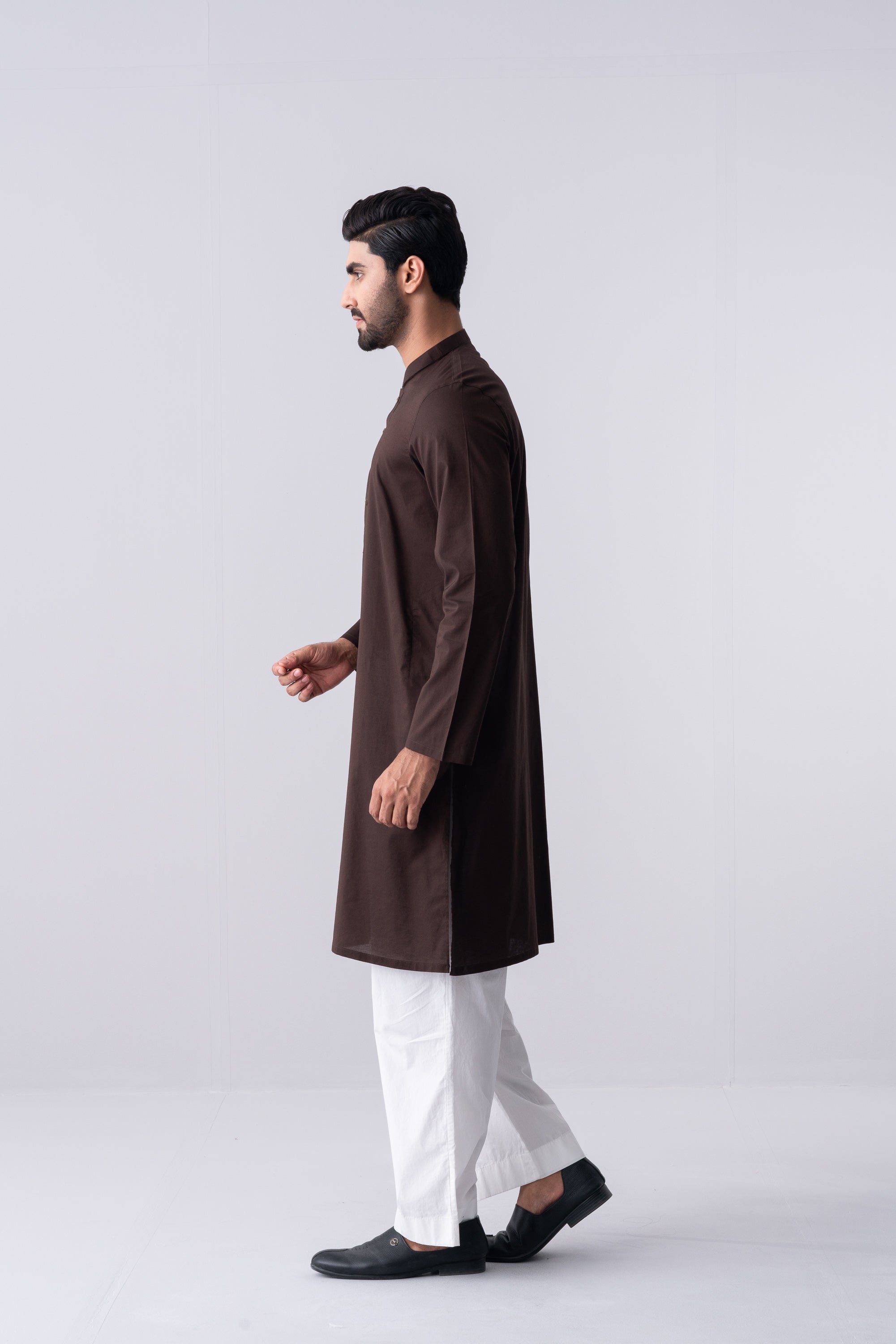 A regular-fit Panjabi crafted from solid dyed 100% cotton fabric with contrast details on the band and placket offers a stylish yet comfortable daily wear look. This design combines comfort and subtle elegance, making it ideal for a refined and stylish appearance.