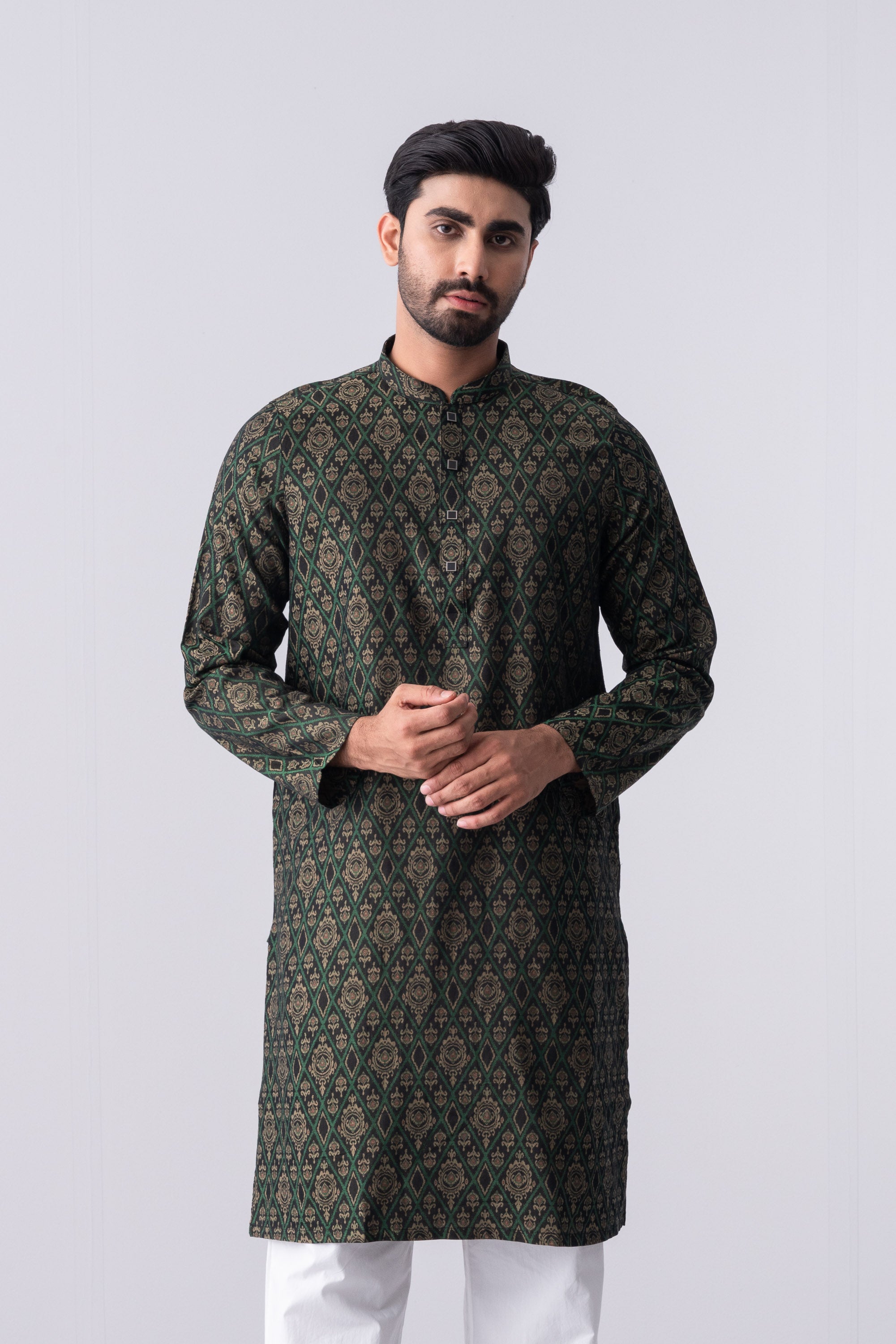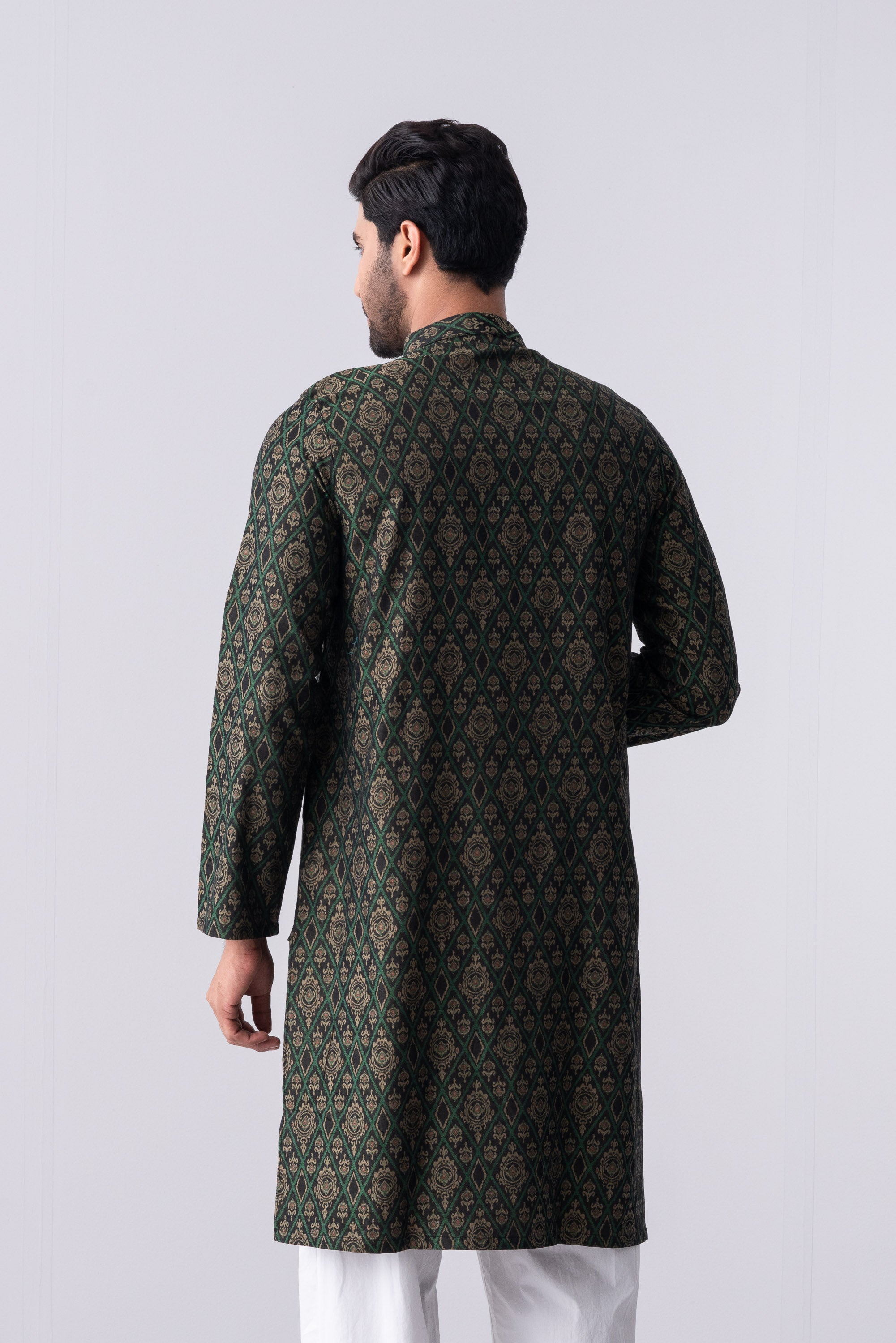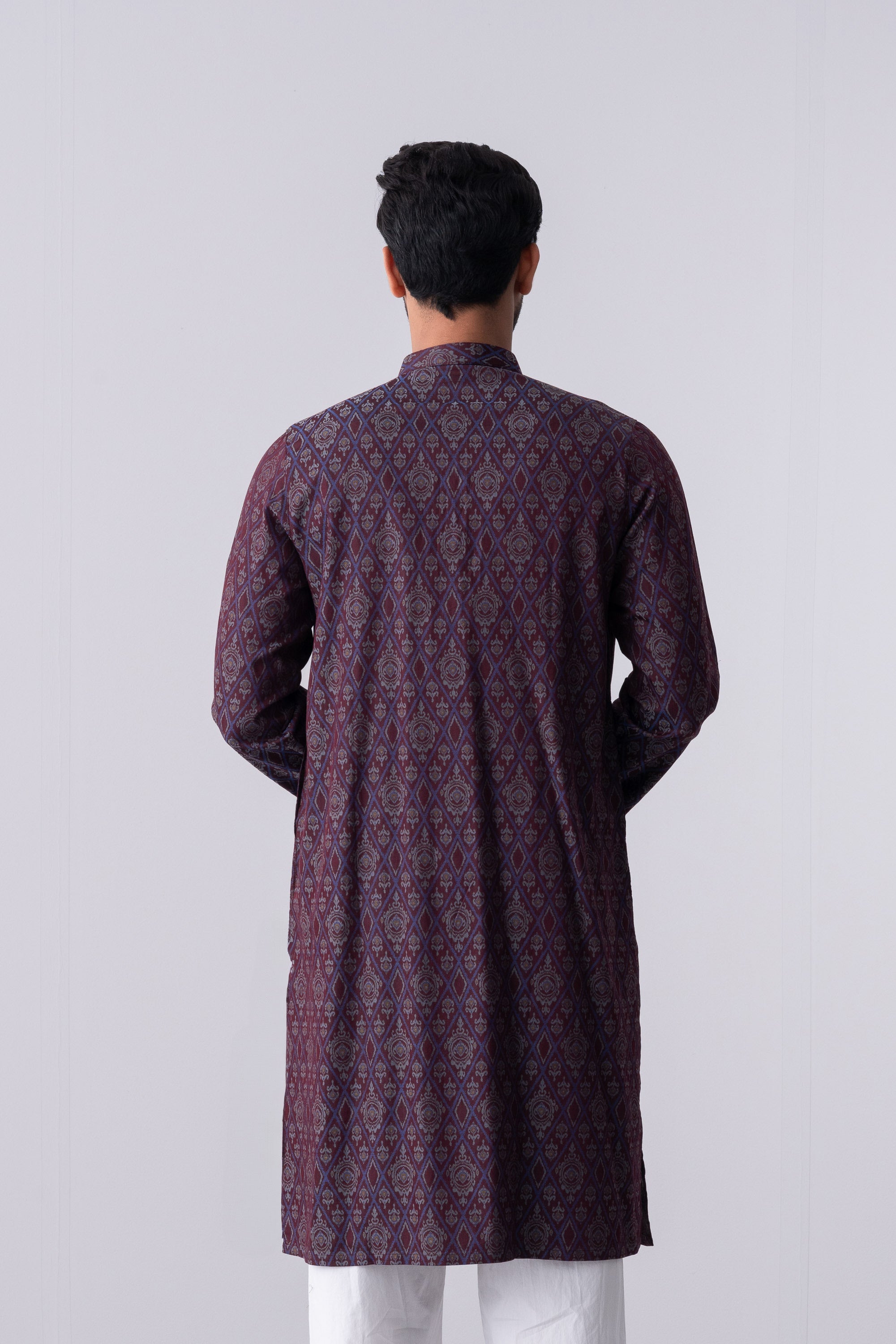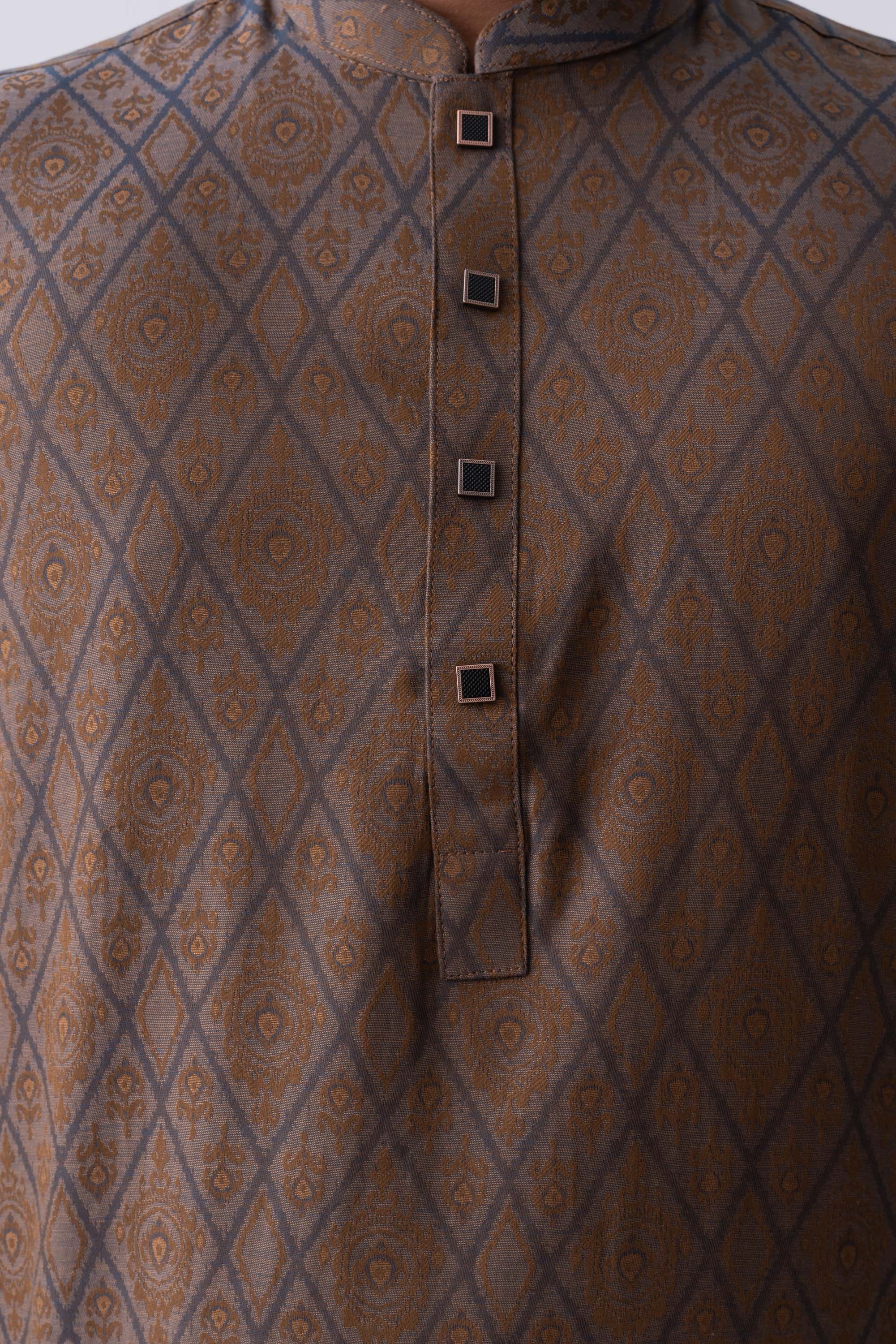 A regular-fit Panjabi crafted from jacquard fabric with 100% cotton breathable fabric, featuring decorative snap buttons, offers a stylish yet comfortable semi-formal look. Perfect for effortless elegance and all-day ease.