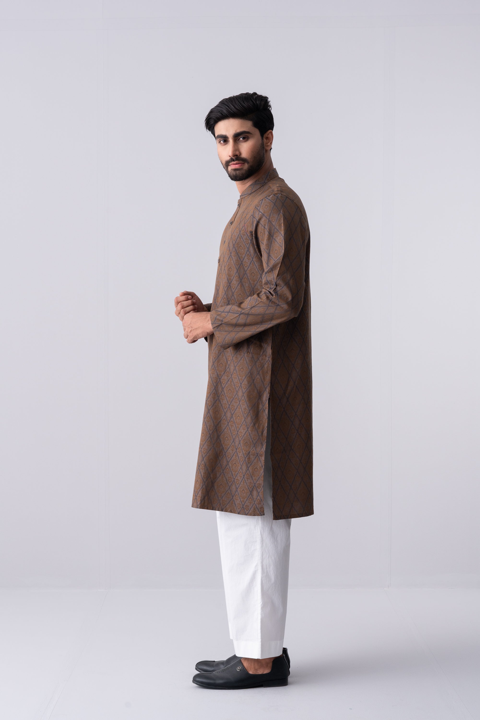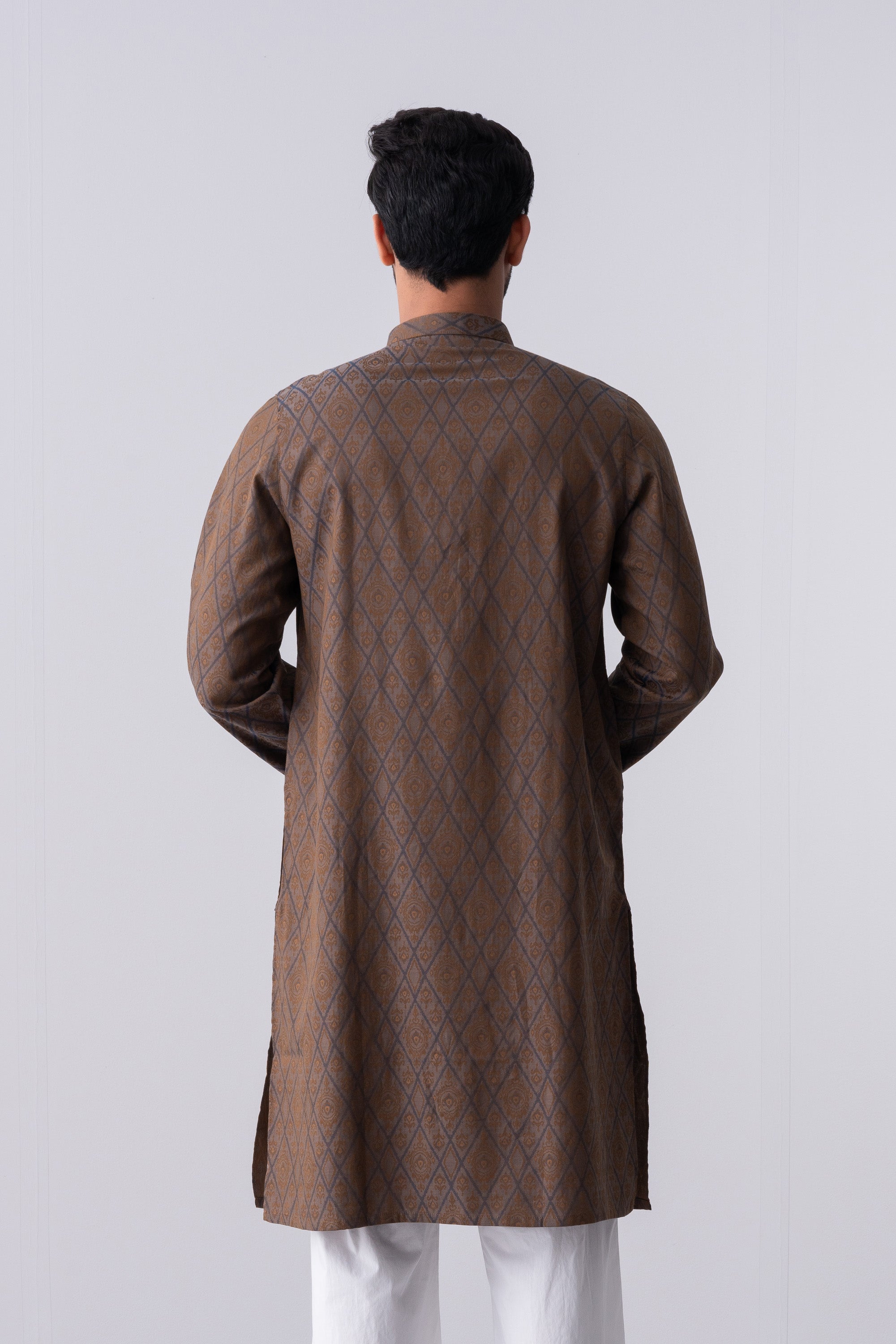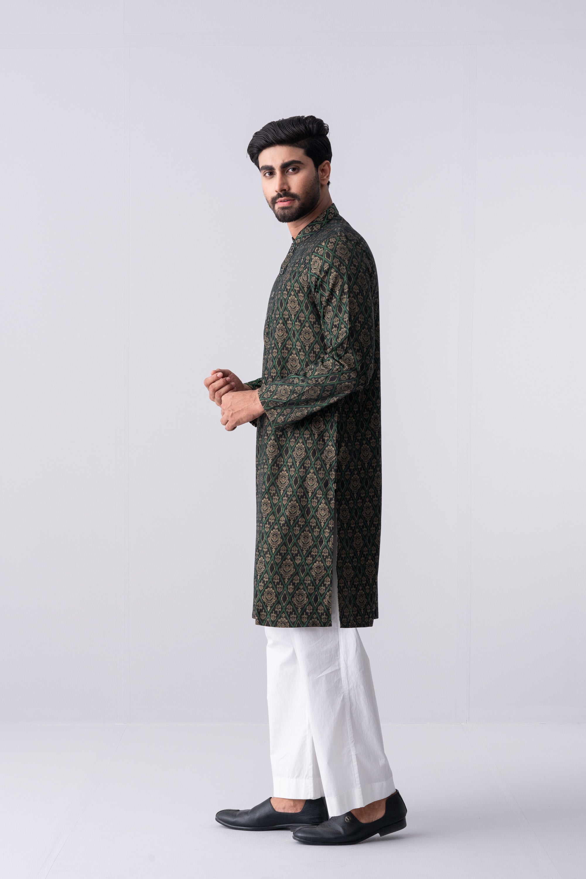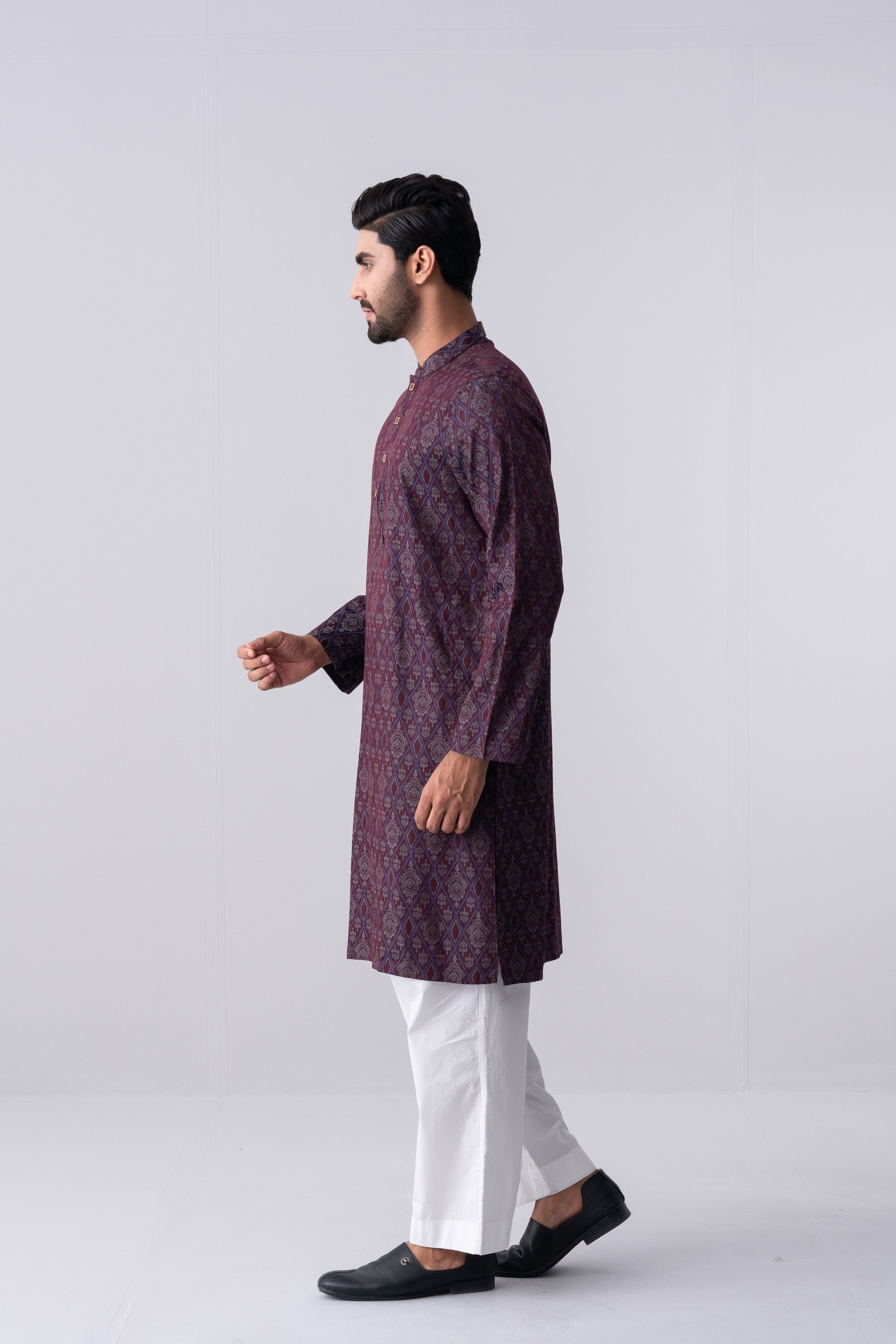 A regular-fit Panjabi crafted from jacquard fabric with 100% cotton breathable fabric, featuring decorative snap buttons, offers a stylish yet comfortable semi-formal look. Perfect for effortless elegance and all-day ease.