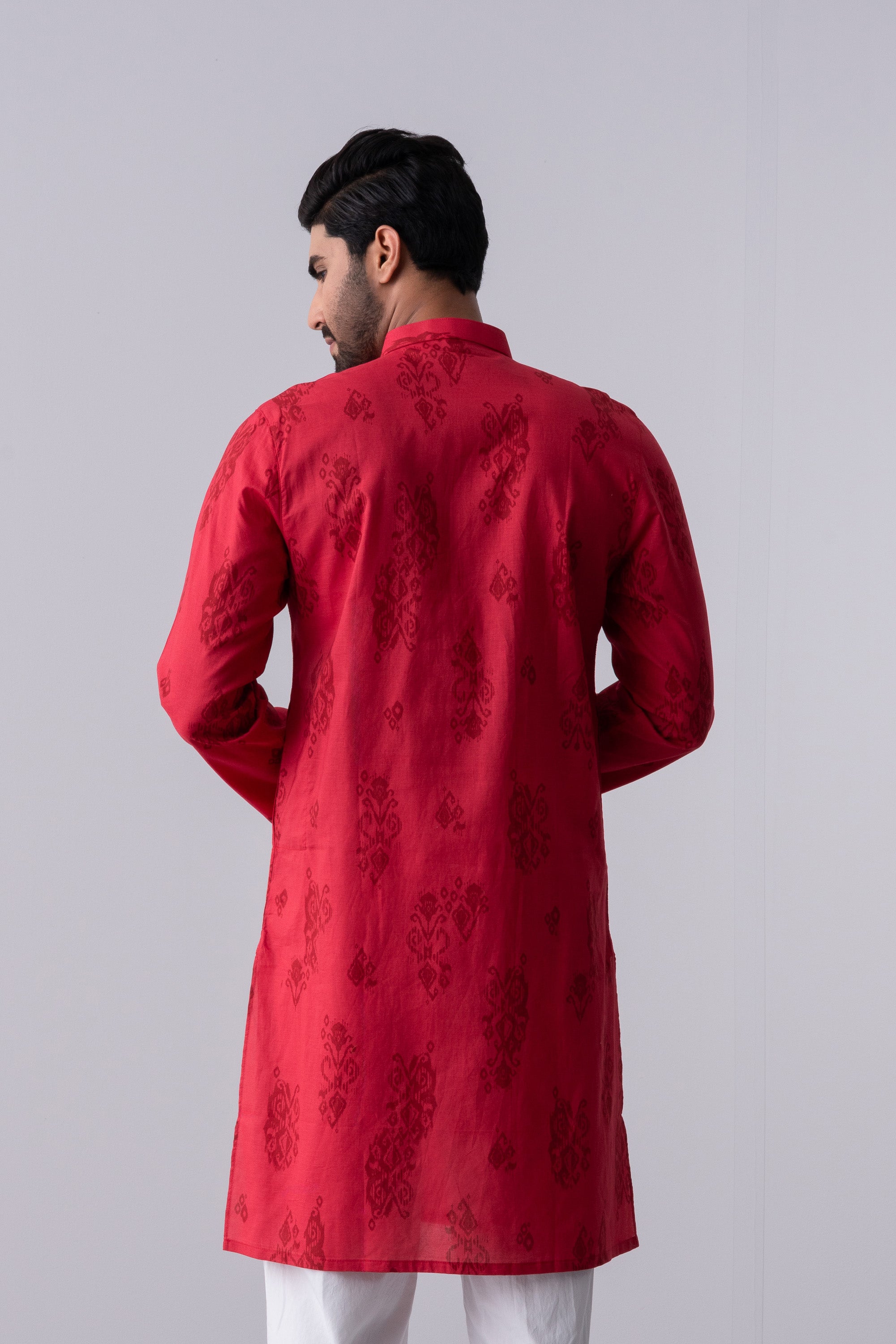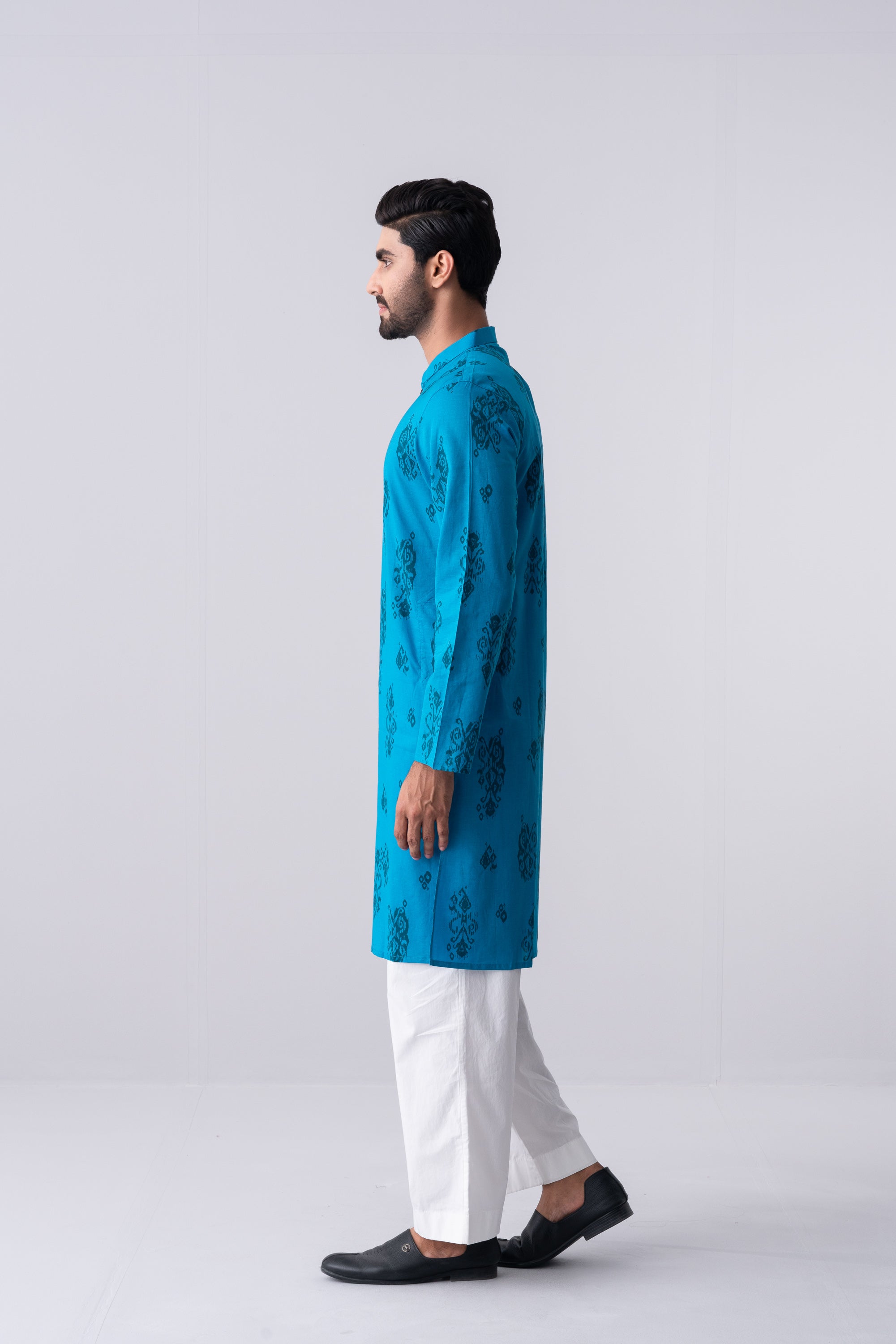 Made from breathable fine cotton, this slim-fit Panjabi features a decorative print and metal buttons, offering a comfortable and stylish look perfect for daily wear.